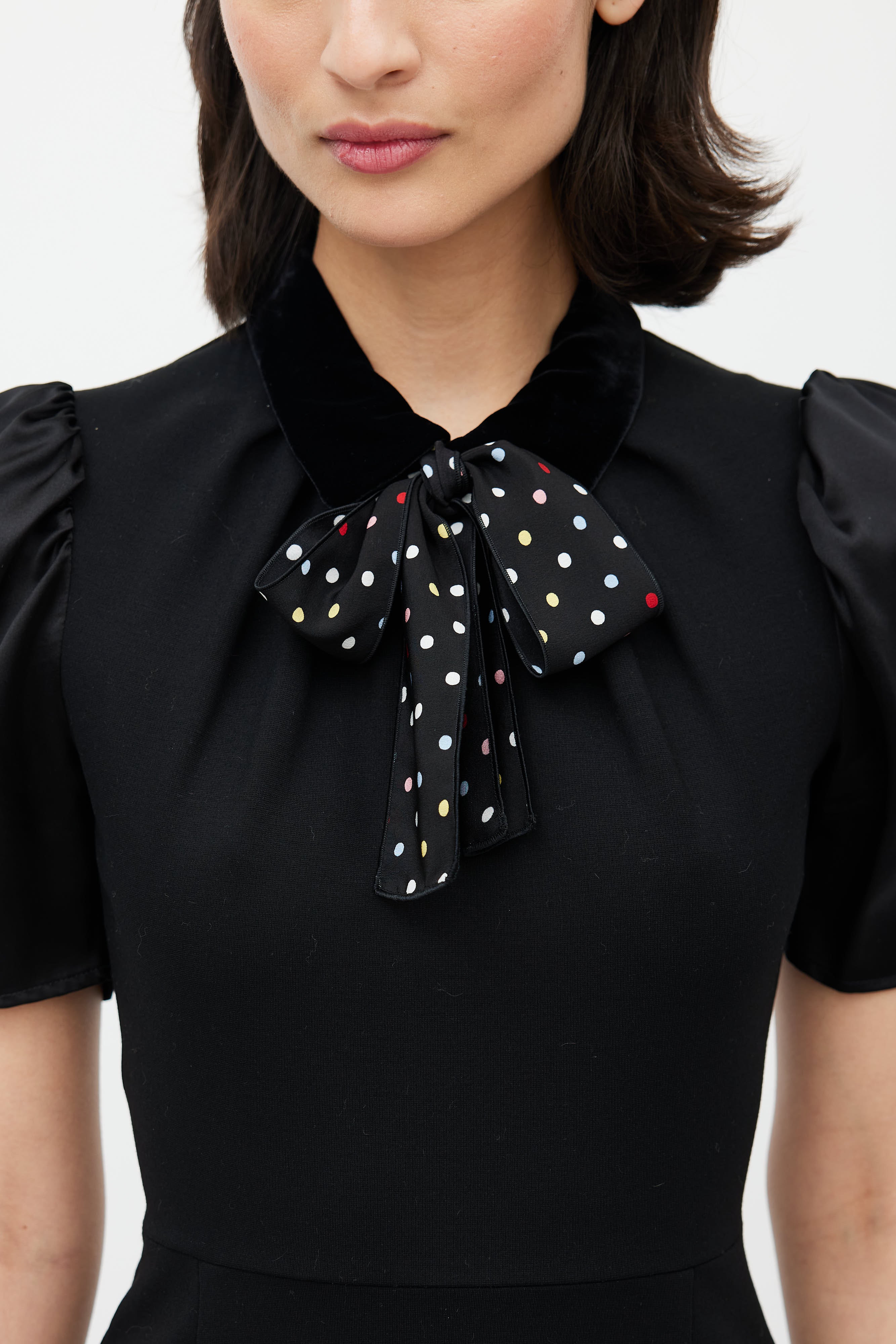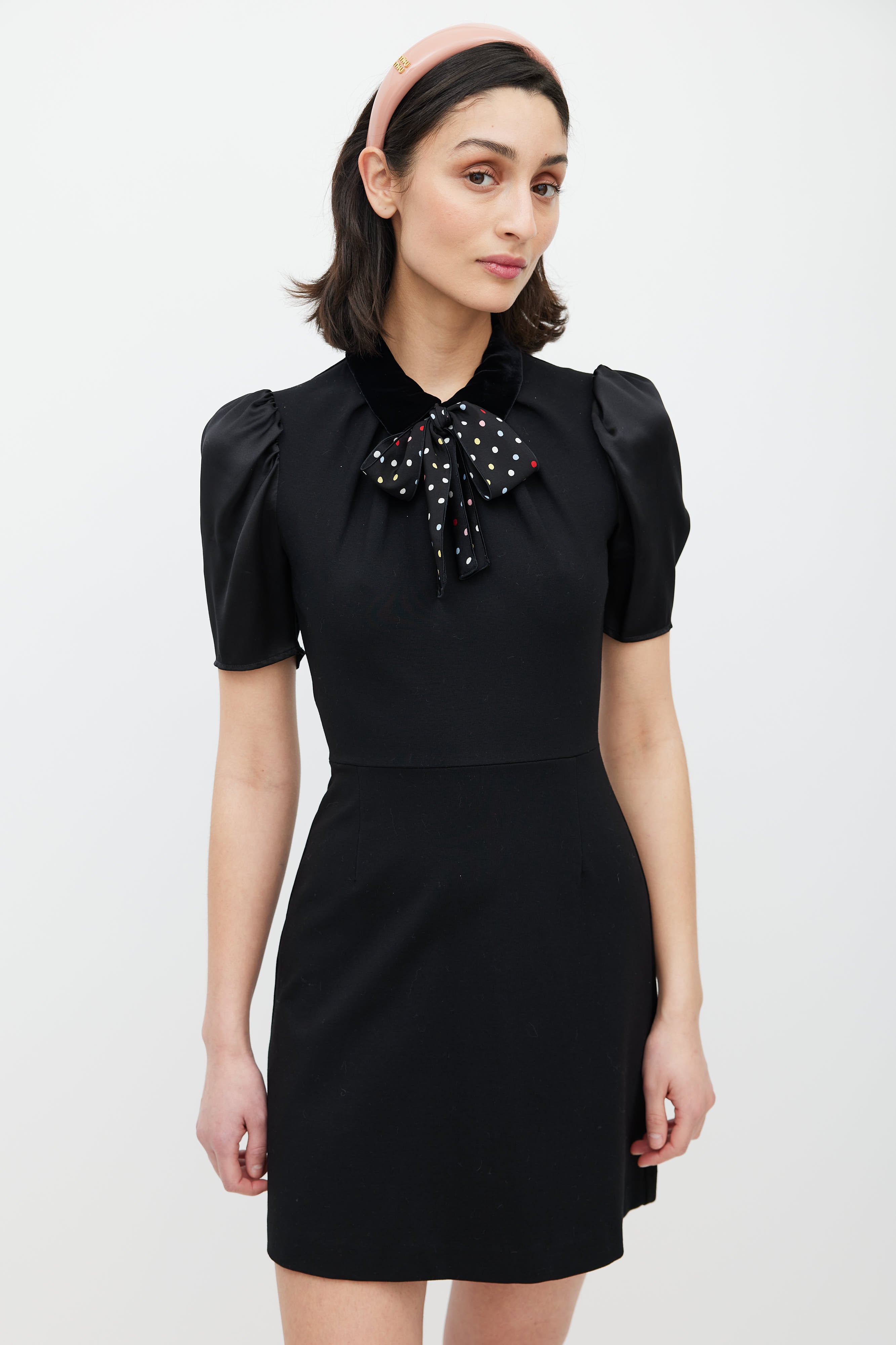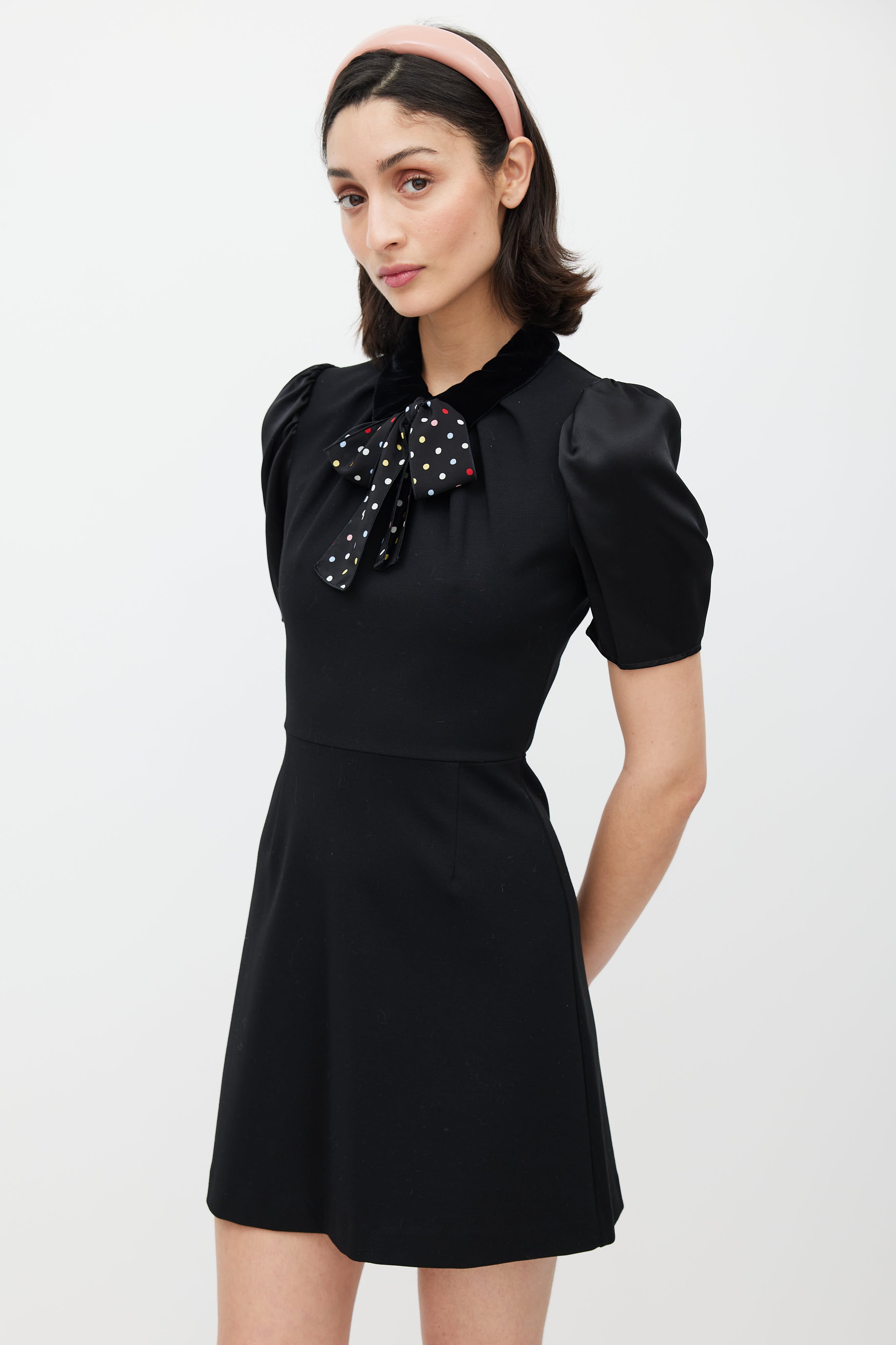 Pre-owned Miu Miu black dress featuring a pointed velvet collar, short puffed sleeves, polka dot tie belt, and zip at back with button closure.