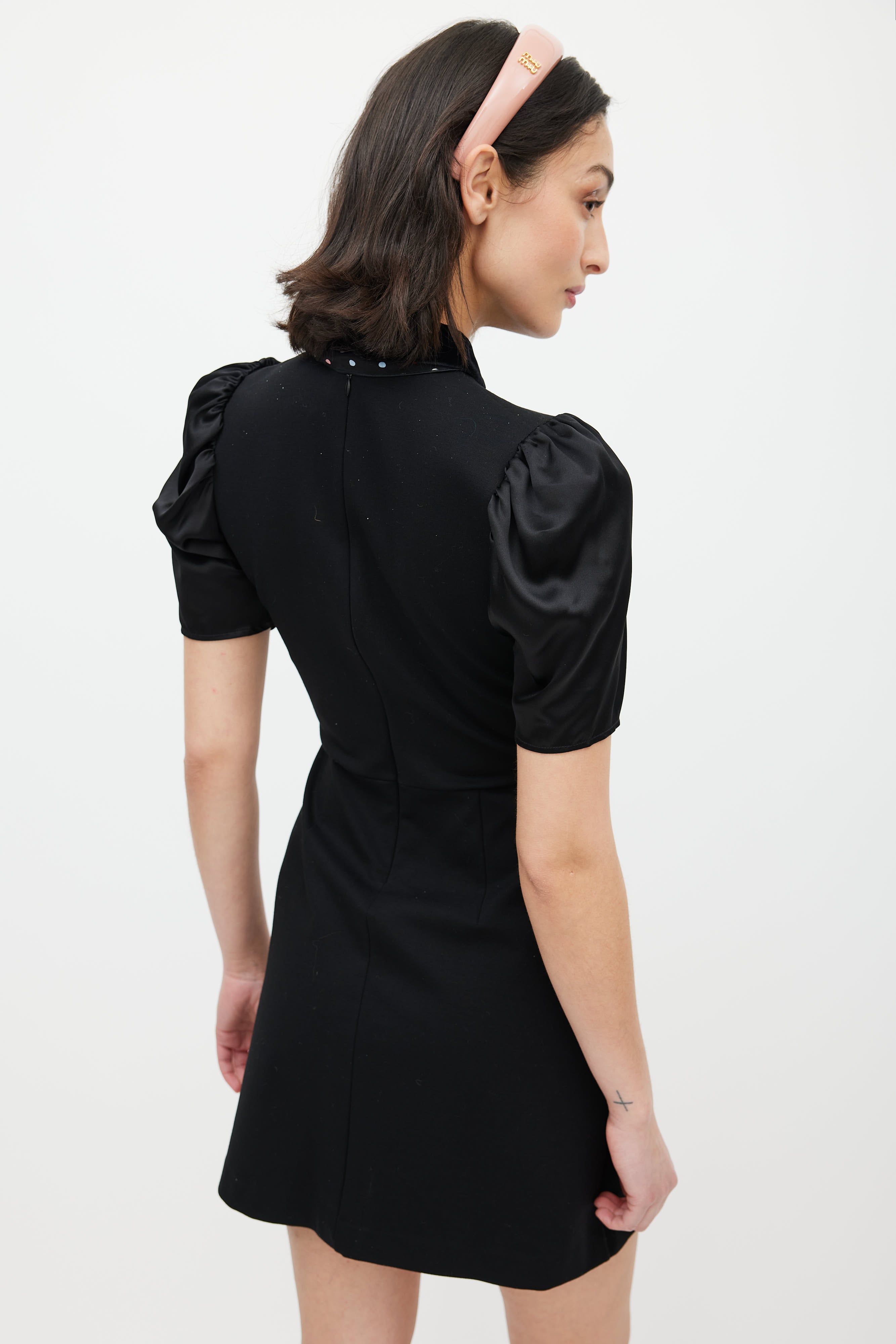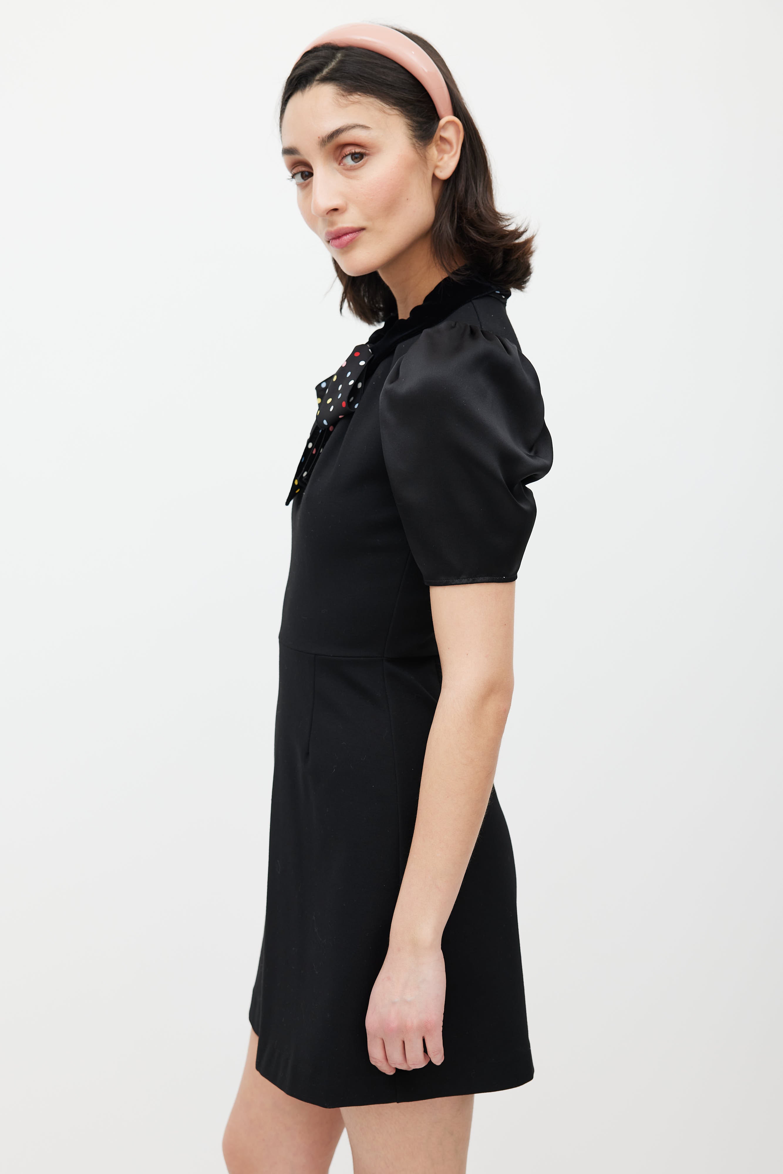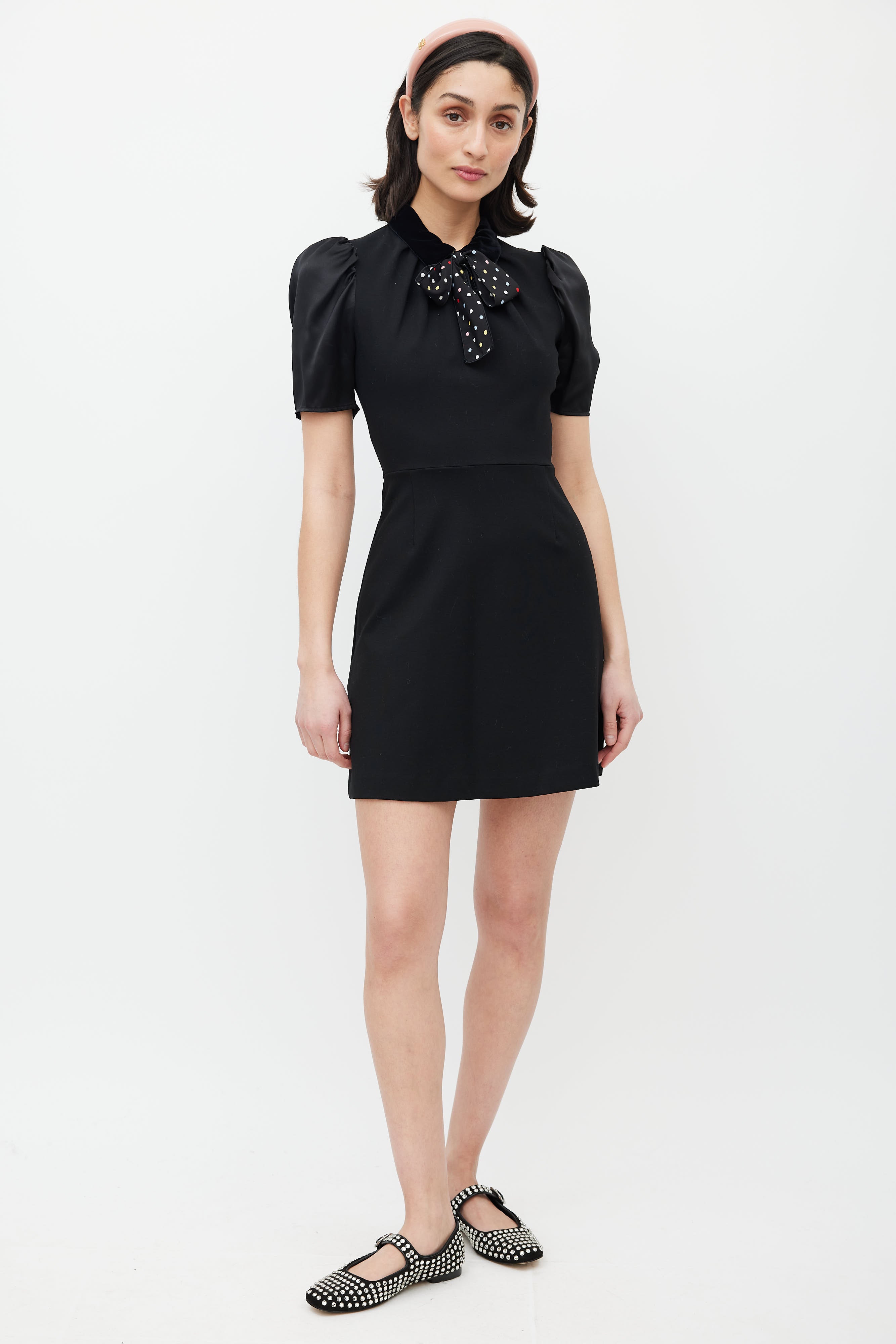 Pre-owned Miu Miu black dress featuring a pointed velvet collar, short puffed sleeves, polka dot tie belt, and zip at back with button closure.
