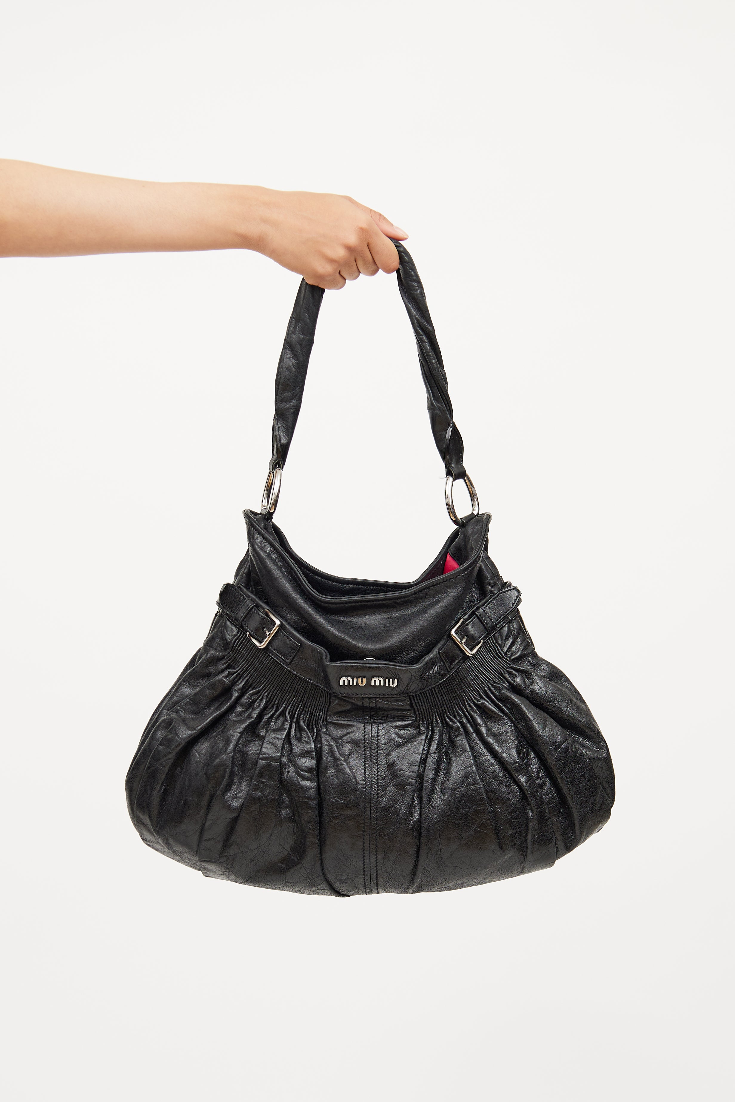 Pre-owned Miu Miu black ruched shoulder bag featuring single ruched top handle, silver tone hardware, strap detail along centre with Miu Miu logo text, snap button closure with exterior slip pockets on front and back and snap button top closure. Pink satin lined main compartment and single zip pocket.