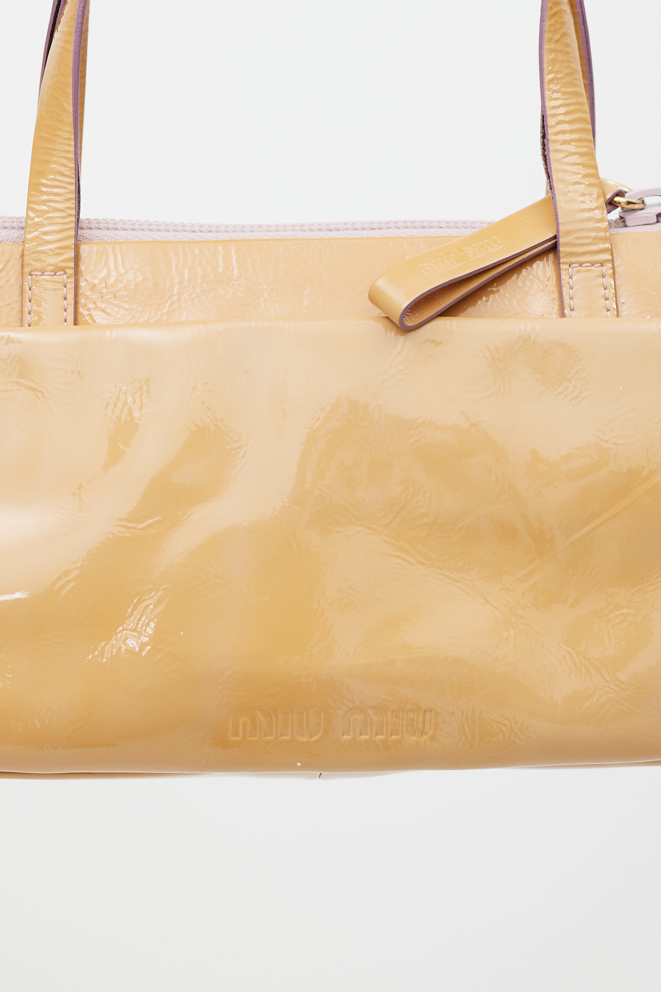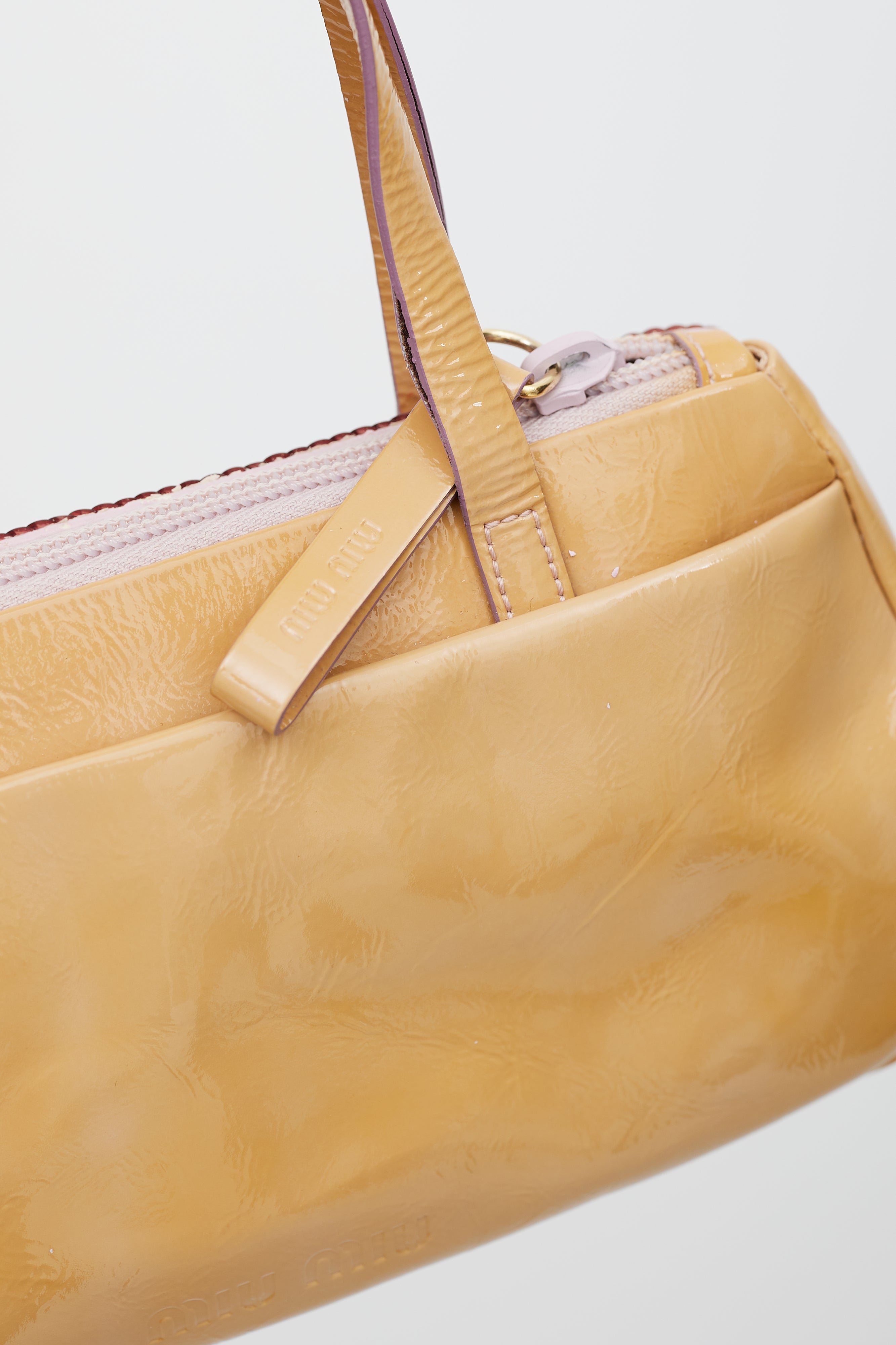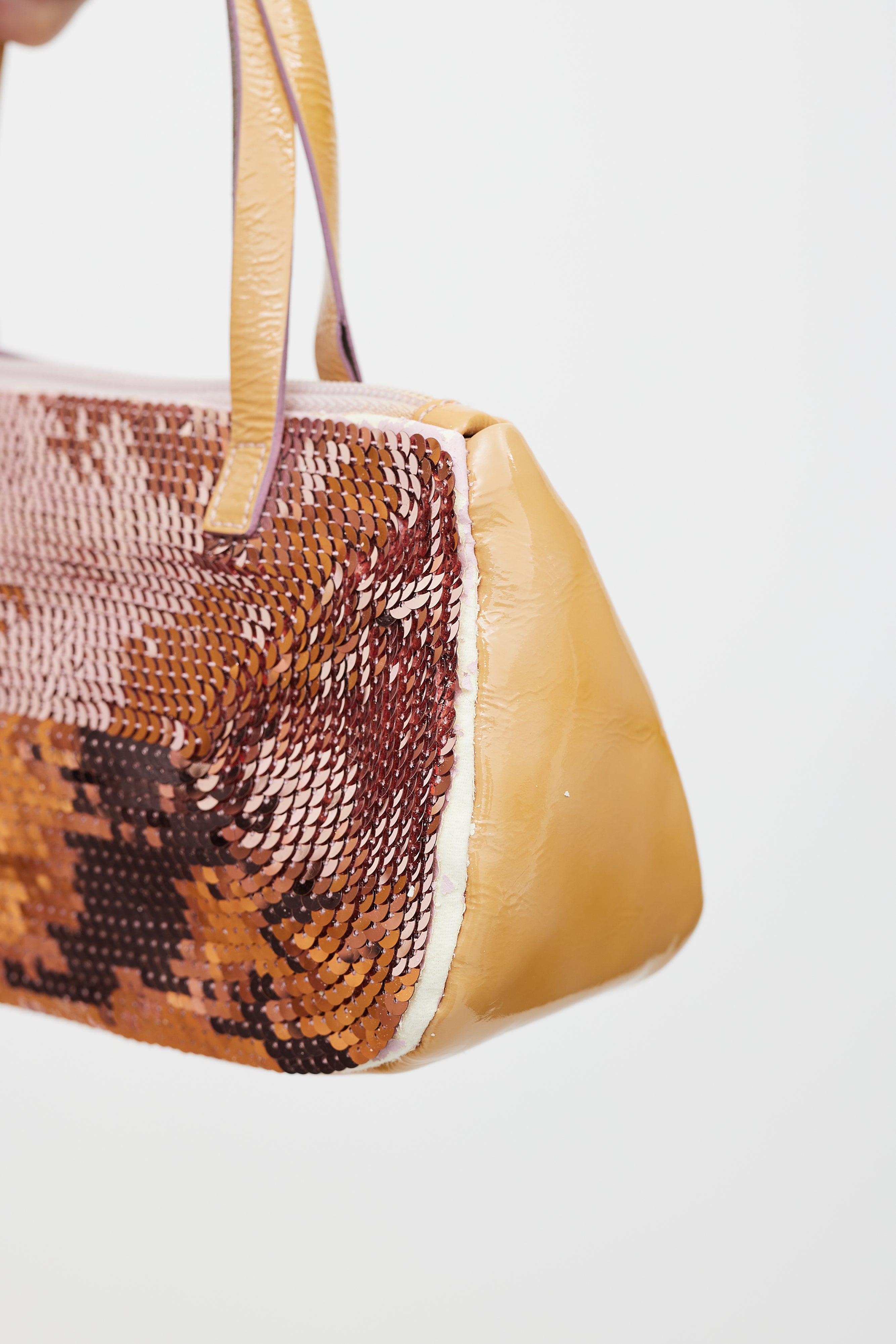Pre-owned Miu Miu orange patent leather bag featuring pink sequin detailing at front, two top handles, embossed logo at back, one main compartment with one zip pocket, one slip pocket at back, and top zip closure. Comes with original dust bag.