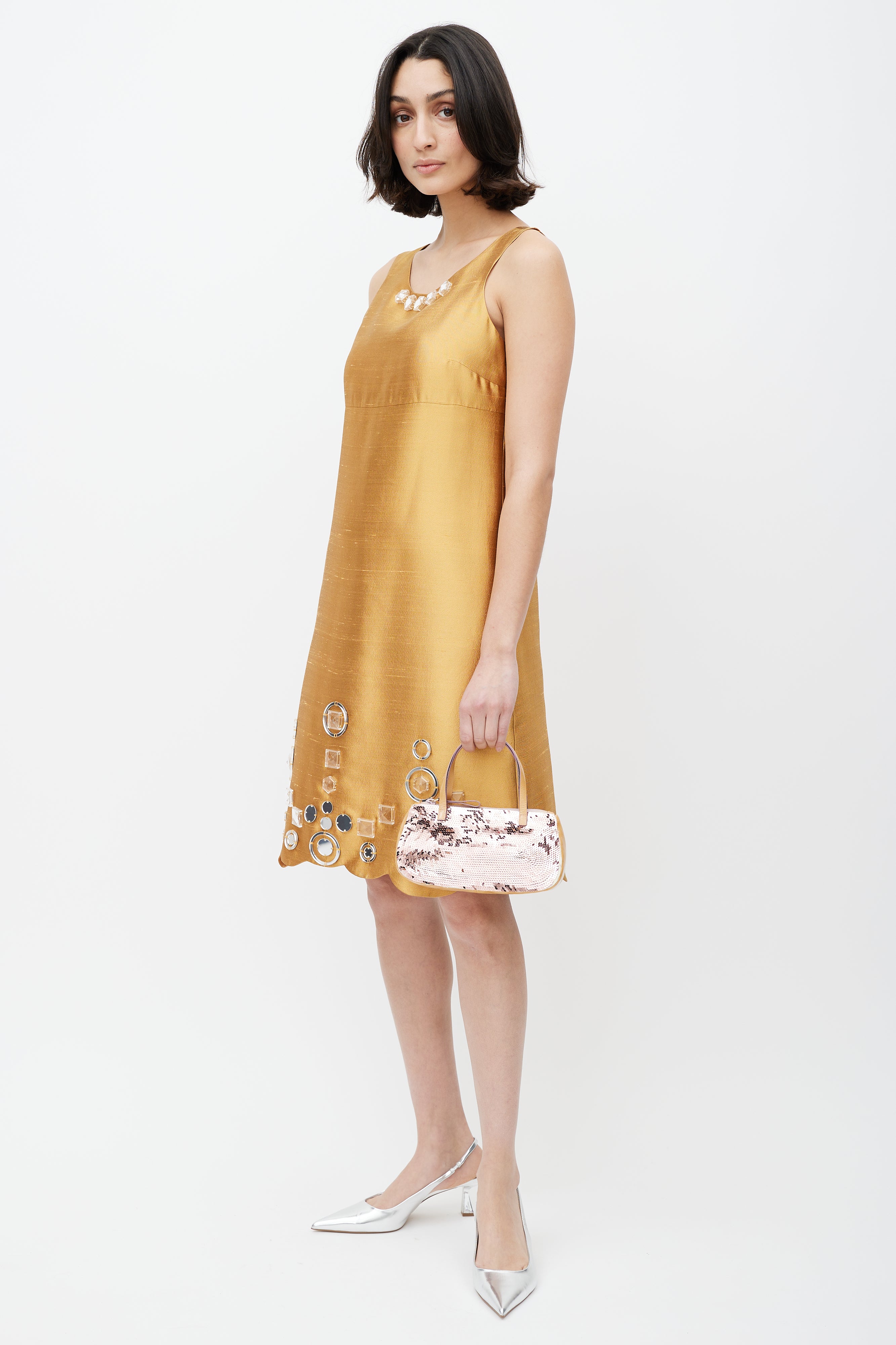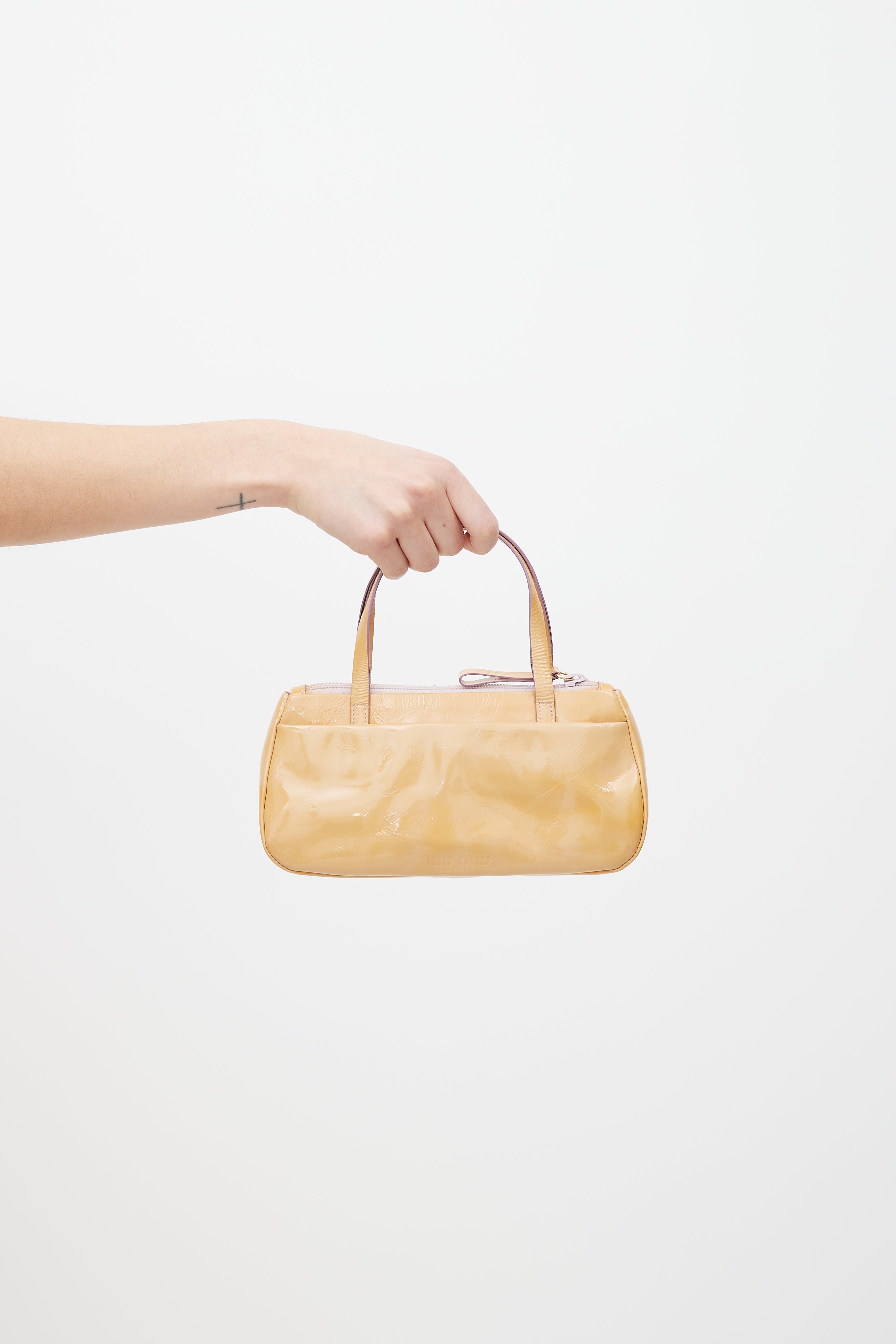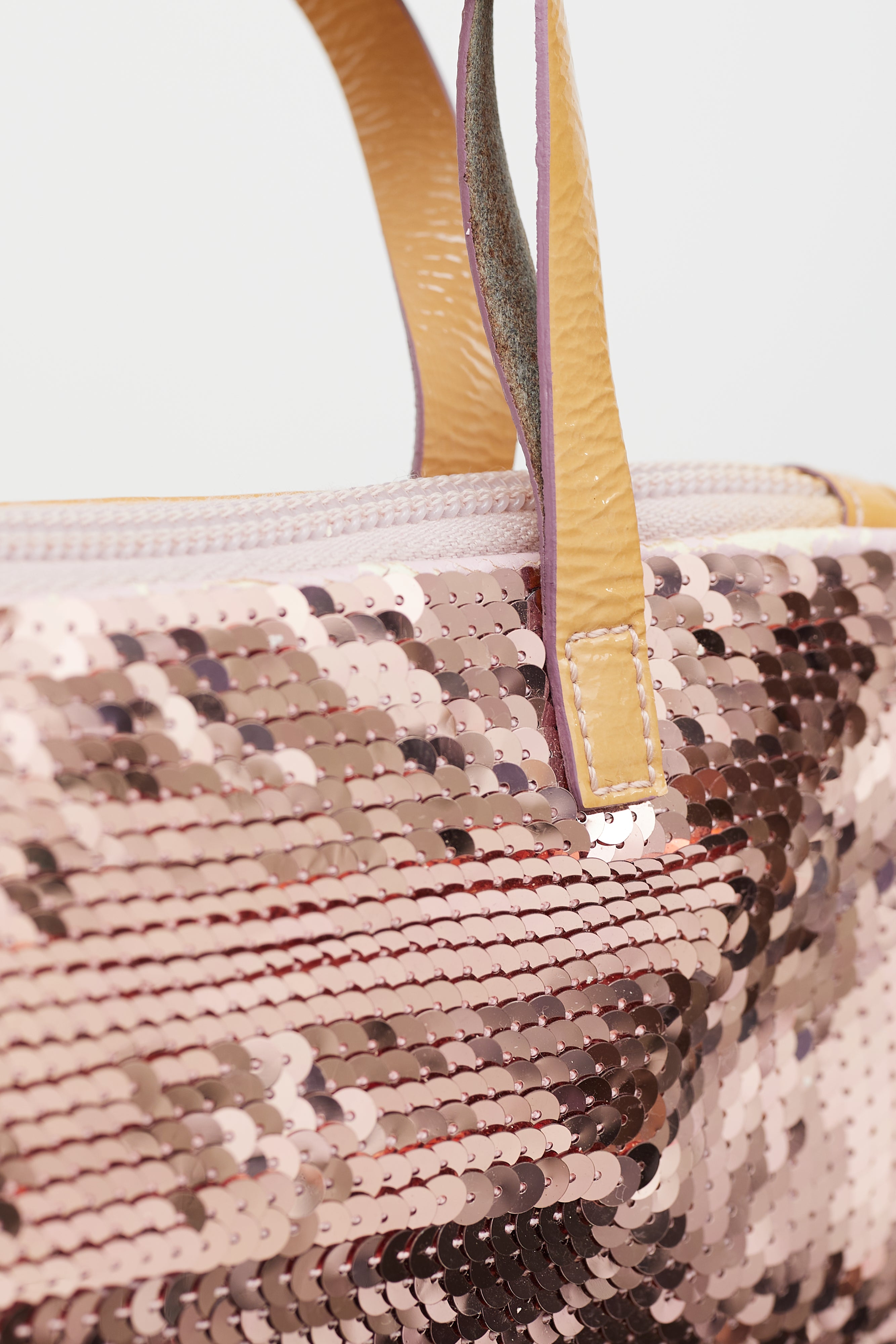Pre-owned Miu Miu orange patent leather bag featuring pink sequin detailing at front, two top handles, embossed logo at back, one main compartment with one zip pocket, one slip pocket at back, and top zip closure. Comes with original dust bag.
