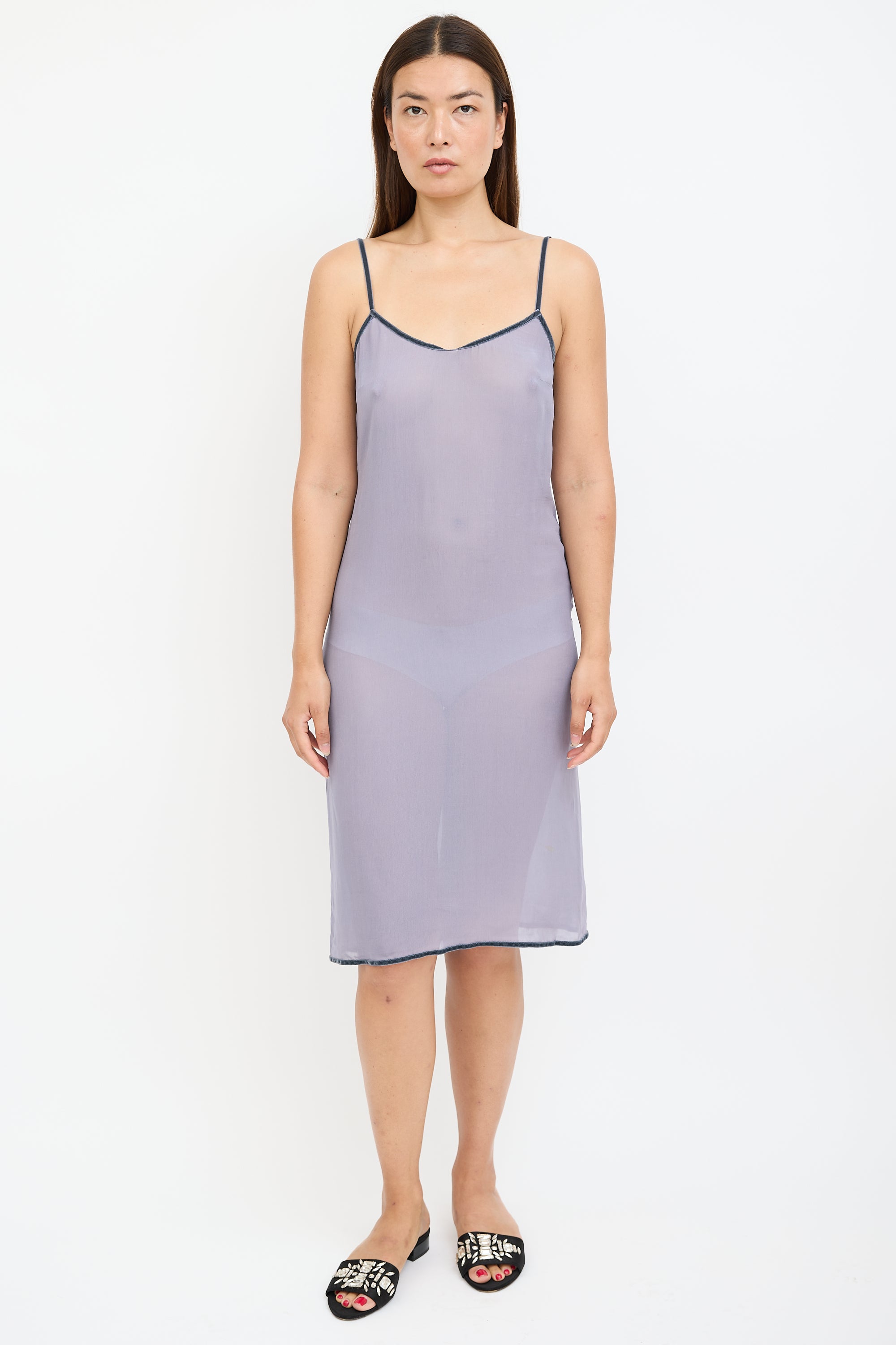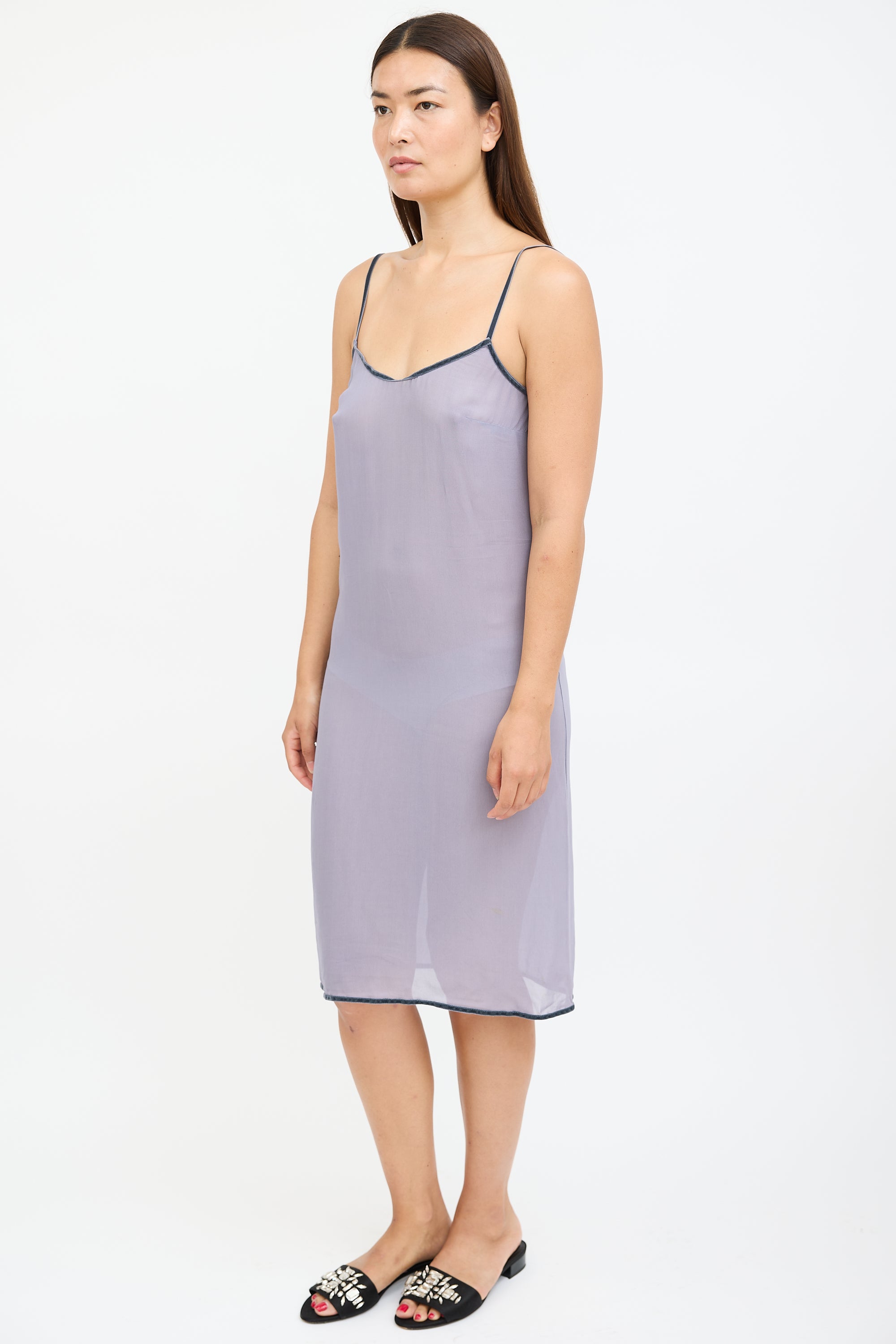 Pre-owned Miu Miu purple sheer slip dress featuring scoop neckline, spaghetti straps, and velvet trim. Unlined.