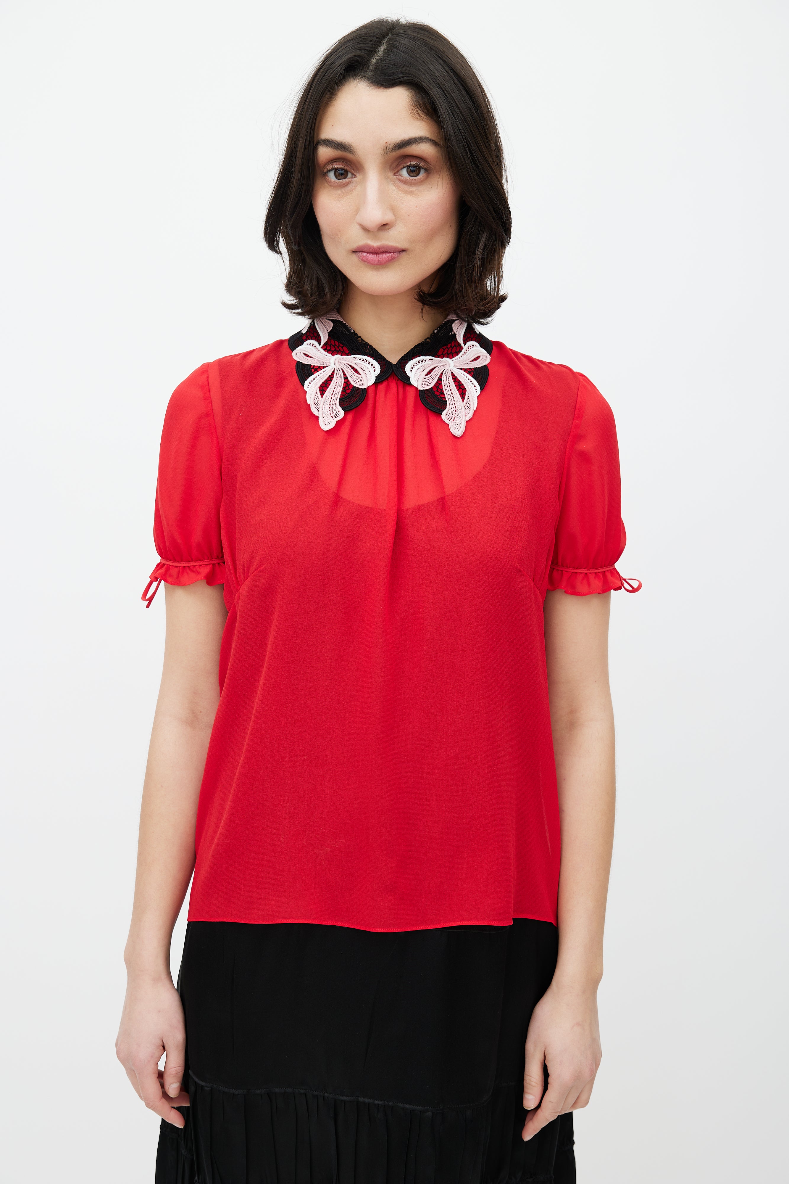Pre-owned Miu Miu red sheer top featuring a black crocheted collar, short sleeves with drawstring detail, and button closure at back.