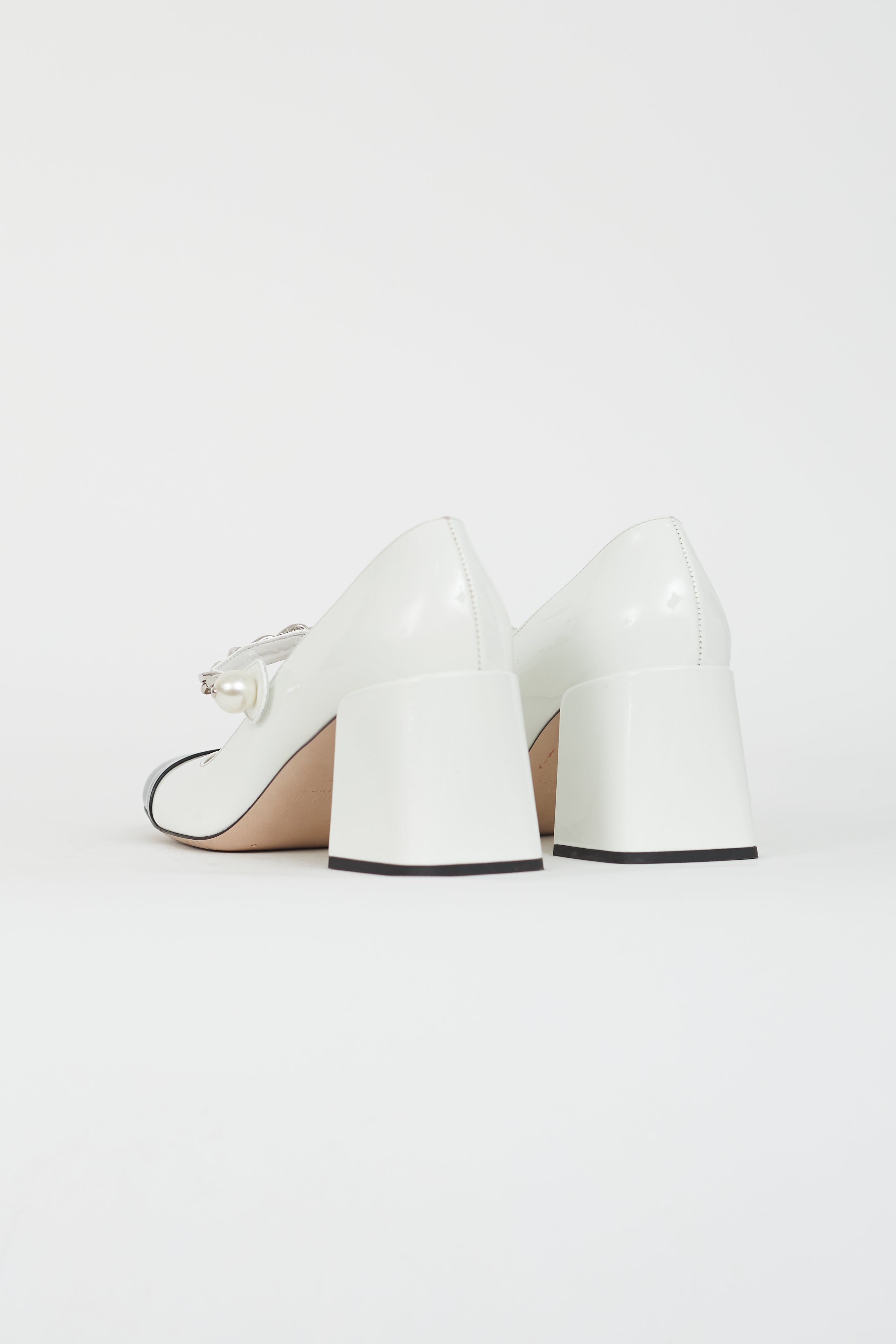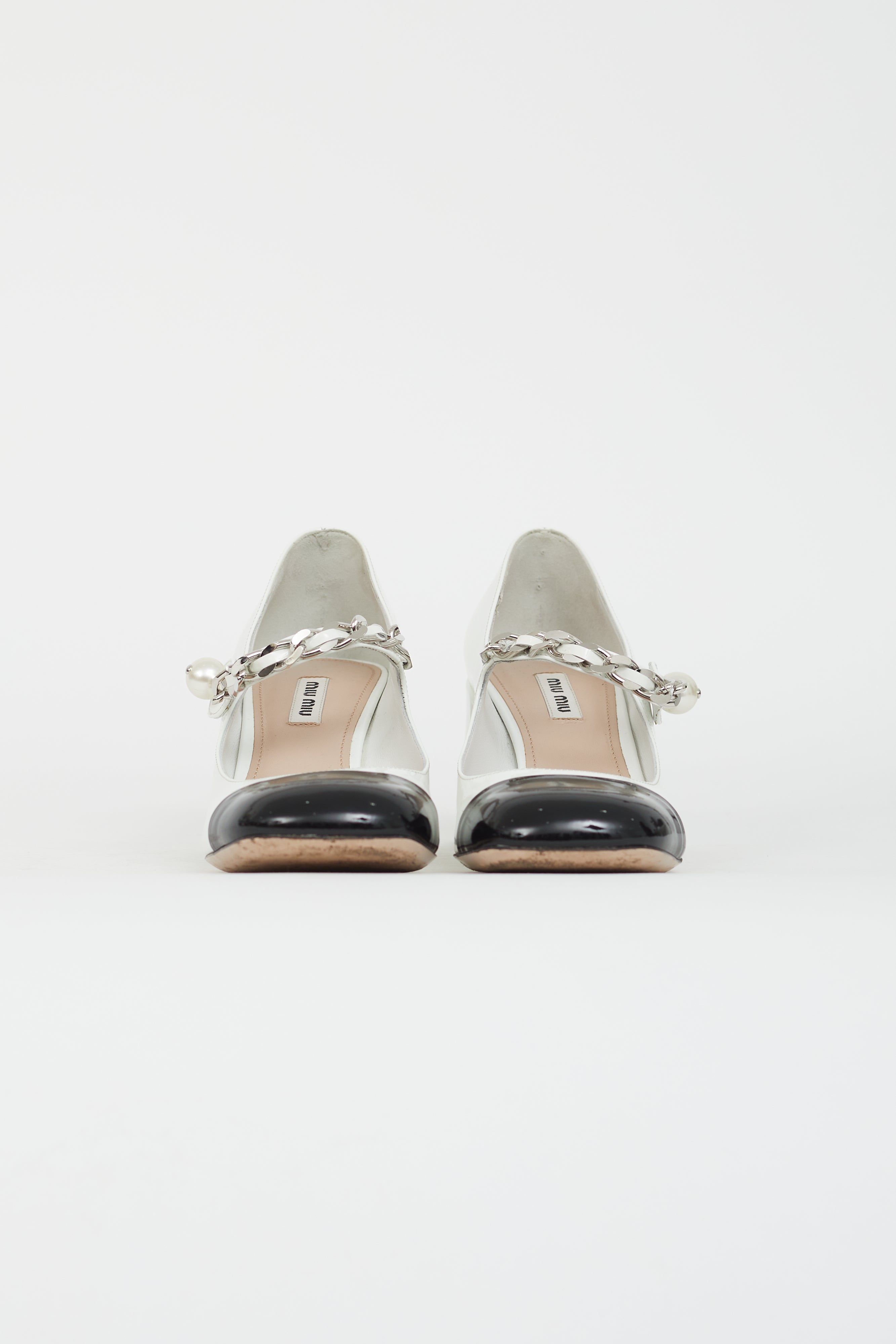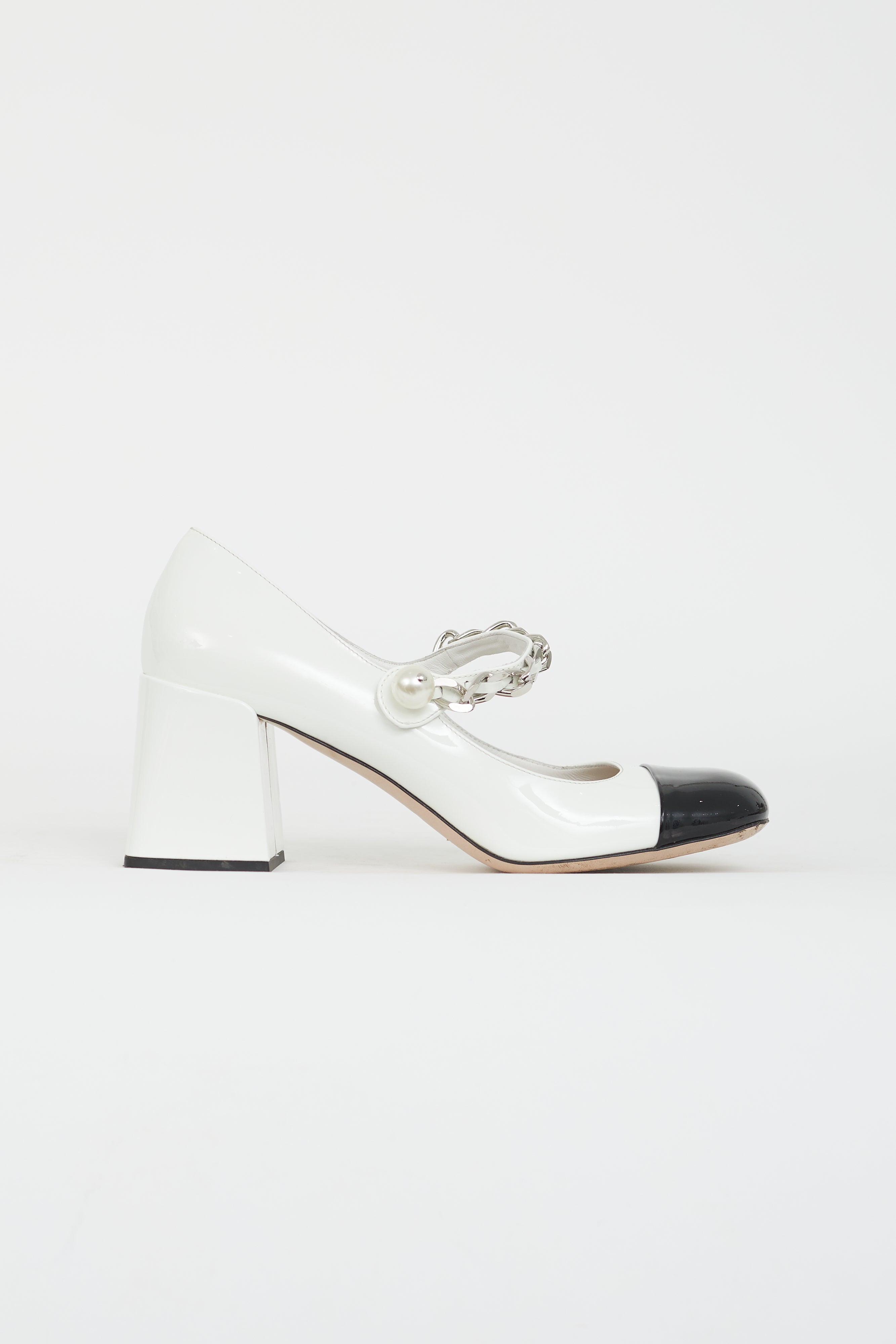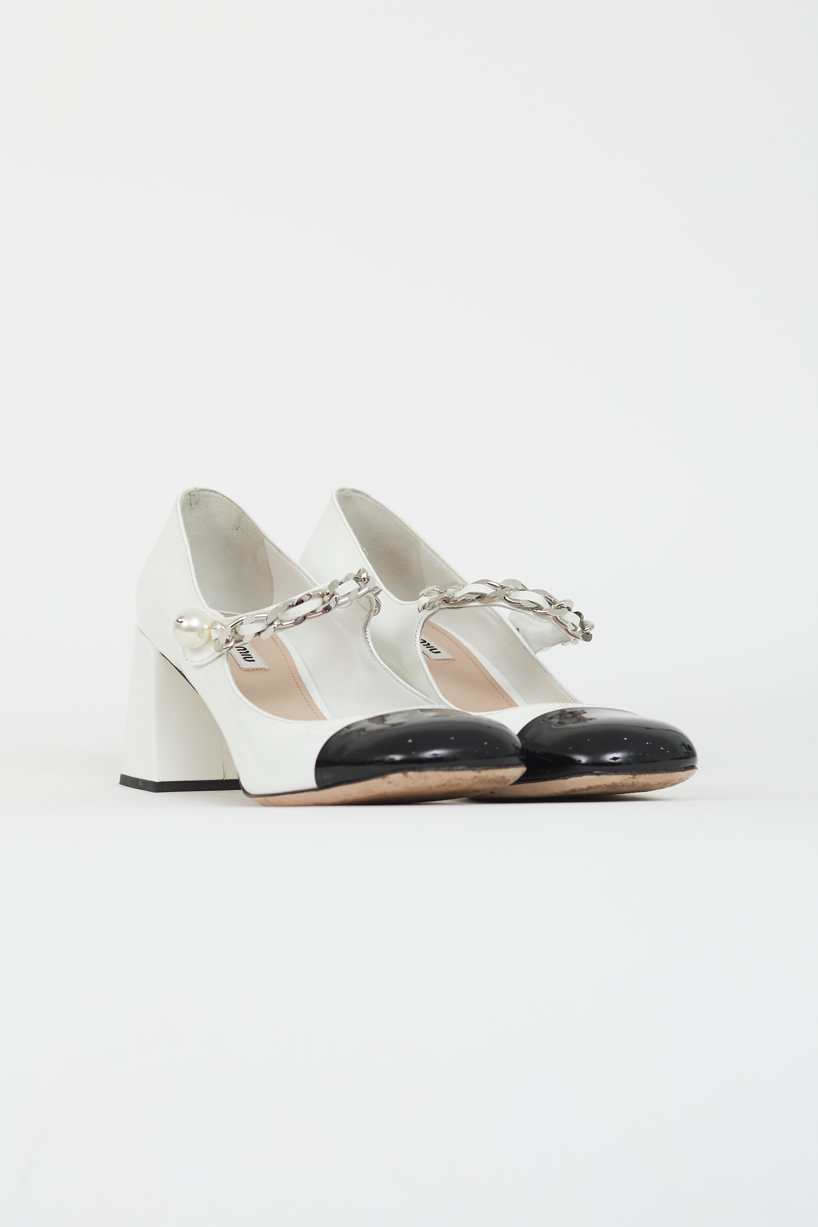 Pre-owned Miu Miu white patent heels featuring black tapered square toe, flared block heel, and strap across vamp with silver tone chain link and pearl embellishment. Original dust bag included.
