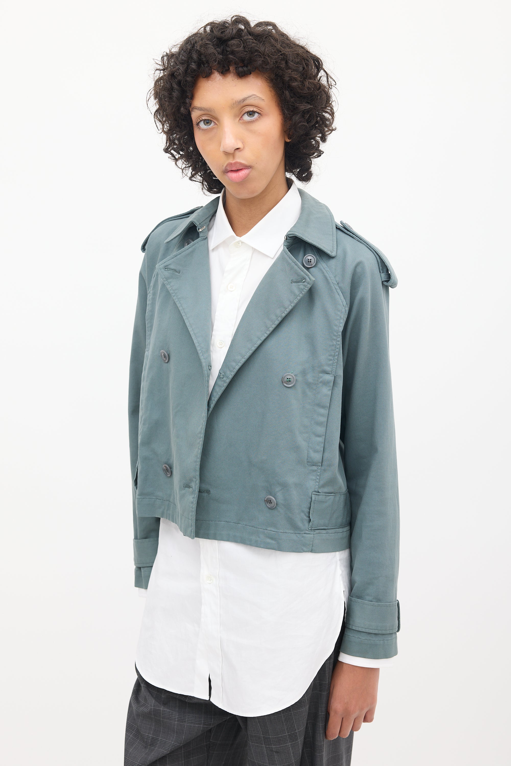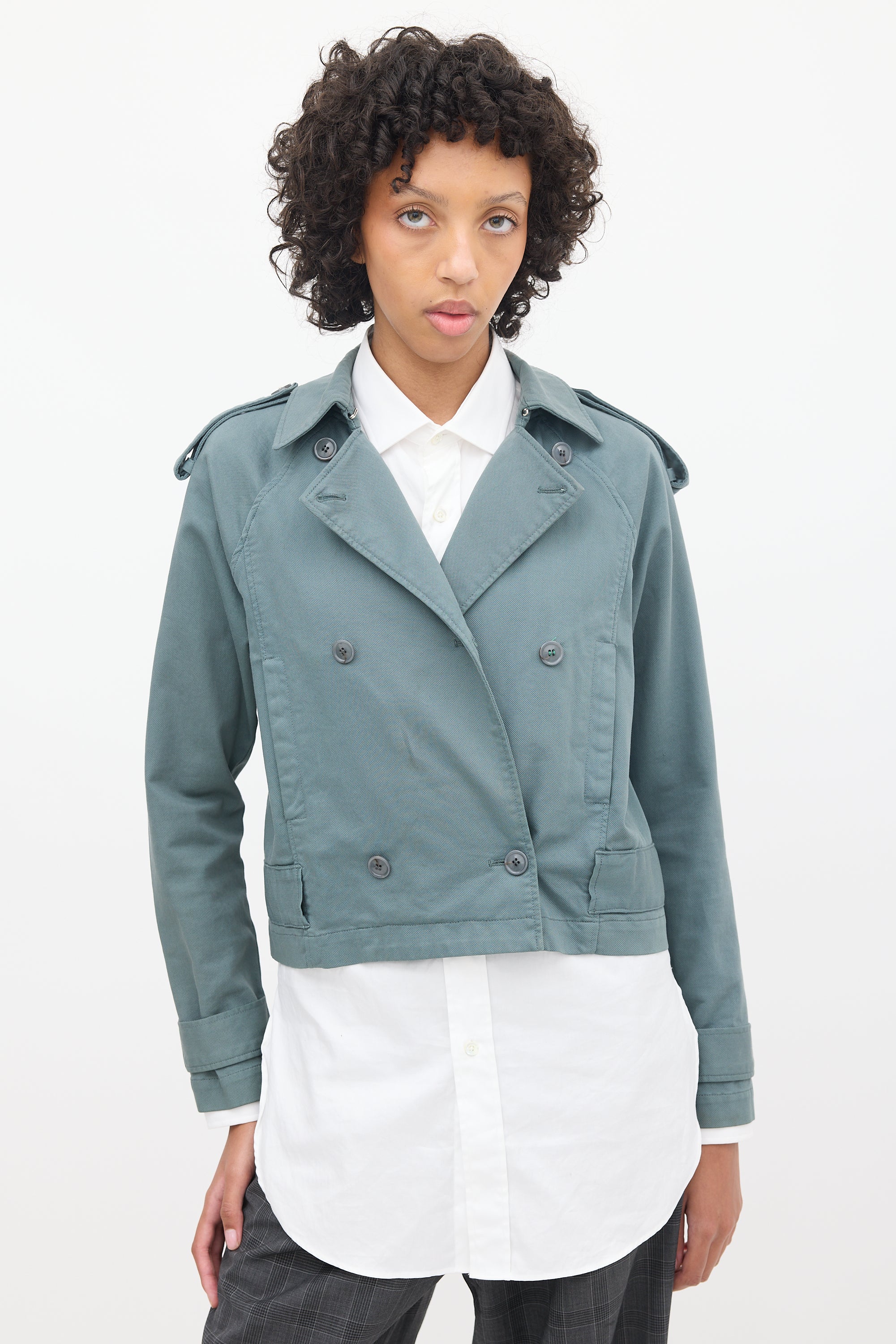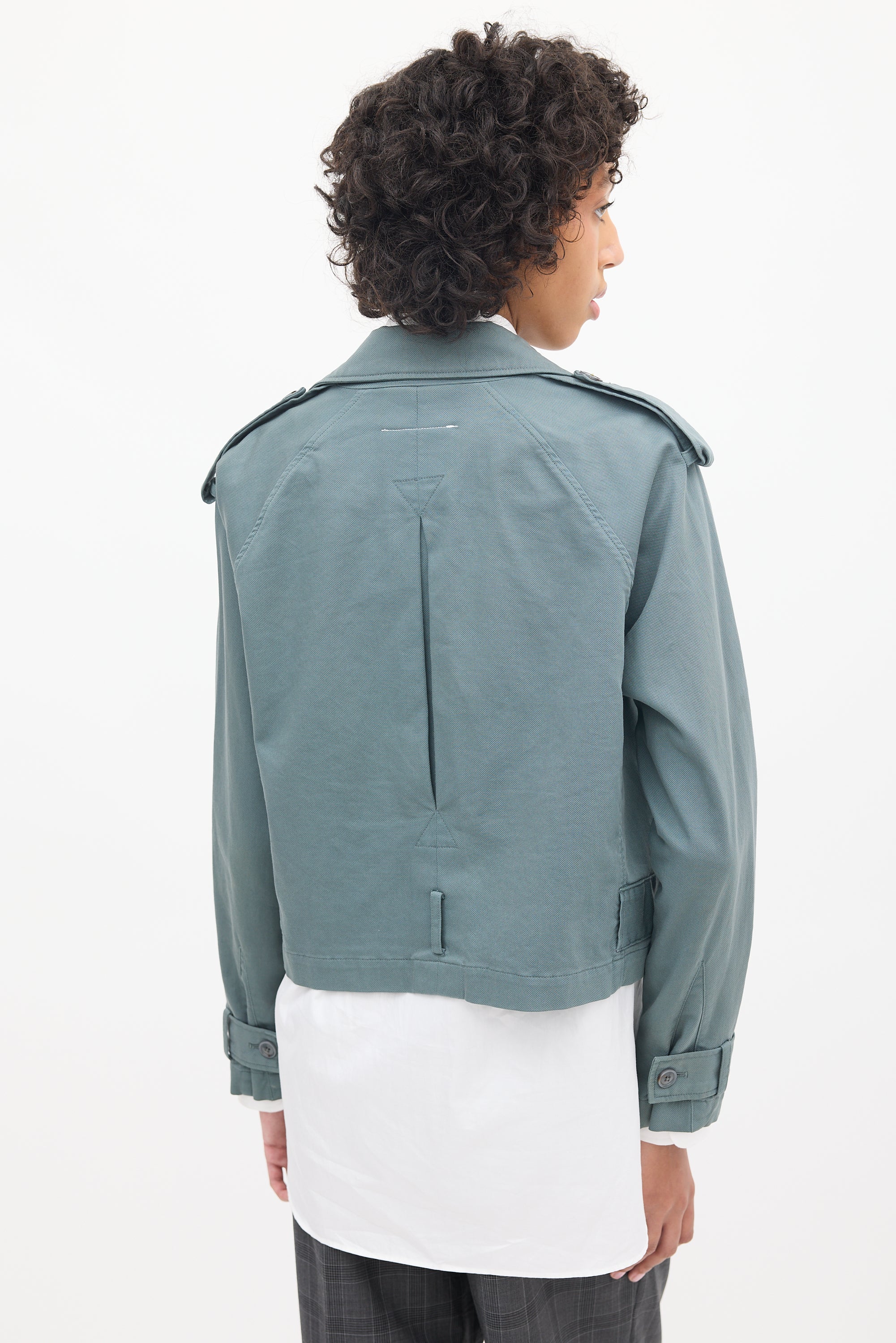 Pre-owned MM6 Maison Margiela slate grey short trench jacket featuring a pointed collar, double breasted button up front, two fronts slip pockets, epaulettes at shoulders, and long sleeves with strapped cuffs.