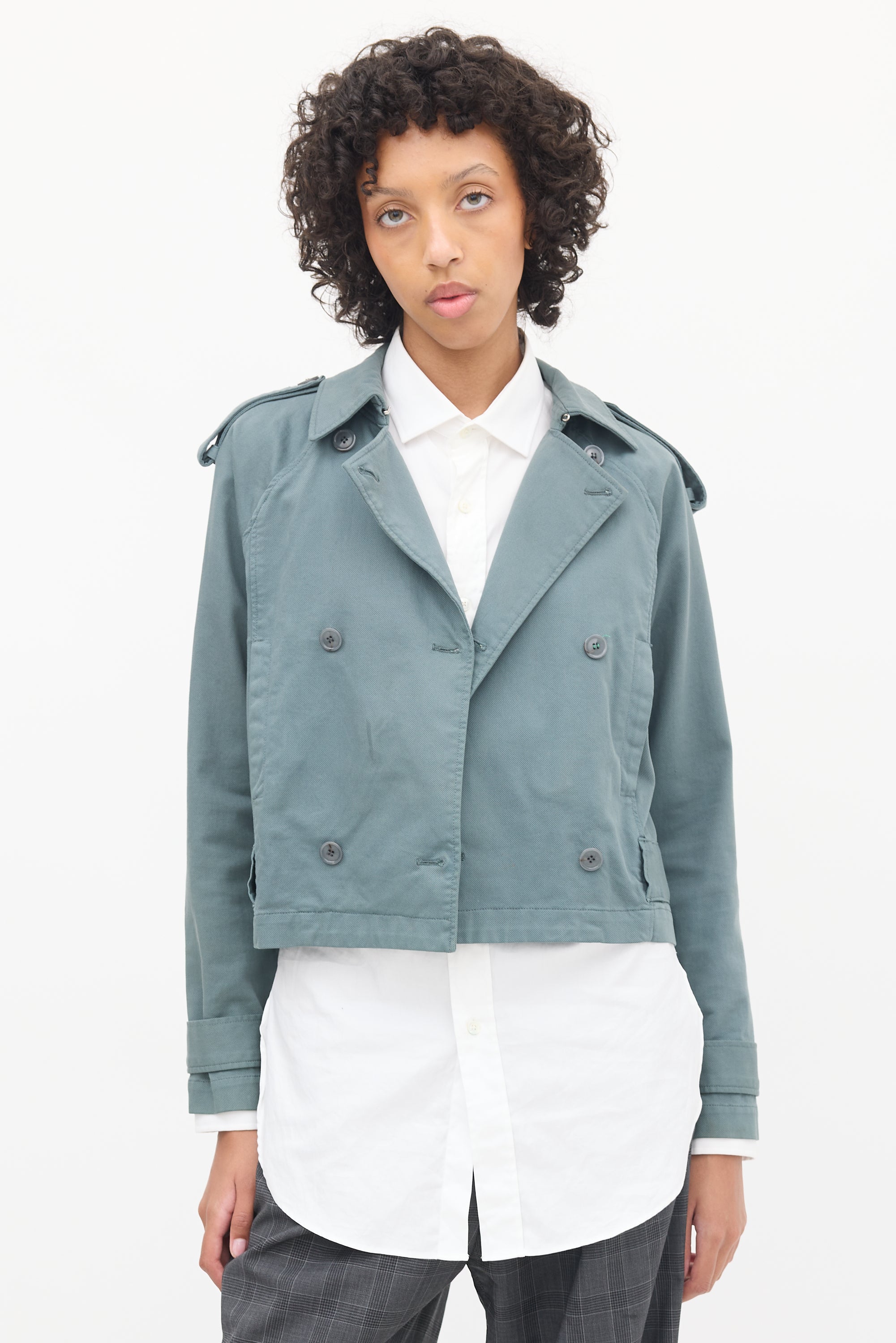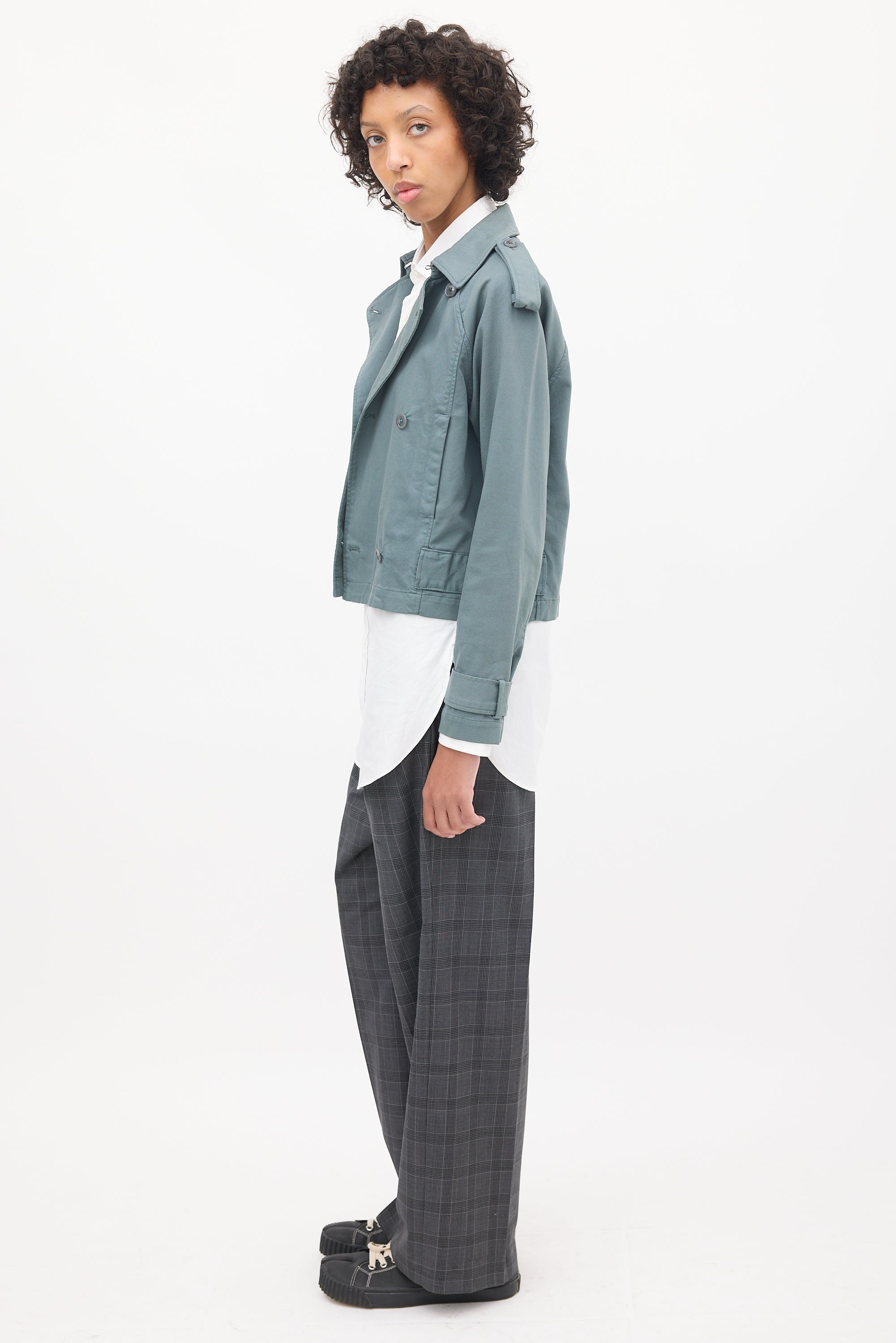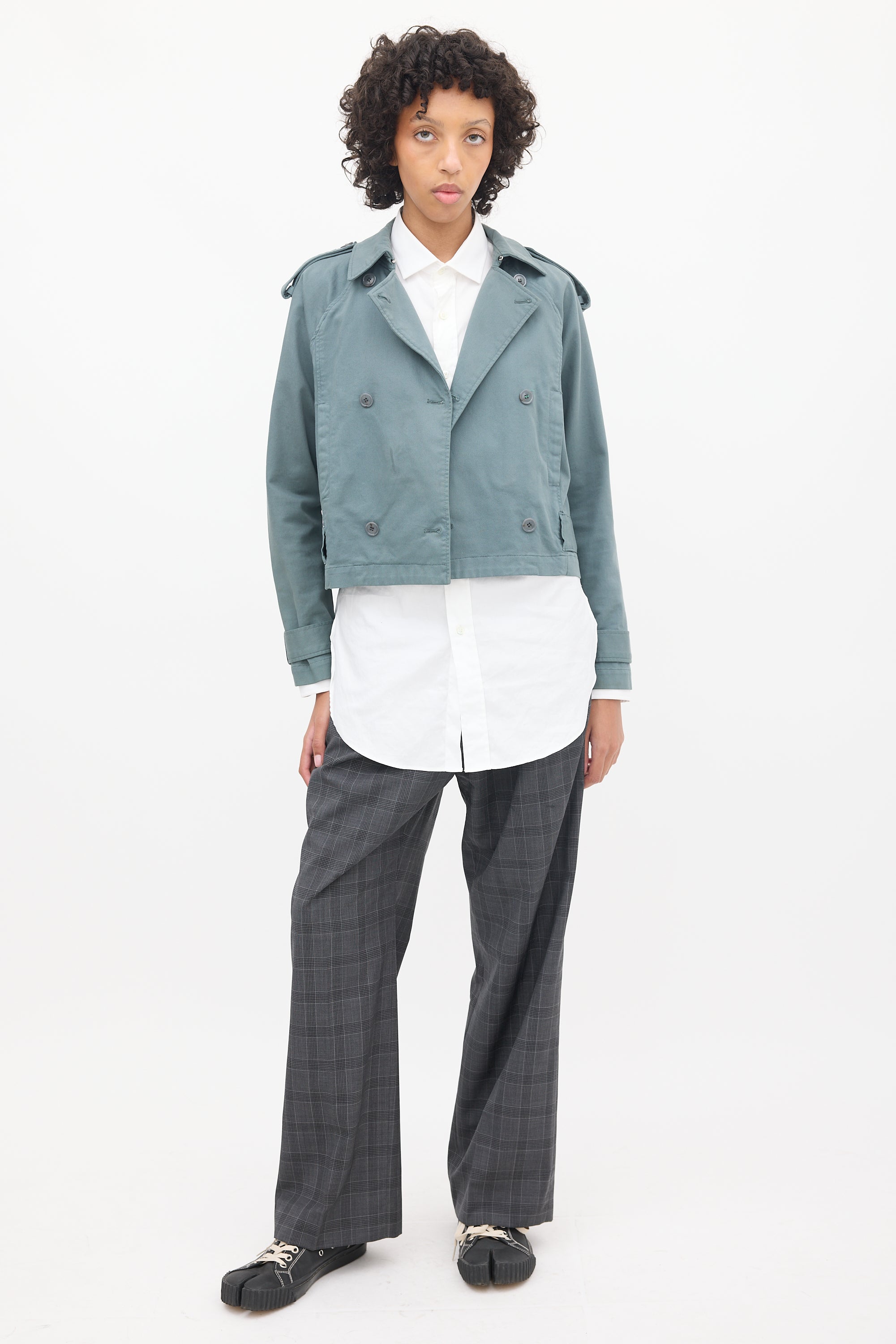 Pre-owned MM6 Maison Margiela slate grey short trench jacket featuring a pointed collar, double breasted button up front, two fronts slip pockets, epaulettes at shoulders, and long sleeves with strapped cuffs.