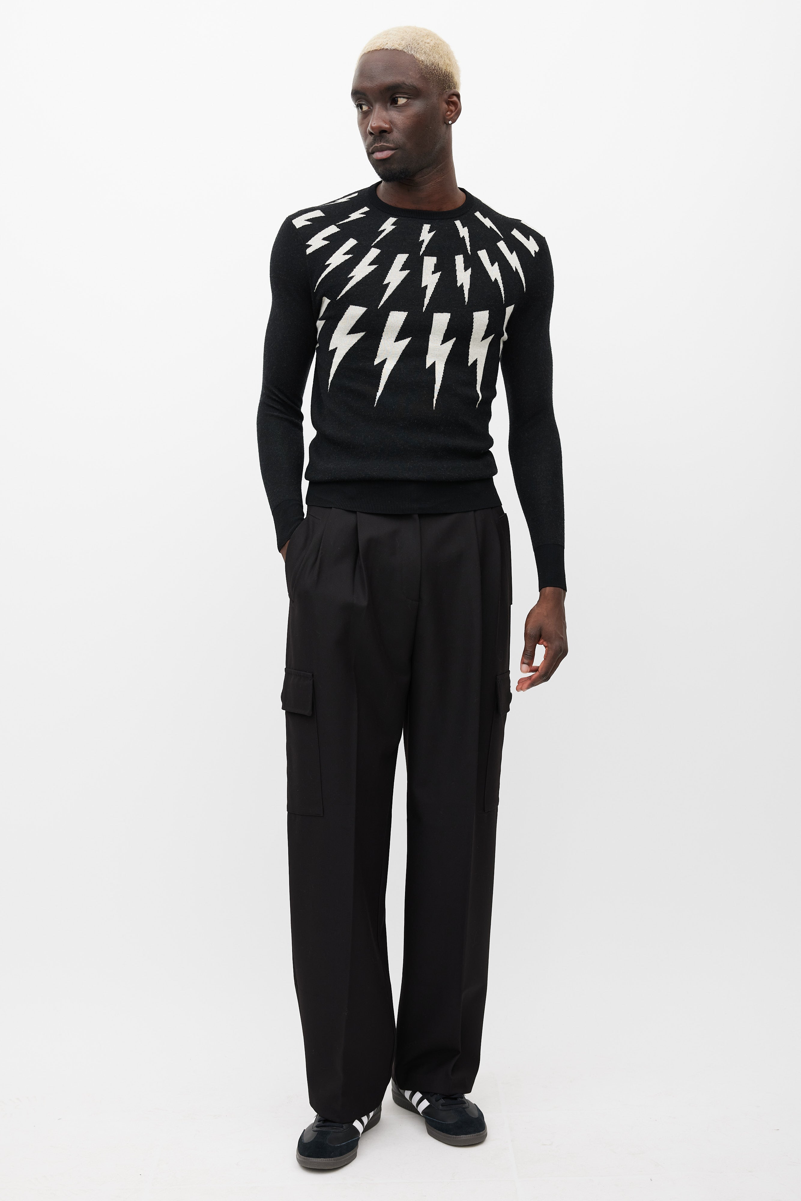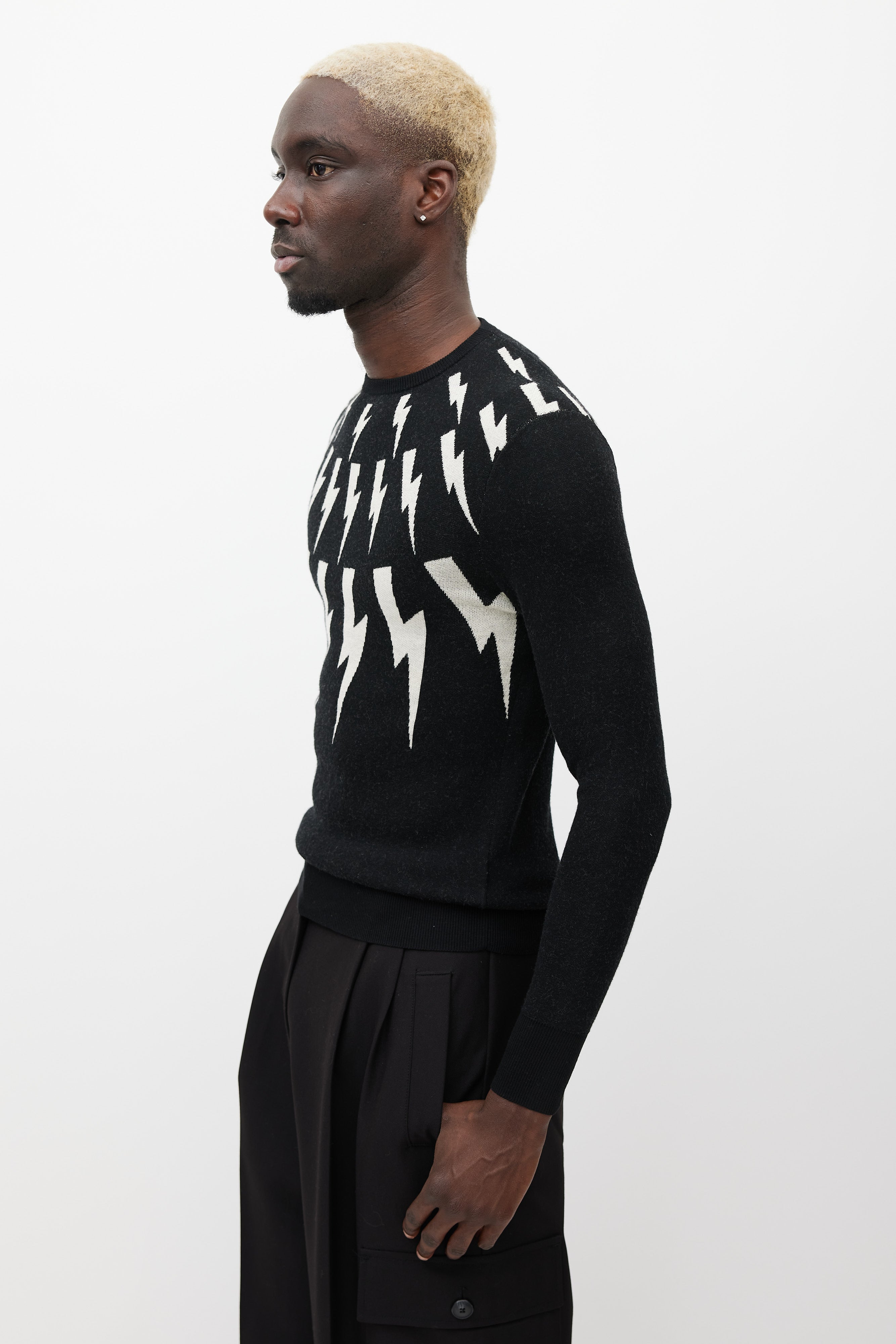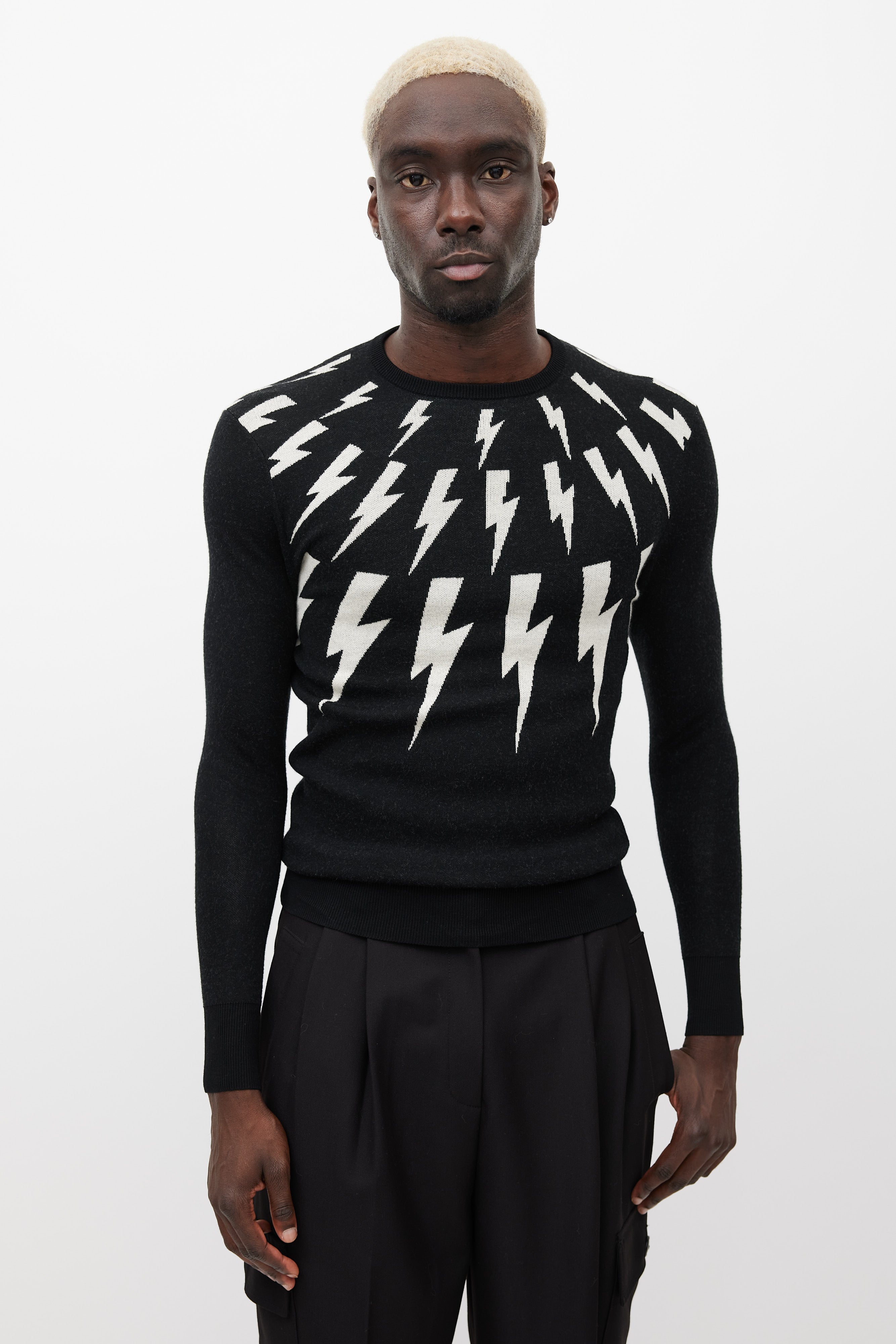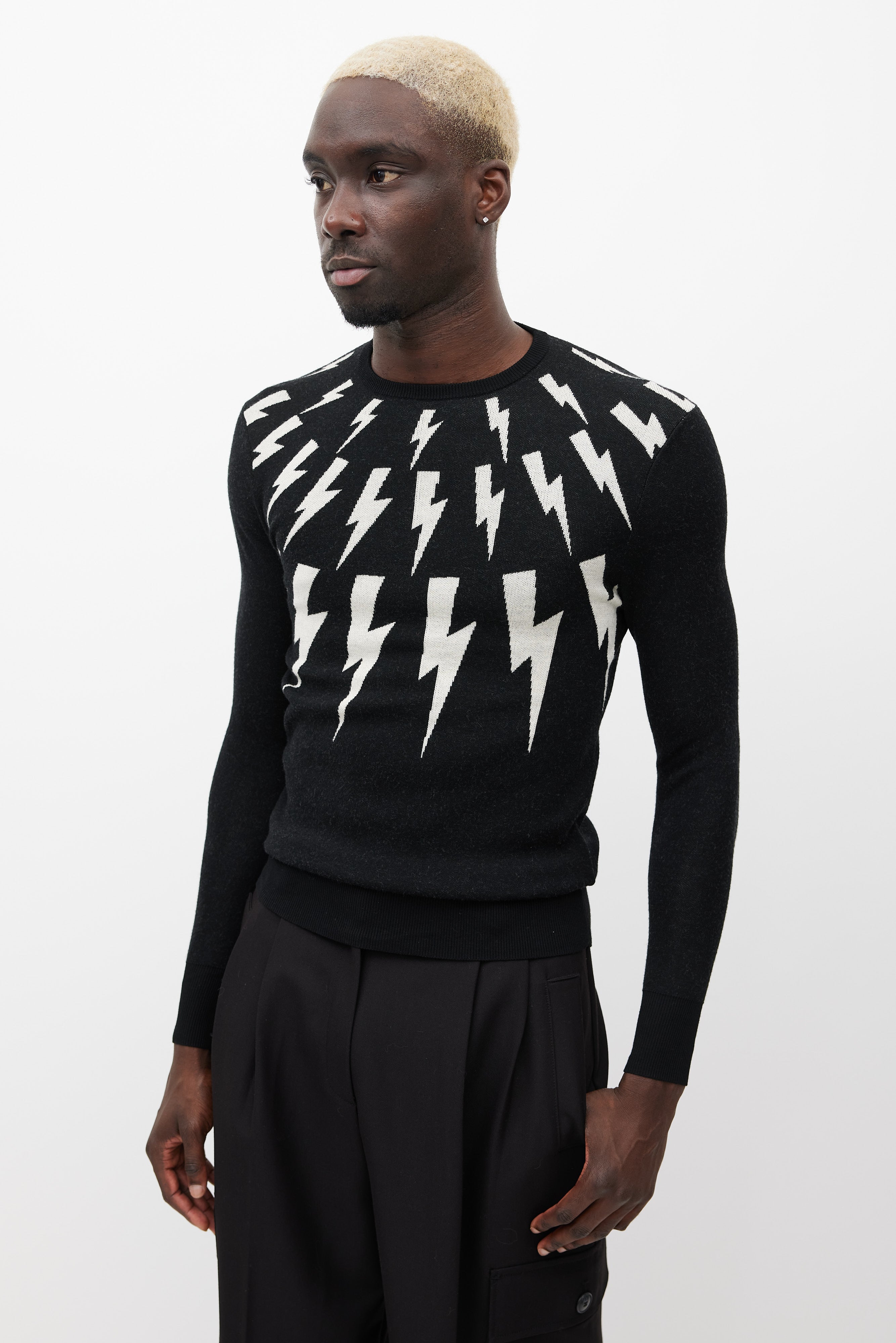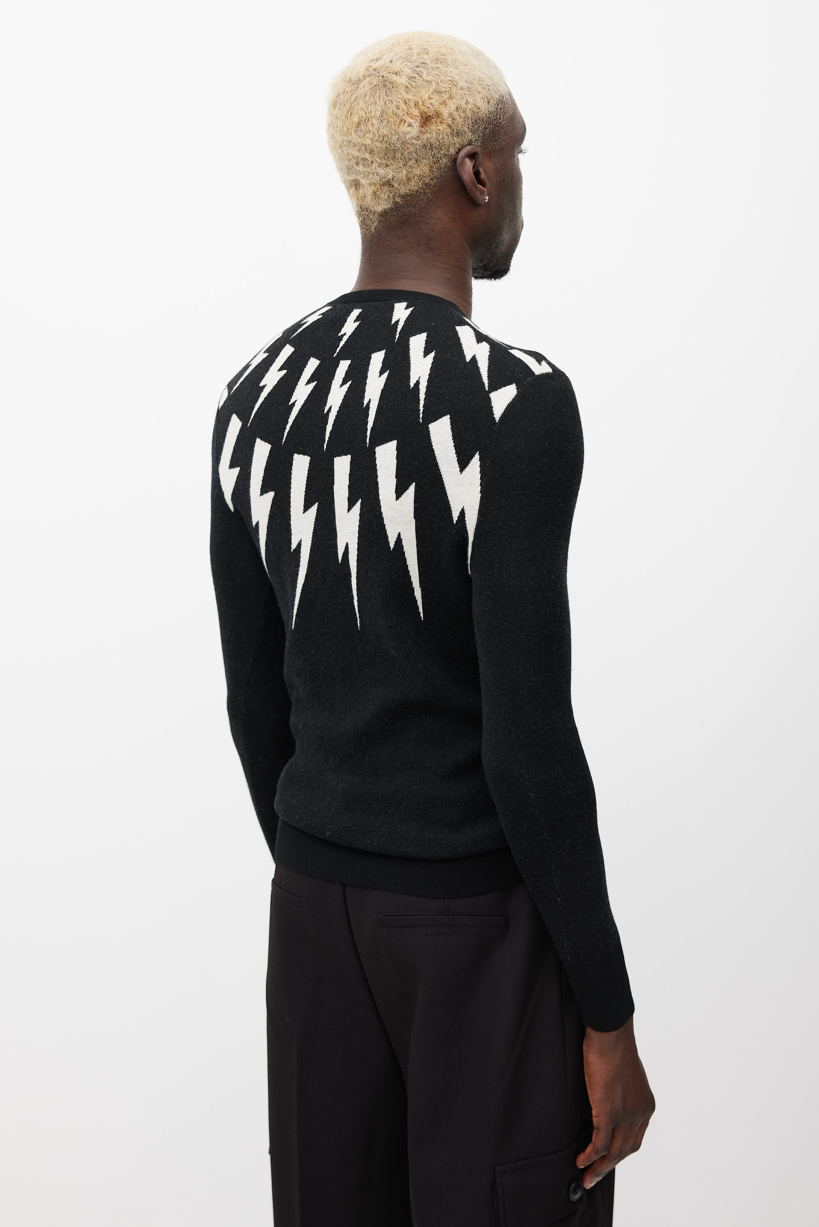 Pre-owned Neil Barrett black knit sweater featuring a white lightning bolt pattern throughout, round neckline, long sleeves, and ribbed hem.