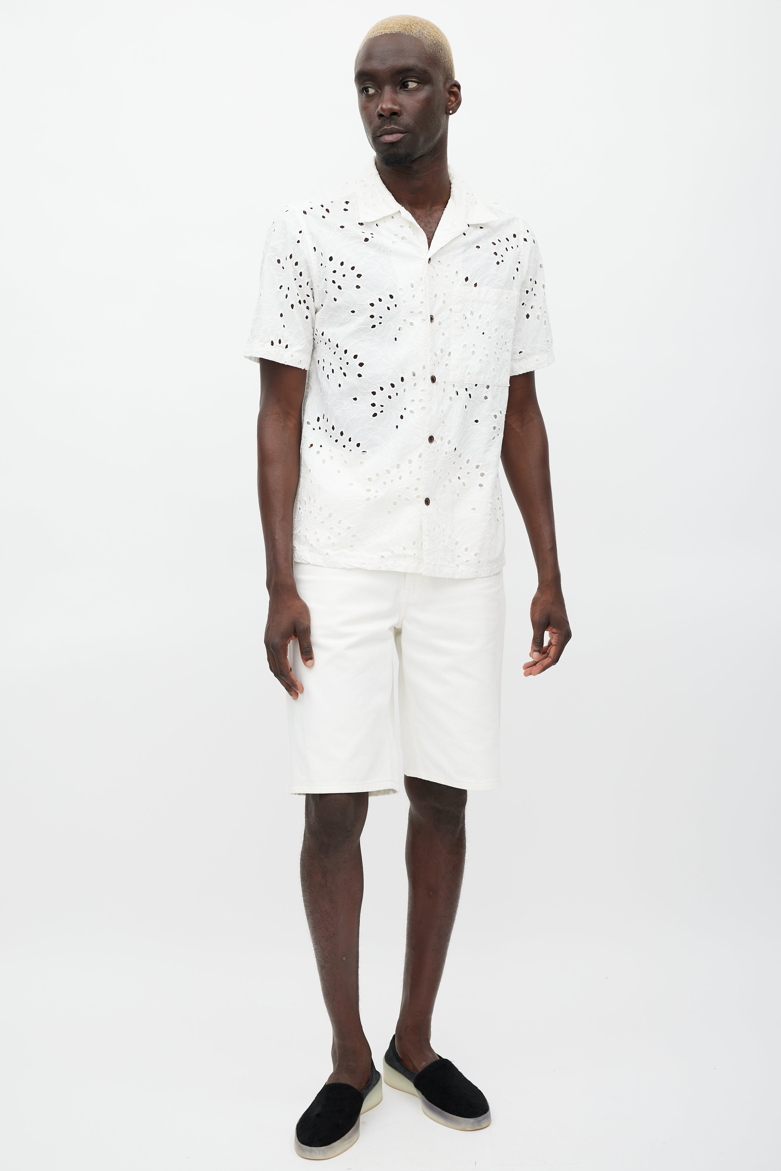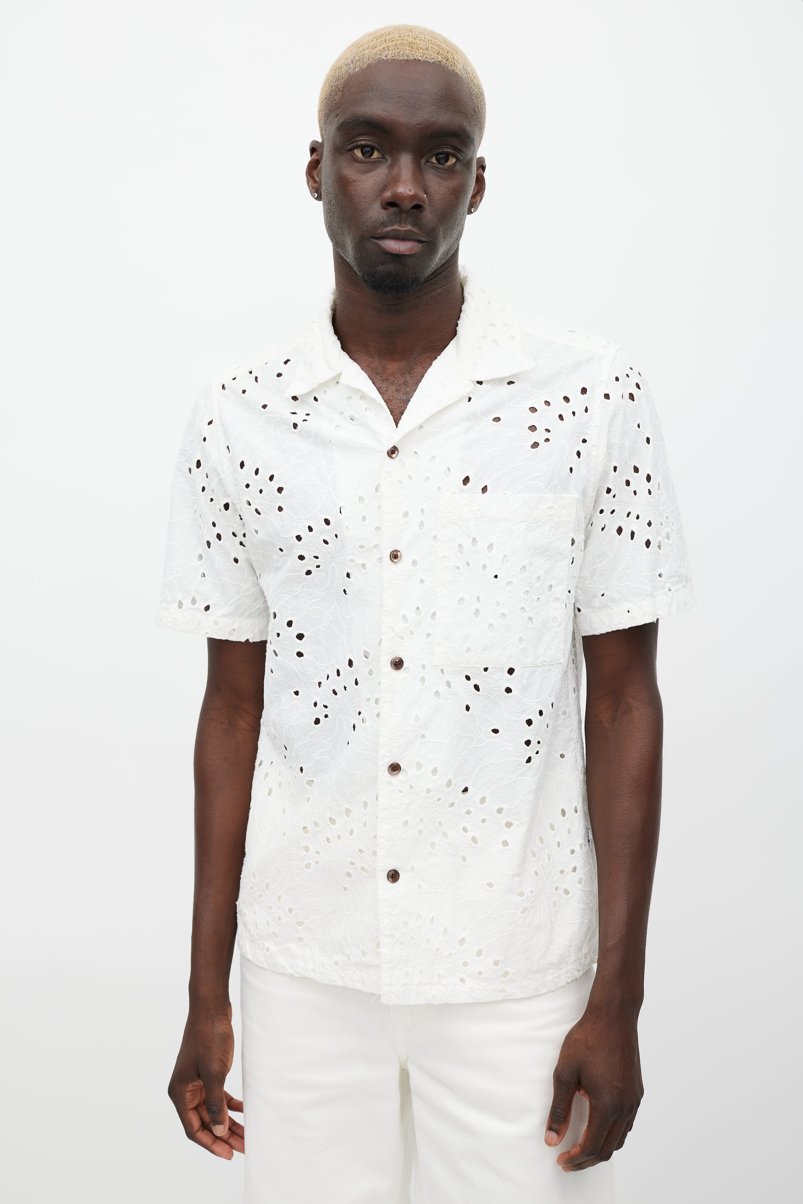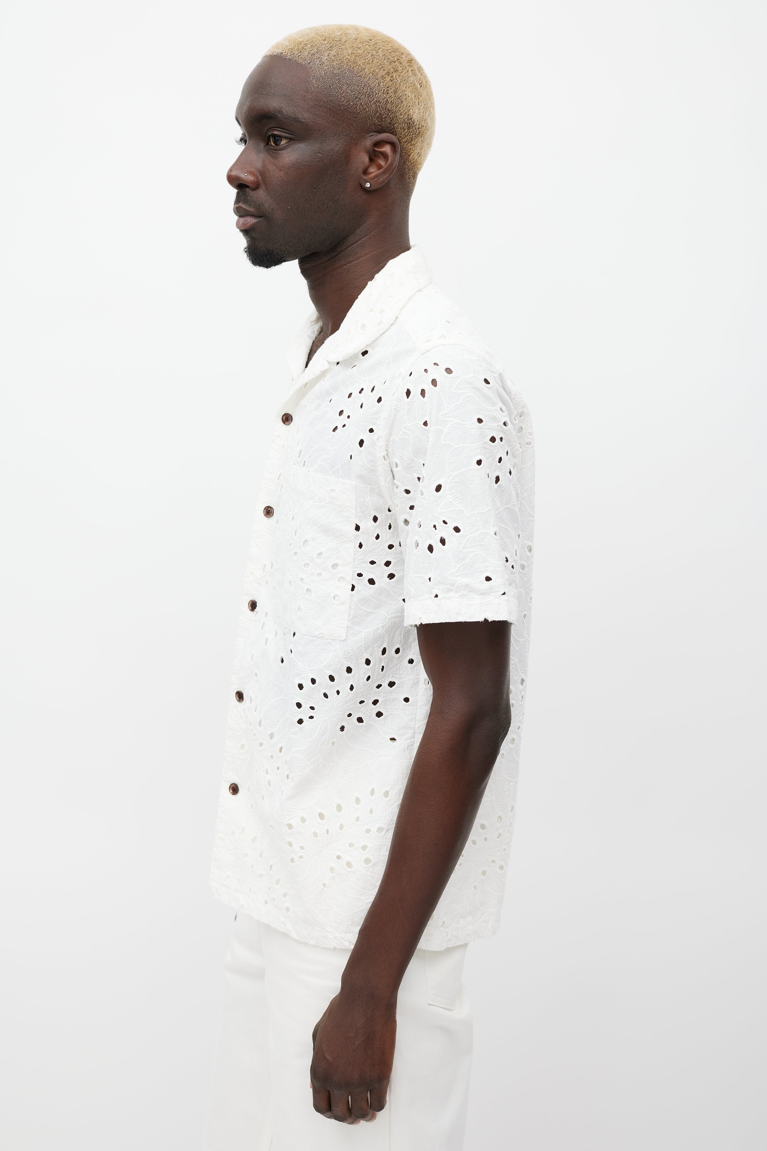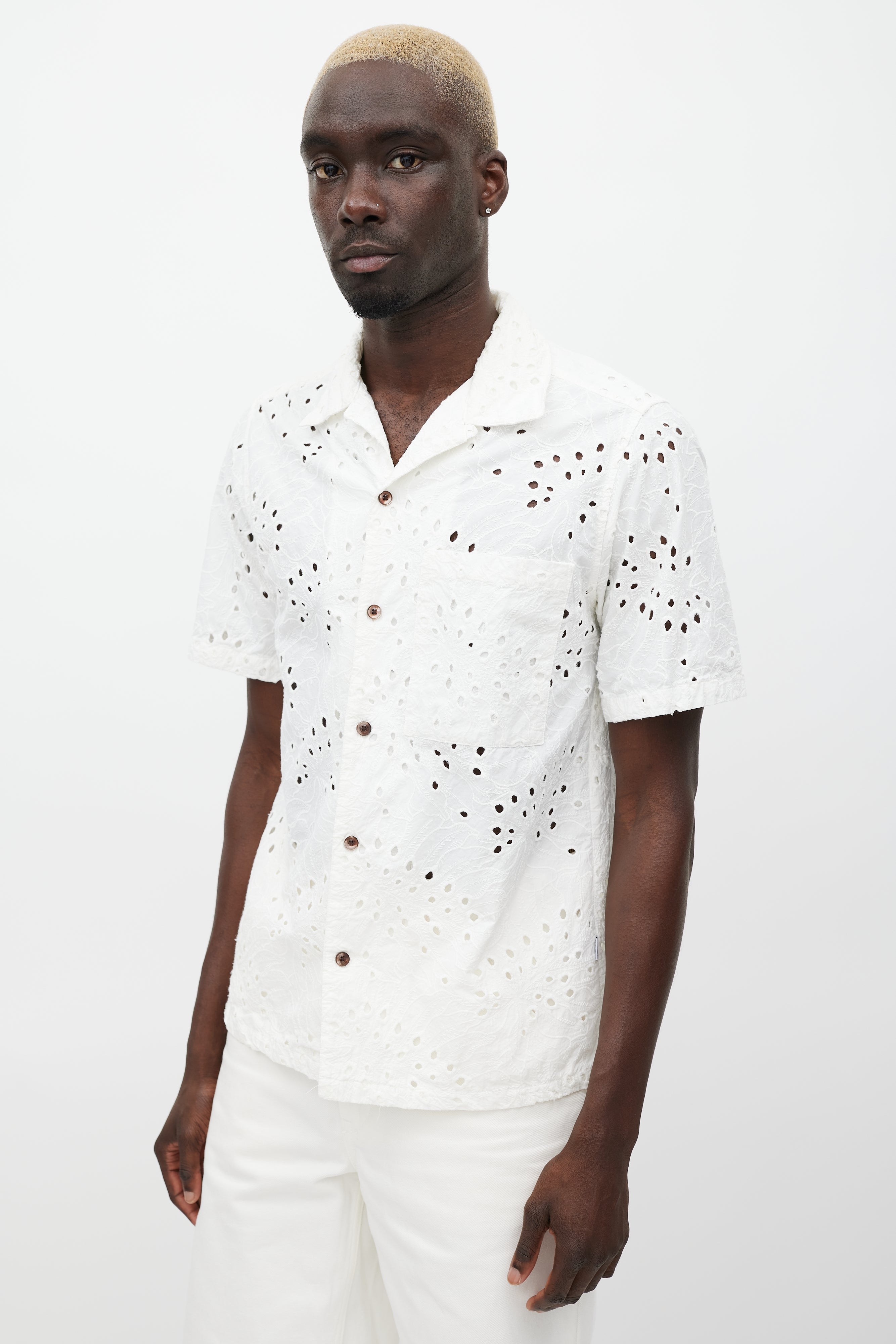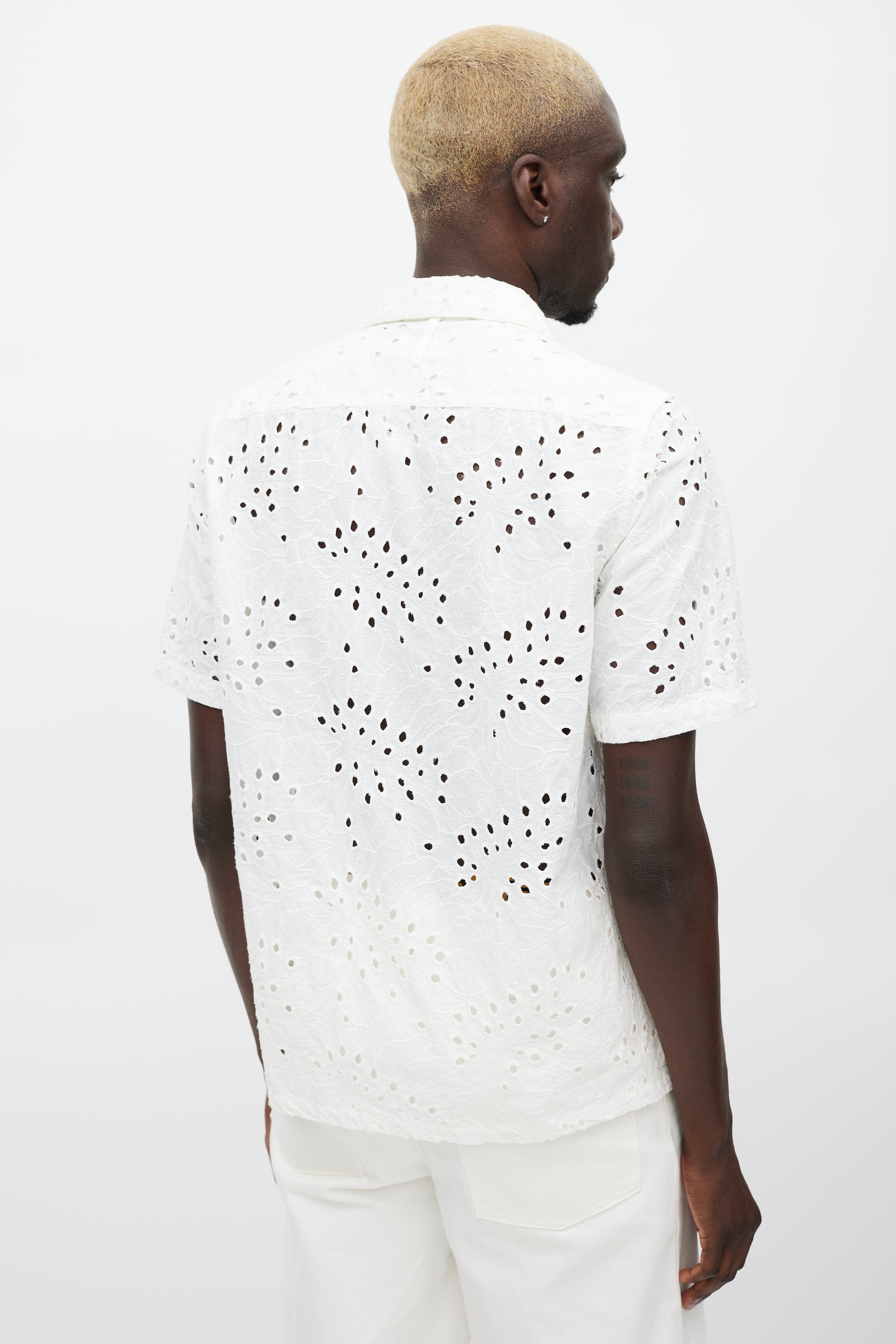 Pre-owned NN07 white shirt featuring a floral eyelet lace pattern throughout, camp collar, short sleeves, one patch pocket at chest, and button up closure.