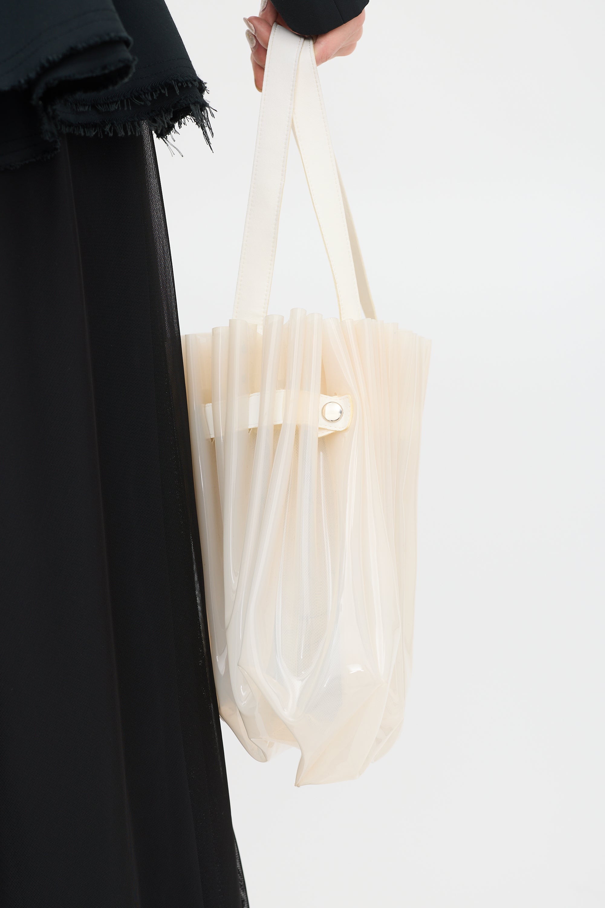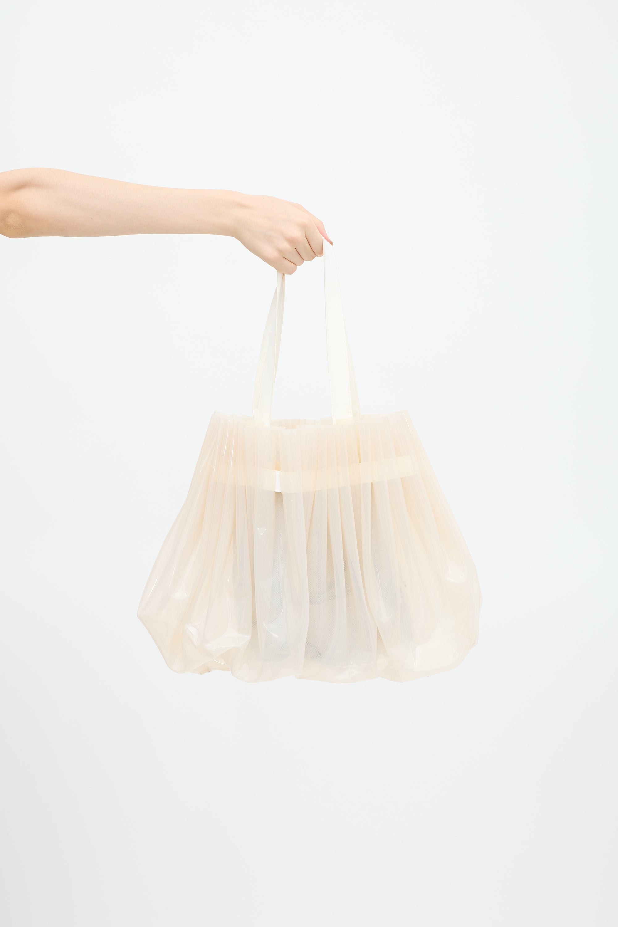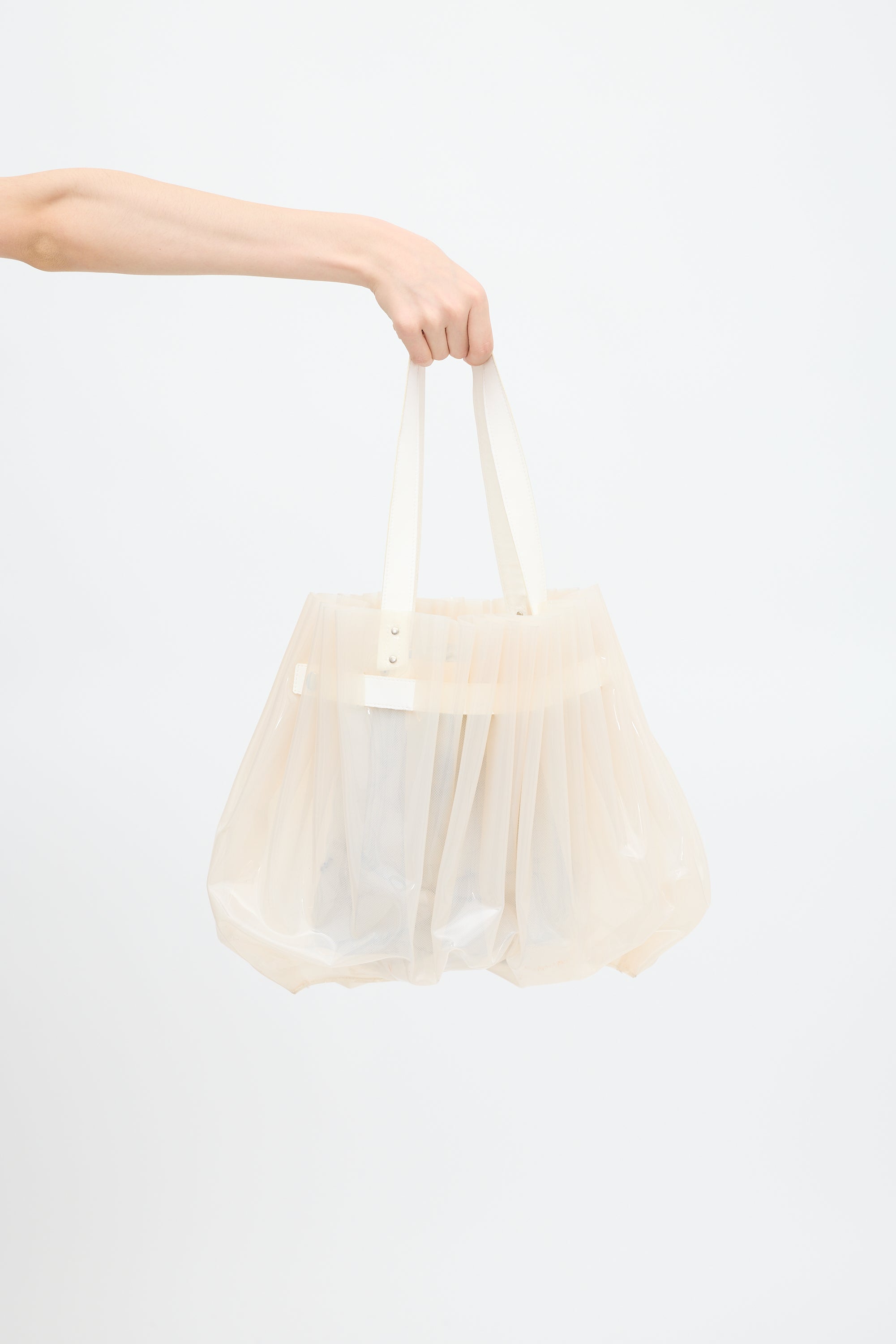 Pre-owned Noir Key Ninomiya white pvc tote featuring two leather top handles, gathered detailing with snap belt, and one main compartment with removable mesh insert.