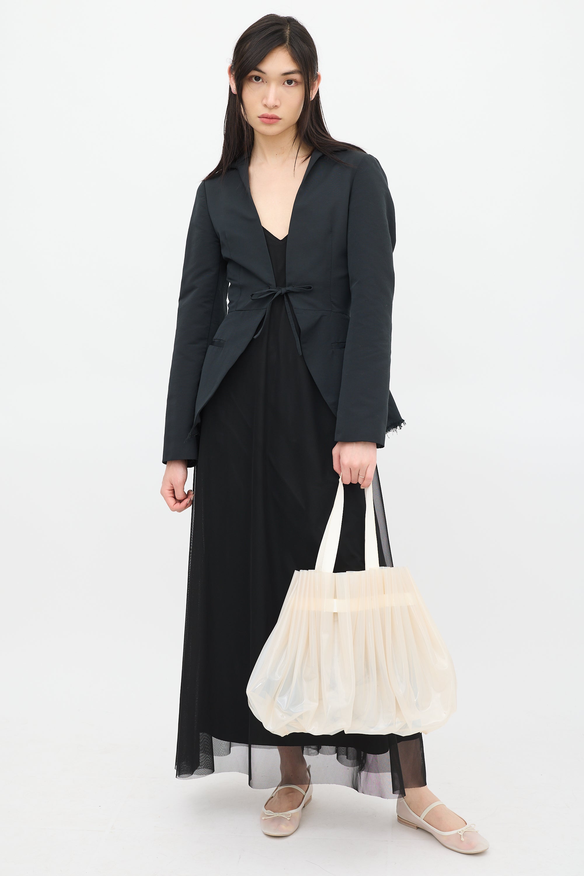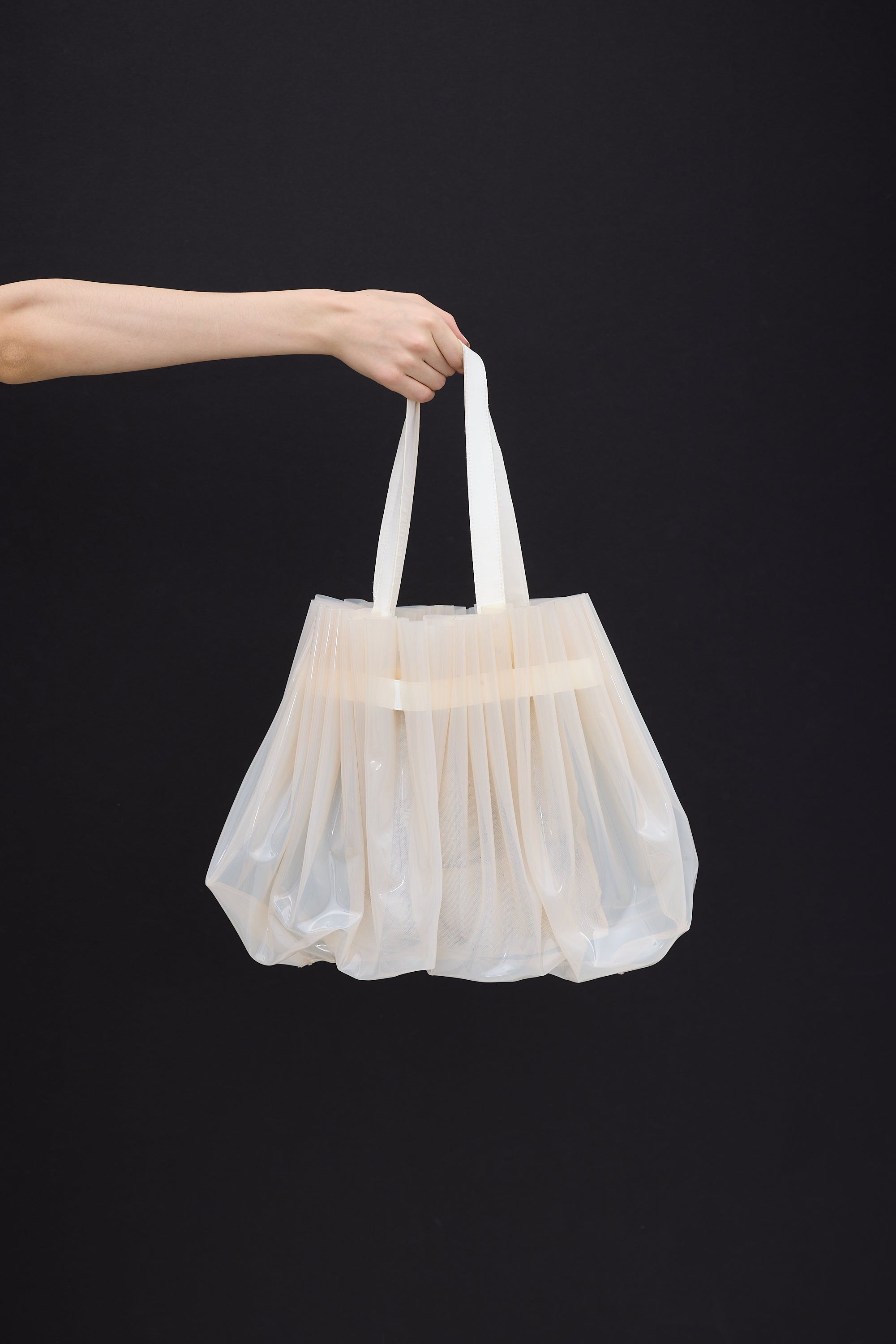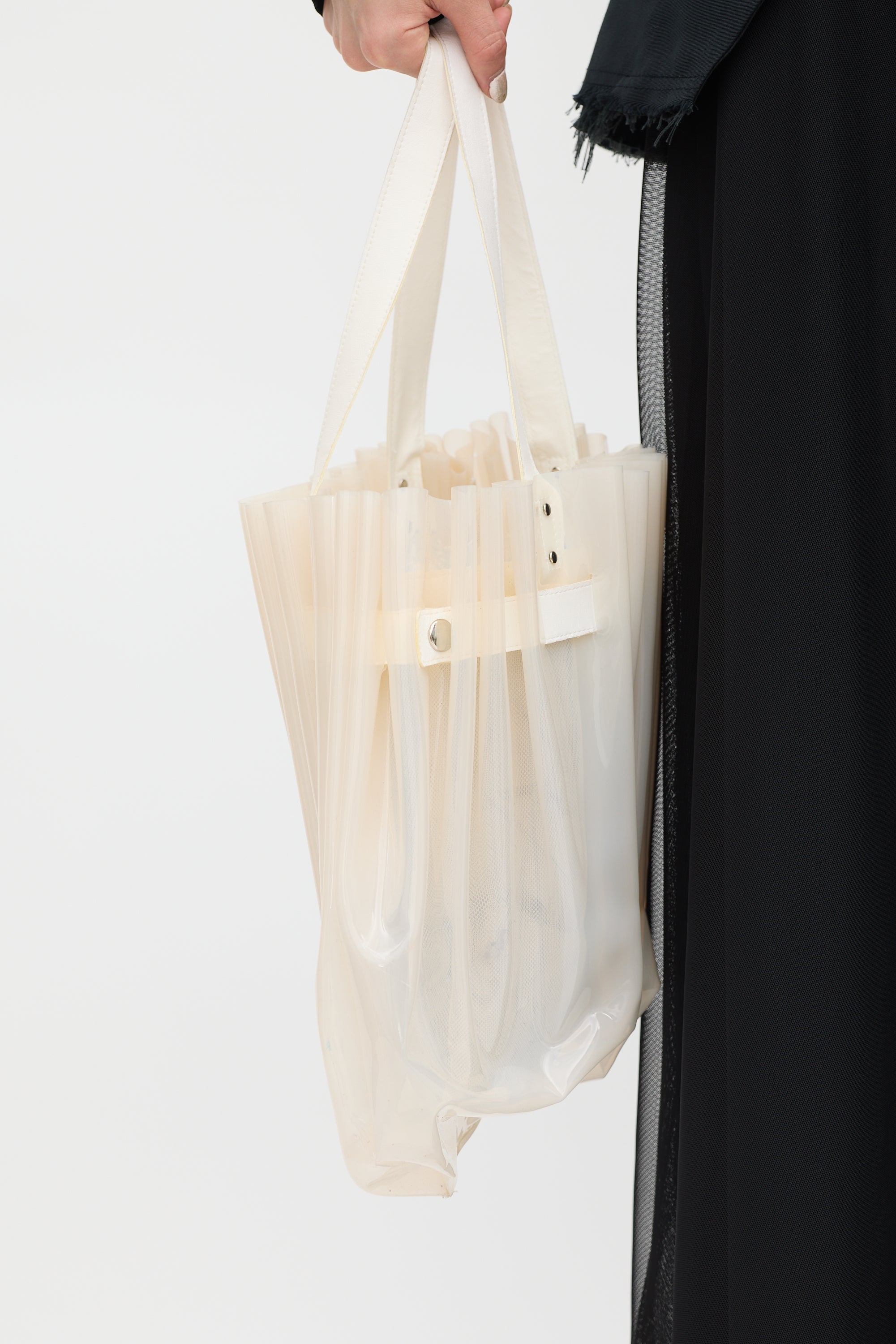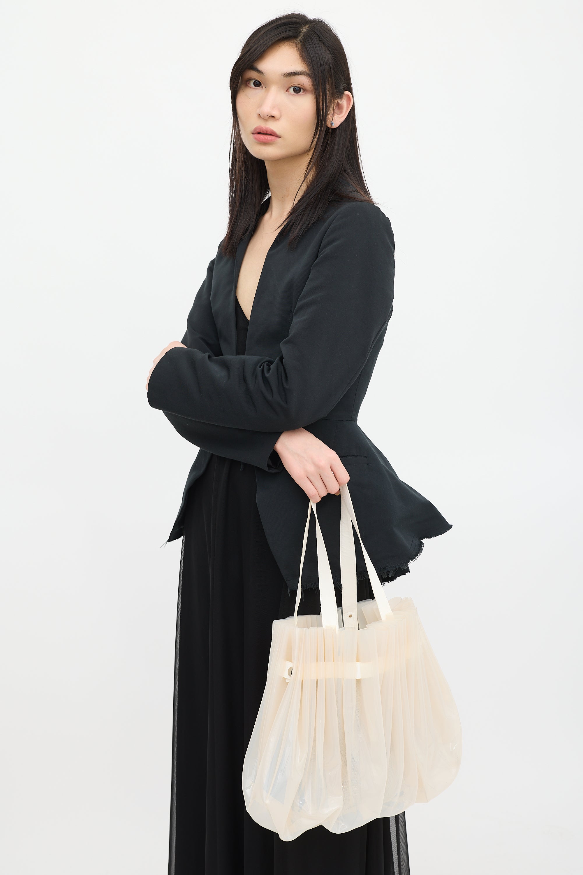 Pre-owned Noir Key Ninomiya white pvc tote featuring two leather top handles, gathered detailing with snap belt, and one main compartment with removable mesh insert.