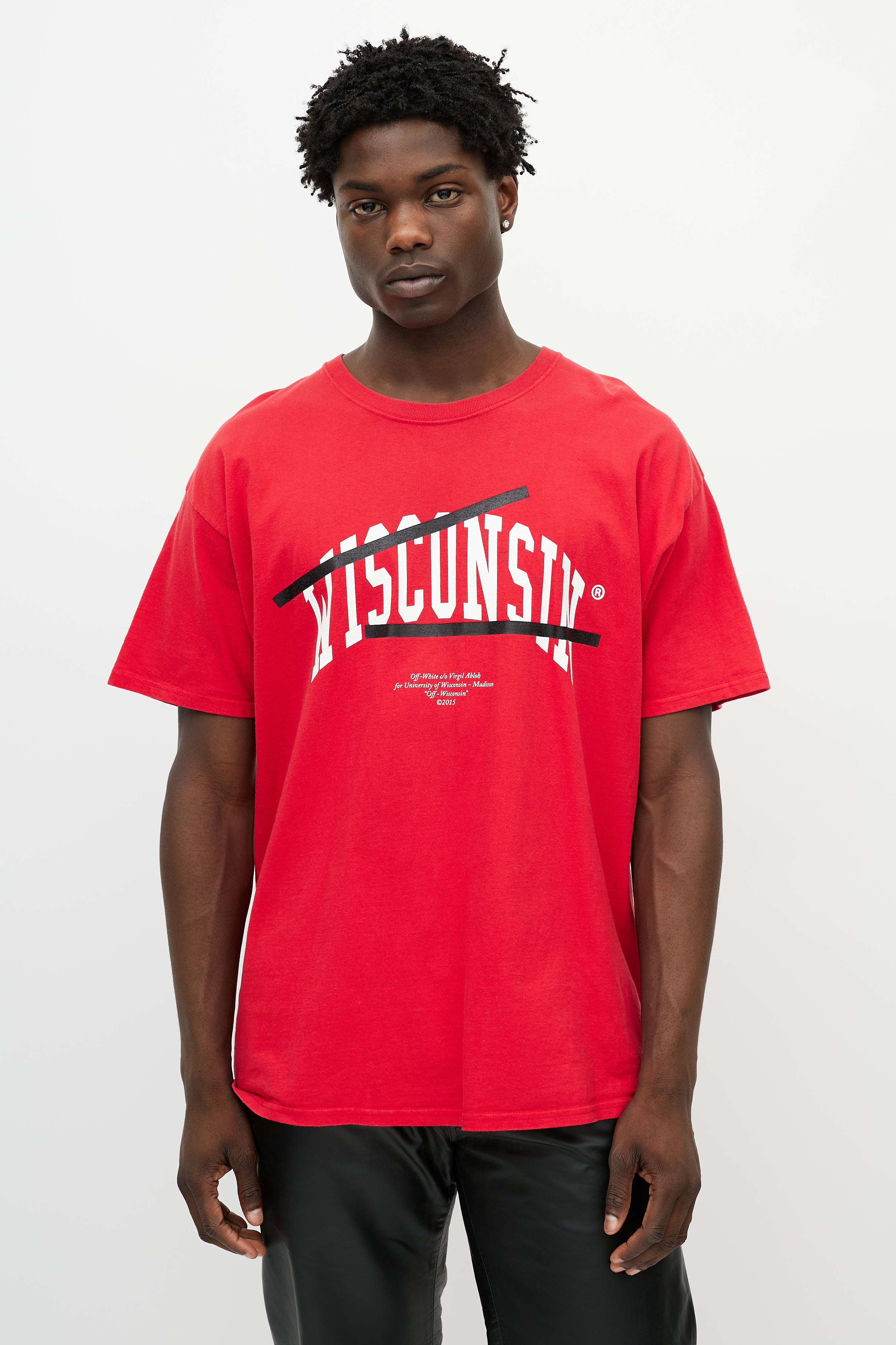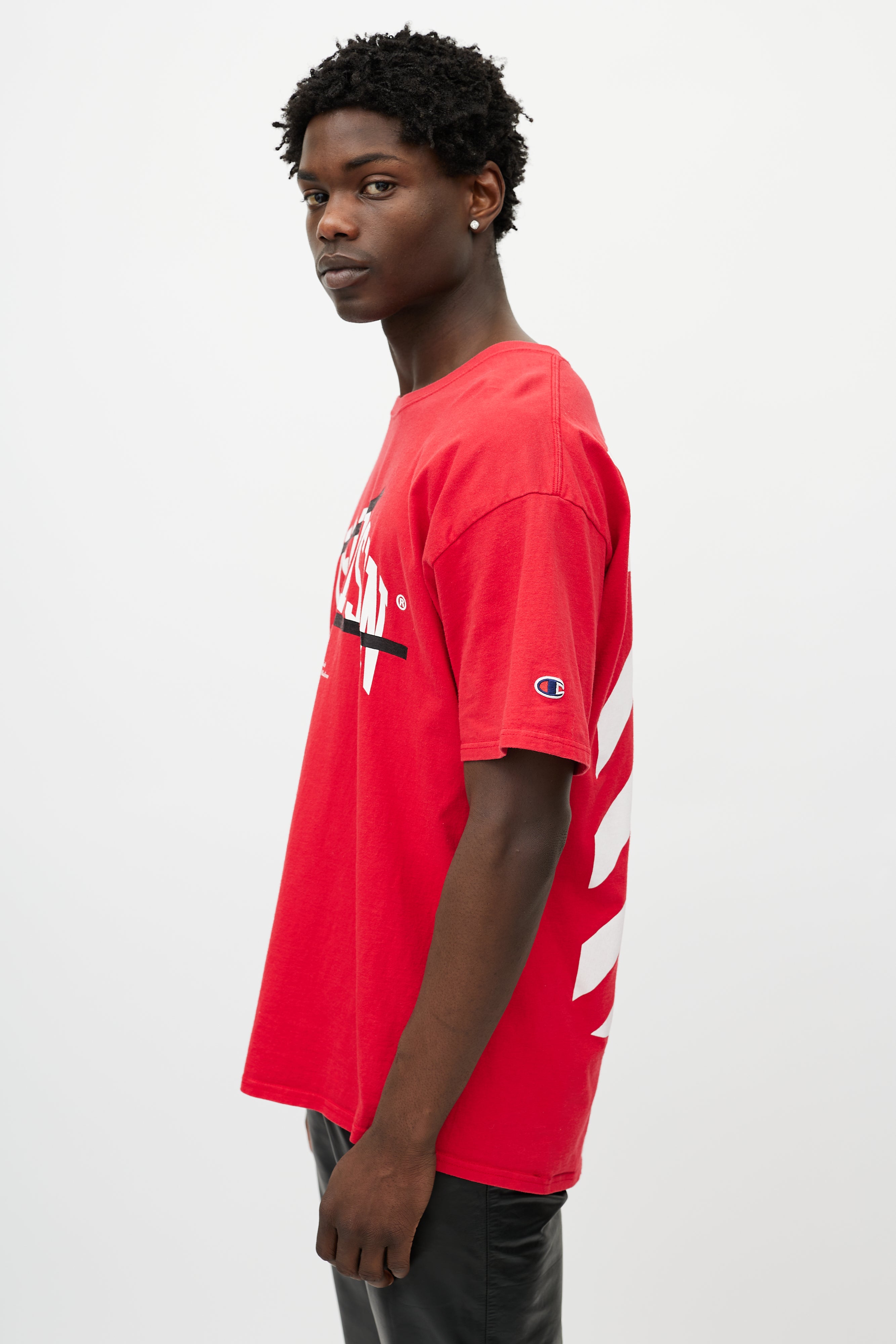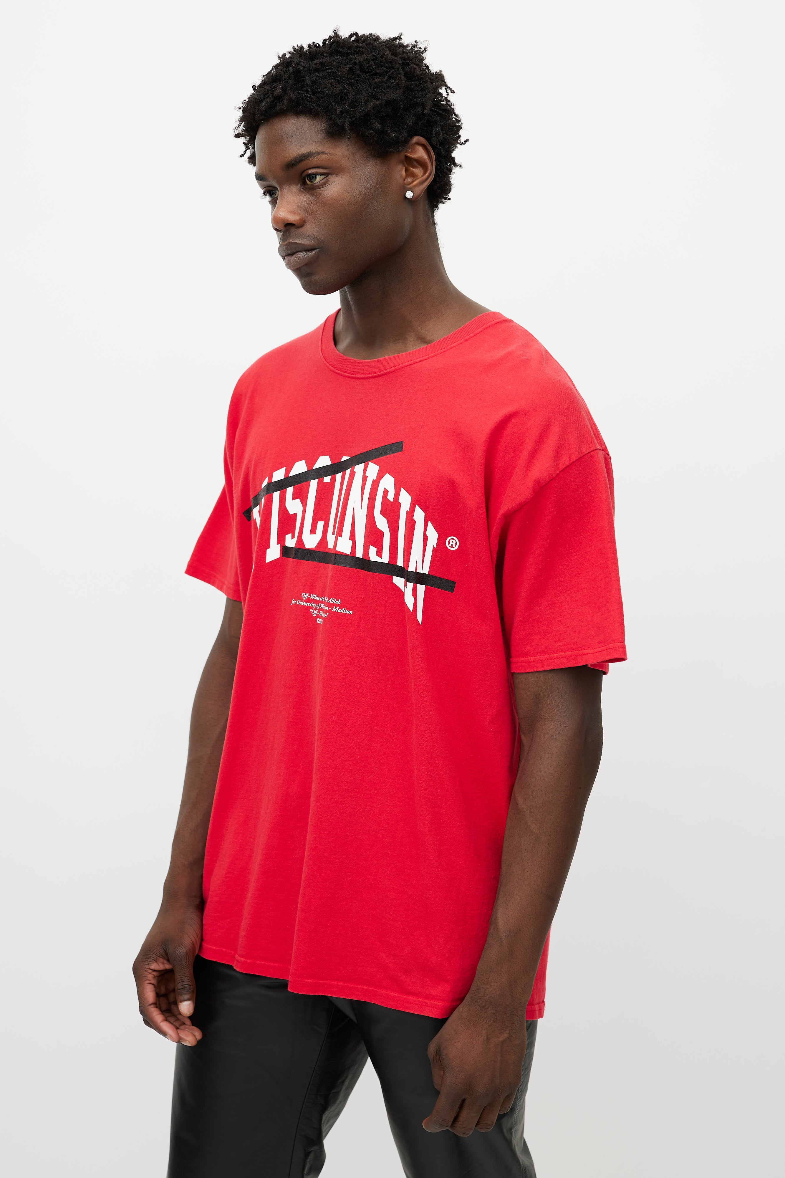 Pre-owned Off-White x Champion red T-shirt featuring a white Wisconsin logo print at chest, stripe logo at back, round neckline, and short sleeves.