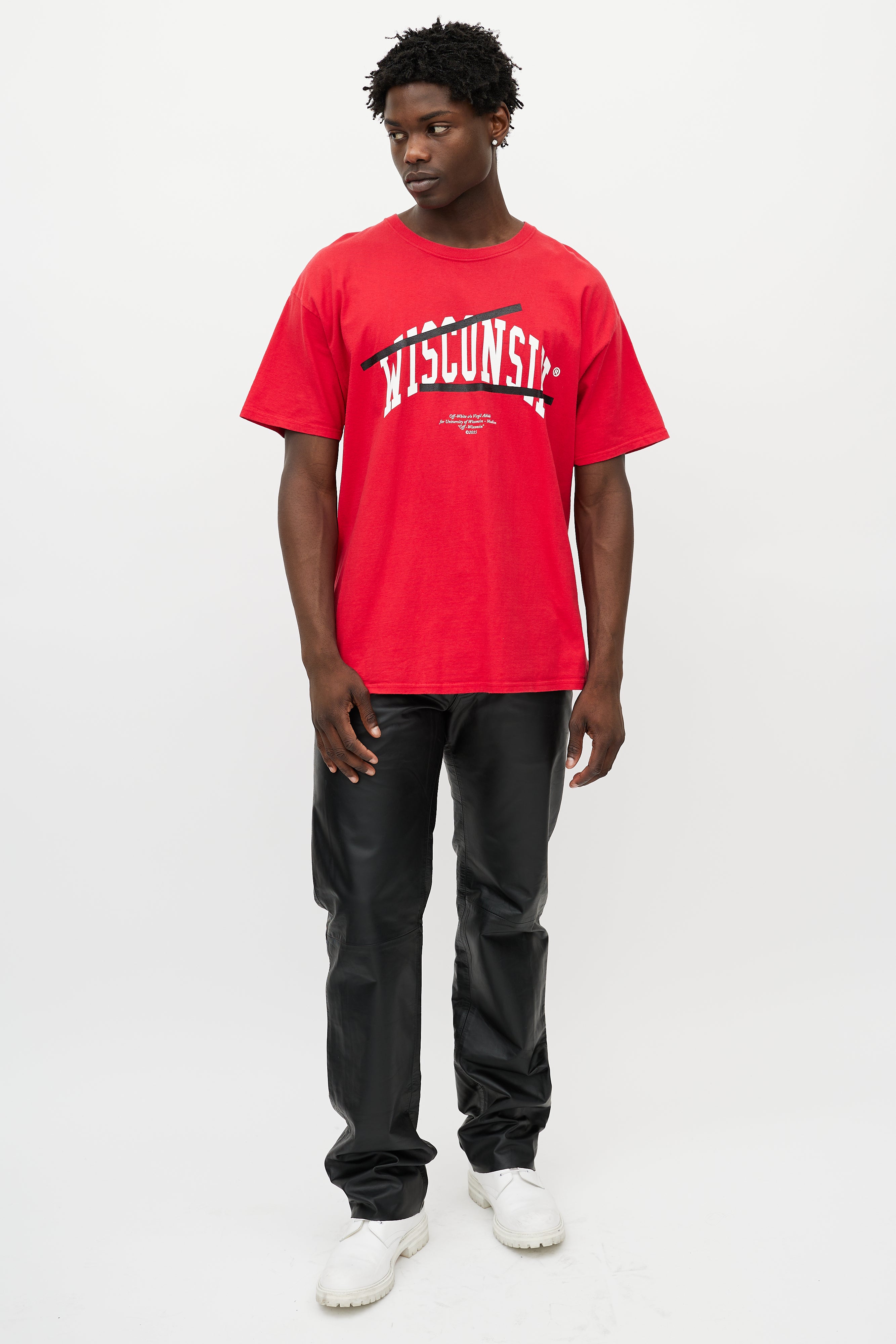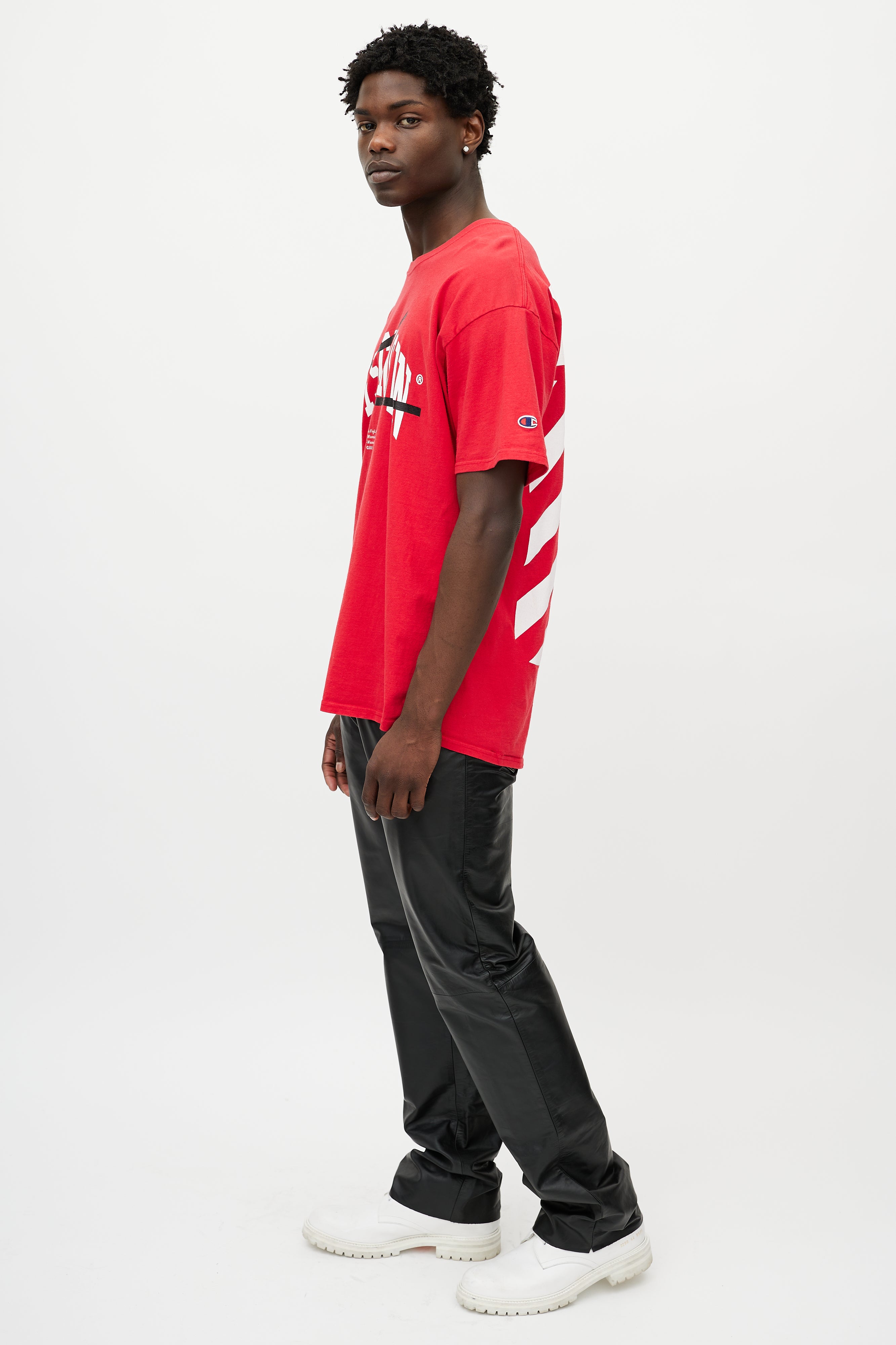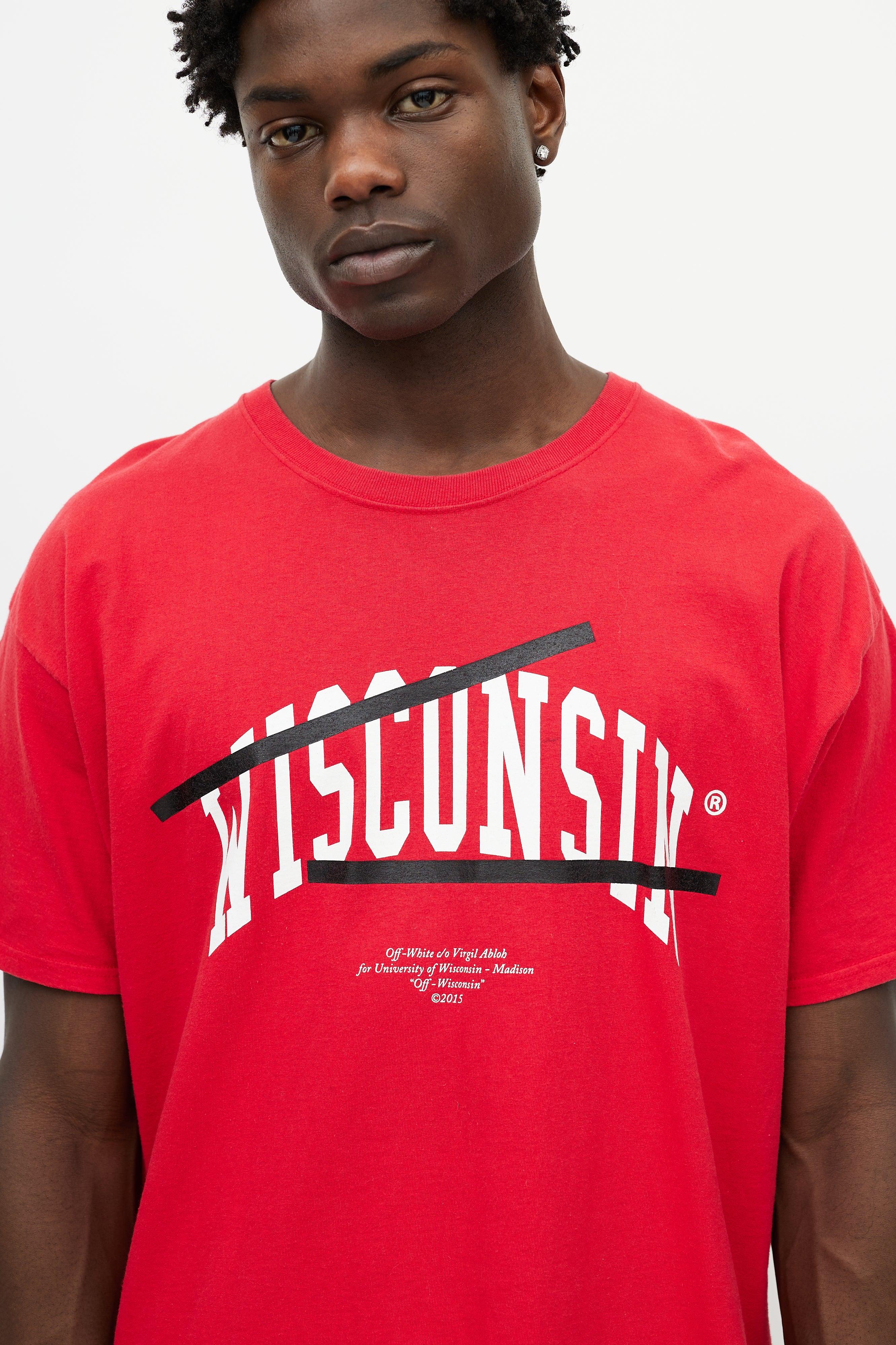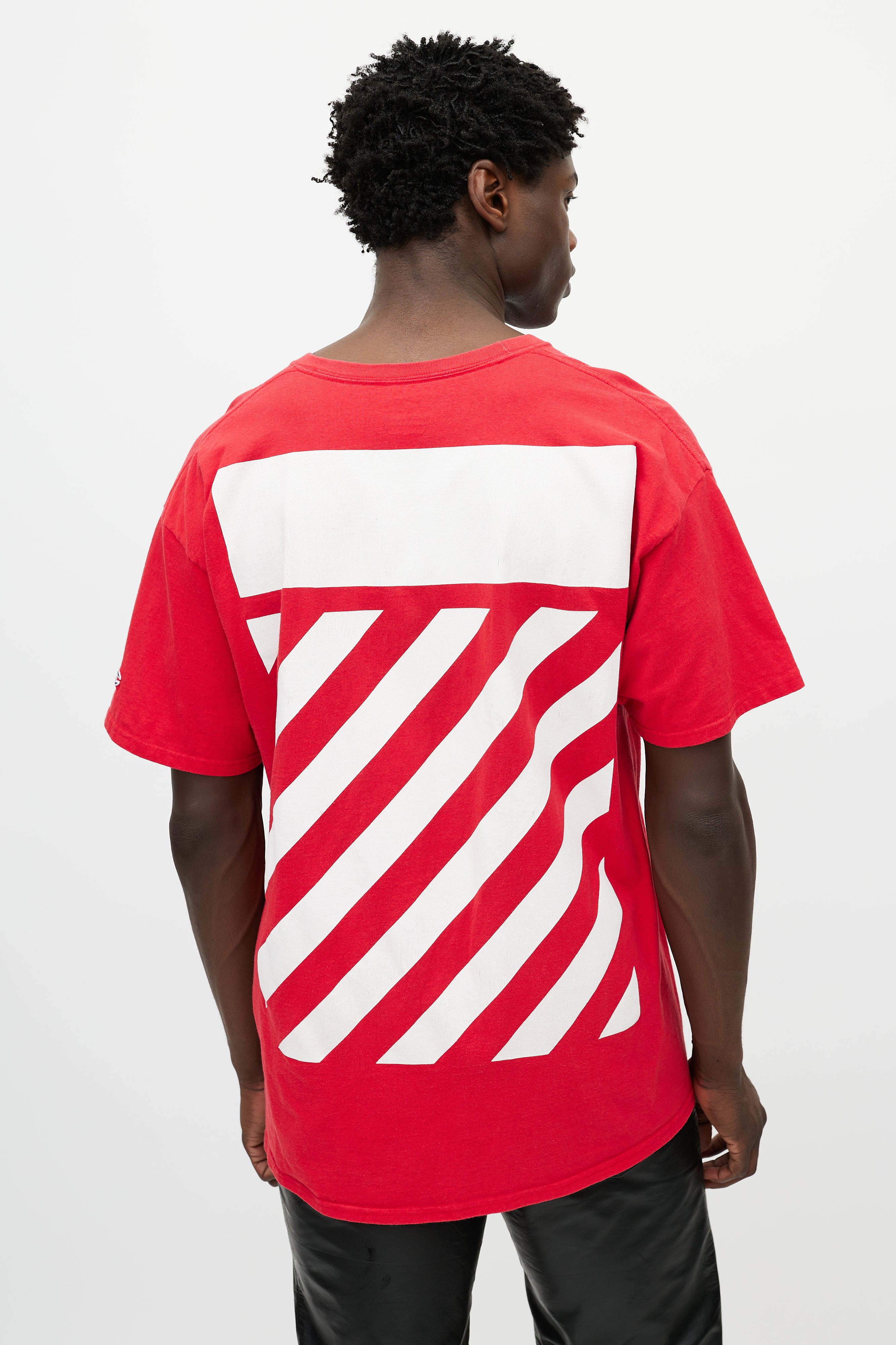 Pre-owned Off-White x Champion red T-shirt featuring a white Wisconsin logo print at chest, stripe logo at back, round neckline, and short sleeves.