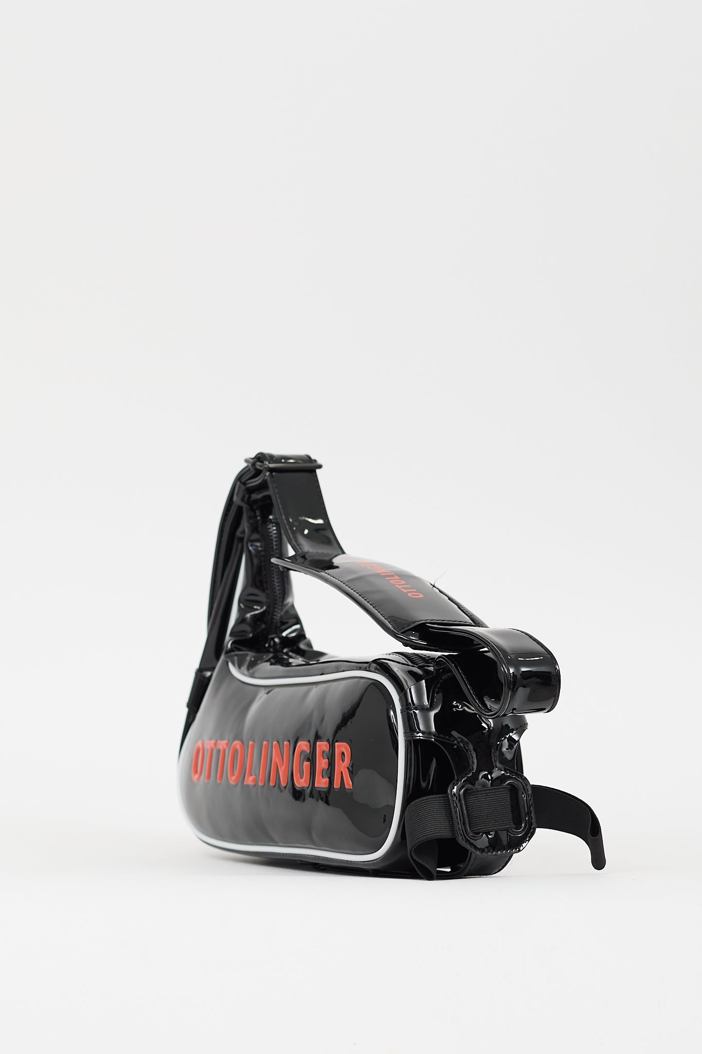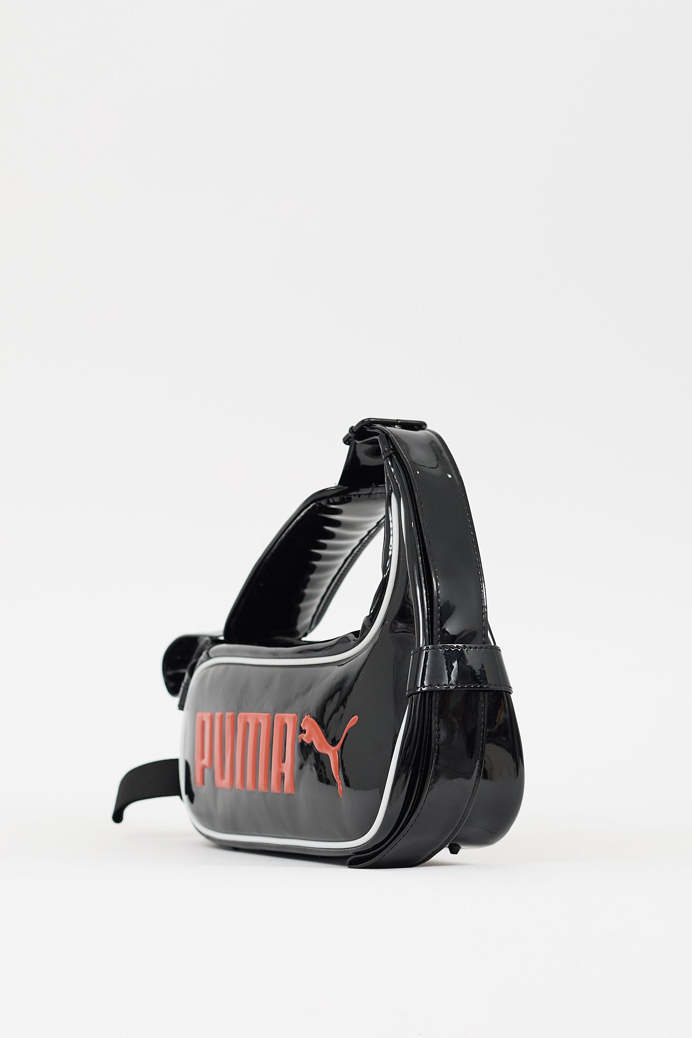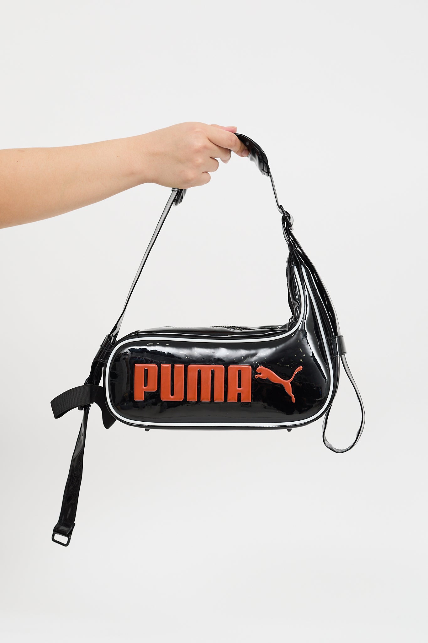 Pre-owned Ottolinger x Puma black faux patent leather mini Racer bag featuring adjustable shoulder strap with logo stamped padding, orange debossed logo at front and back, white piping trim, bumper studs at bottom, zip closure at top, one main compartment, and one zip pocket inside.