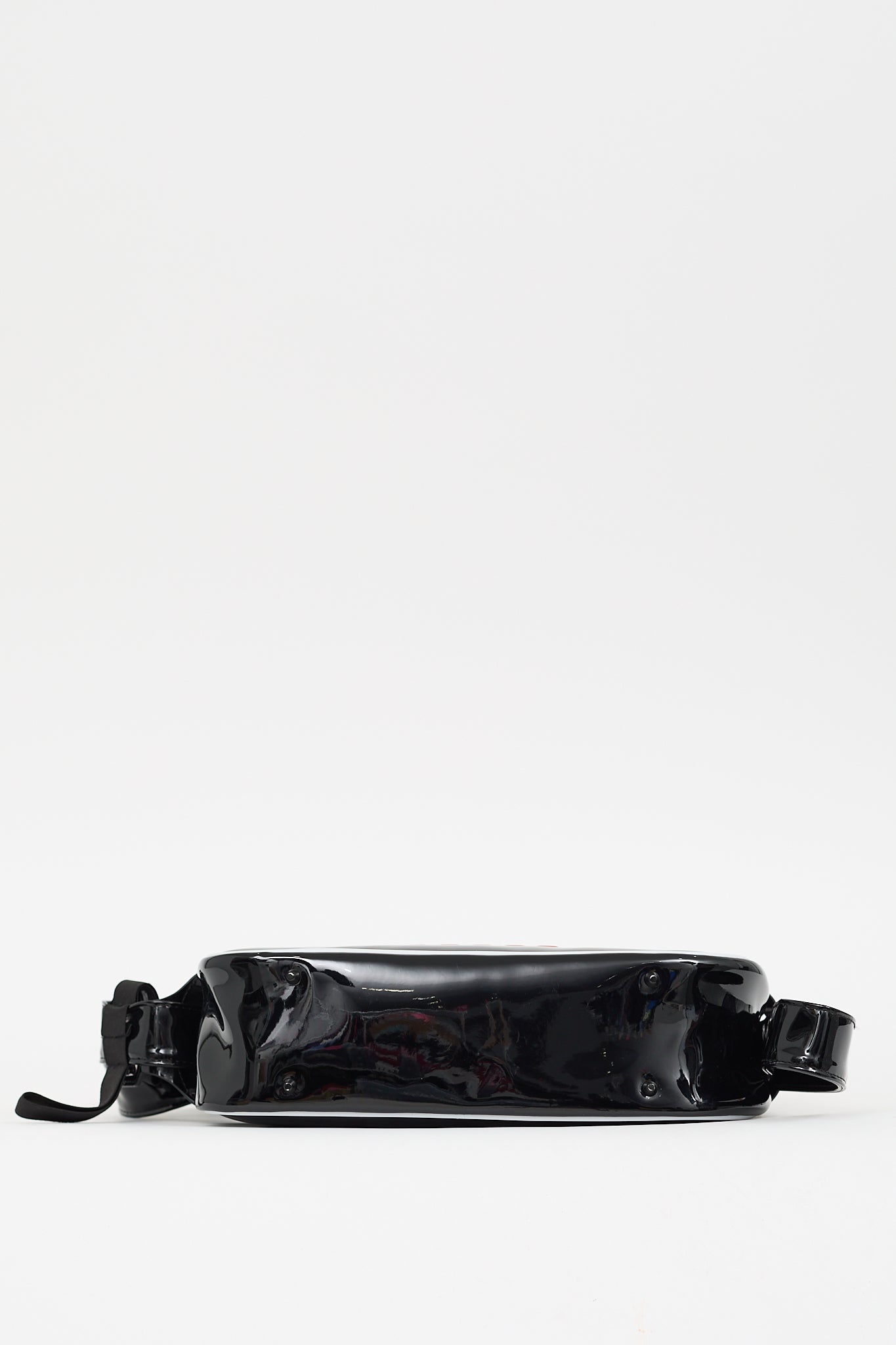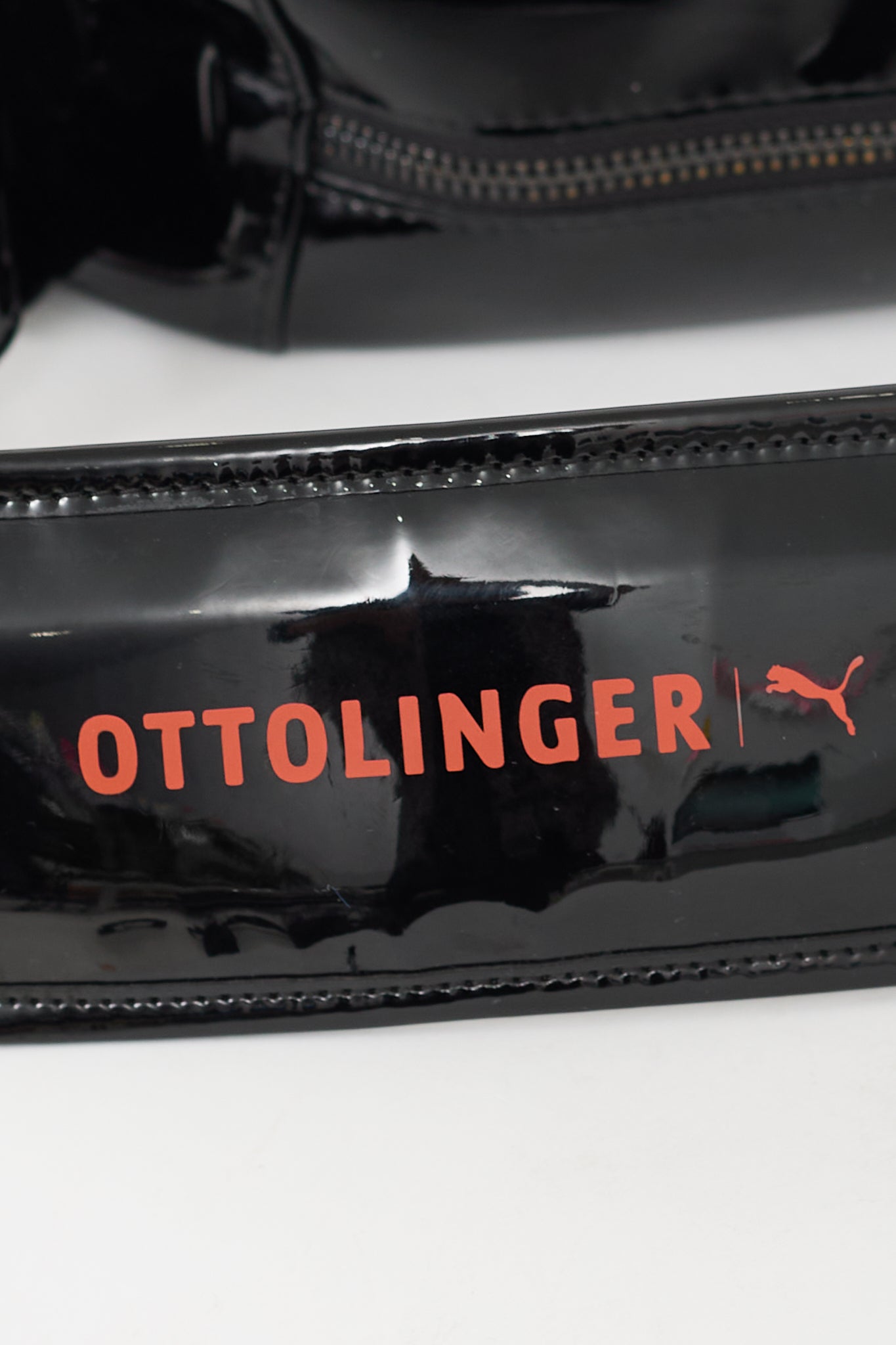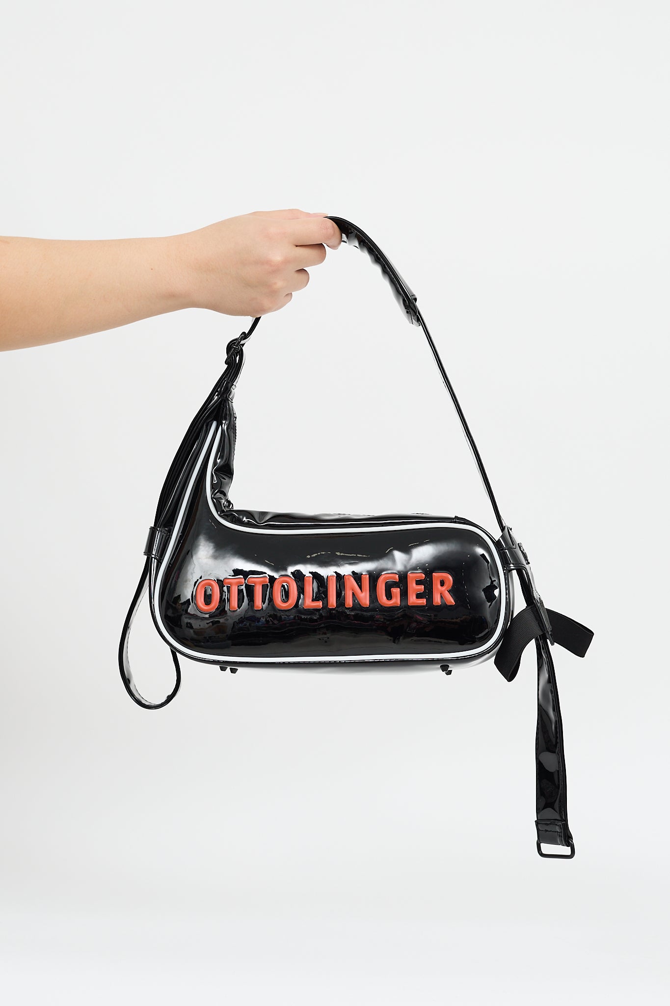 Pre-owned Ottolinger x Puma black faux patent leather mini Racer bag featuring adjustable shoulder strap with logo stamped padding, orange debossed logo at front and back, white piping trim, bumper studs at bottom, zip closure at top, one main compartment, and one zip pocket inside.