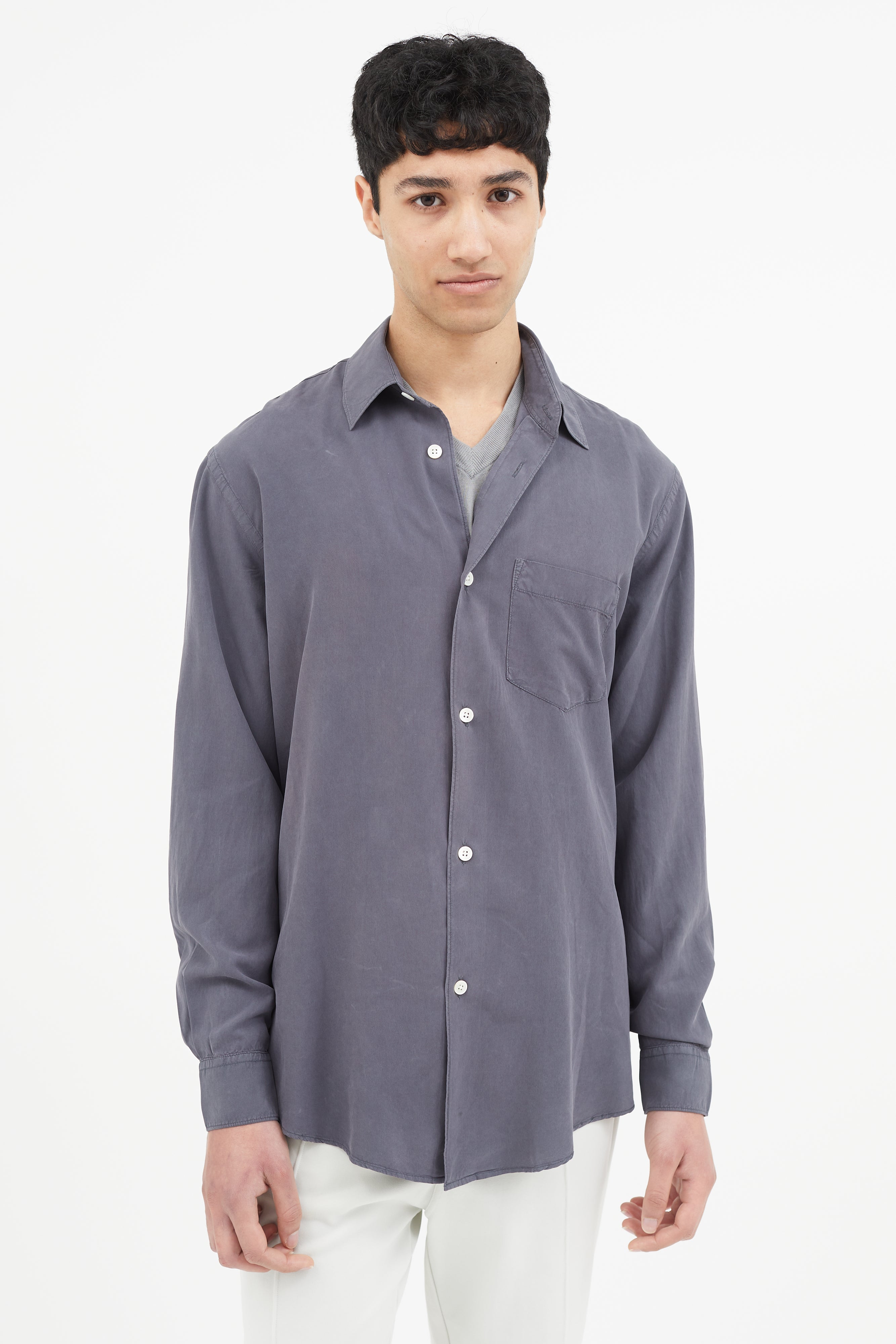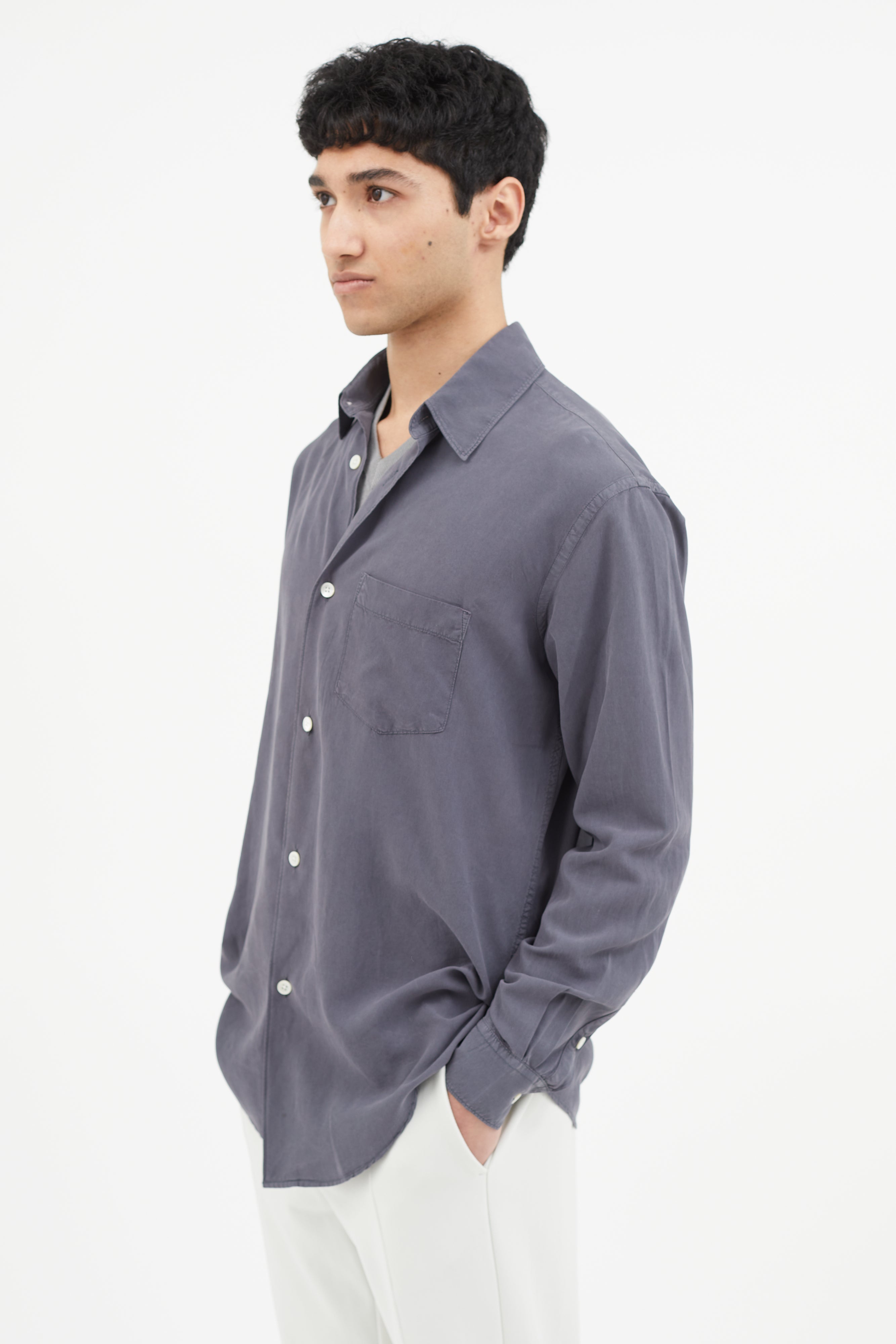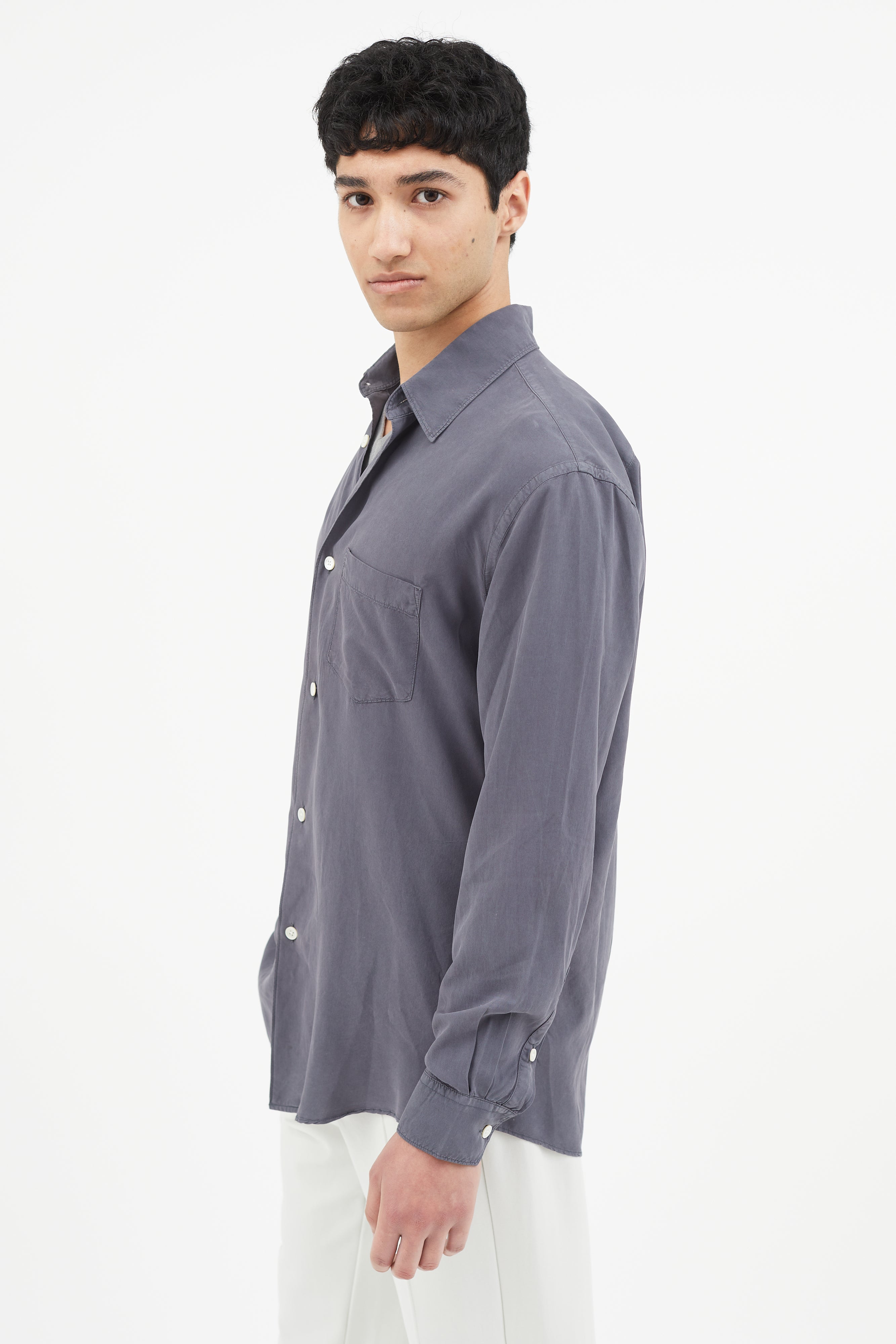 Pre-owned Our Legacy blue silk shirt featuring a pointed collar, long sleeves with buttoned cuffs, one patch pocket at chest, and a button up front.