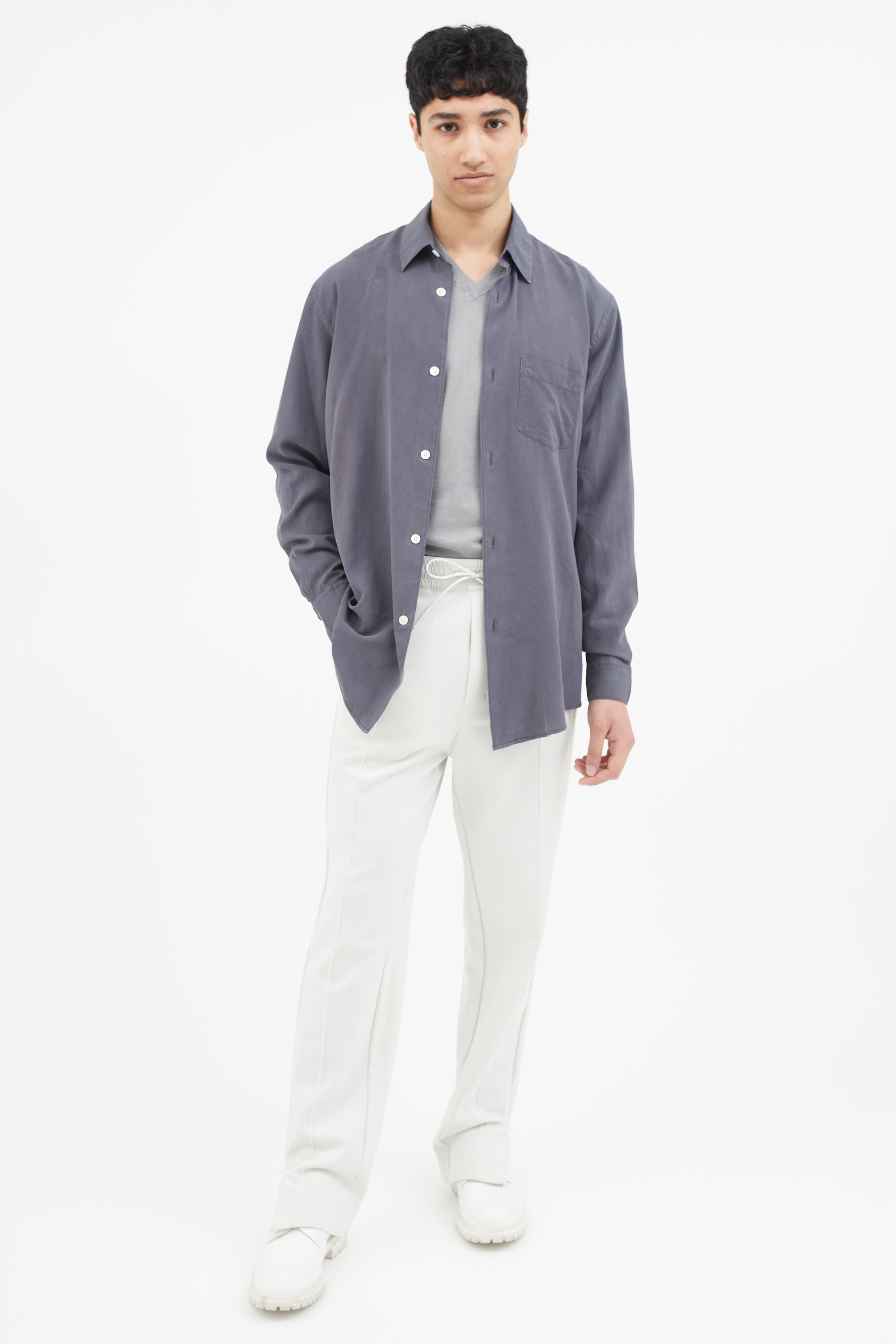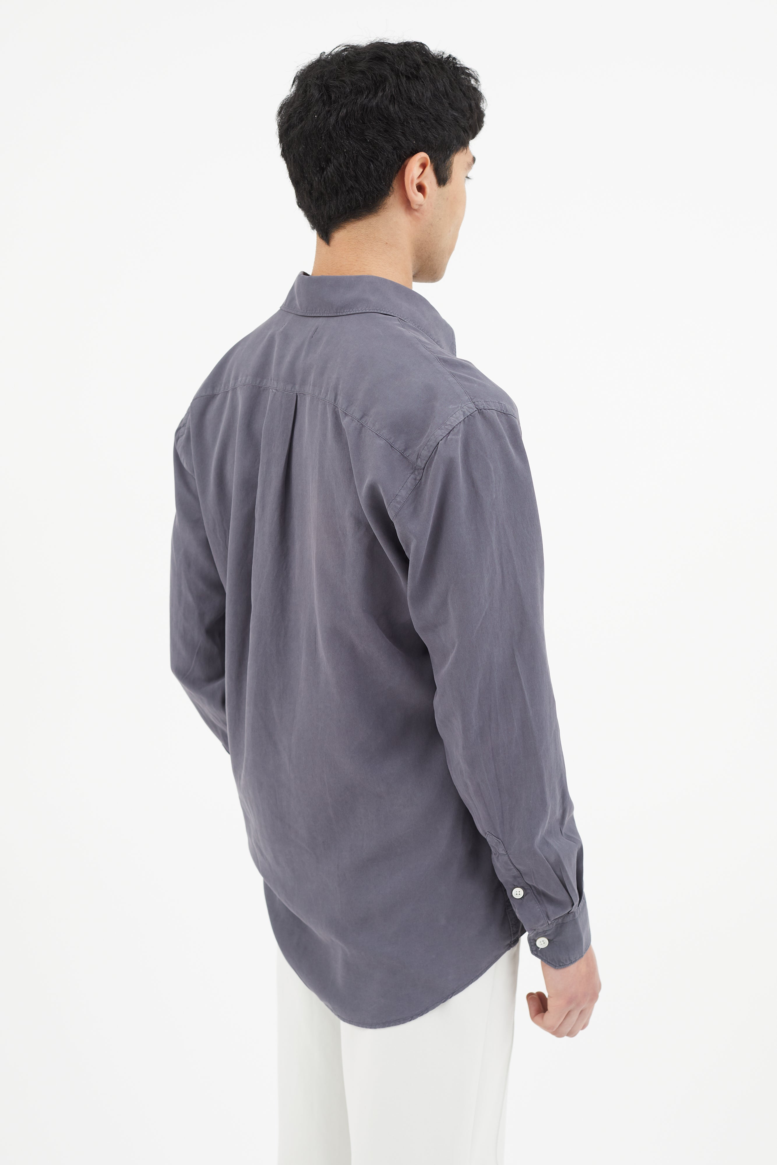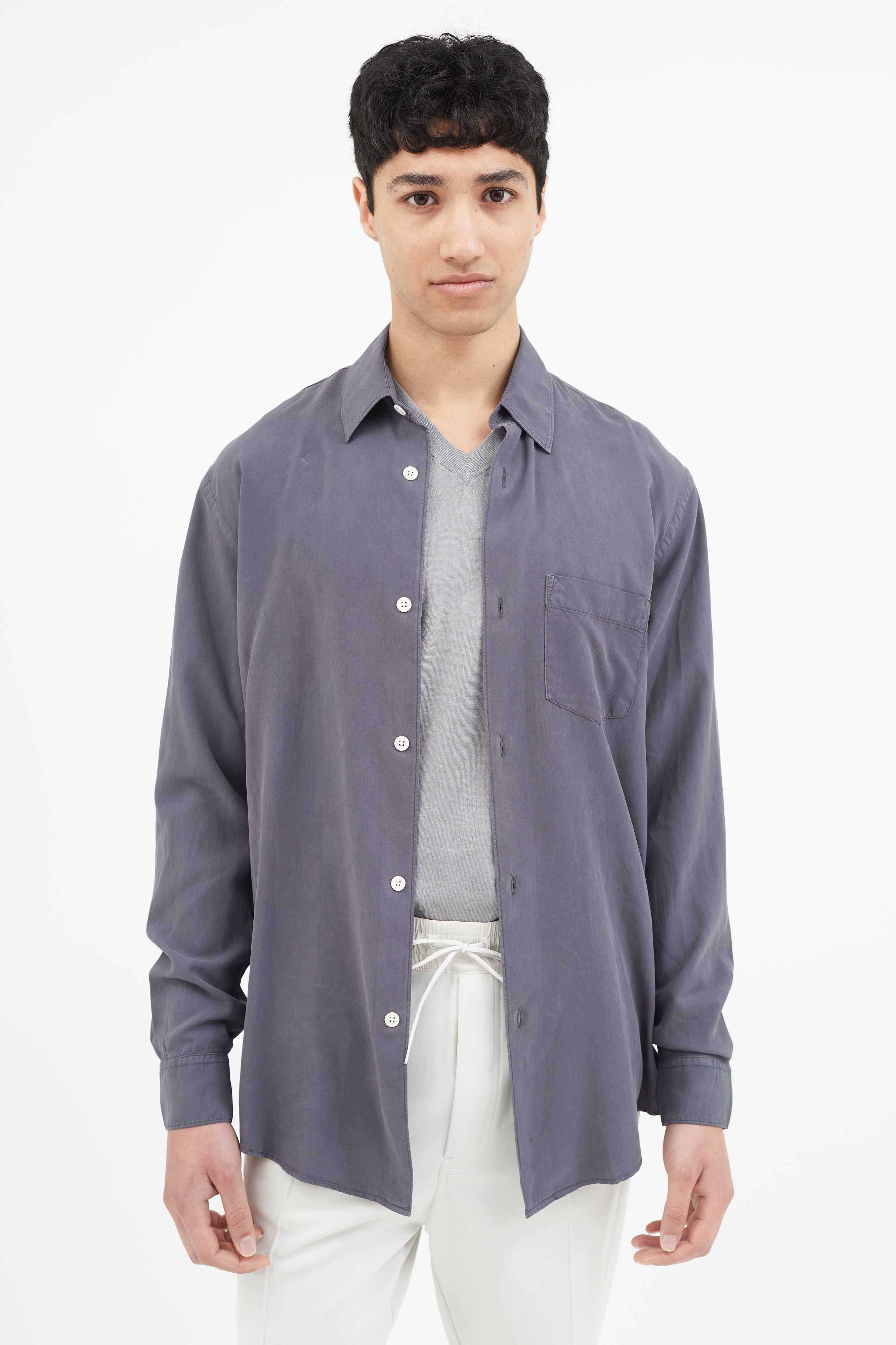 Pre-owned Our Legacy blue silk shirt featuring a pointed collar, long sleeves with buttoned cuffs, one patch pocket at chest, and a button up front.