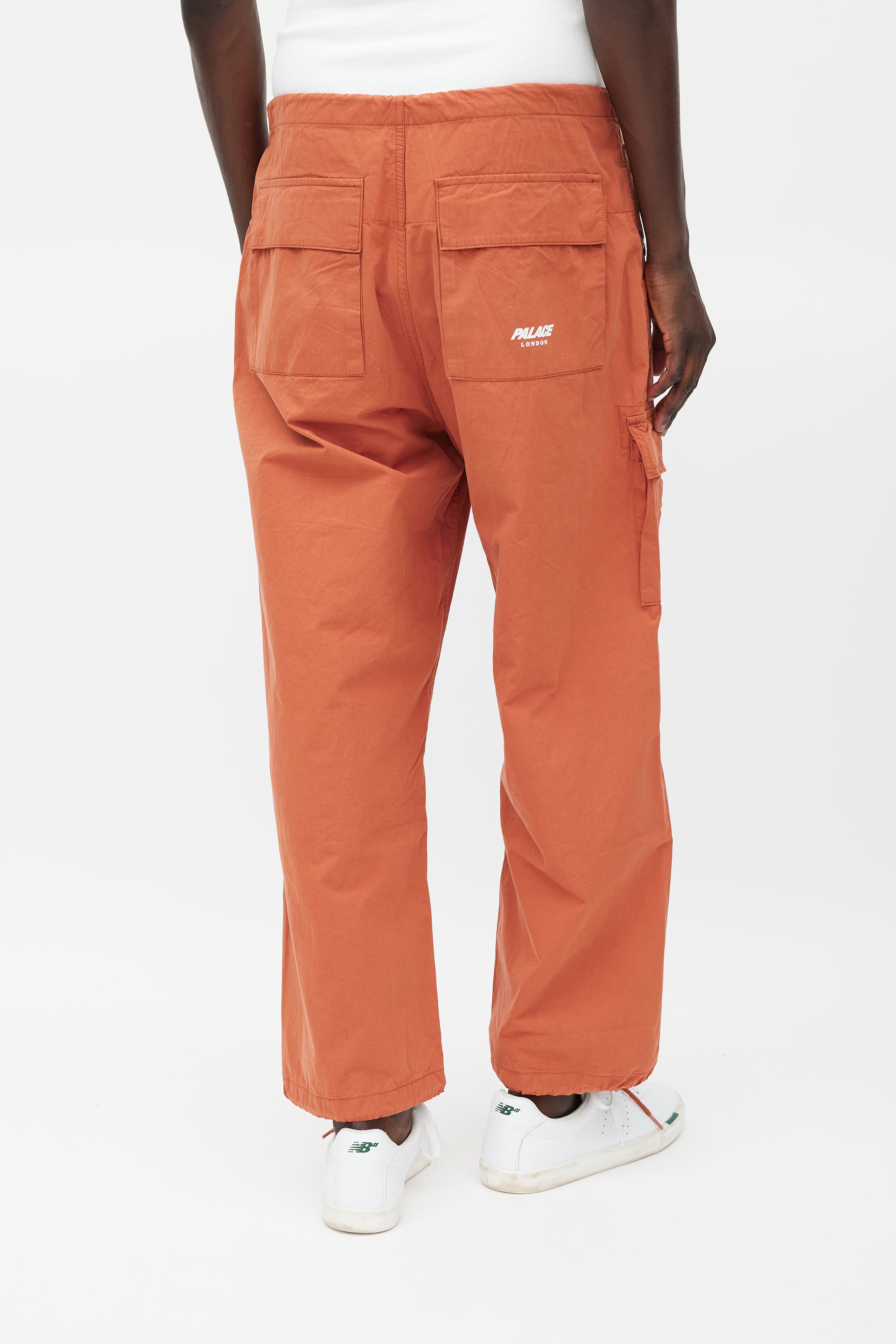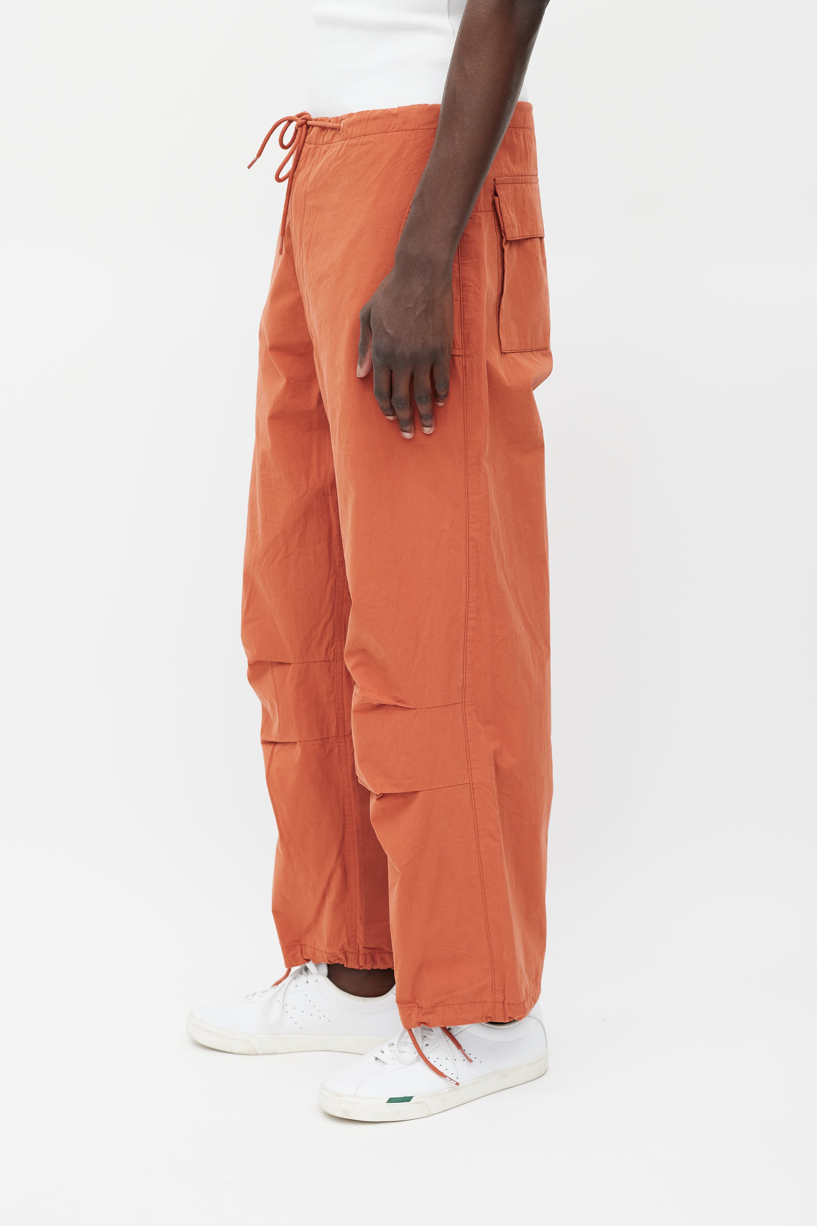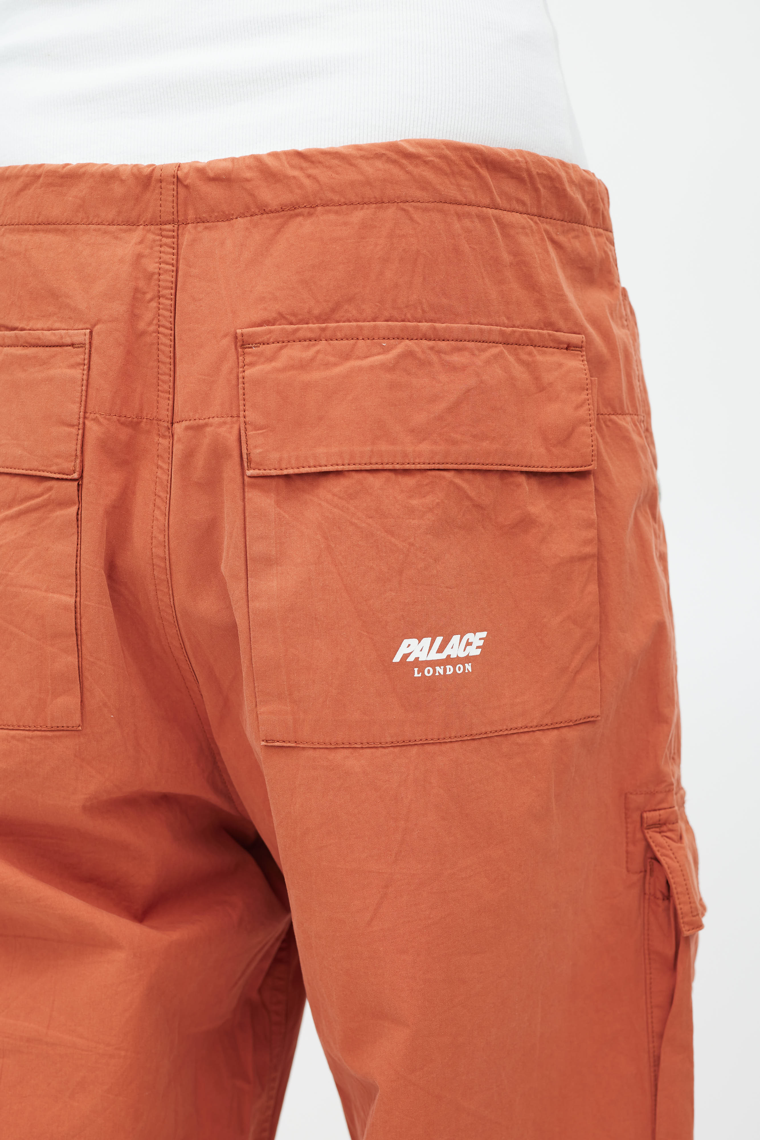 Pre-owned Palace orange parachute pants featuring a front zip closure with drawstring waist, wide leg with darting at knees, drawstring cuffs, two in seam pockets with buttoned flaps, one cargo pocket at right side, and two cargo pockets at back with white logo printed at right pocket.