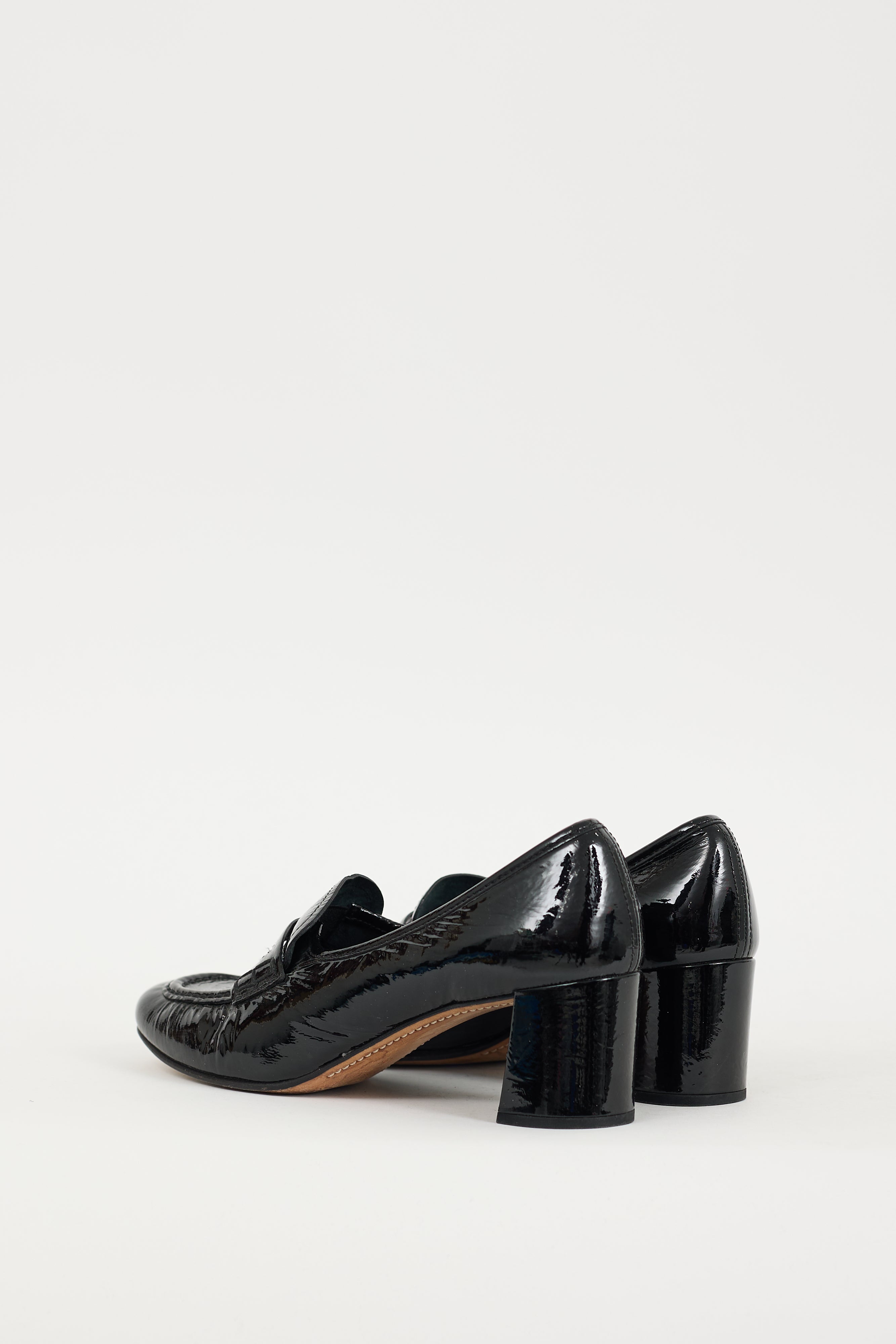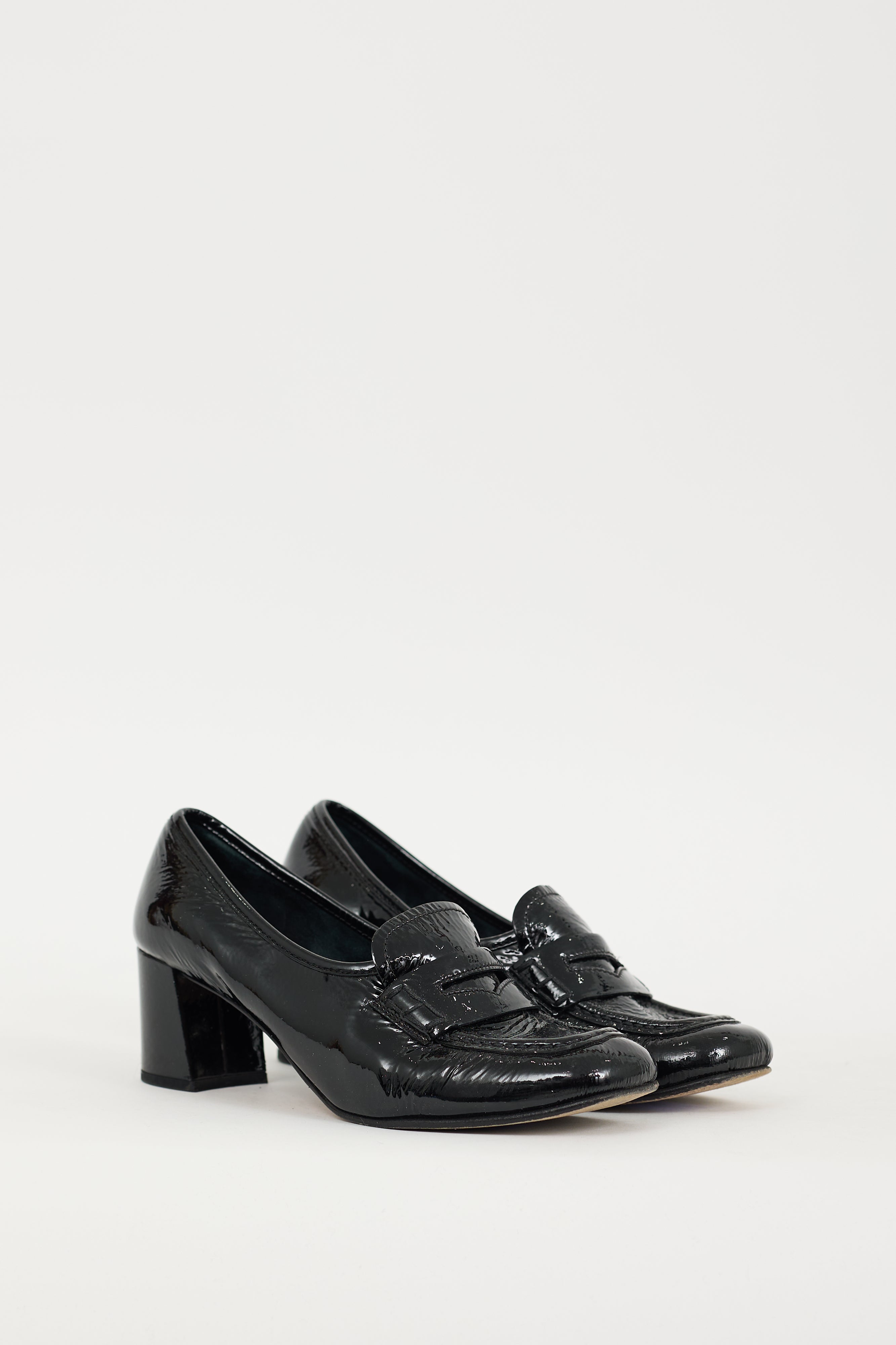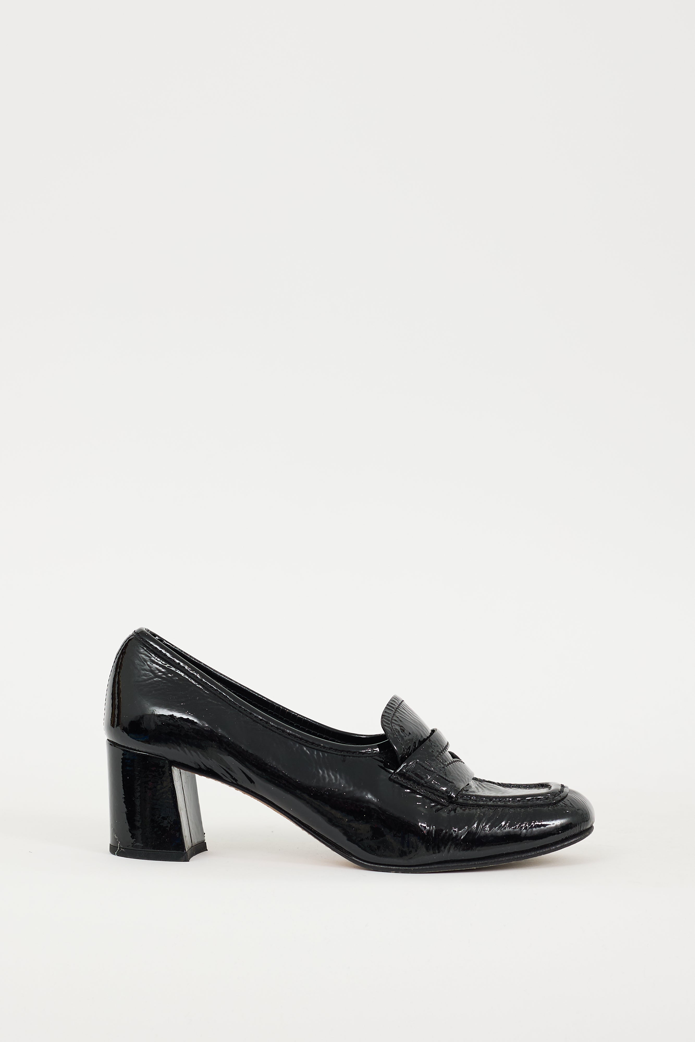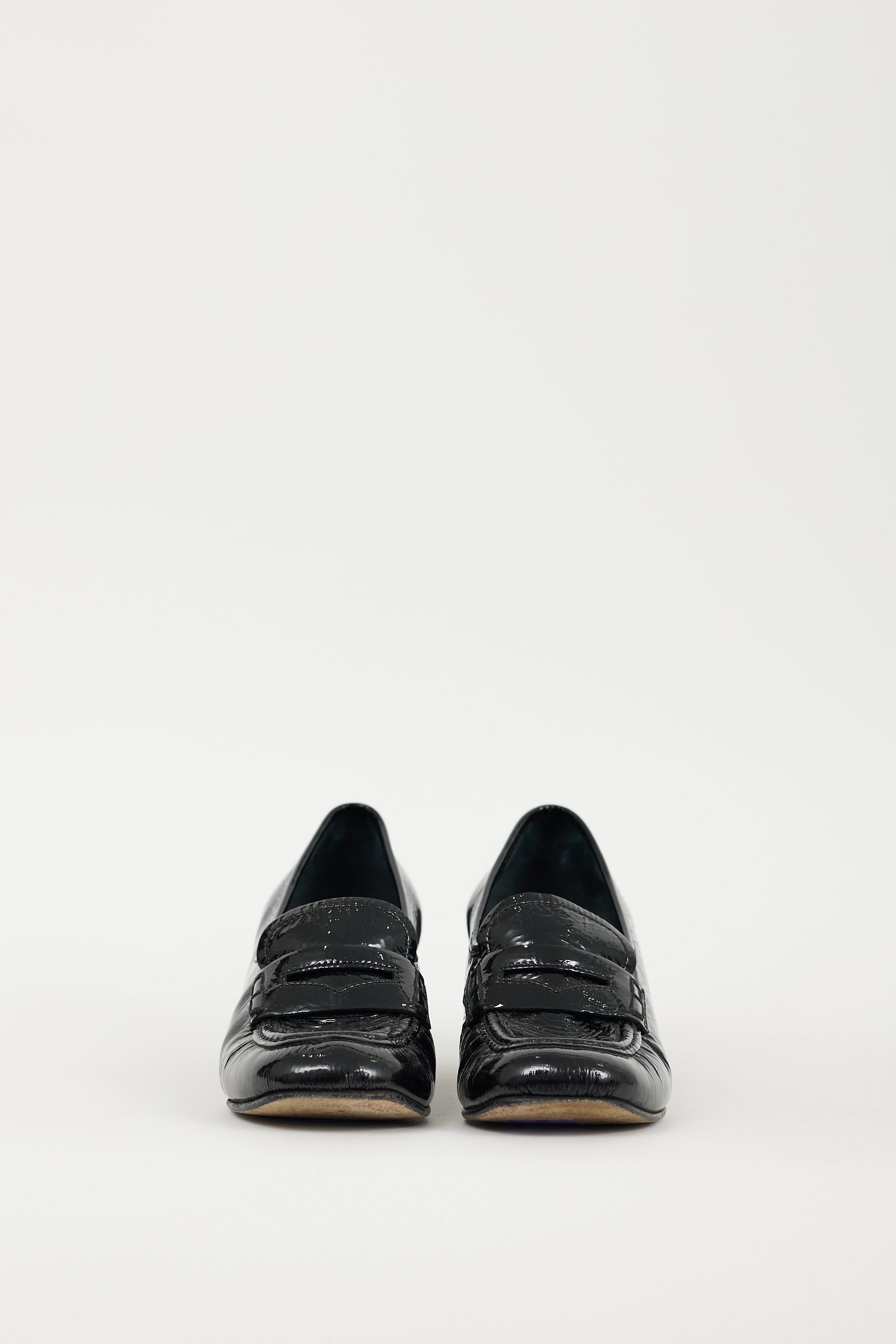 Pre-owned Prada black patent leather loafer pumps featuring a round mock toe, strap at vamp, wrapped block heel, and slip on entry. Comes with original dust bag.
