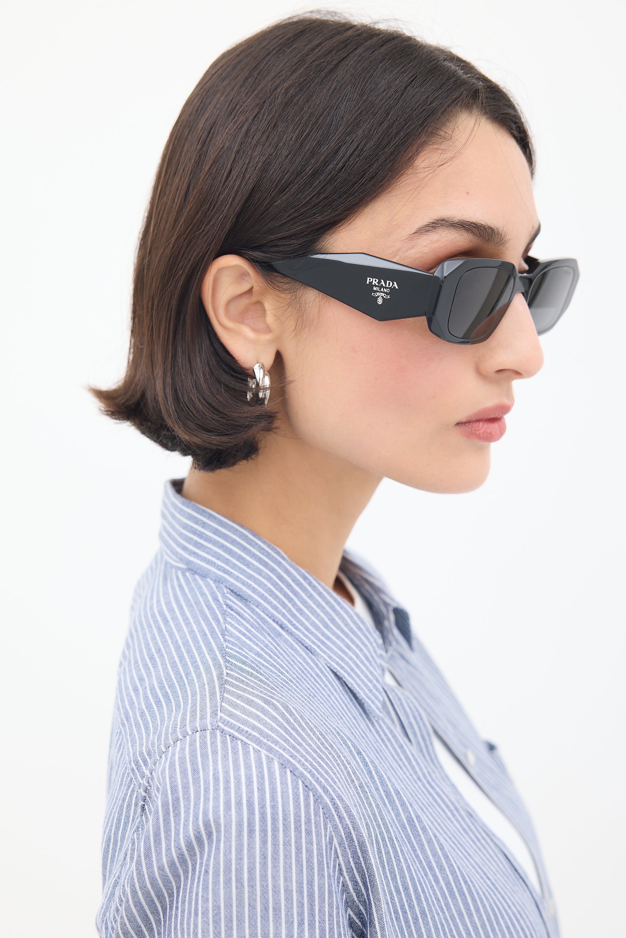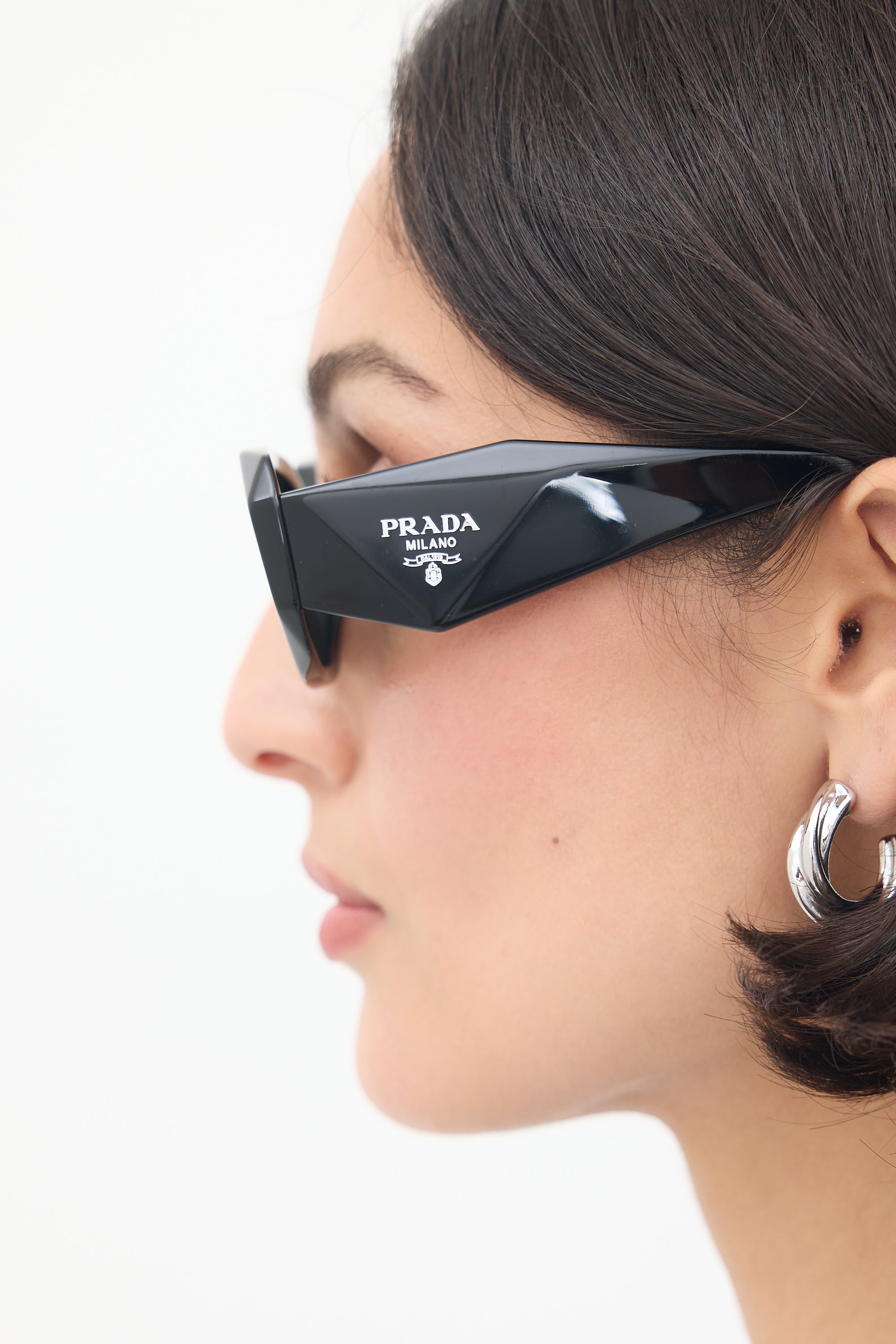 Pre-owned Prada SPR17W sunglasses featuring grey tinted lenses, black acetate rectangular frame with angular design, and inlaid silver tone logo at temples. Comes with original case.
