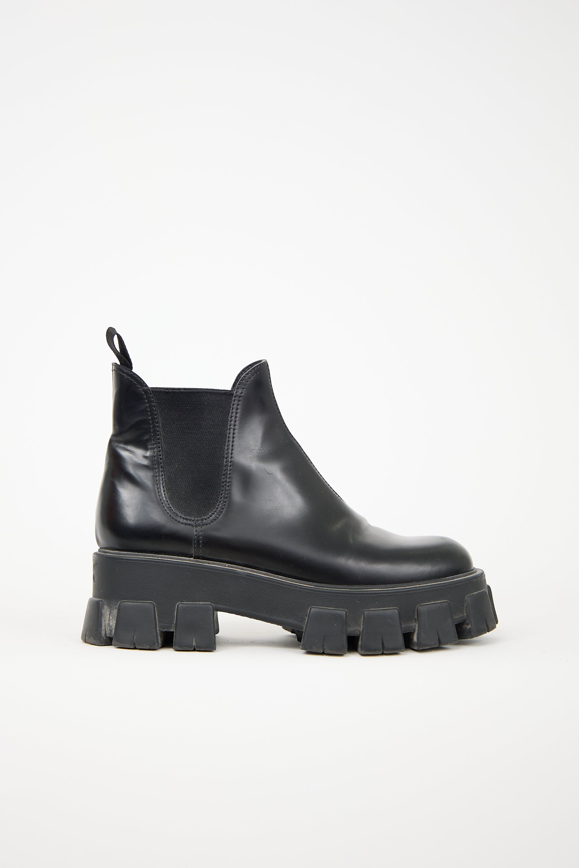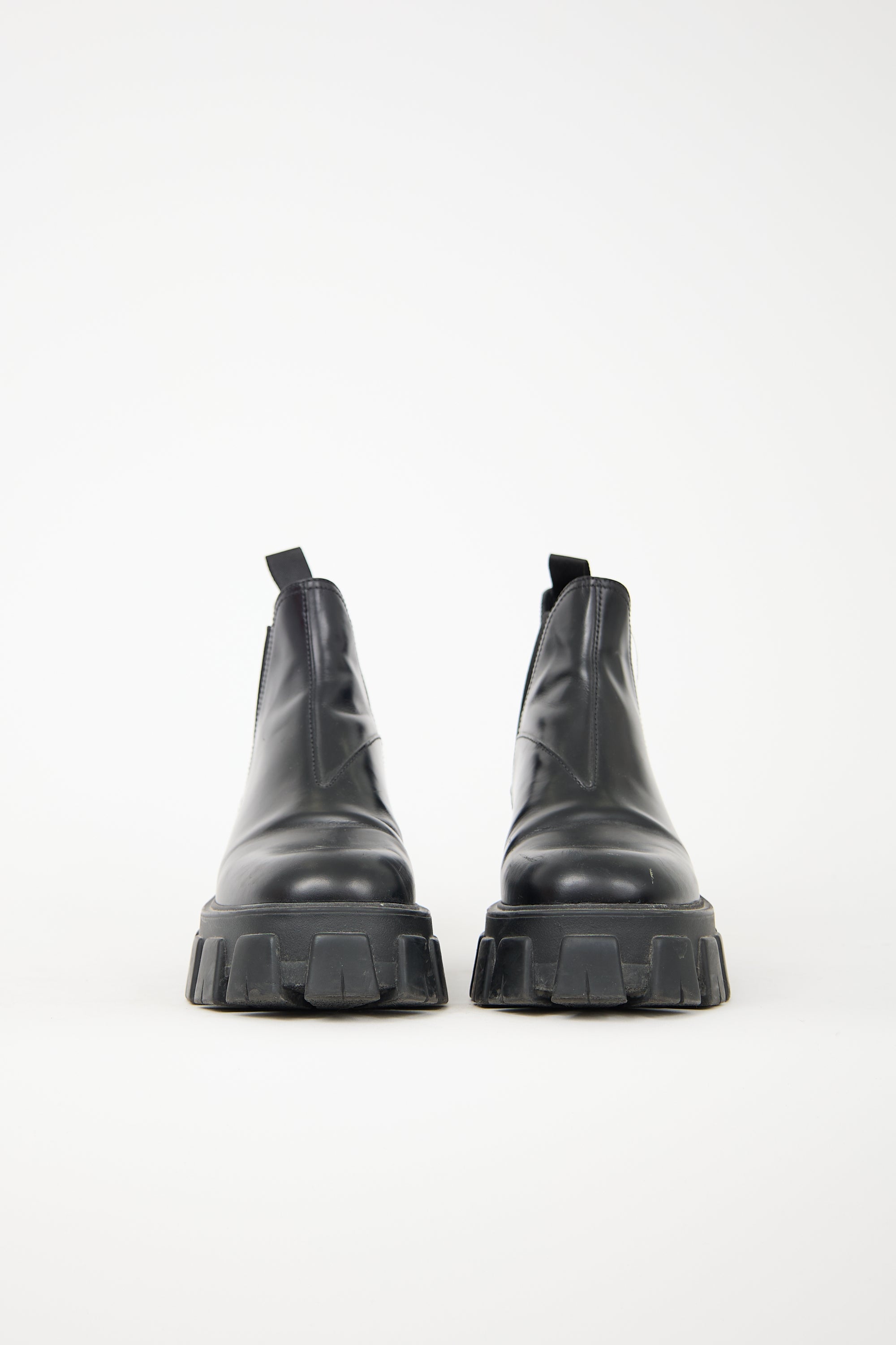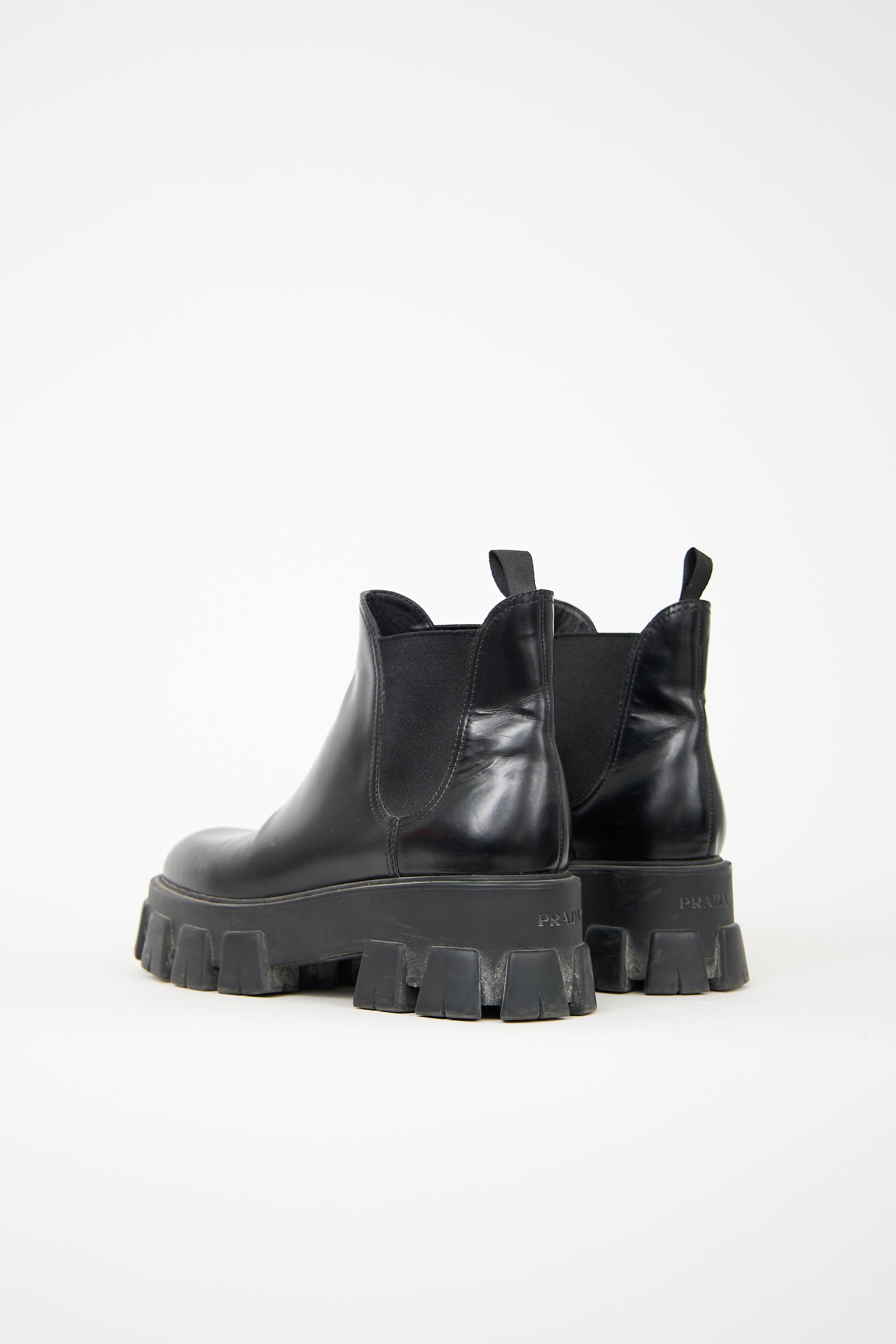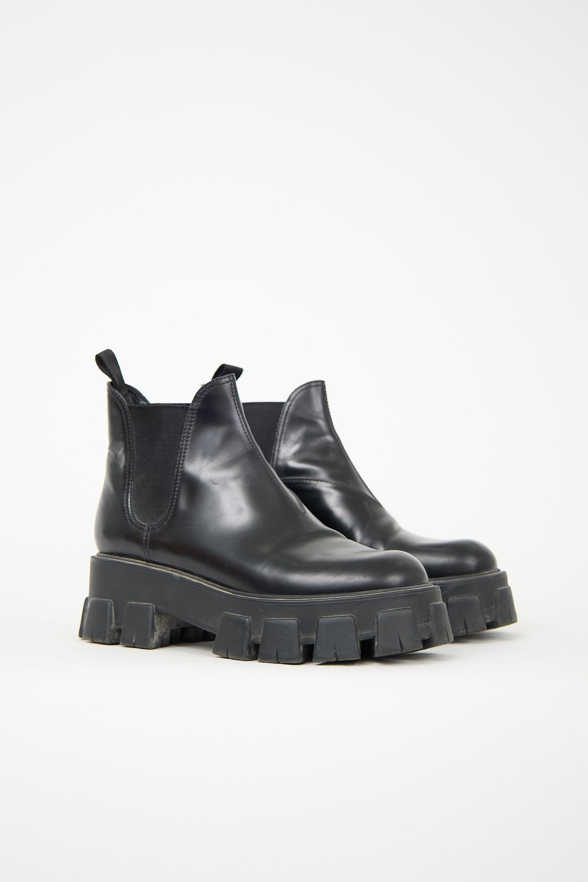 Pre-owned Prada black leather Monolith boots featuring rounded toe, elasticized gore at sides, pull tab at shaft, and platform rubber lug sole. Comes with original dust bags.