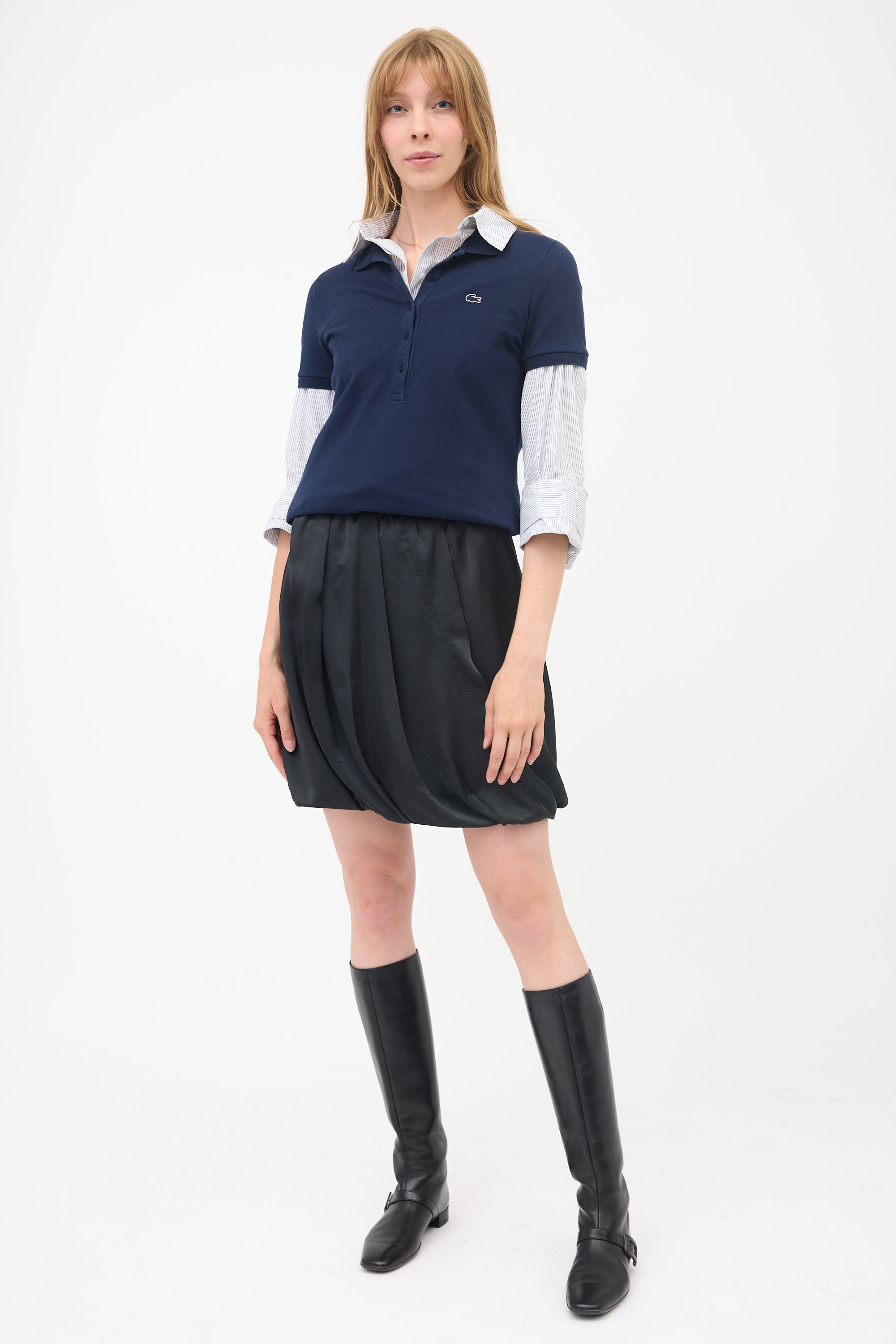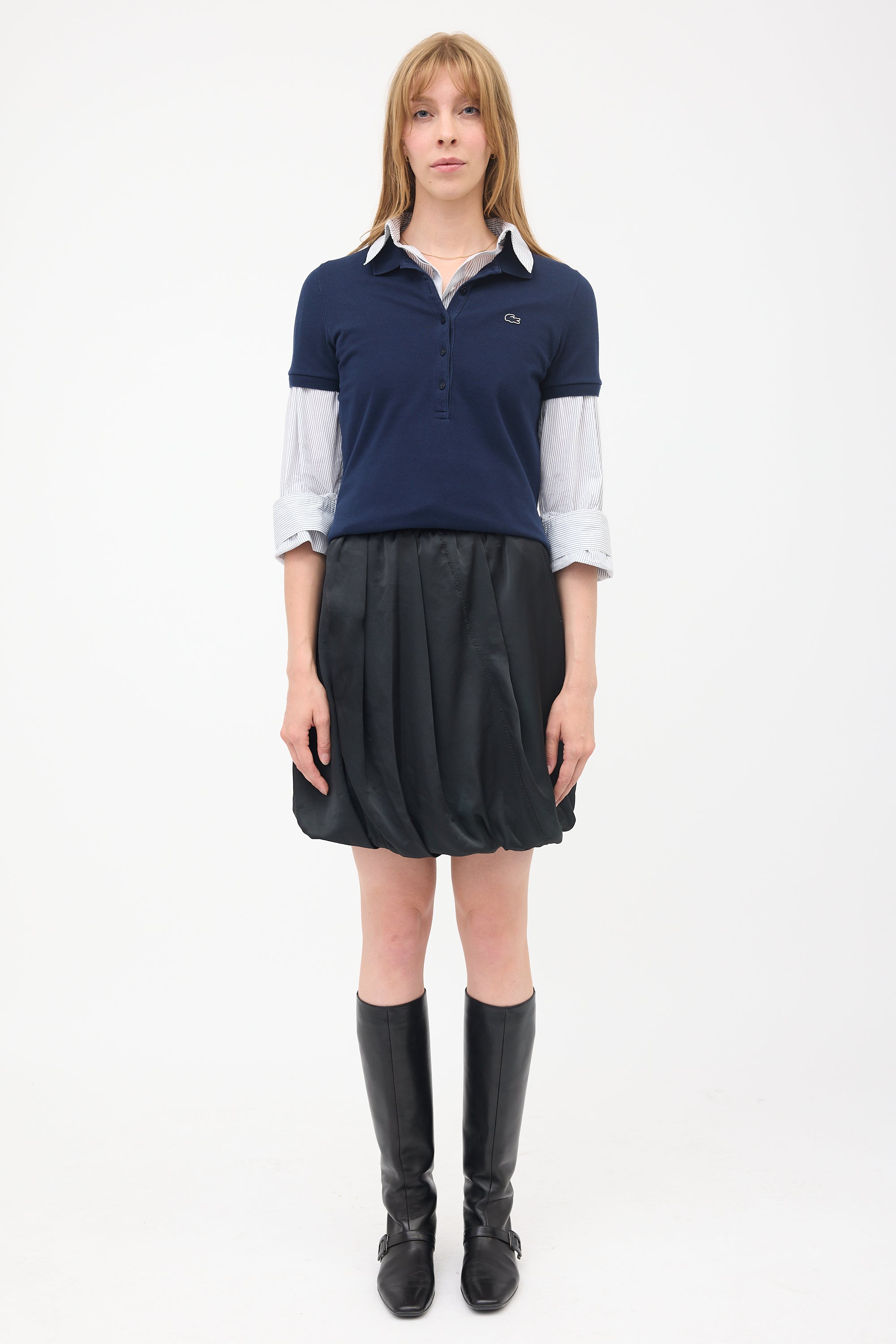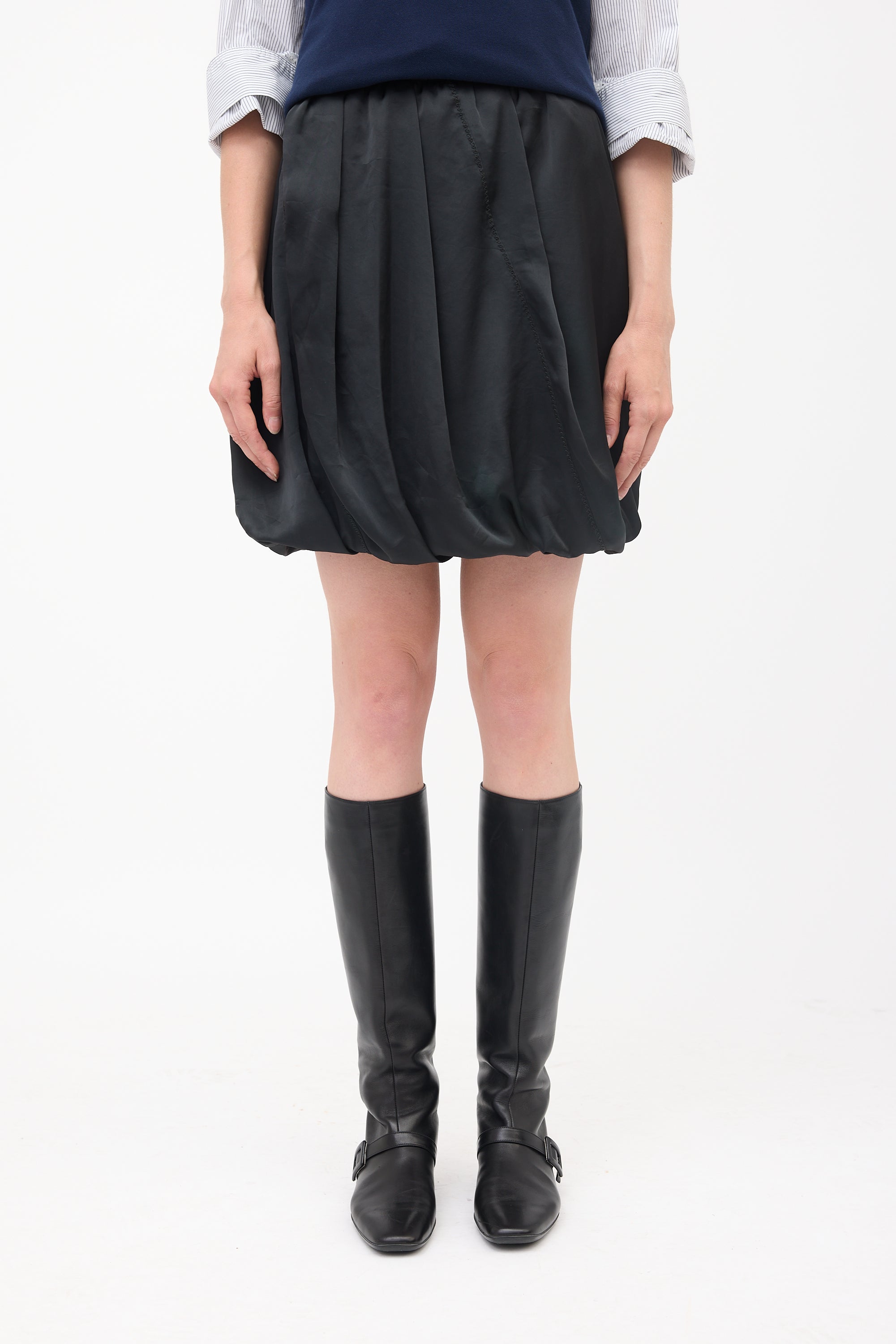 Pre-owned Prada green satin mini skirt featuring a black grosgrain waistband, zig zag stitching details throughout, concealed side zip, and bubble hem.