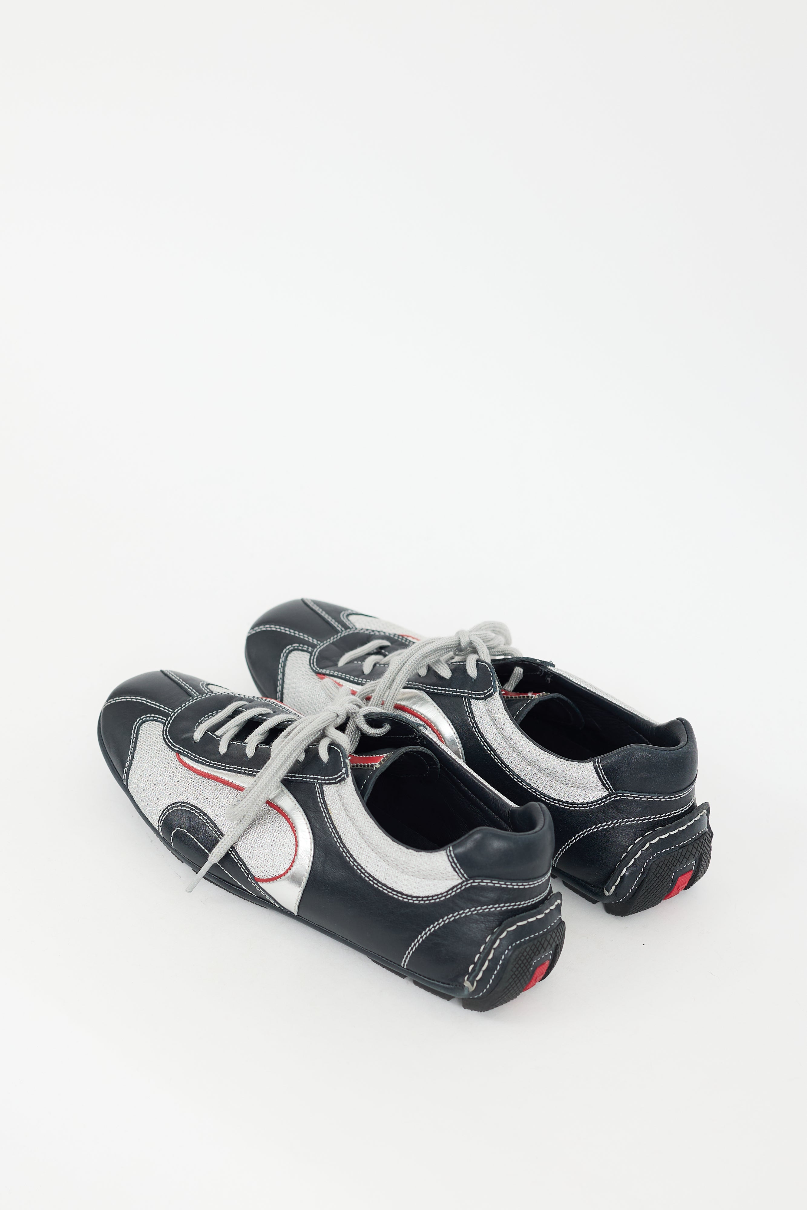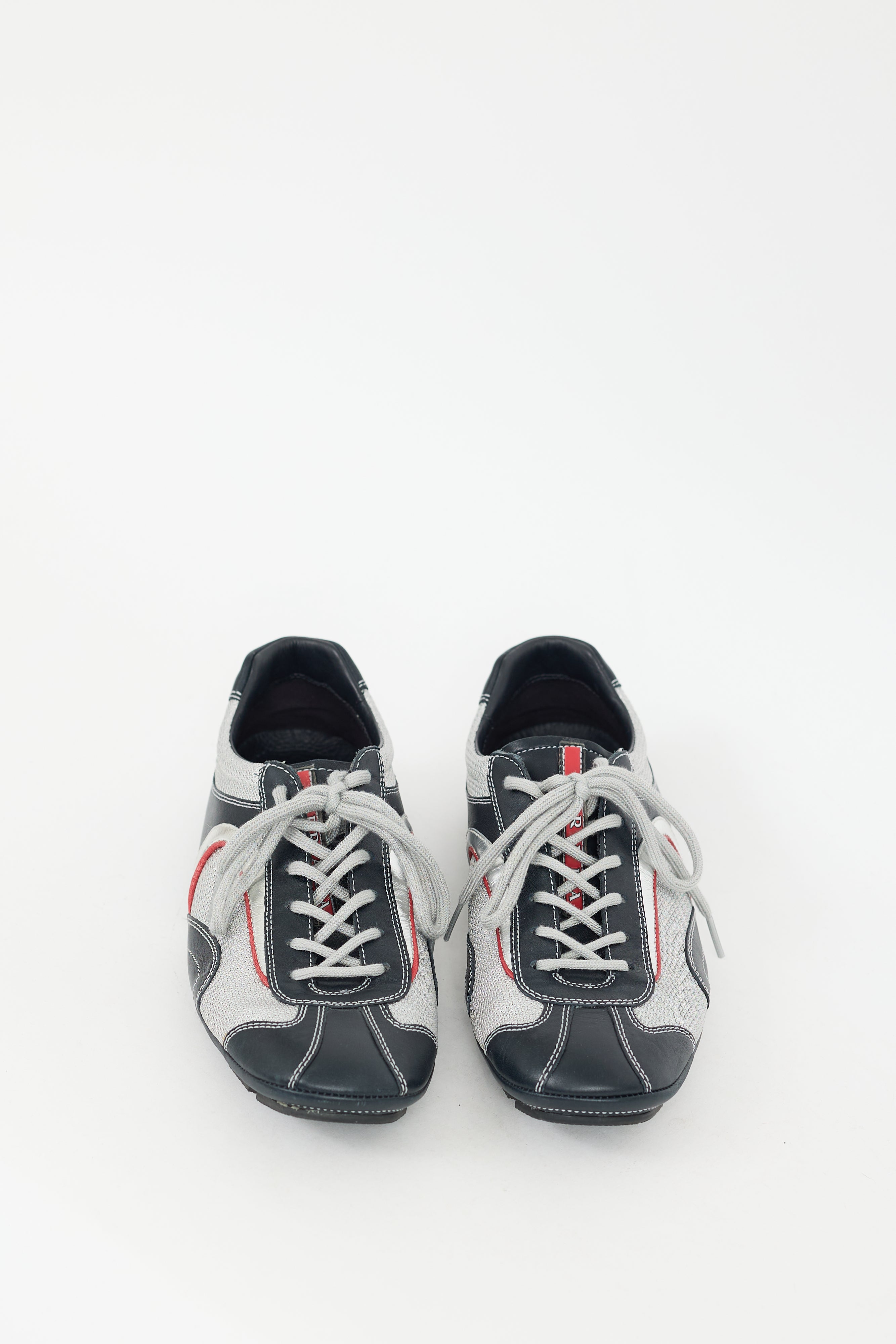 Pre-owned Prada Sport silver and multicolour Monte Carlo sneakers featuring a square toe, mesh, leather, and patent leather upper, white contrast stitching, lace up vamp, signature red logo stripe at tongue and heel, and treaded rubber sole. Comes with original dust bag.