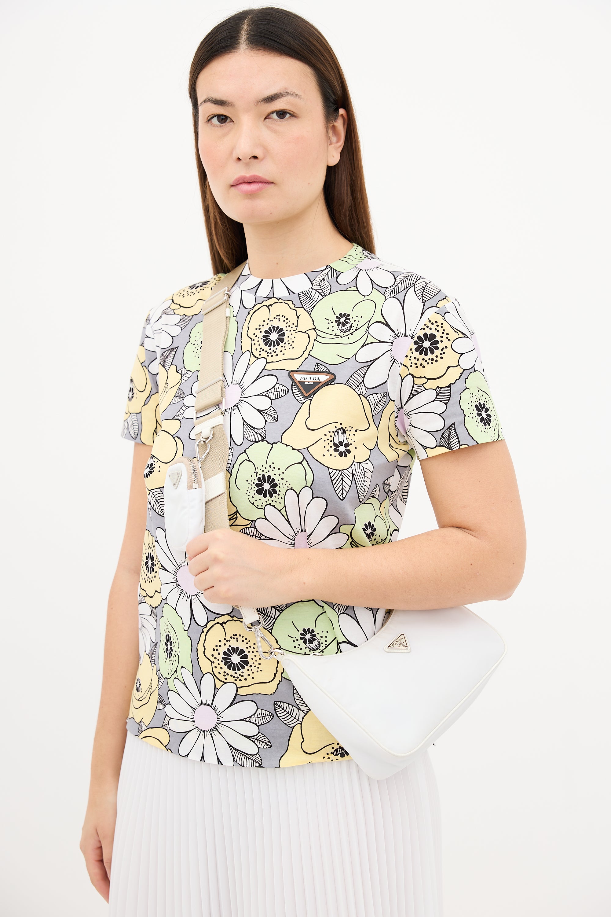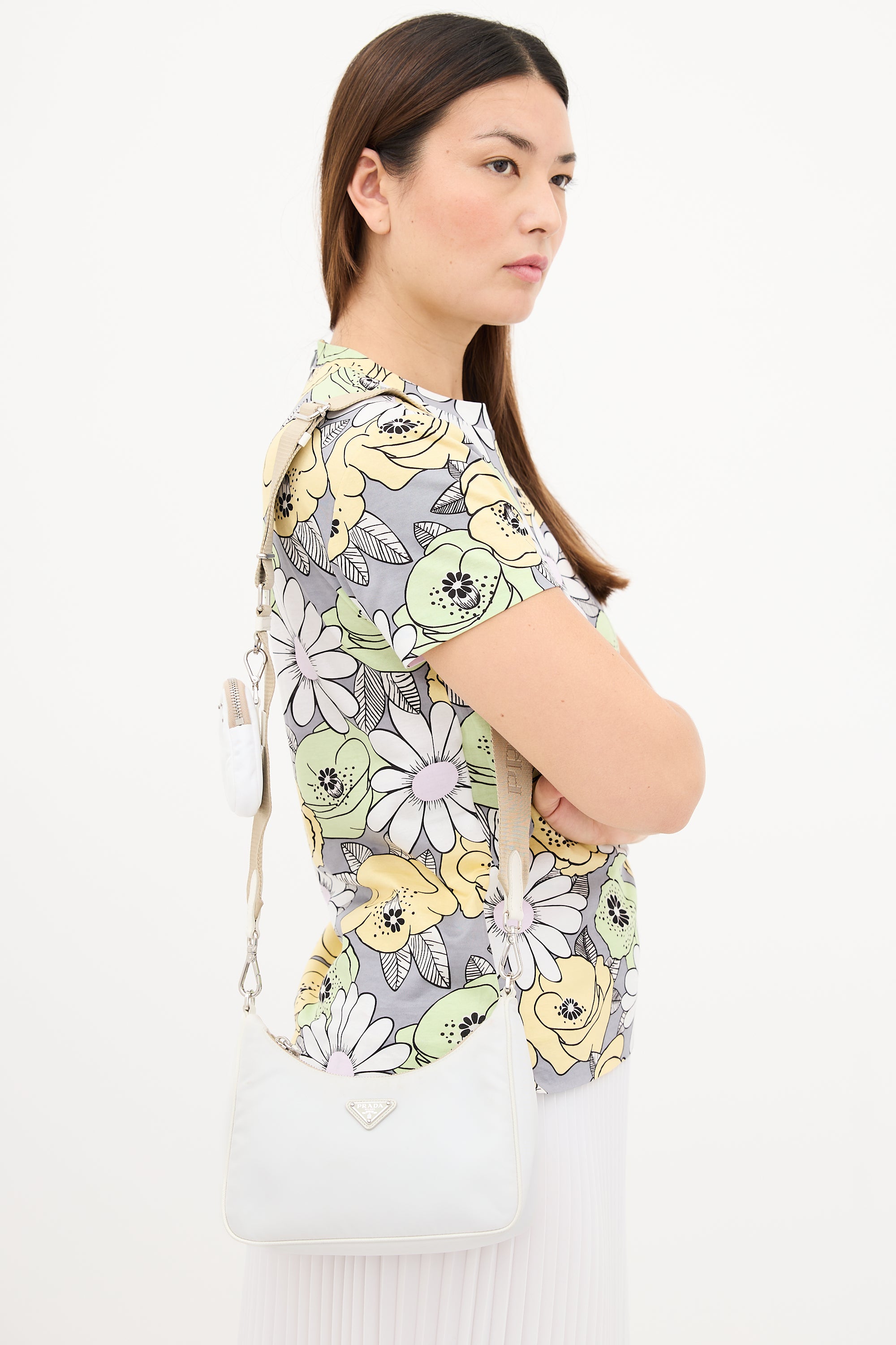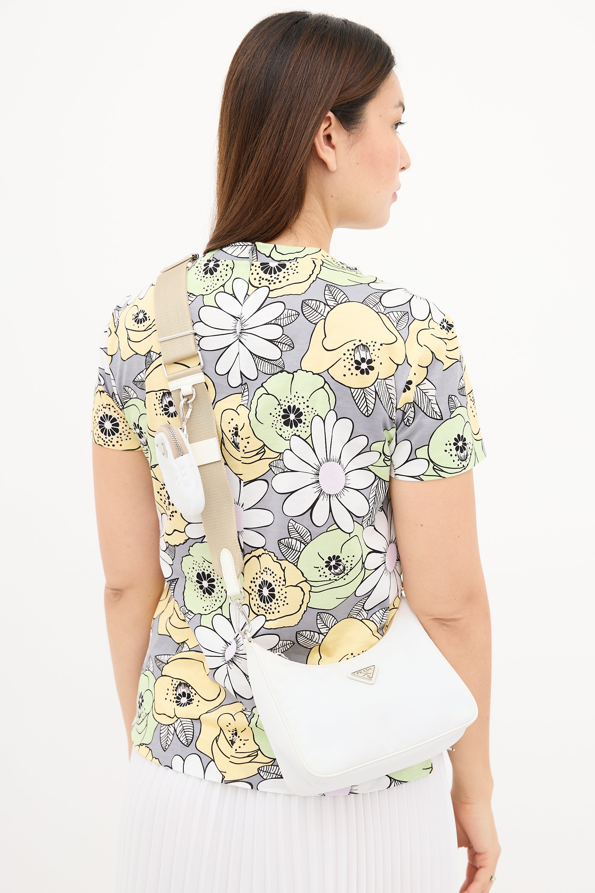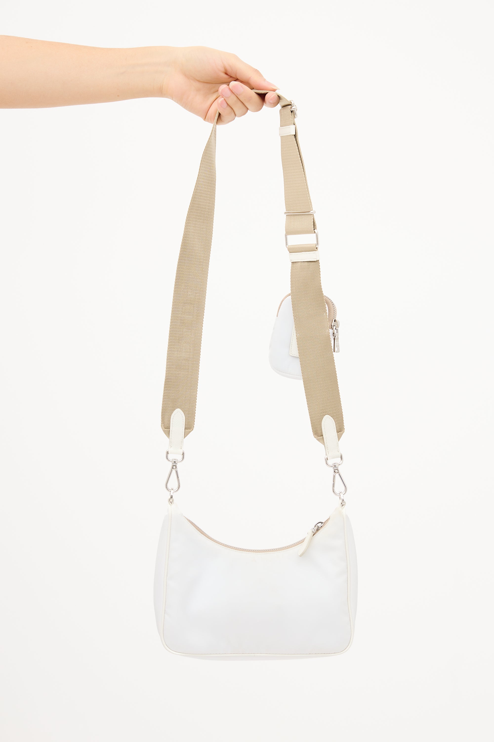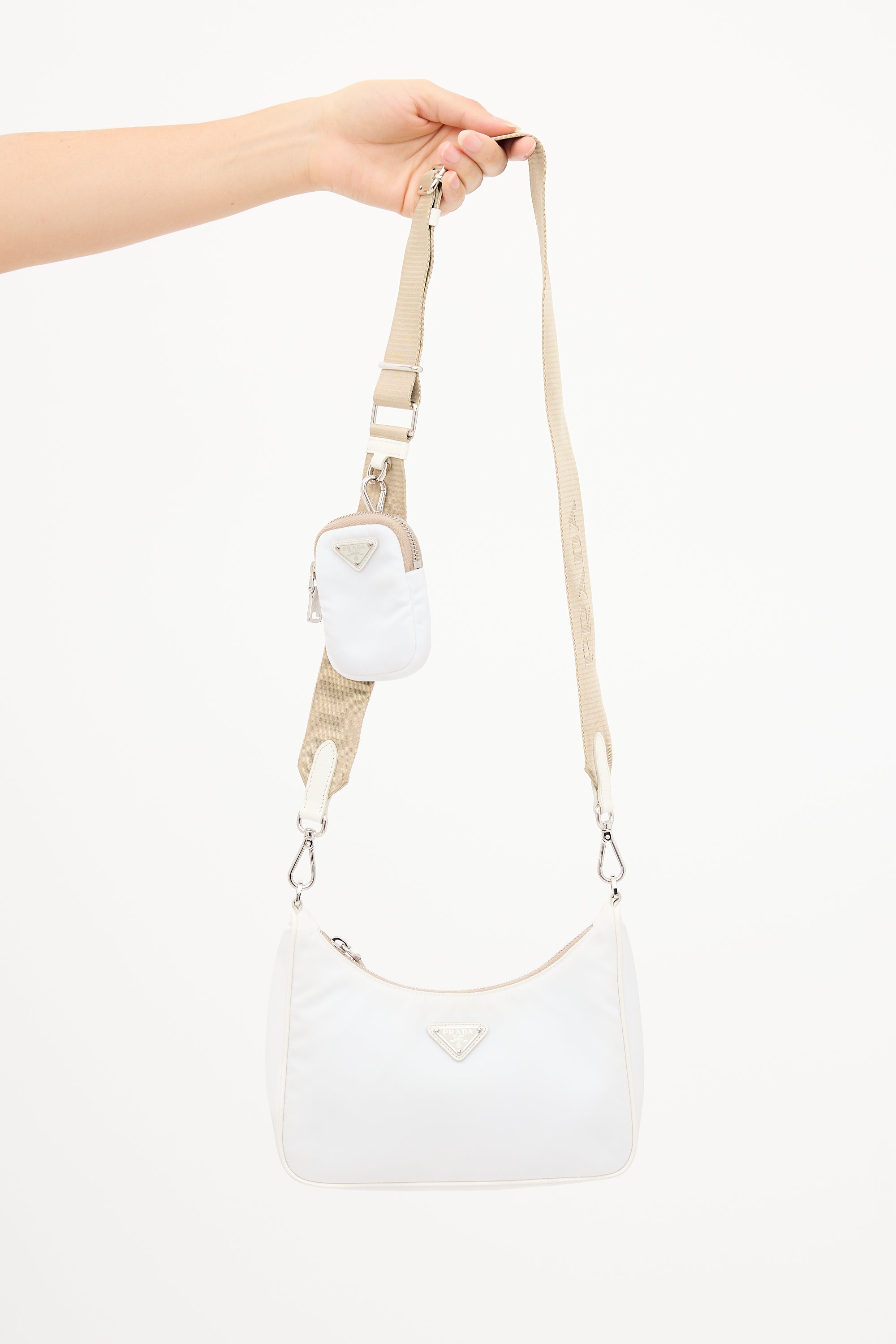 Pre-owned Prada white shoulder bag featuring regenerated nylon body, saffiano leather trim and panels, detachable and adjustable beige webbed logo strap, front signature white enamel triangle logo embellishment, top zip closure, one lined main compartment, and matching zip pouch. Comes with original dust bag.