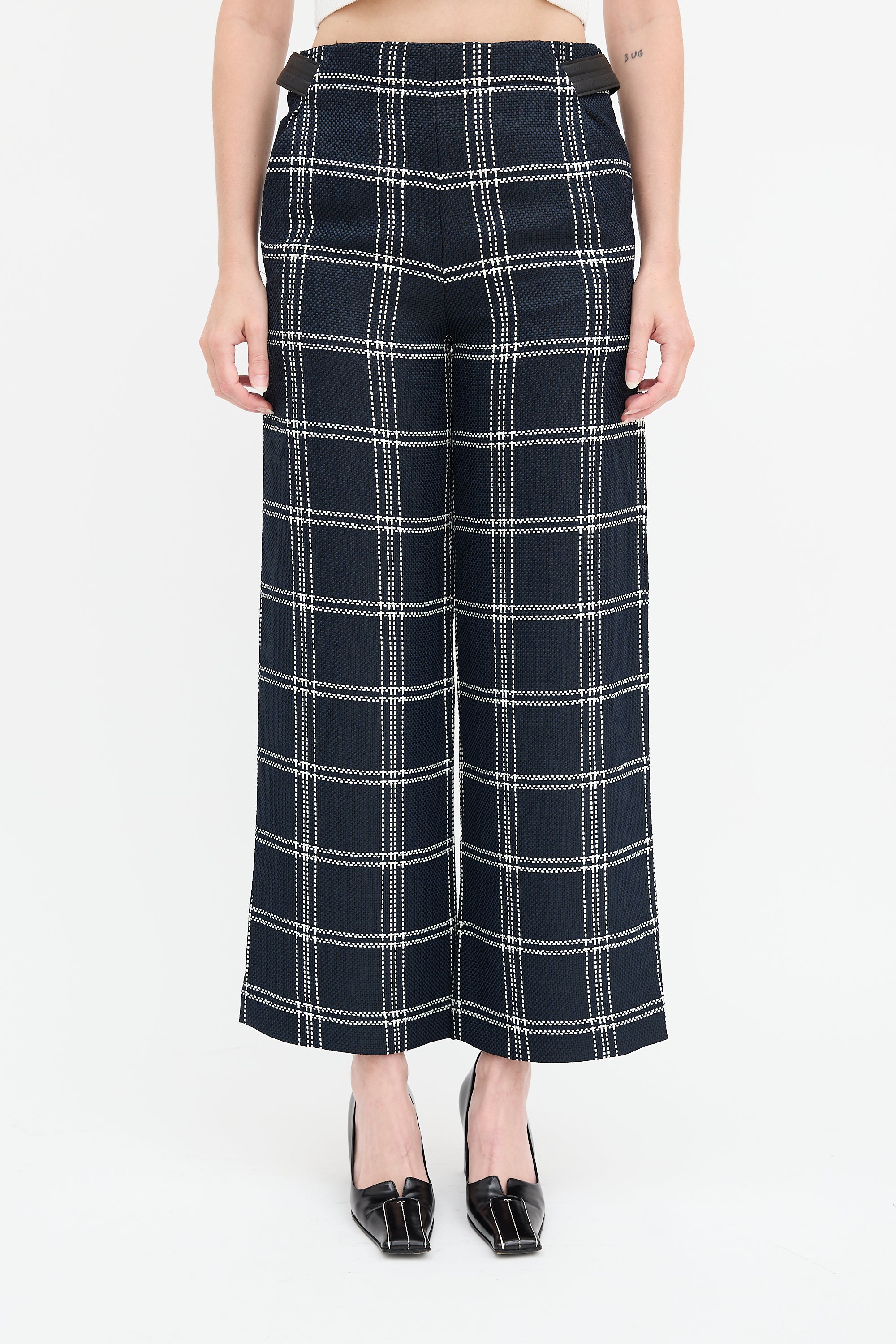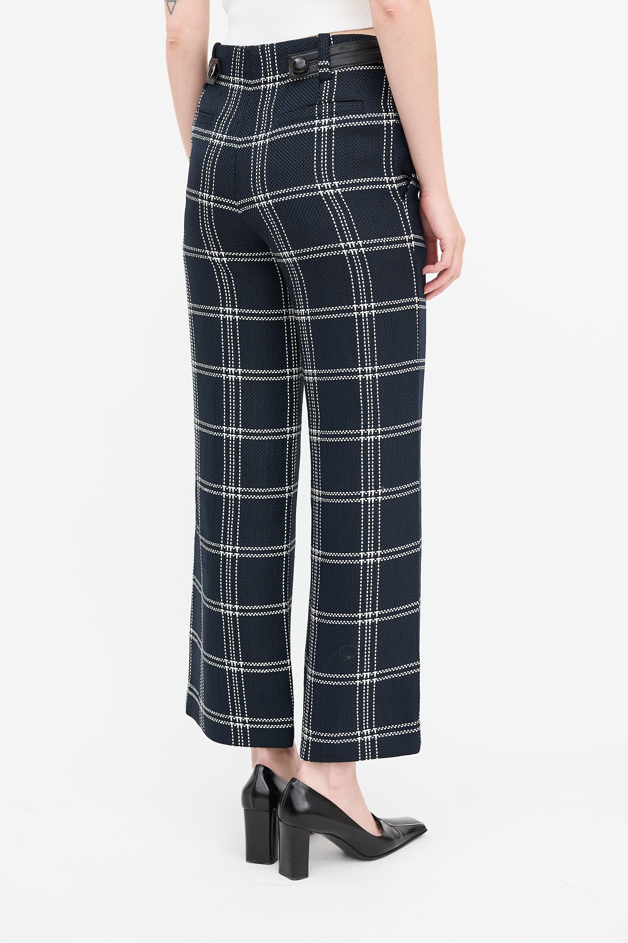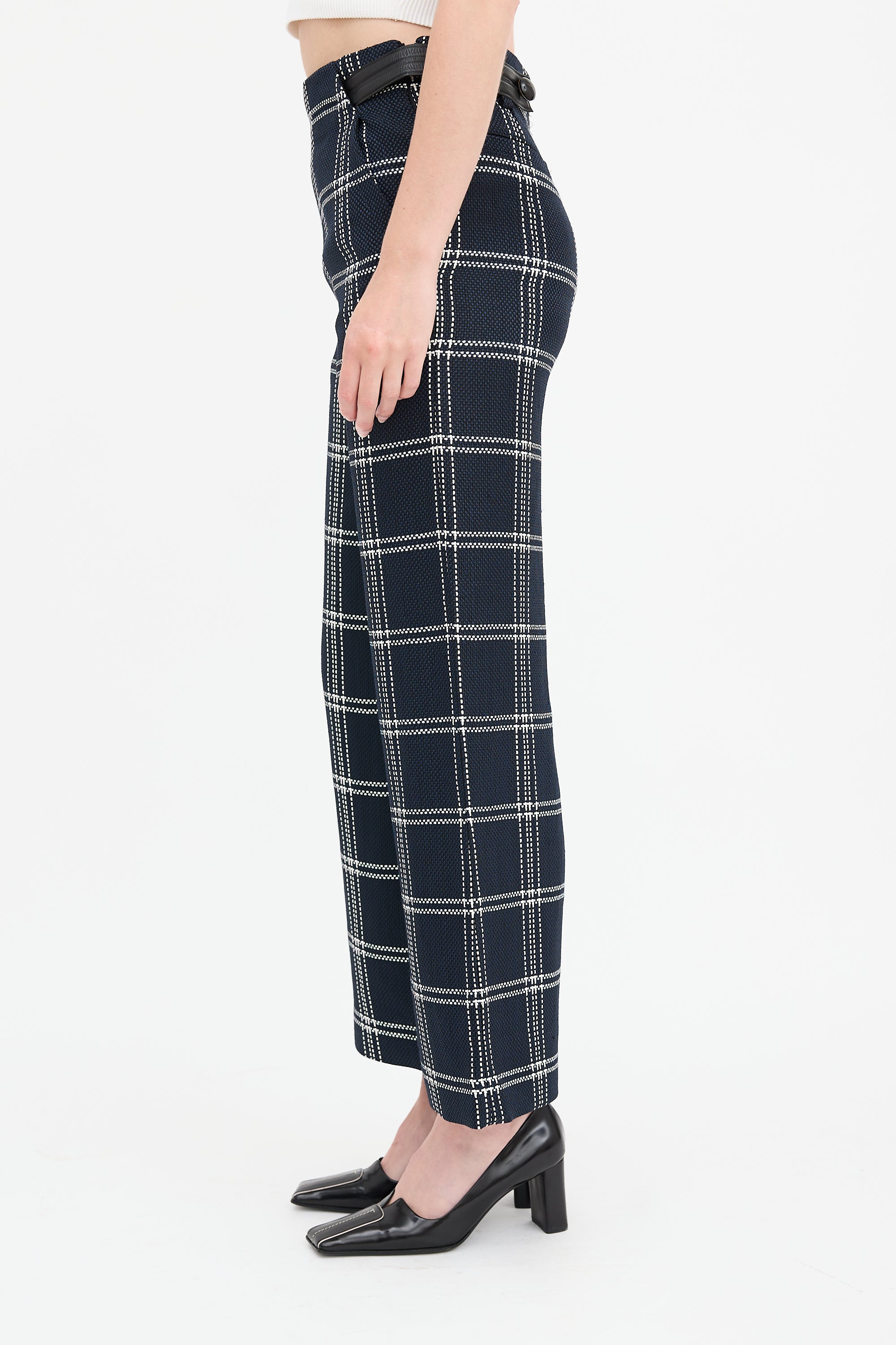 Pre-owned Proenza Schouler navy and multicolour trousers featuring woven check pattern, high waist, leather waist belt, wide leg, four pocket styling, and concealed side zip.
