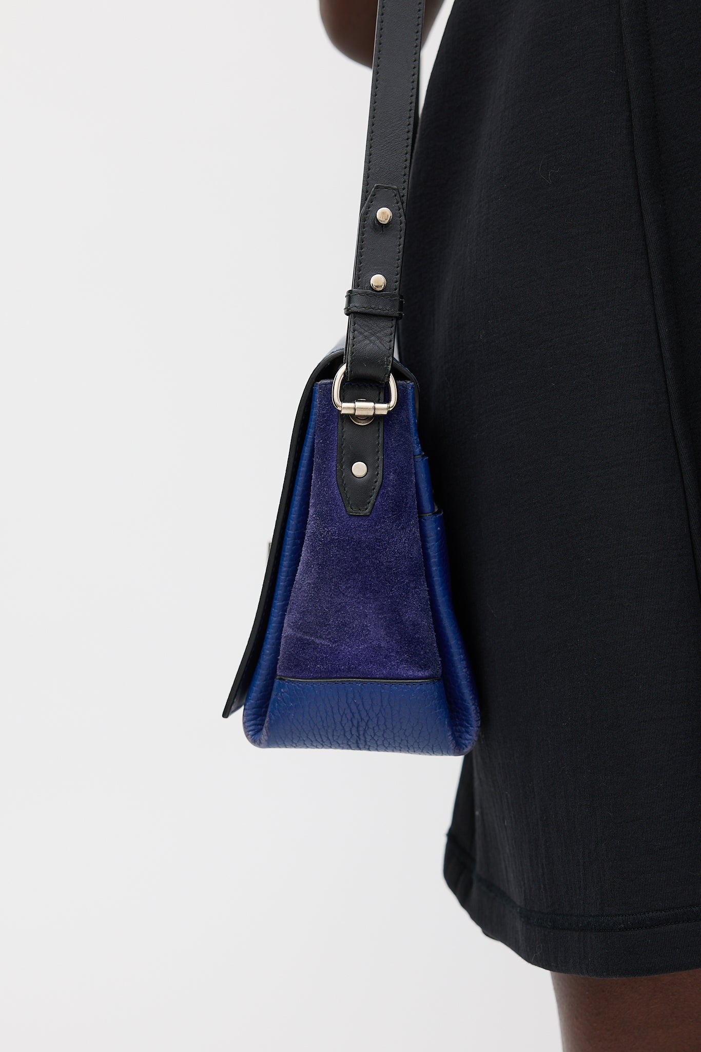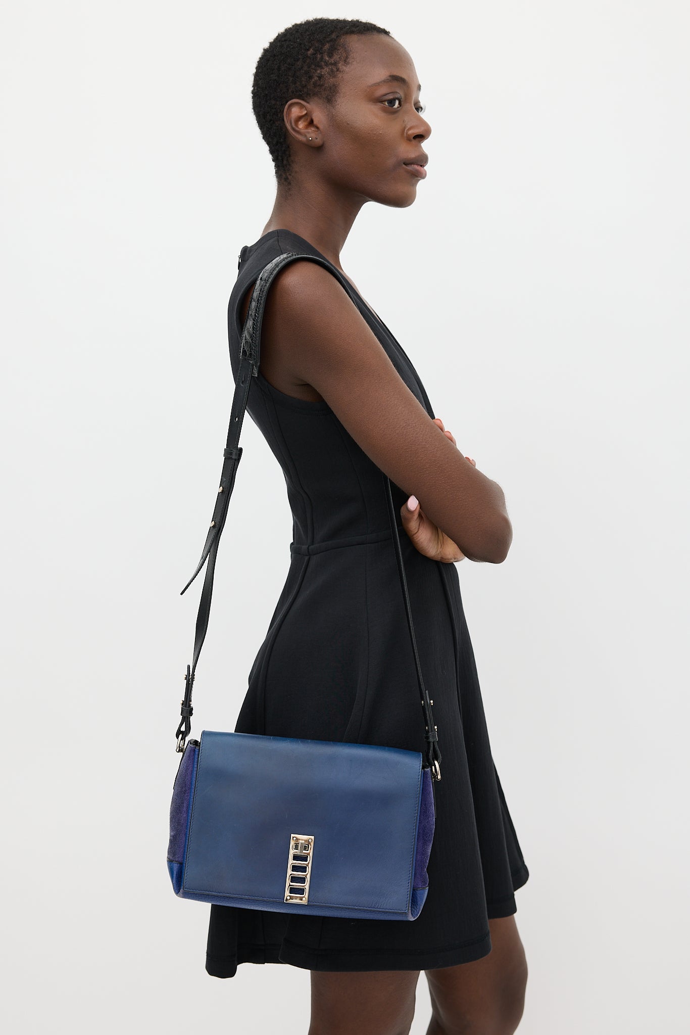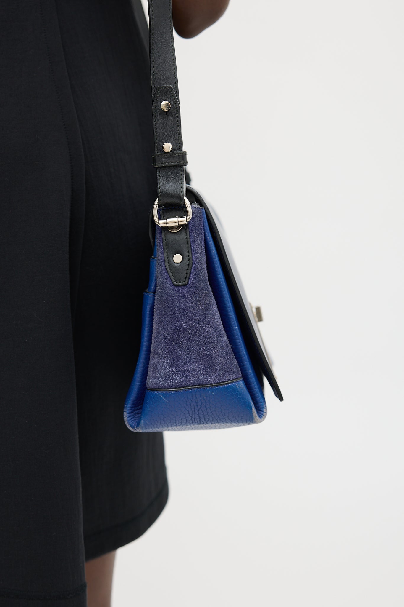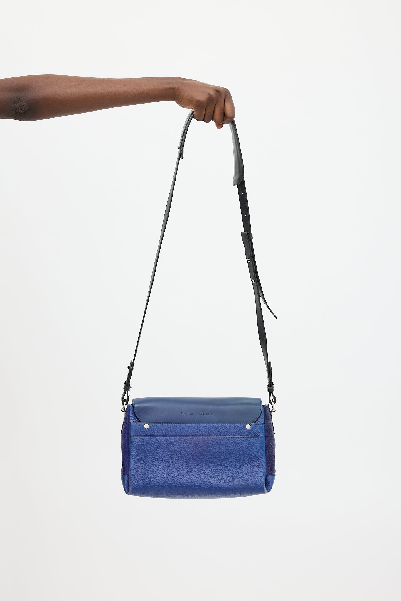 Pre-owned Proenza Schouler blue Elliot leather shoulder bag featuring a top flap, one main compartment with two slip pockets and one zip pocket, one slip pocket at back with an embossed logo, adjustable shoulder strap, and silver tone twist lock closure.