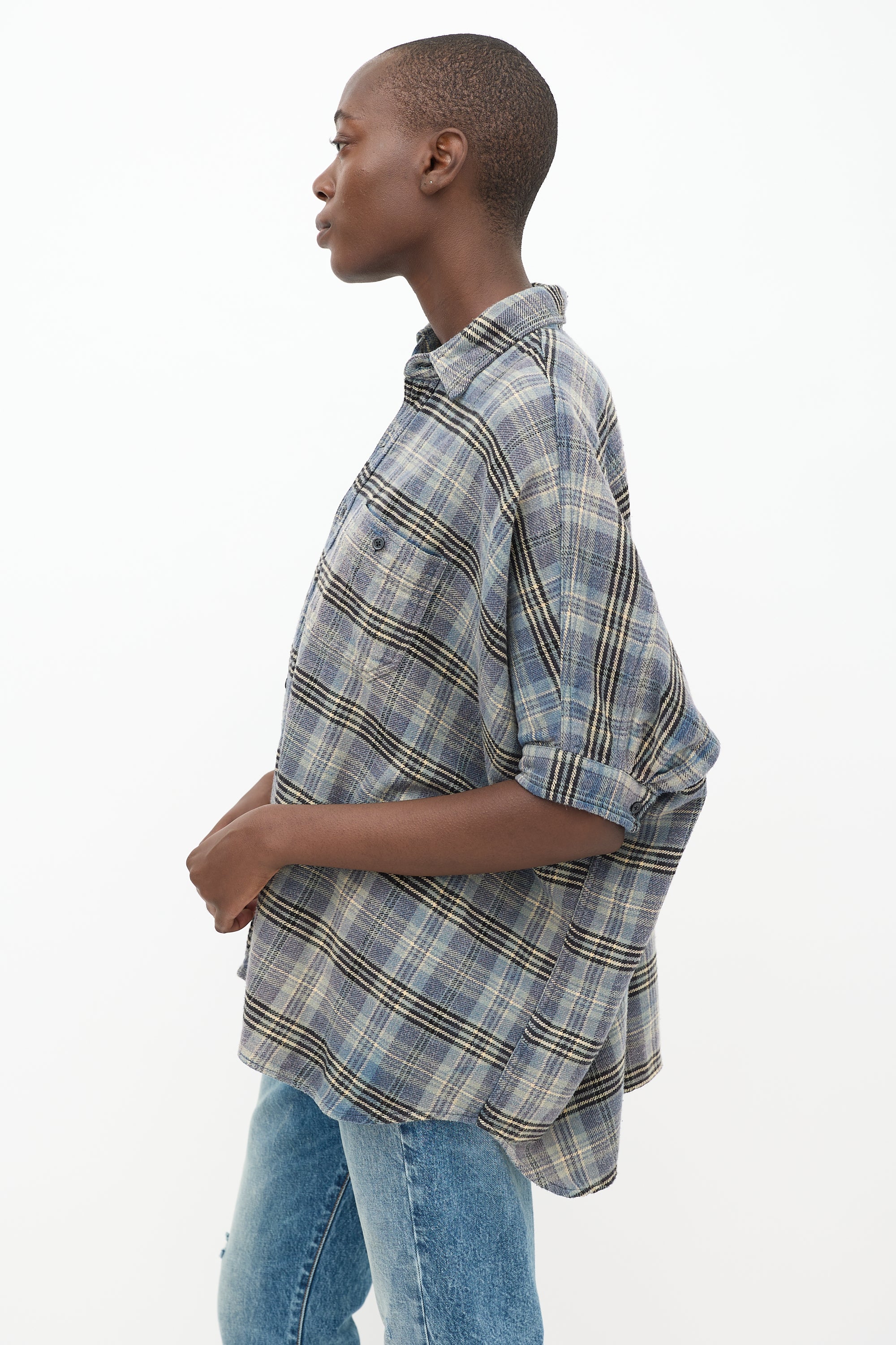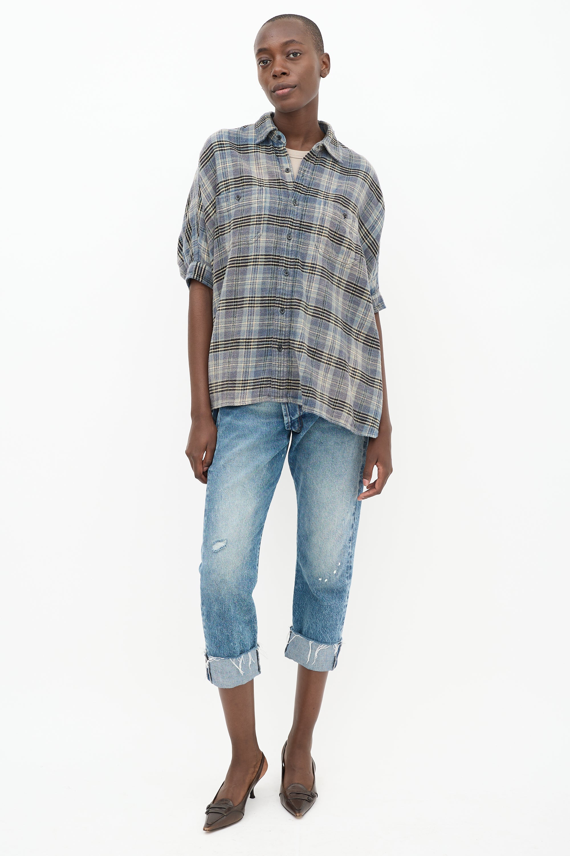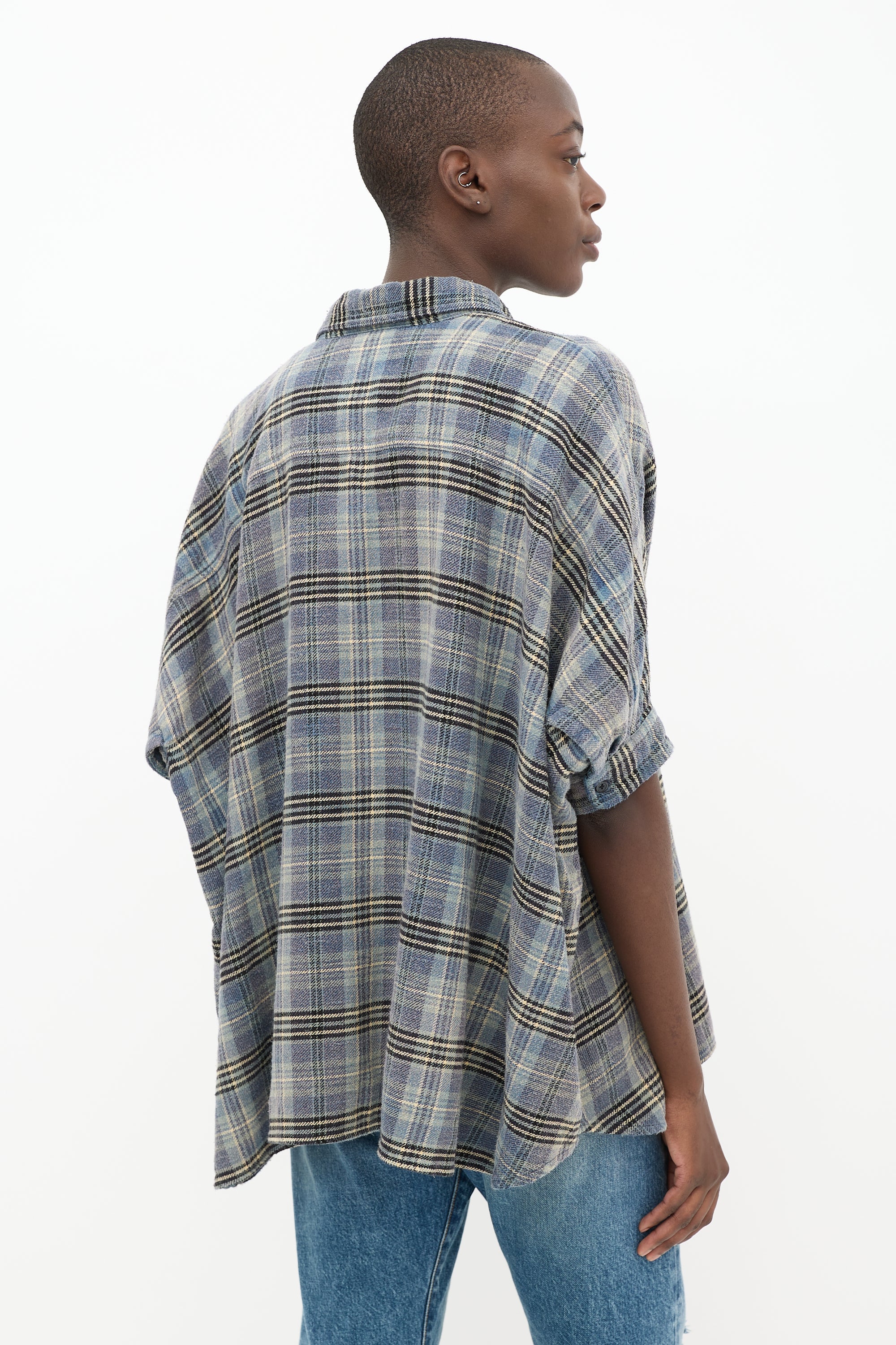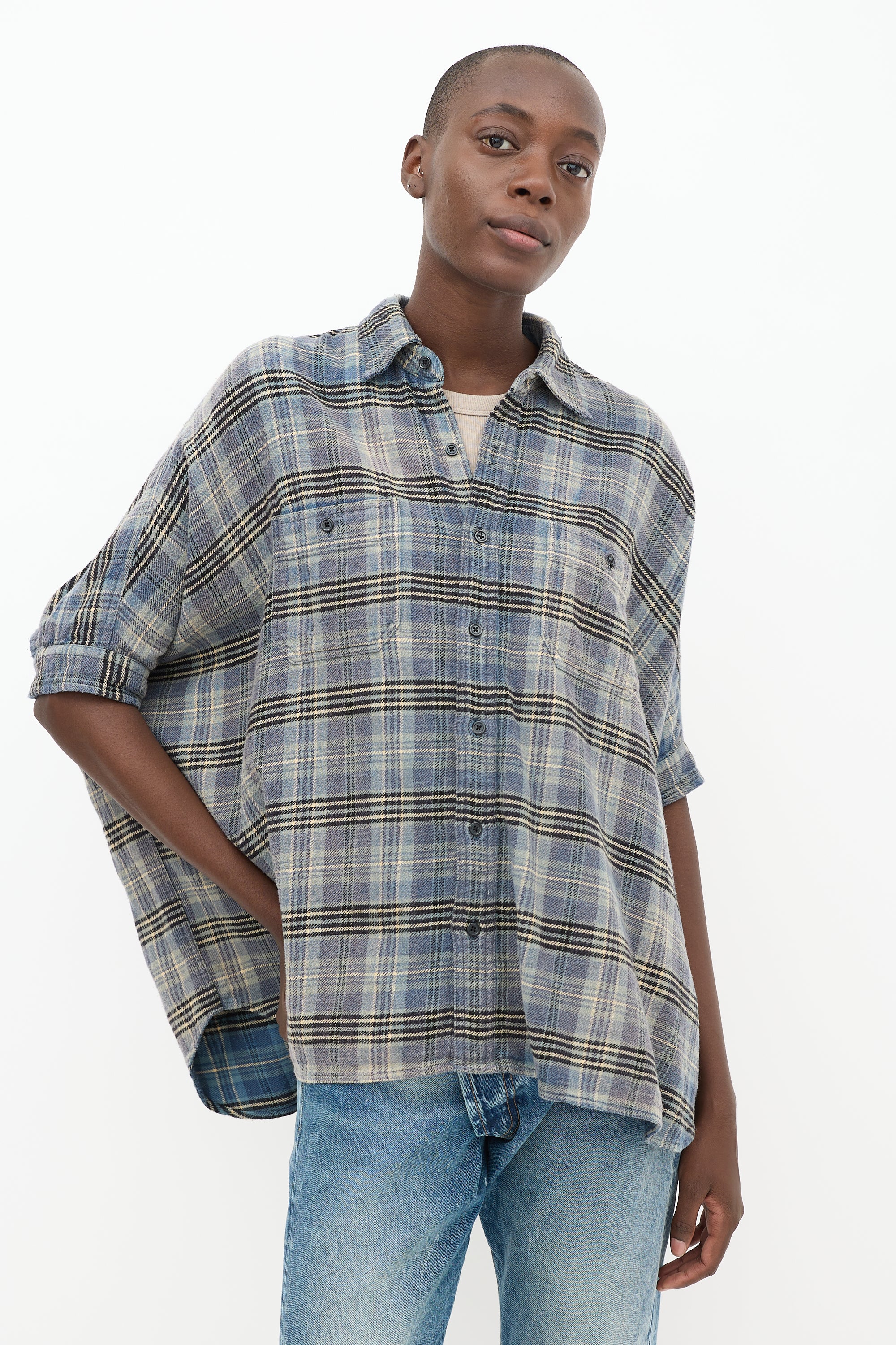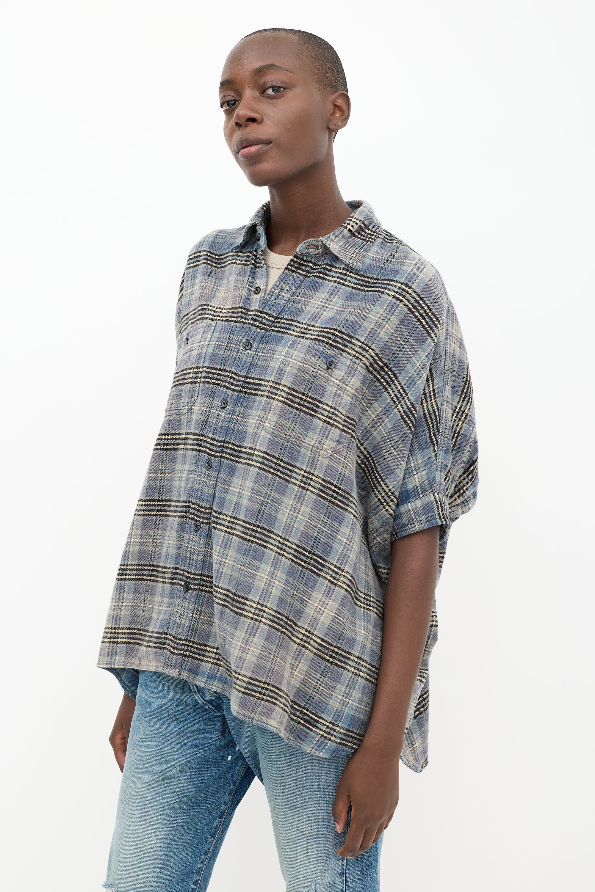 Pre-owned R13 blue shirt featuring a multicolour plaid pattern throughout, pointed collar, short batwing sleeves, two patch pockets at chest, and button up closure.