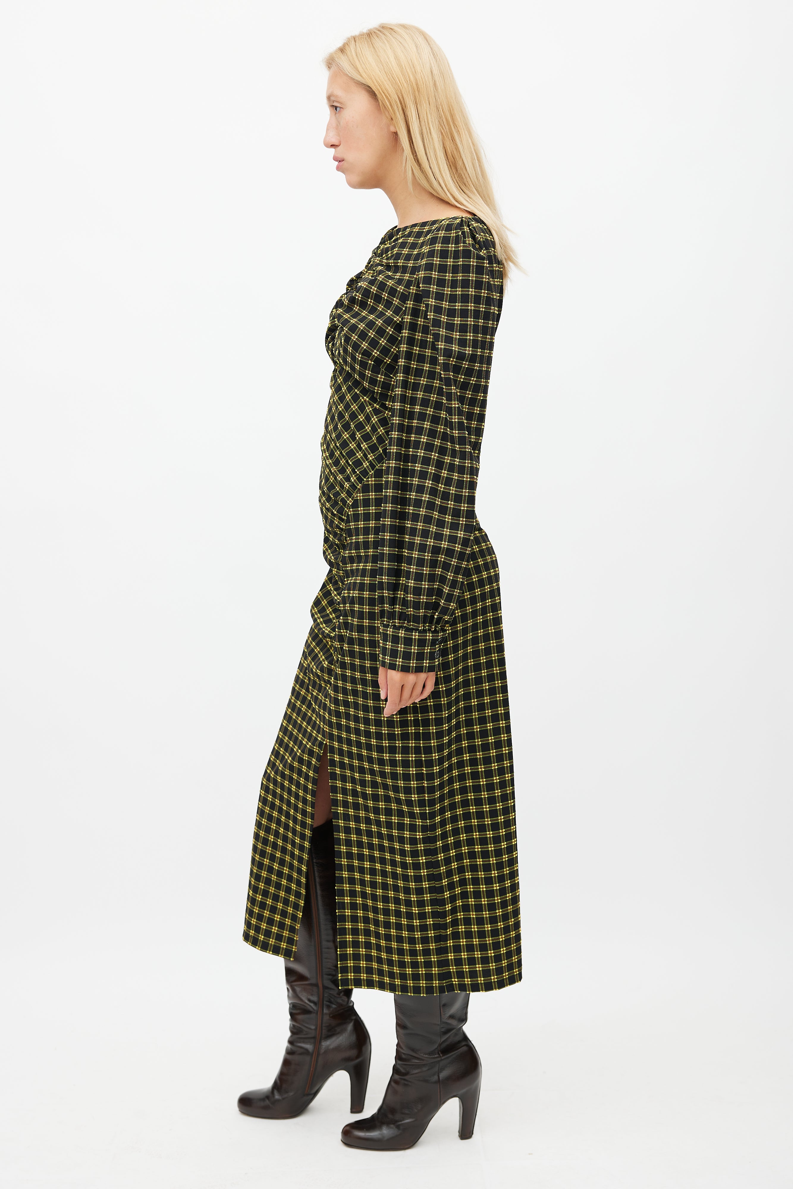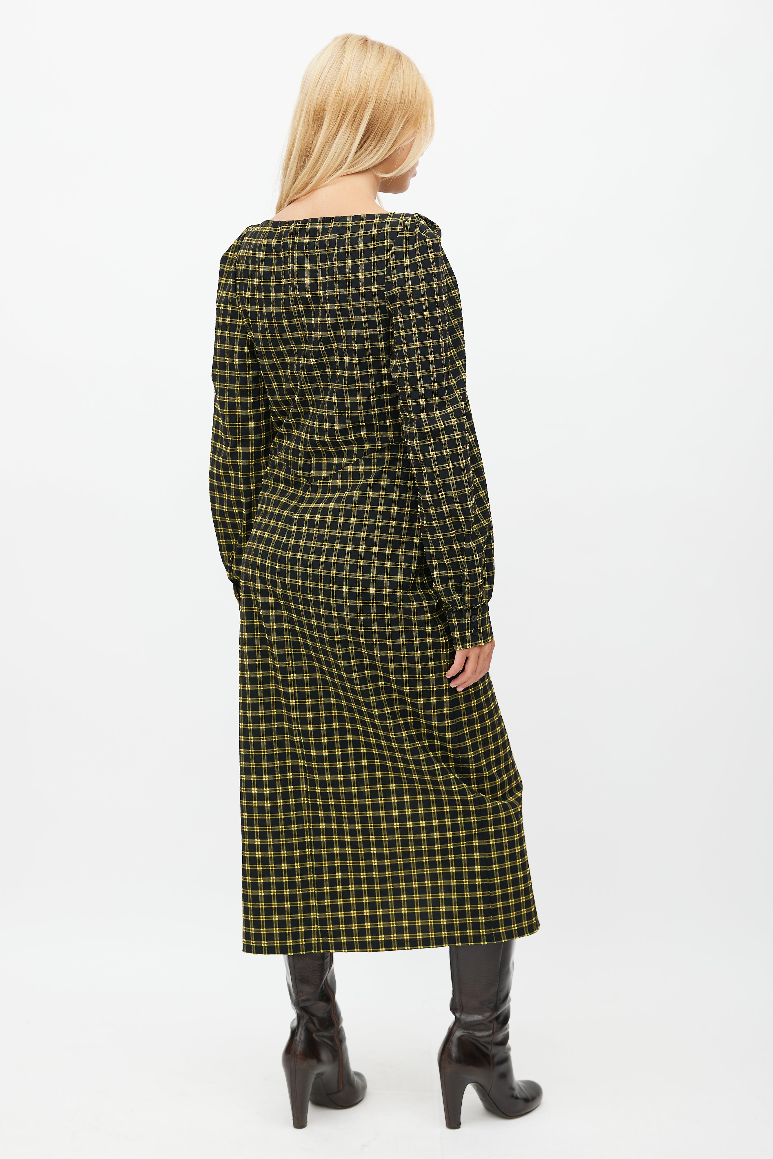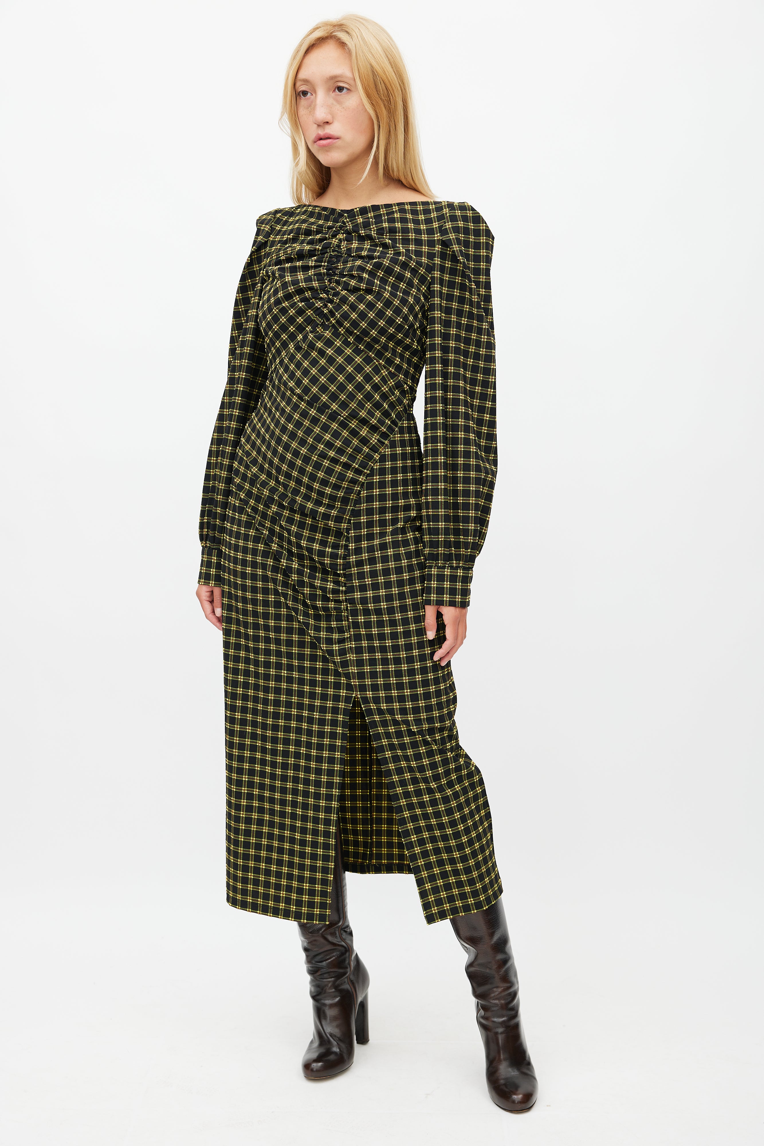 Pre-owned Rachel Comey black dress featuring a yellow plaid print, ruched detailing throughout, long sleeves with buttoned cuffs, and zip closure at side. Clipped to fit model.