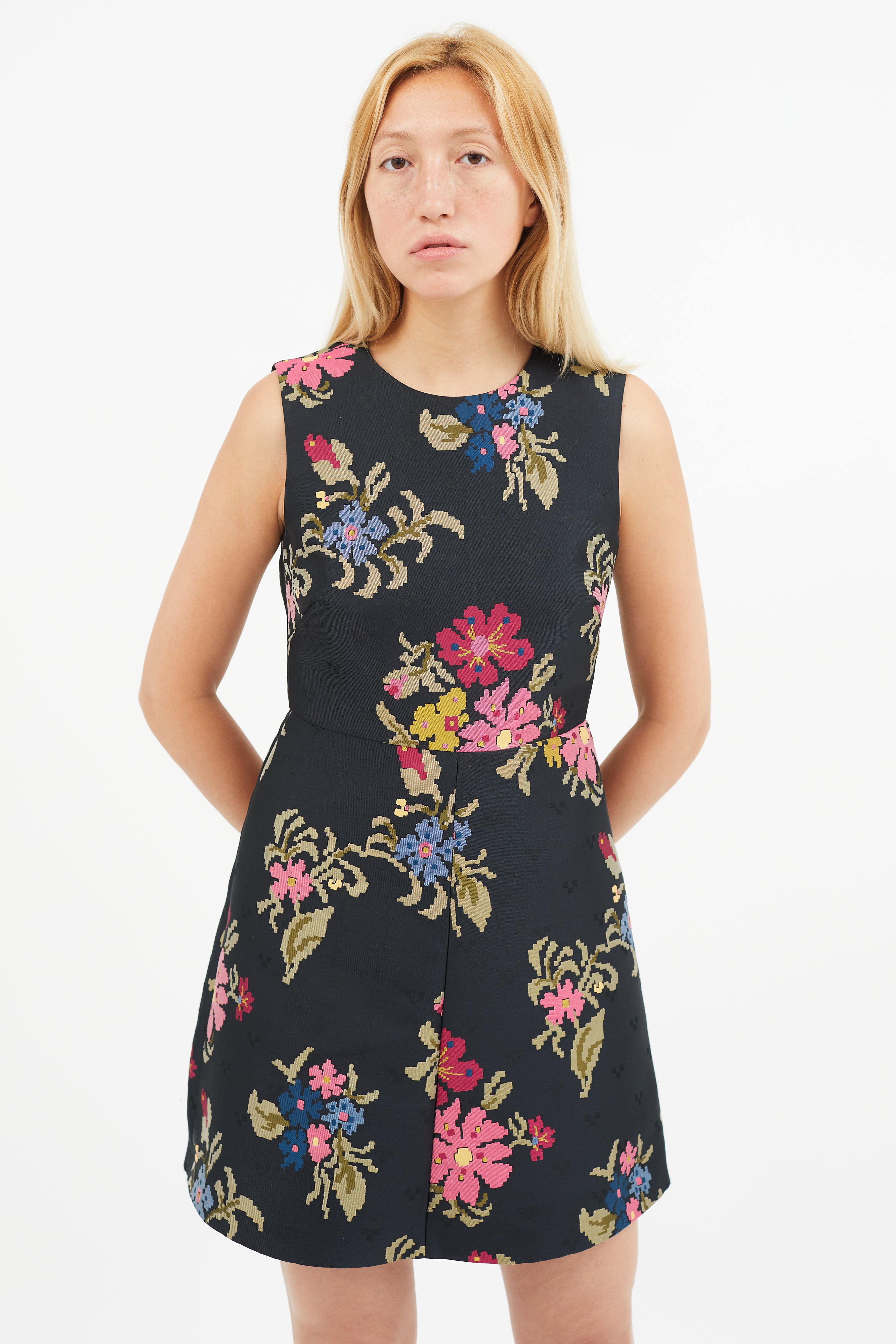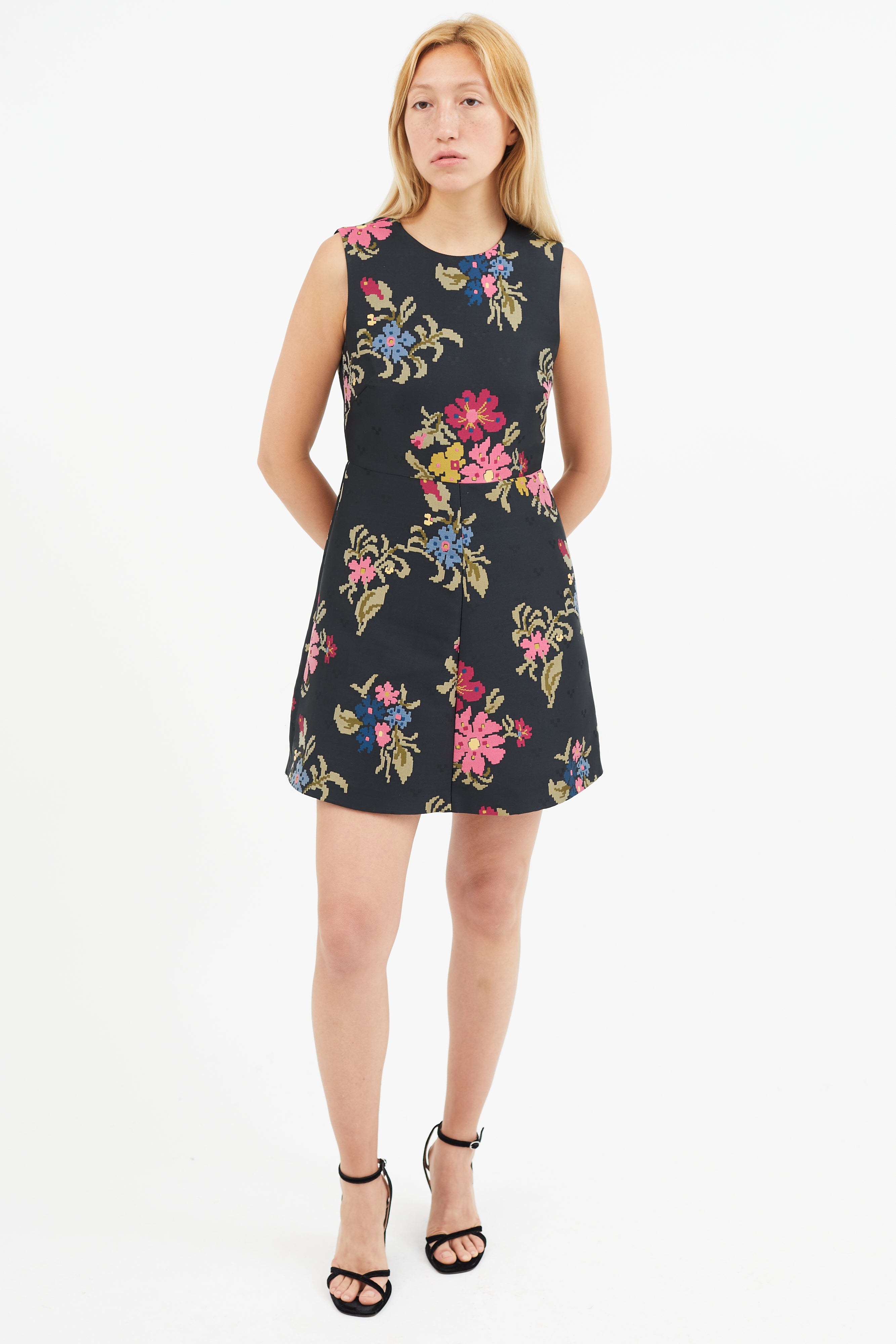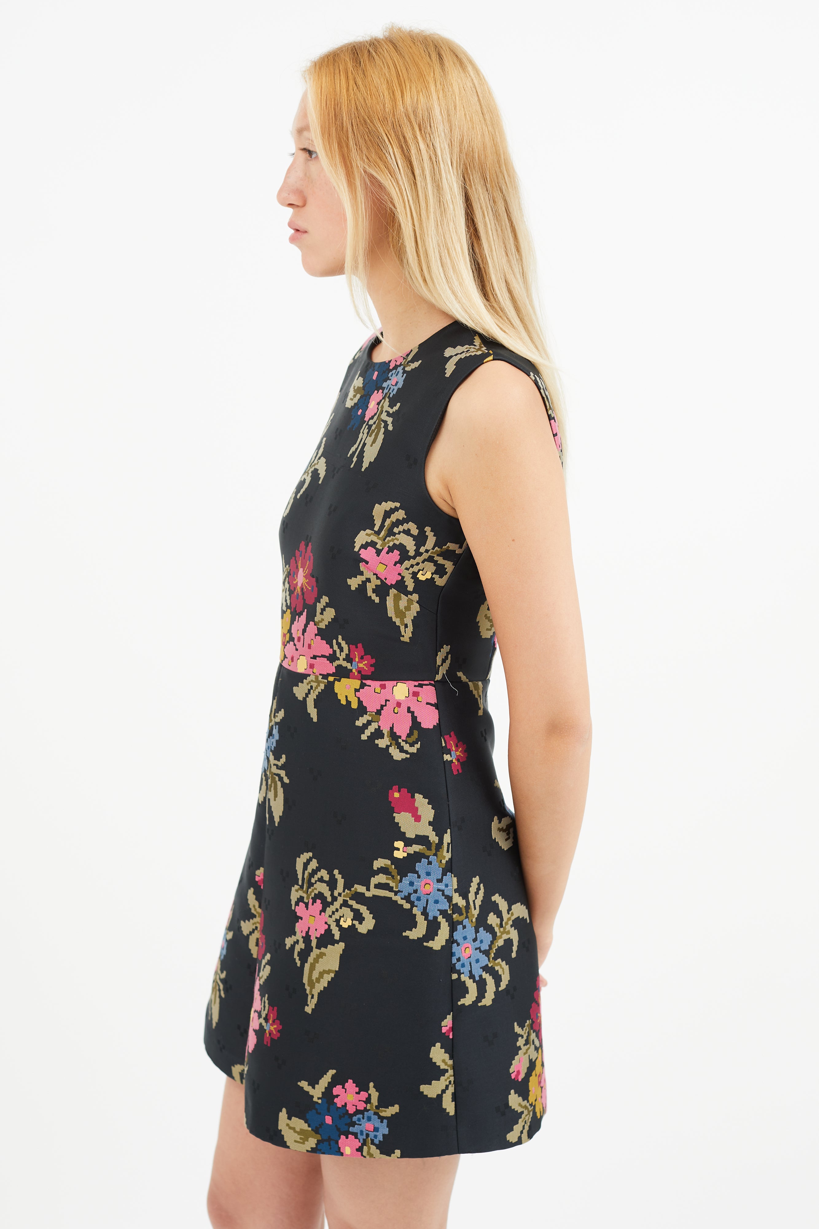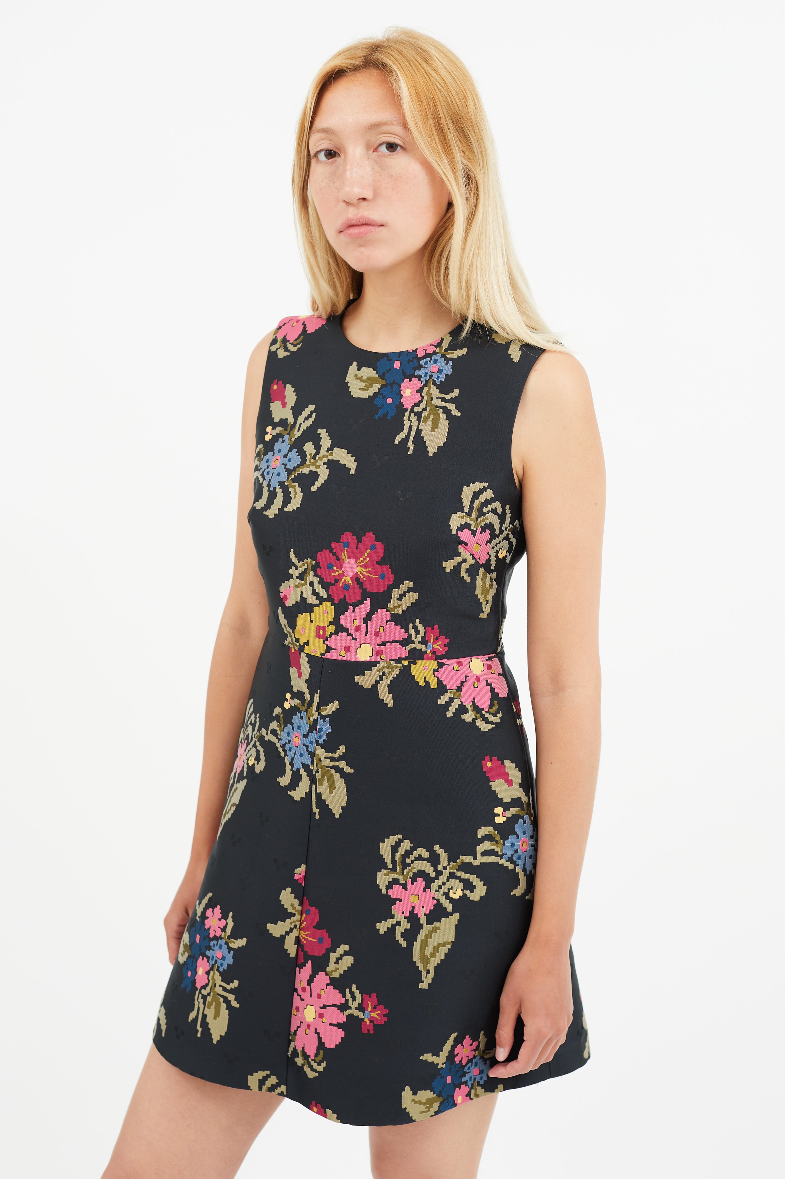 Pre-owned Red Valentino black dress featuring round neckline, multicolour floral embroidery, and concealed zip closure at back. Lined.