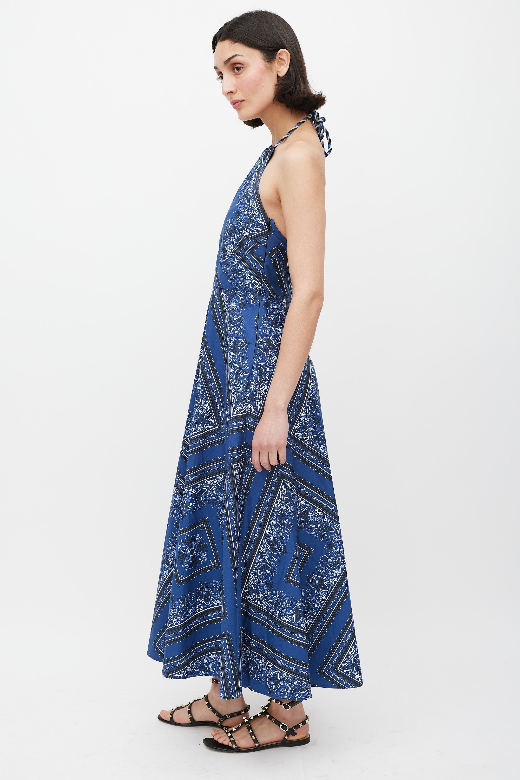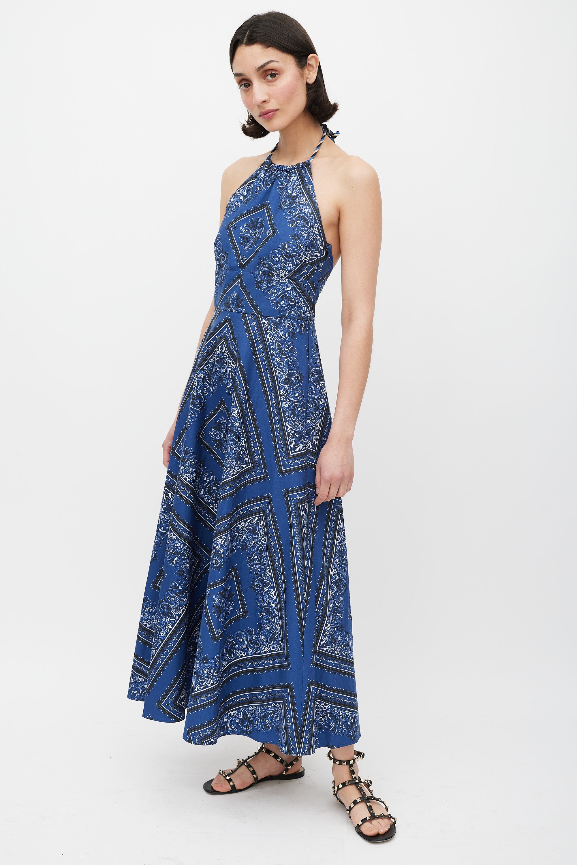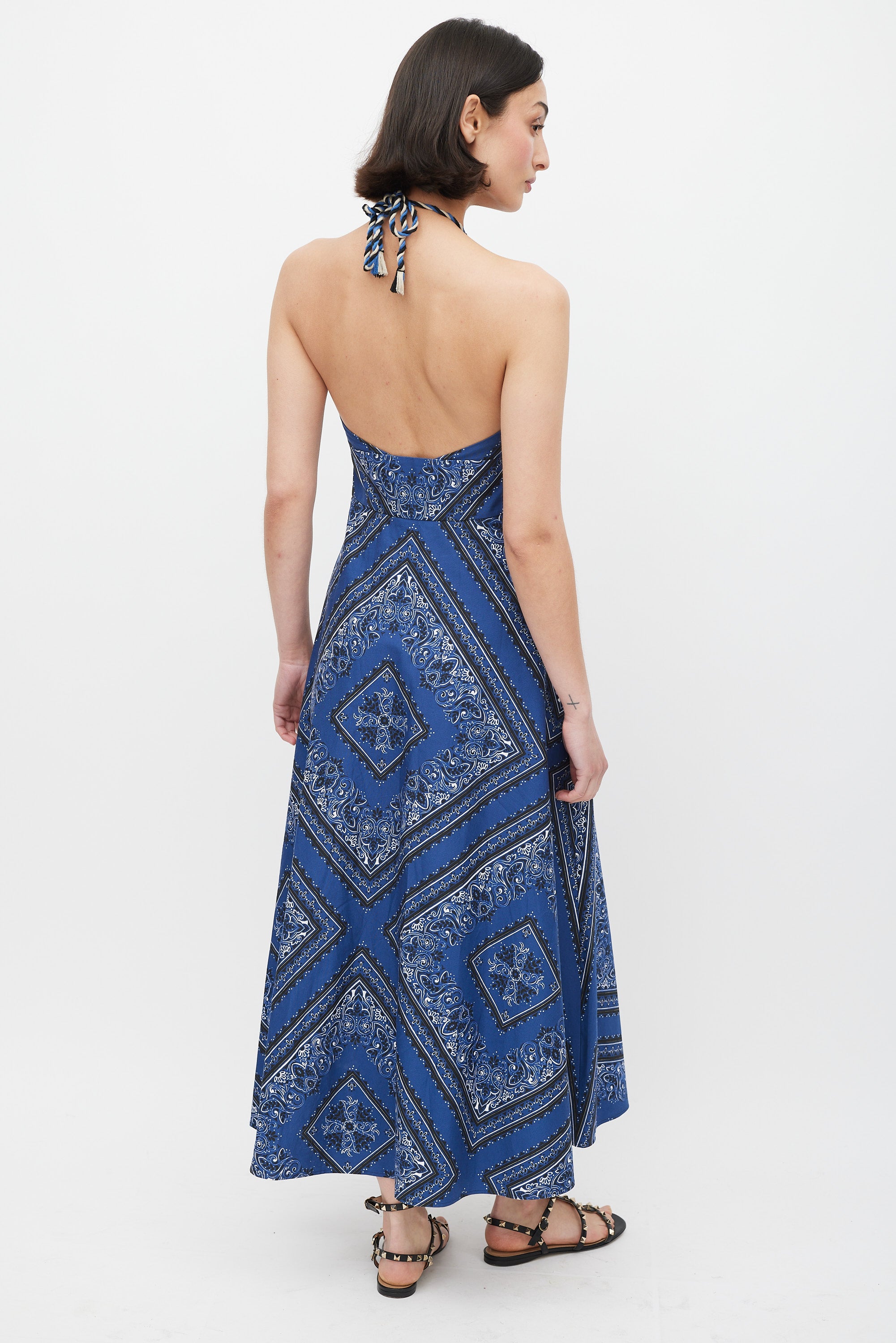 Pre-owned Red Valentino blue, black, and white cotton A-line maxi dress featuring bandana print throughout, halter neck with braided rope tie, open upper back, flared skirt, and concealed side zip closure. Partially lined.