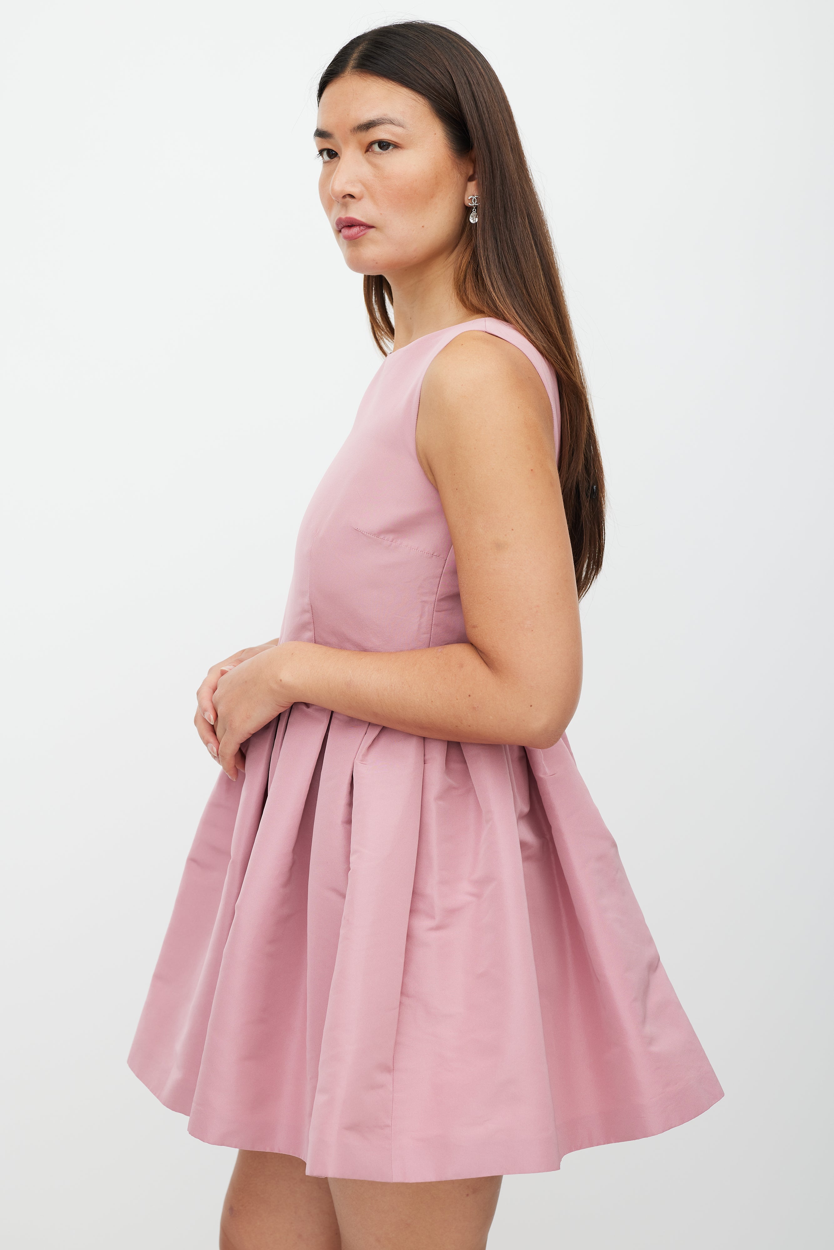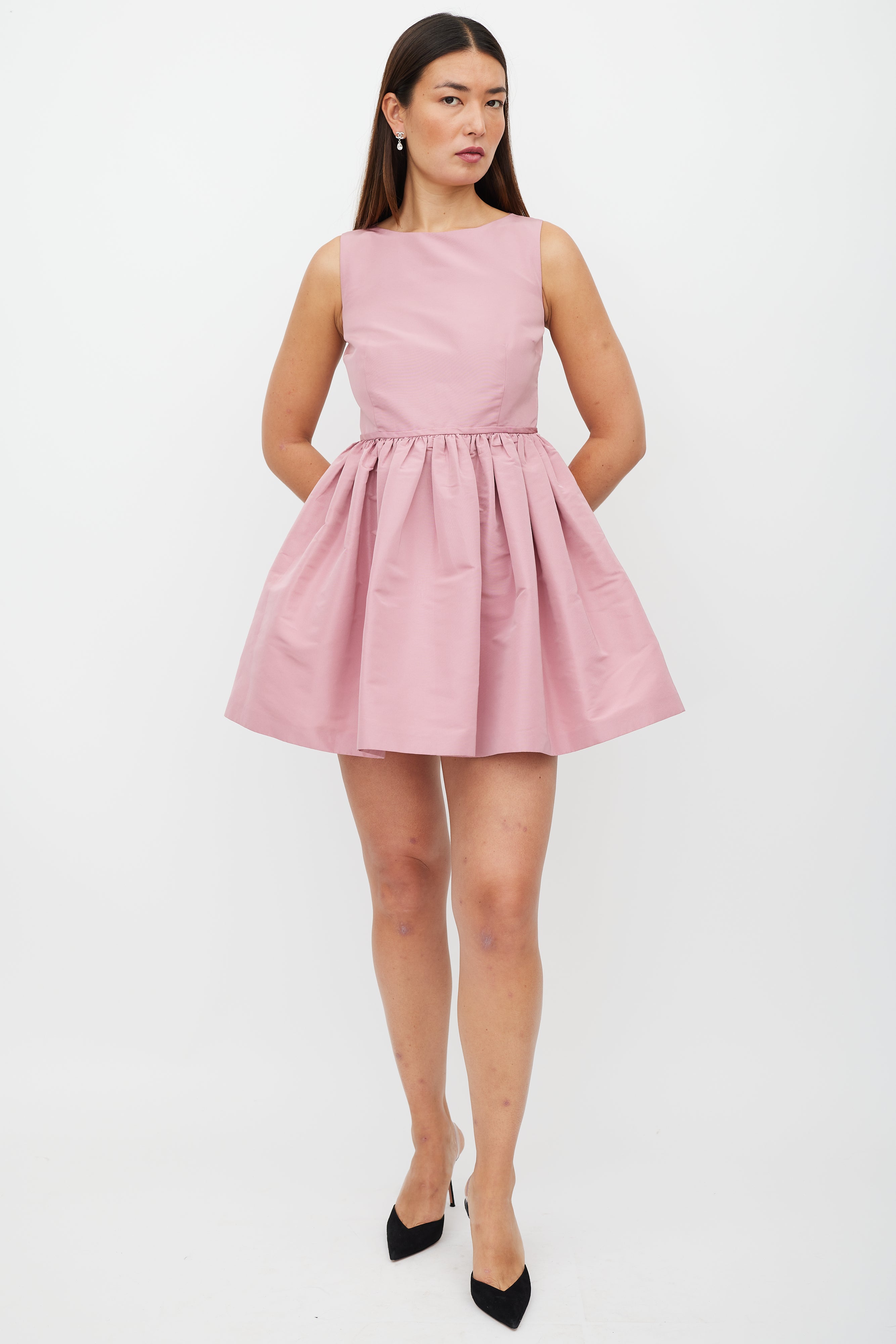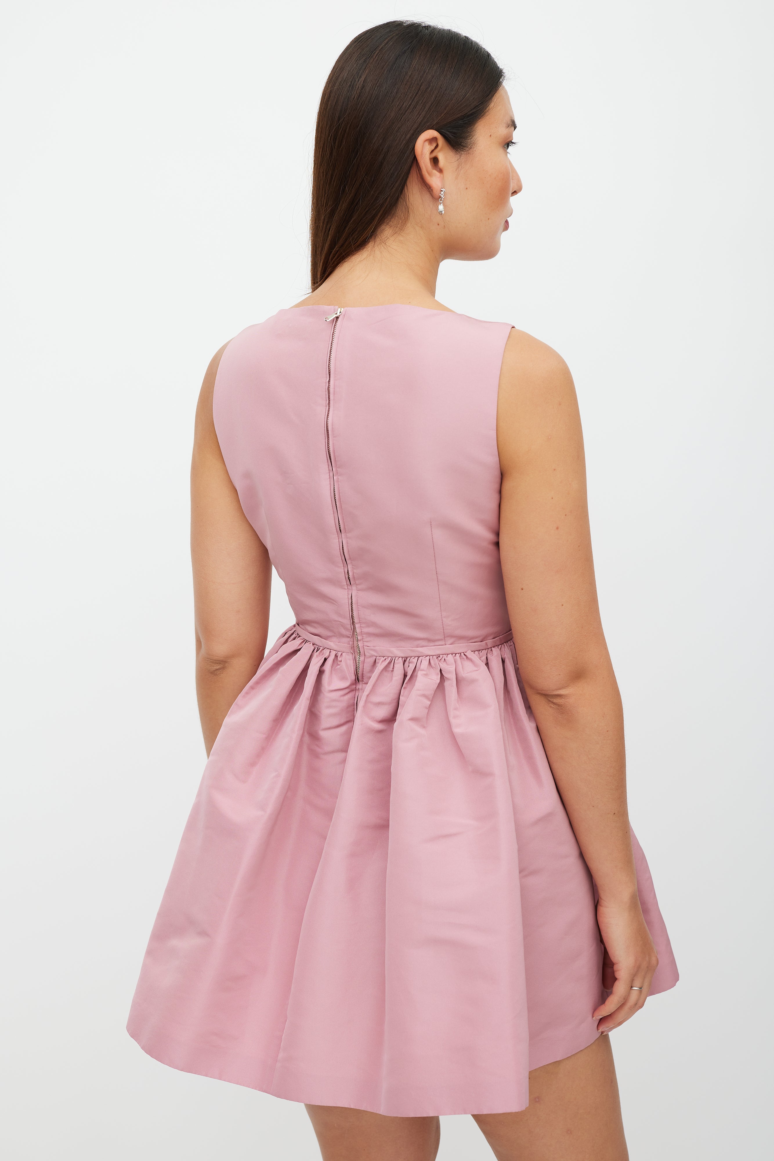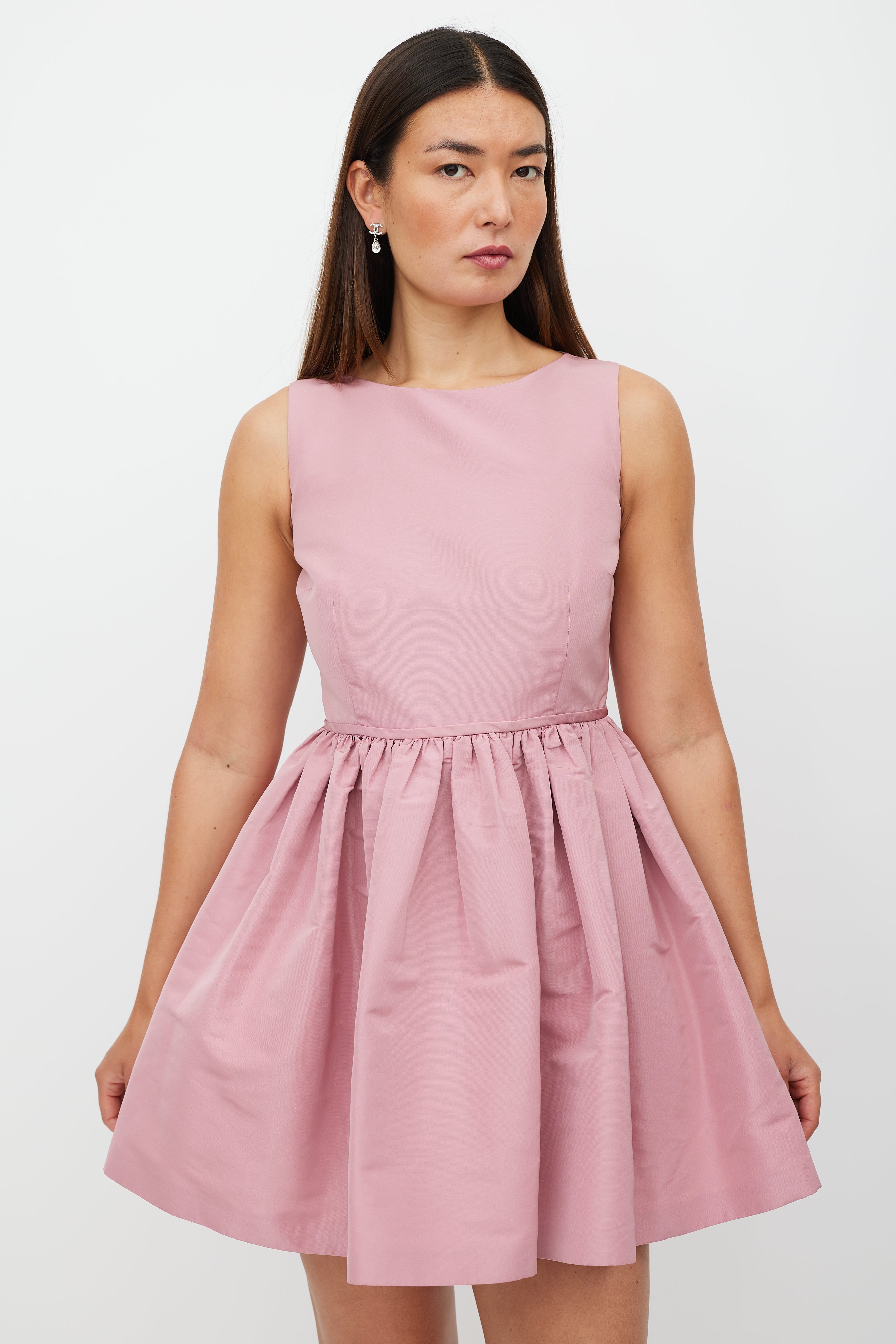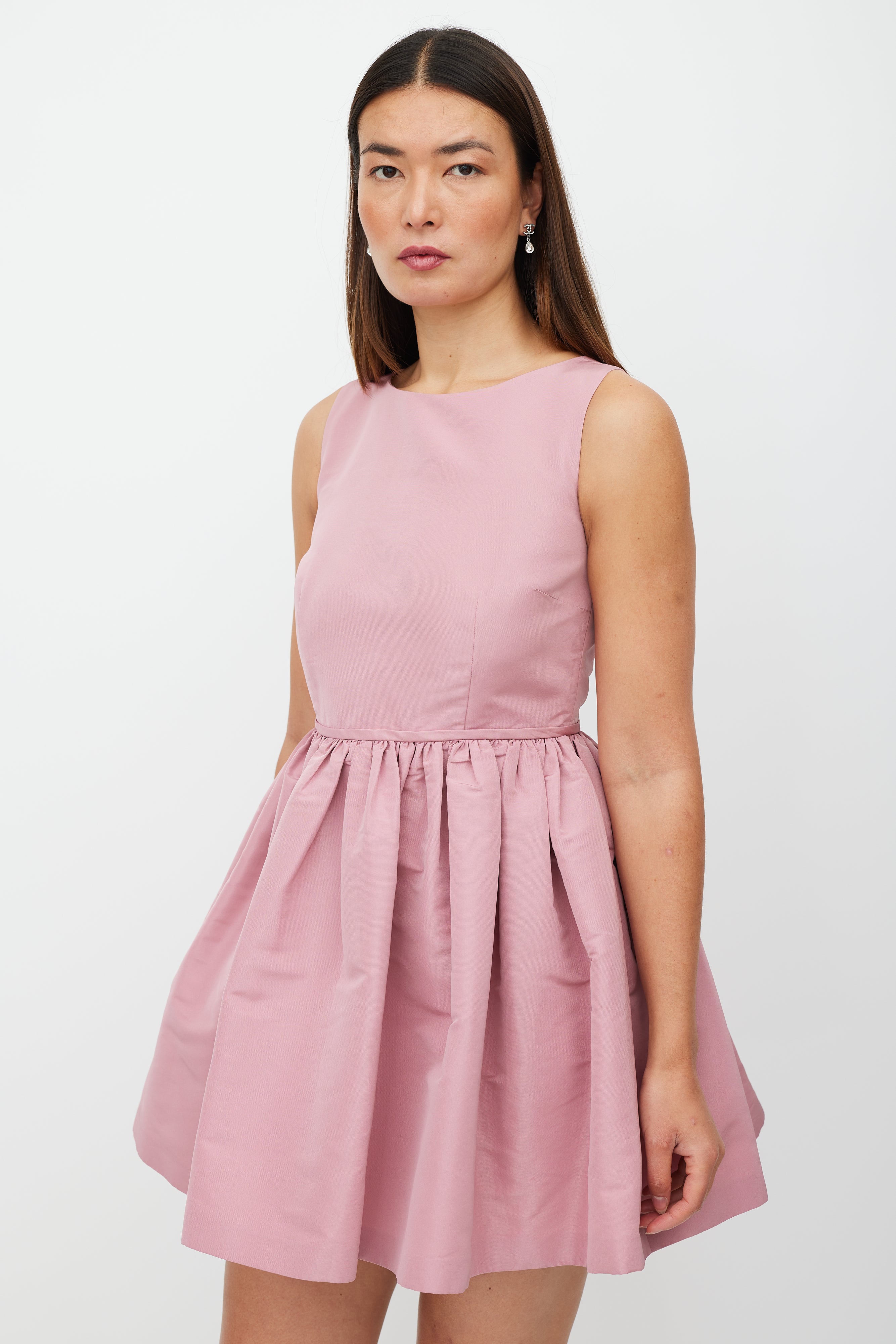 Pre-owned Red Valentino pink mini dress featuring a round neckline, sleeveless styling, darted bust, ruffled skirt, and zip closure at back. Lined.