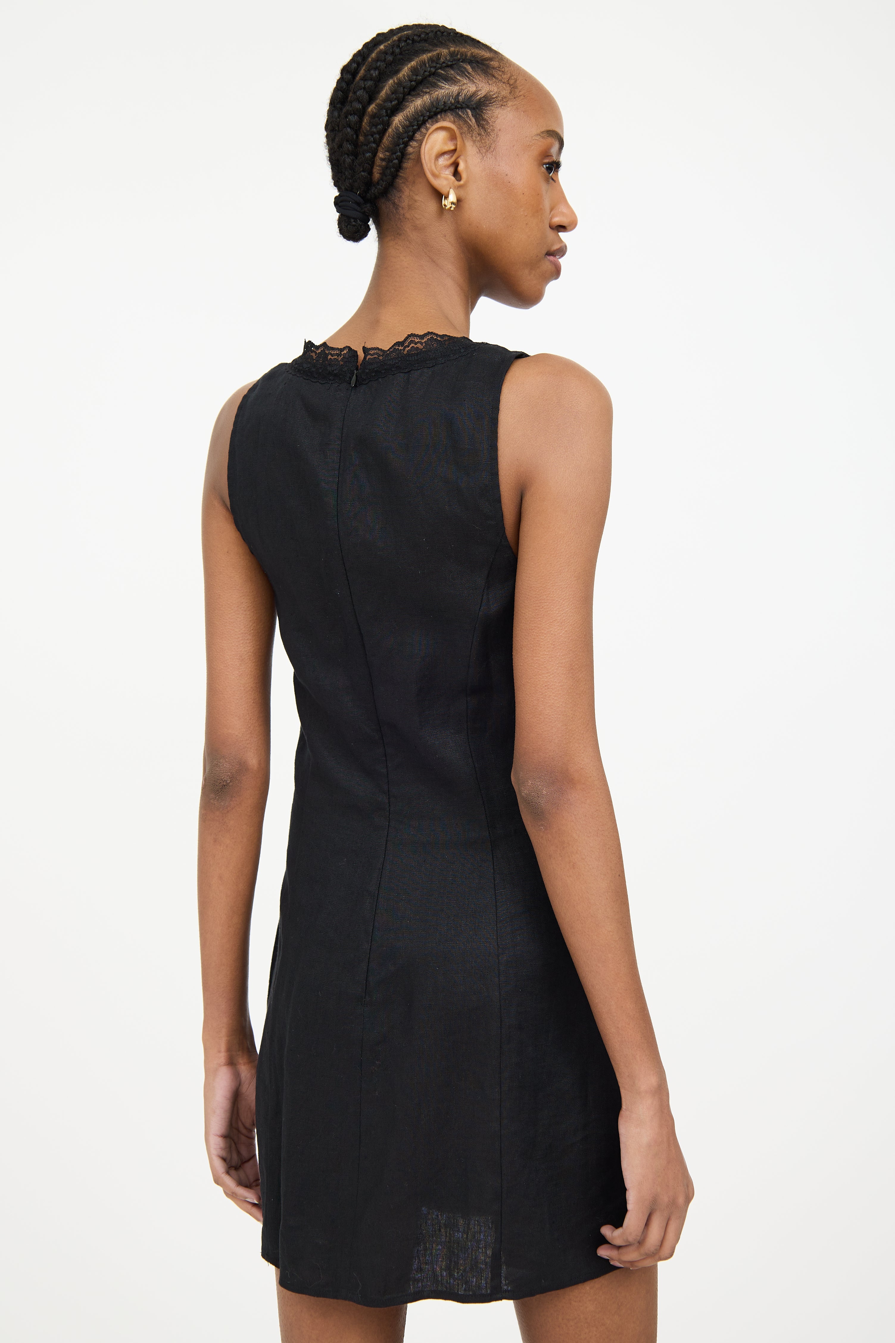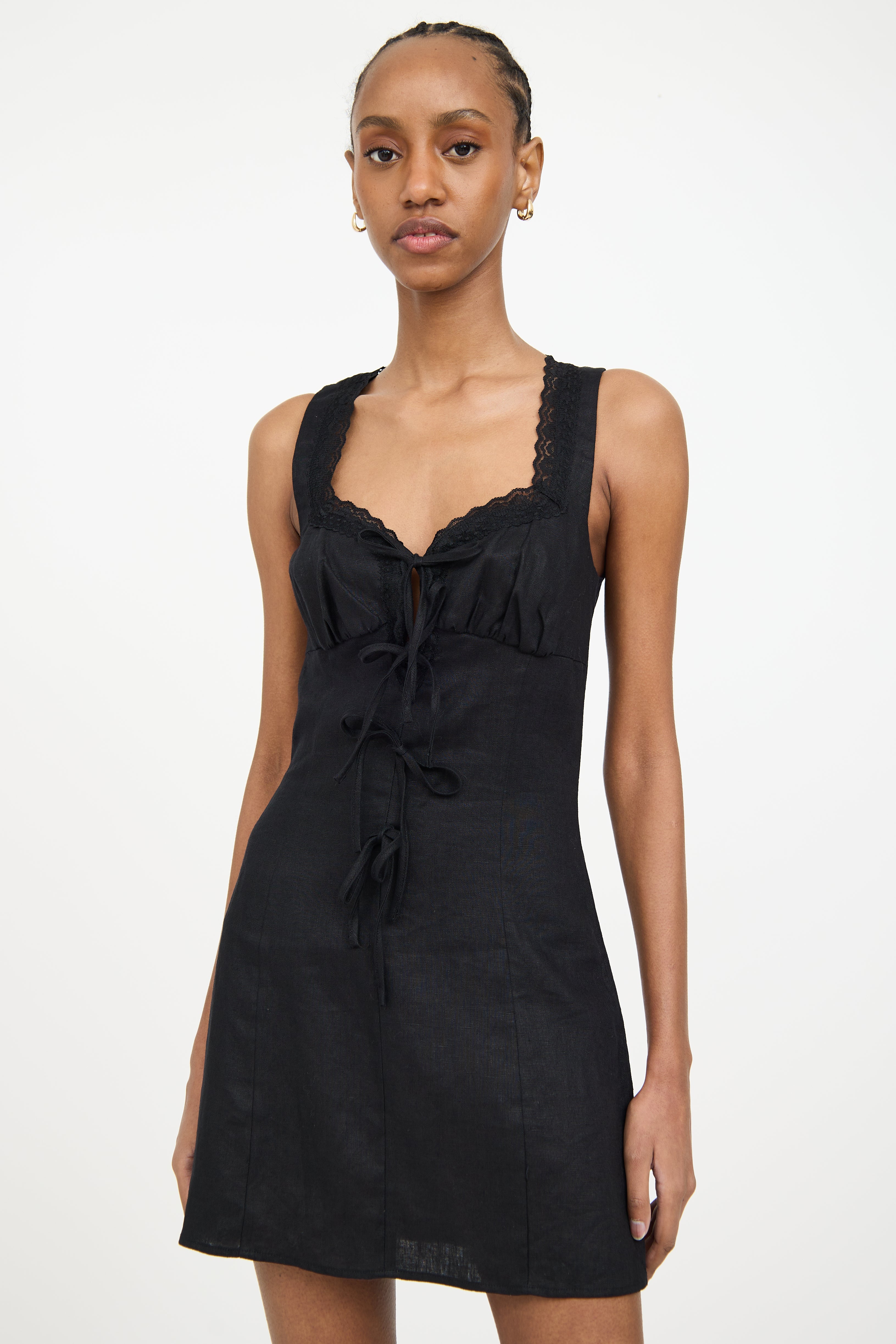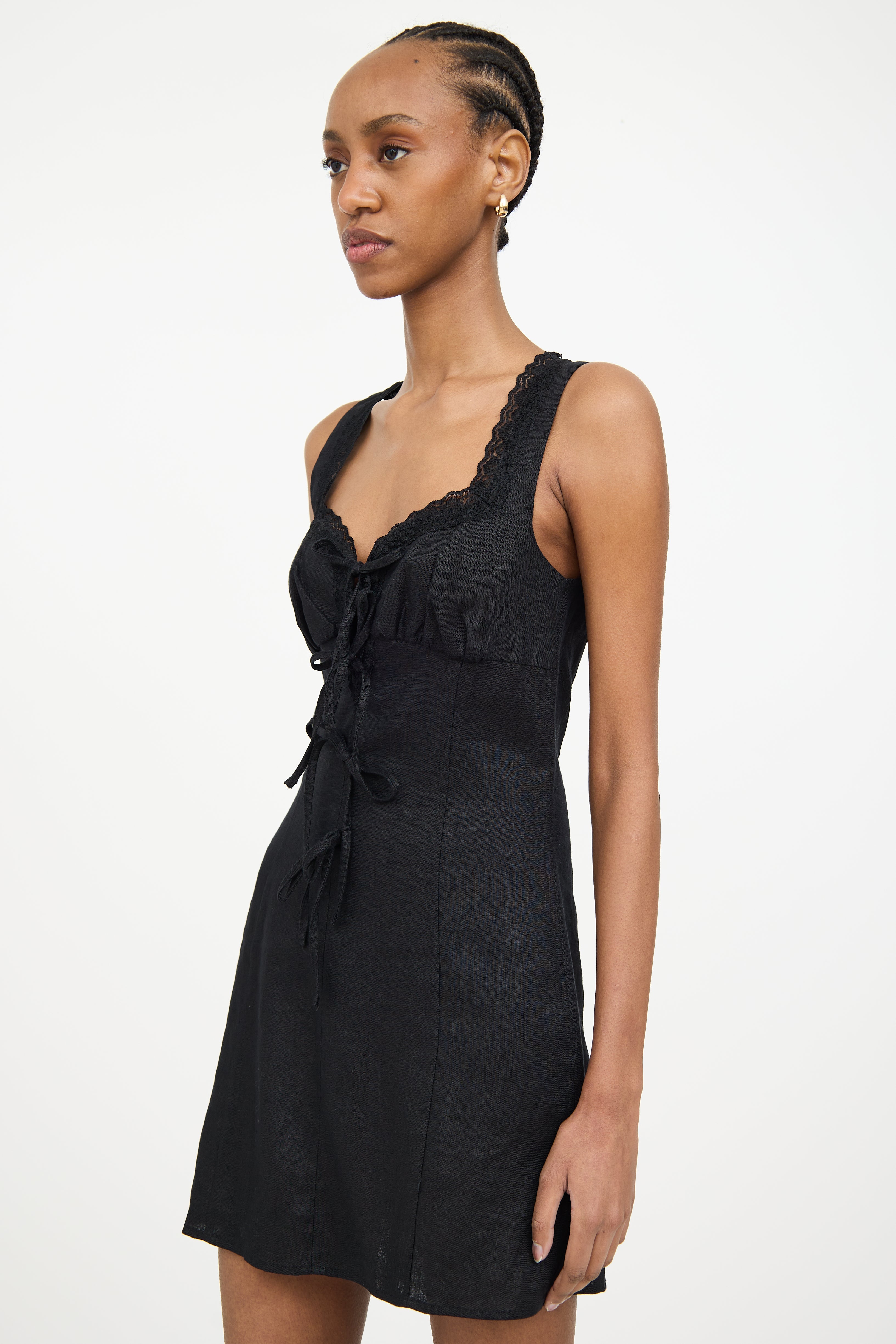 Pre-owned Reformation black linen sleeveless midi dress featuring a lace trim keyhole neckline, tie detail at front, and zip at back with hook and eye closure.