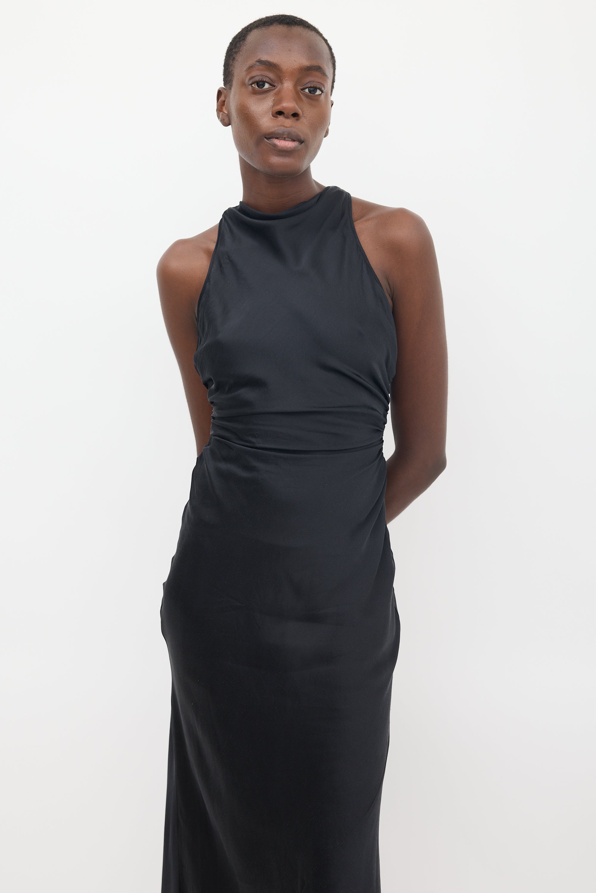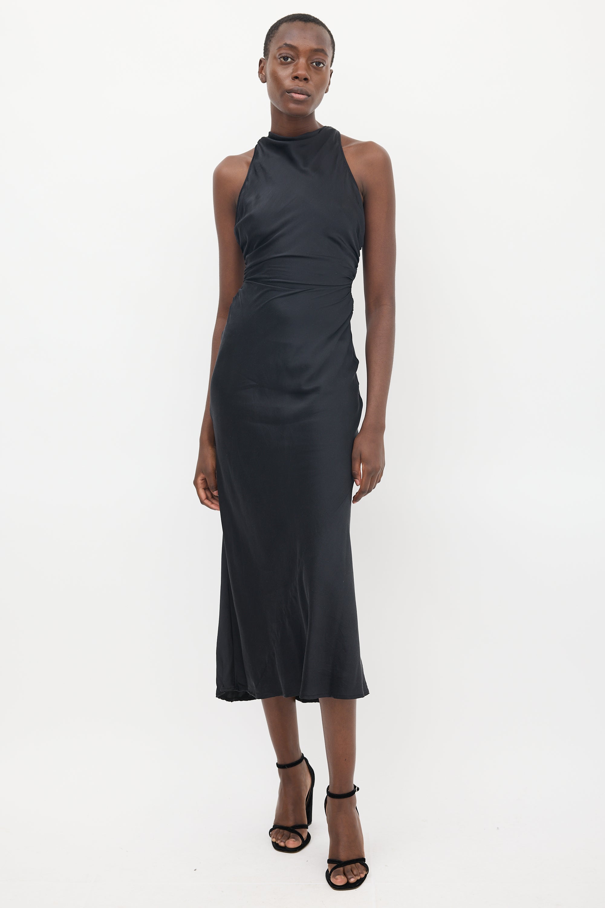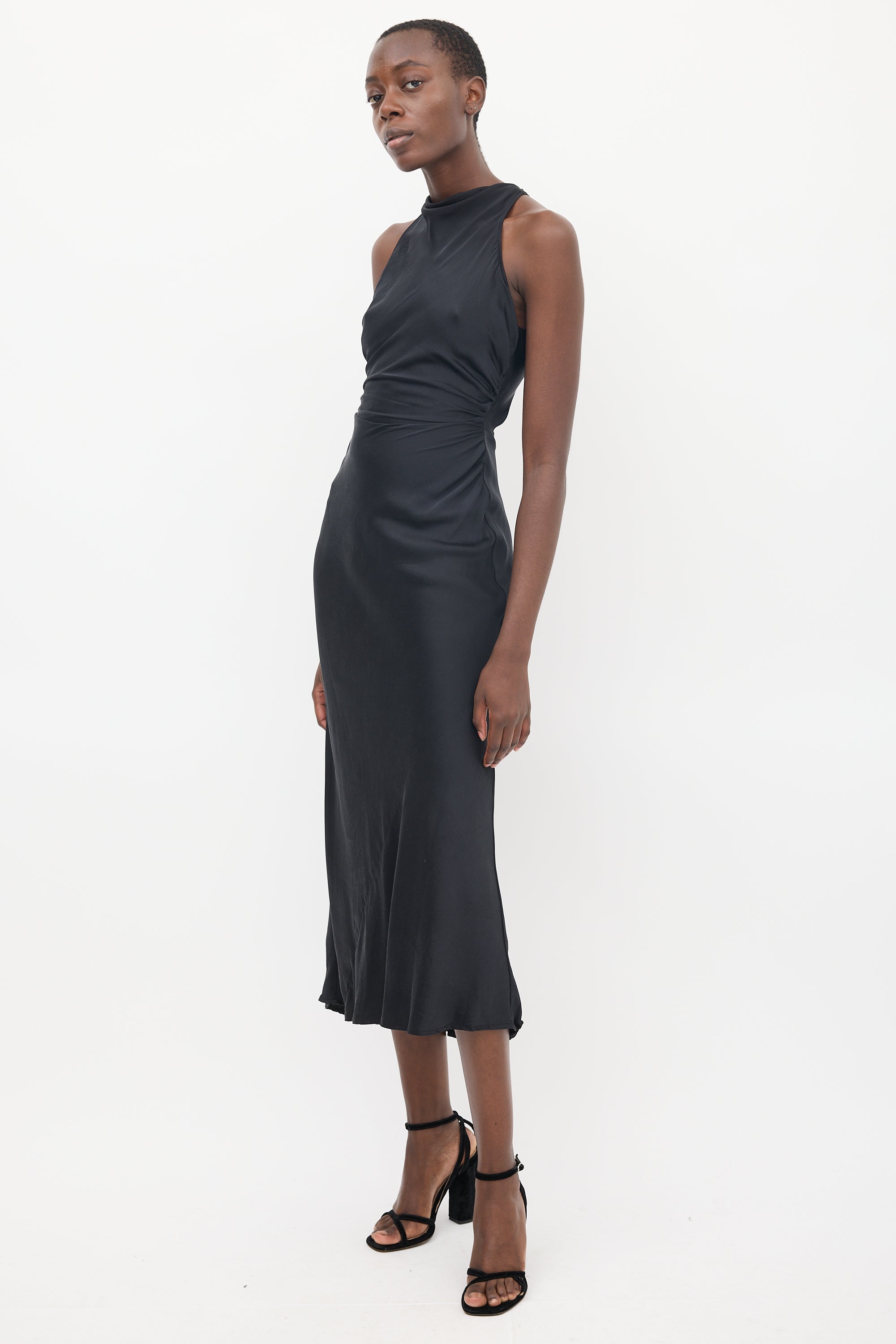 Pre-owned Reformation black silk Cassette sleeveless dress featuring cowl neck, side ruching, criss cross strap at back, and concealed back zip closure. Unlined.