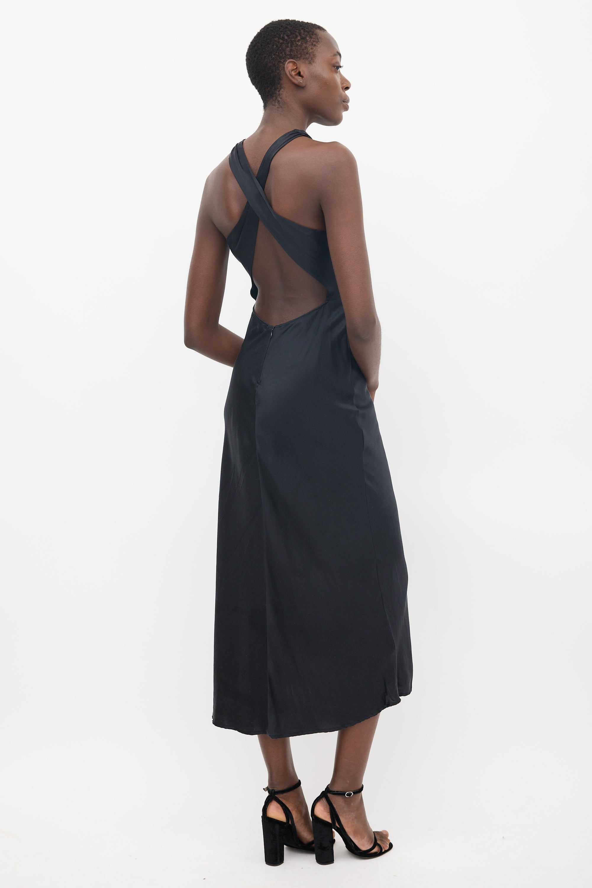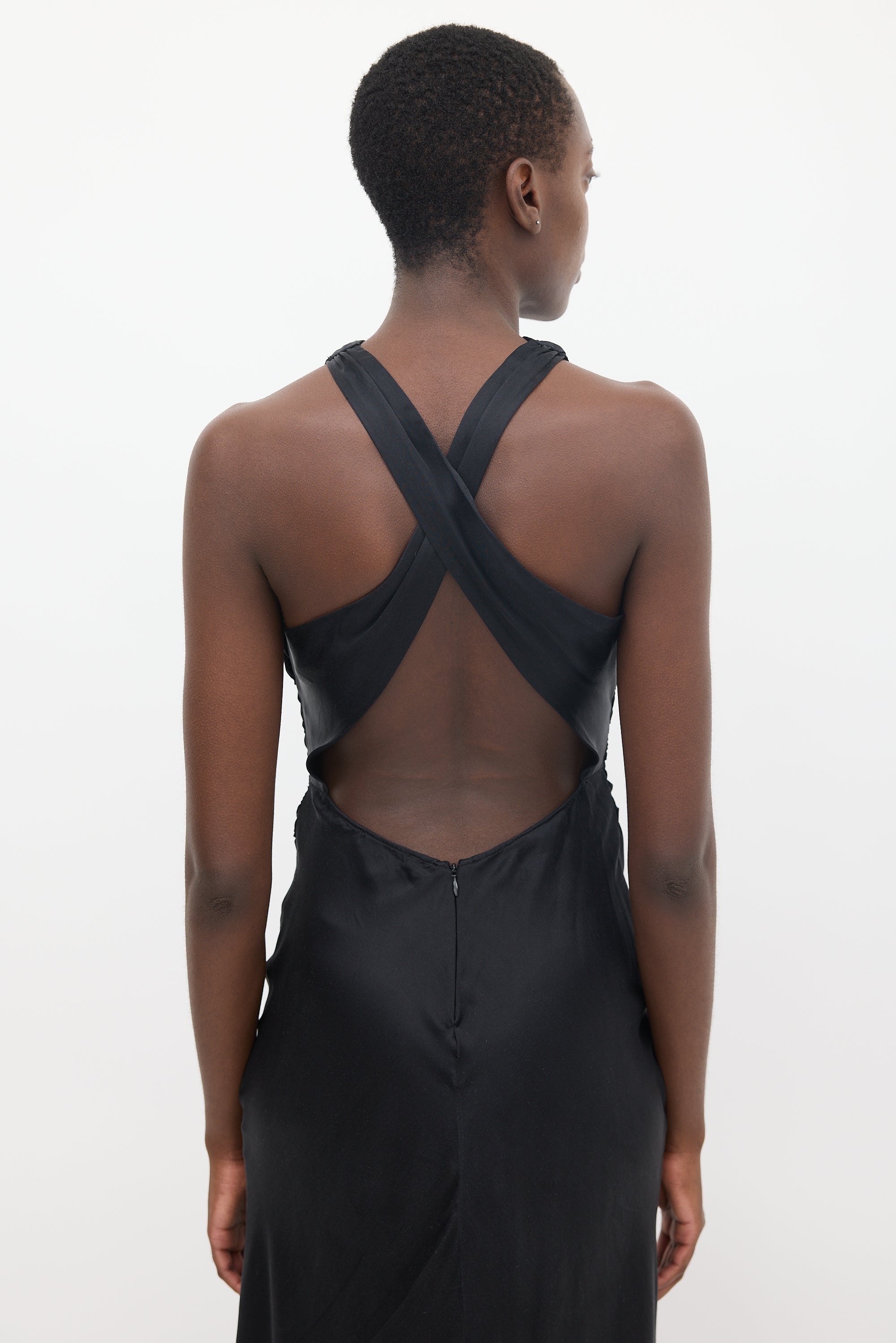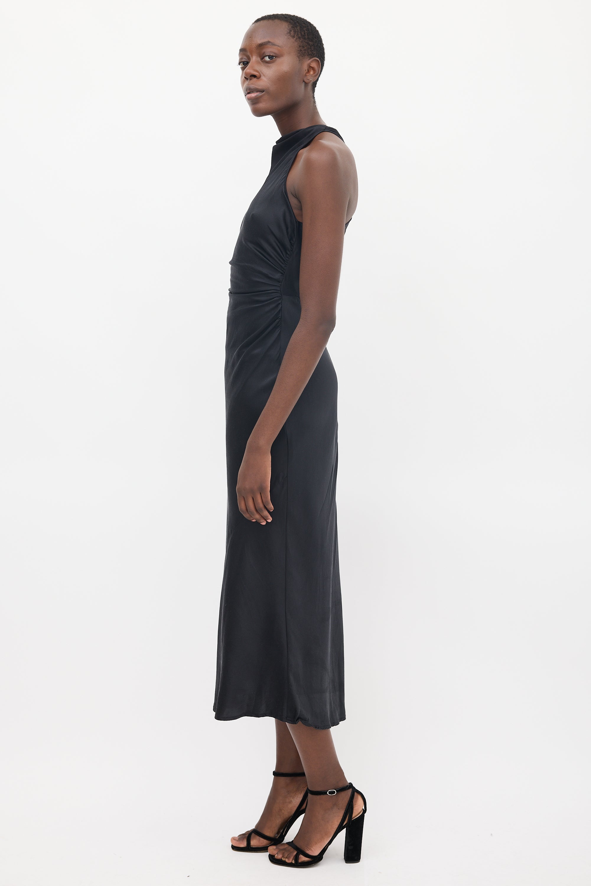 Pre-owned Reformation black silk Cassette sleeveless dress featuring cowl neck, side ruching, criss cross strap at back, and concealed back zip closure. Unlined.