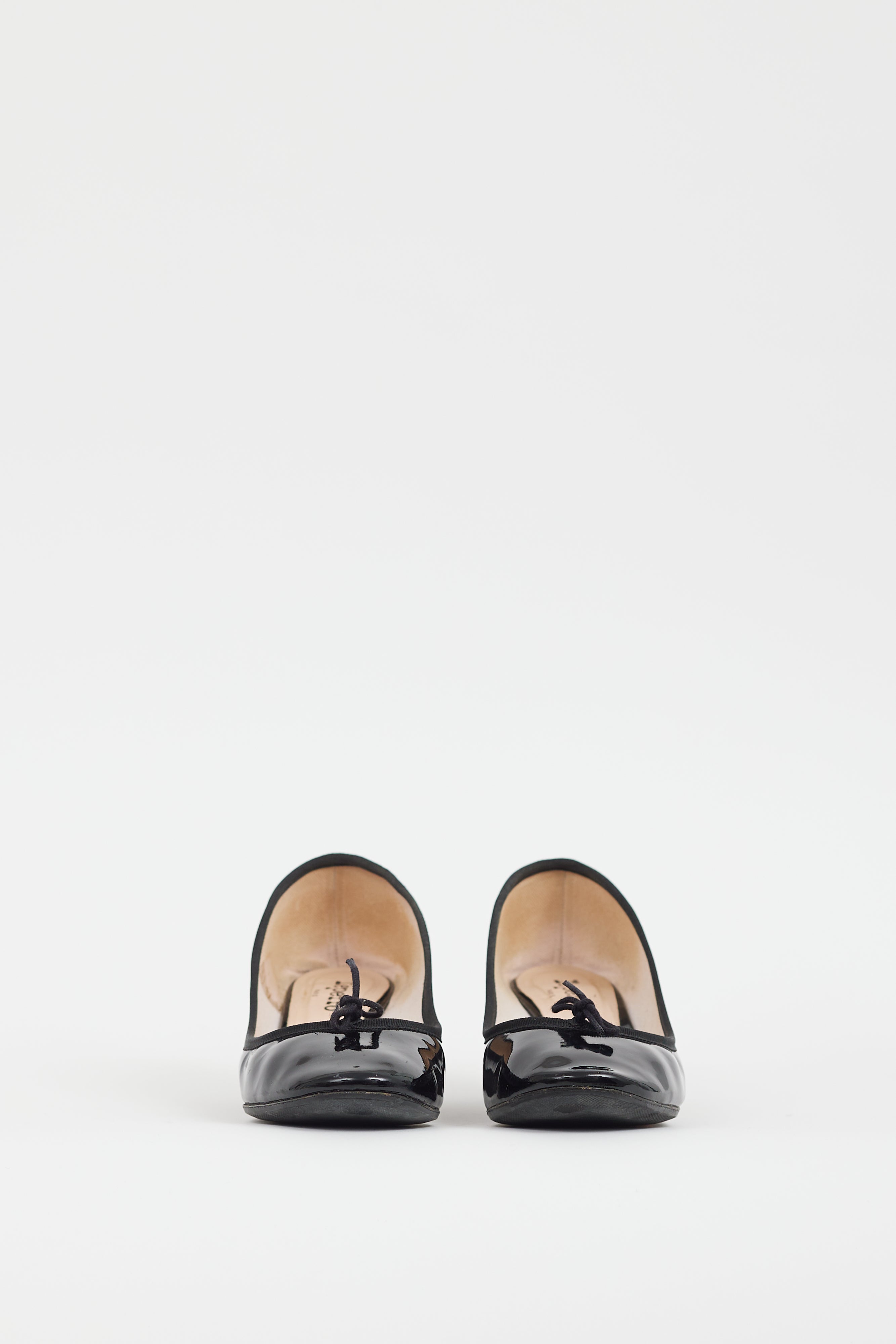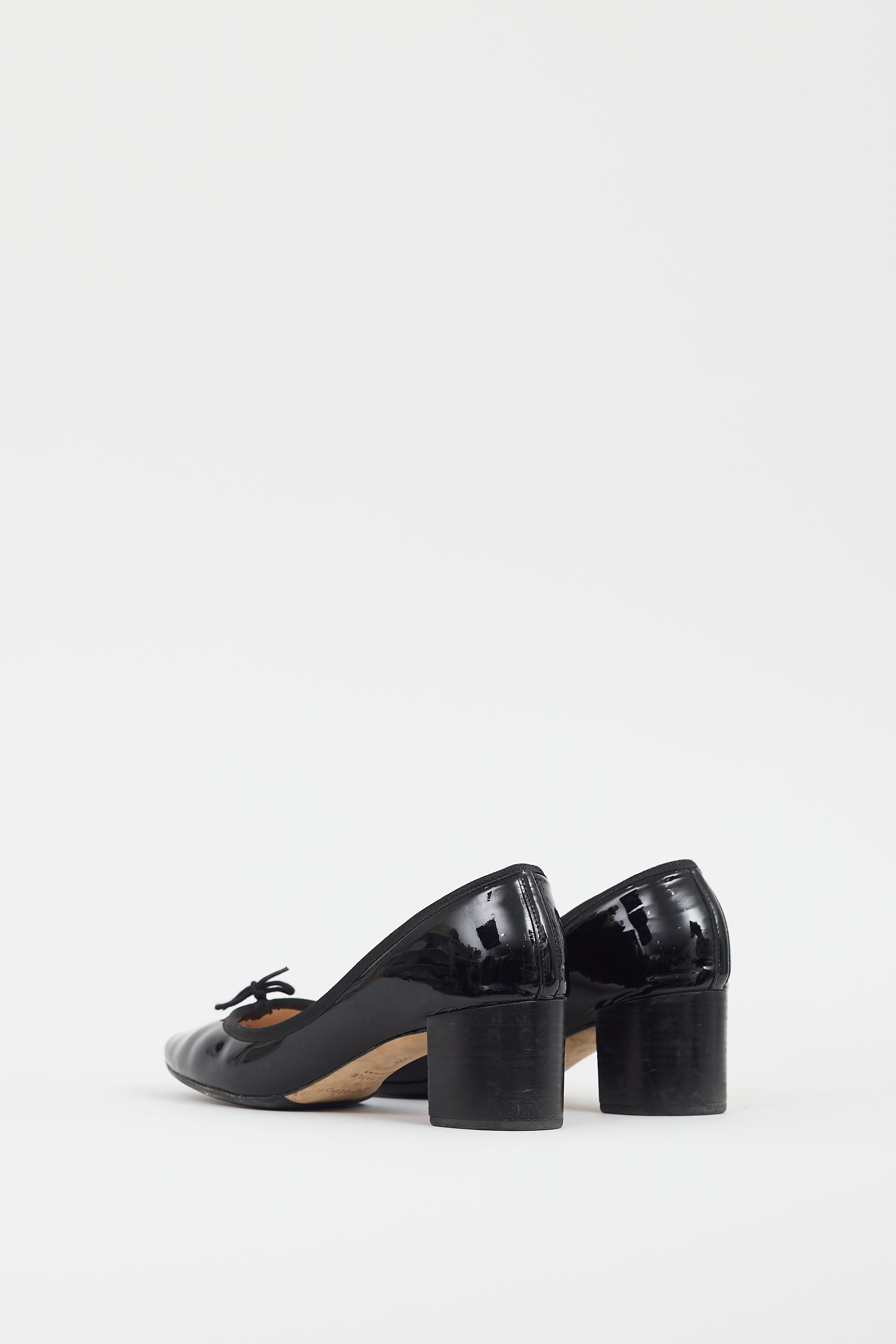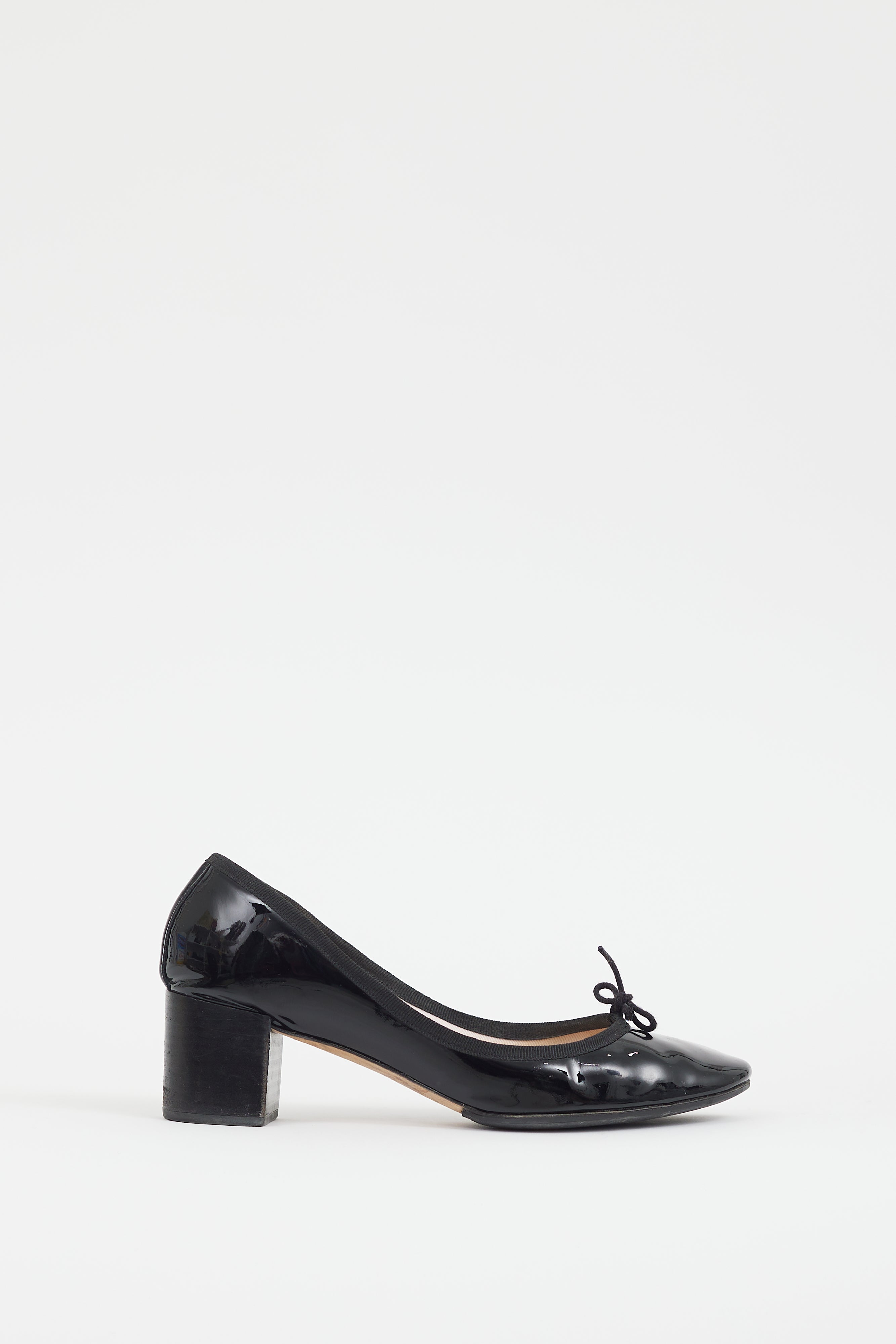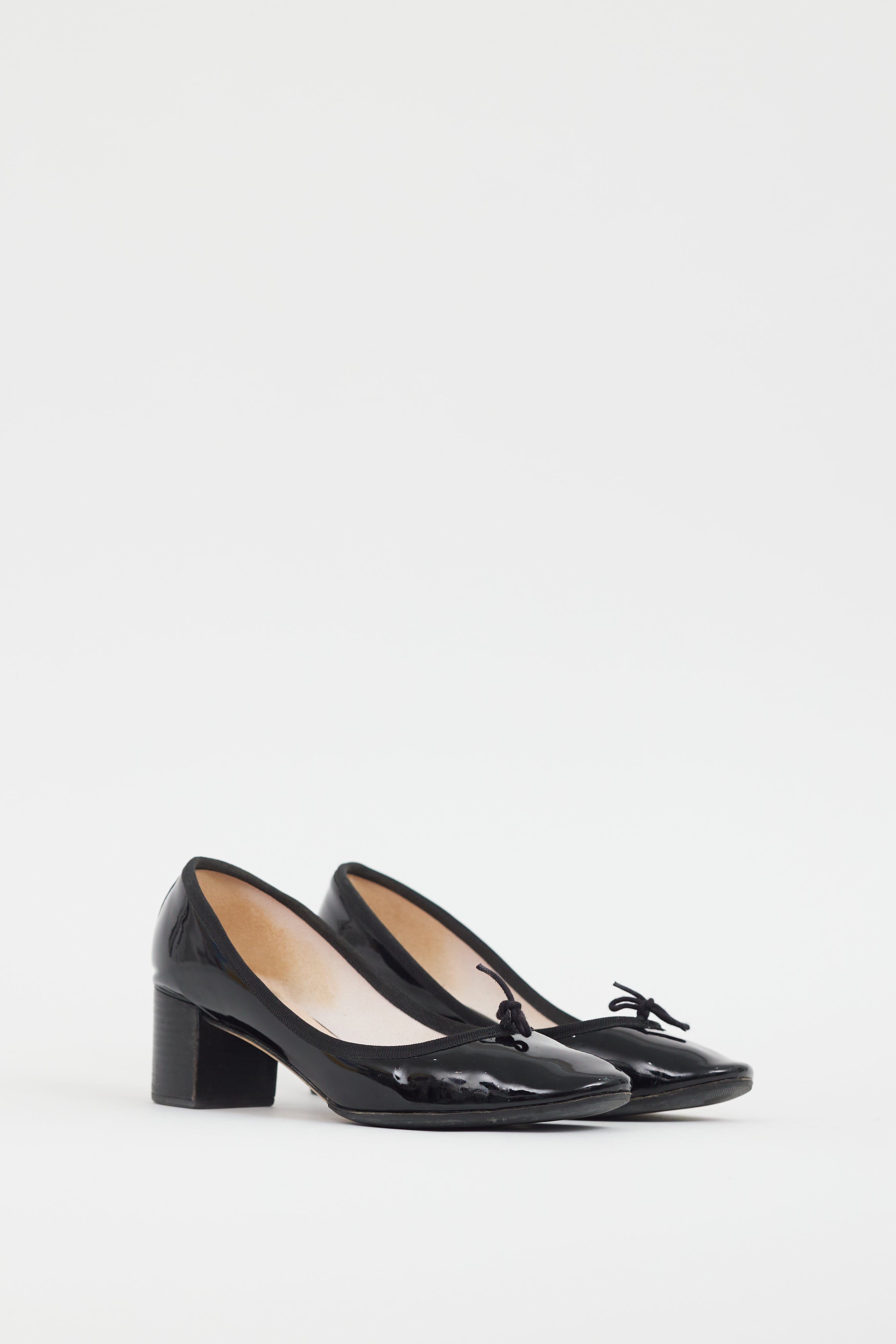 Pre-owned Repetto black patent Camille leather ballet heels featuring a stacked block wooden heel, grosgrain trim at collar, and cotton twill lining. Has been resoled by previous owner.
