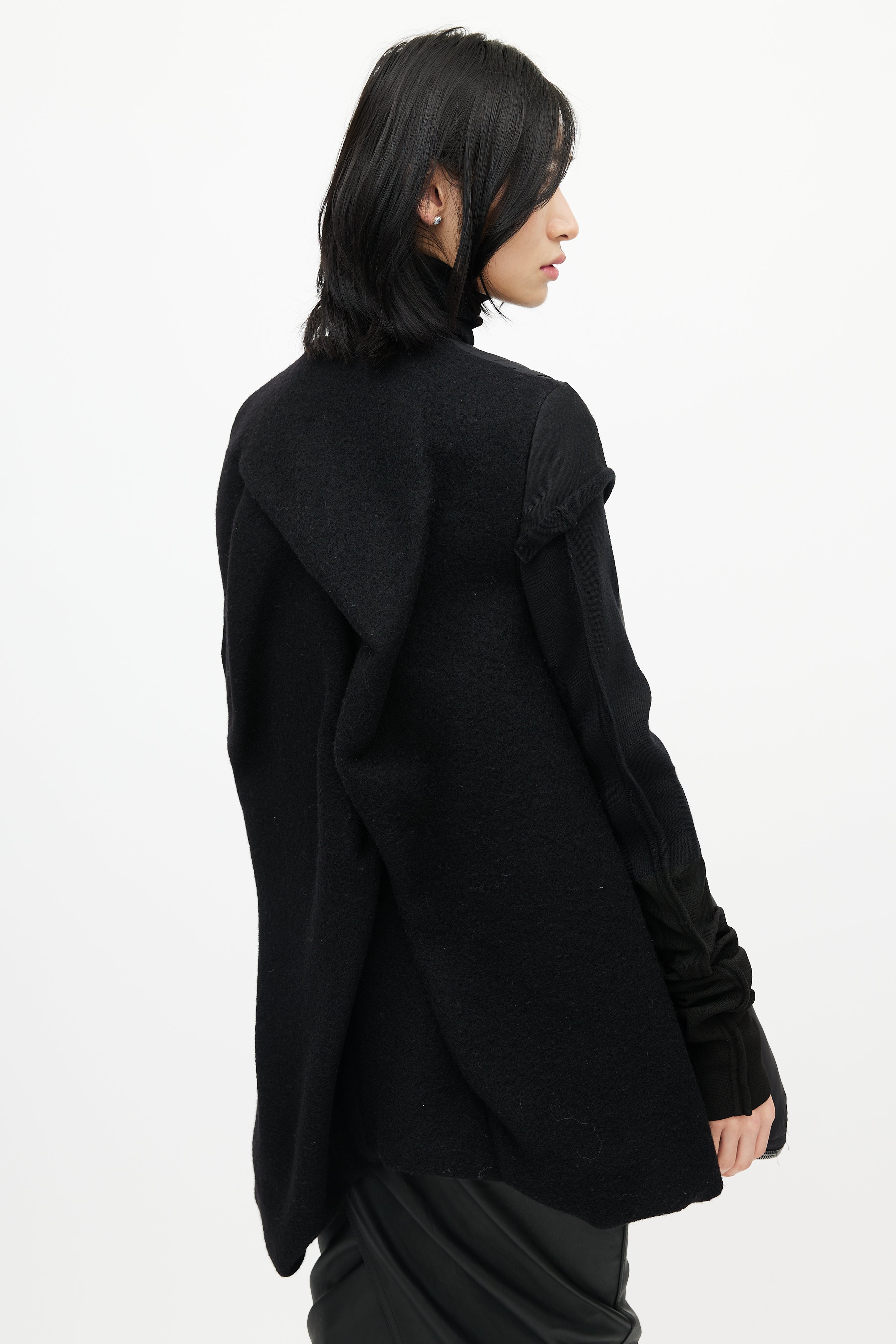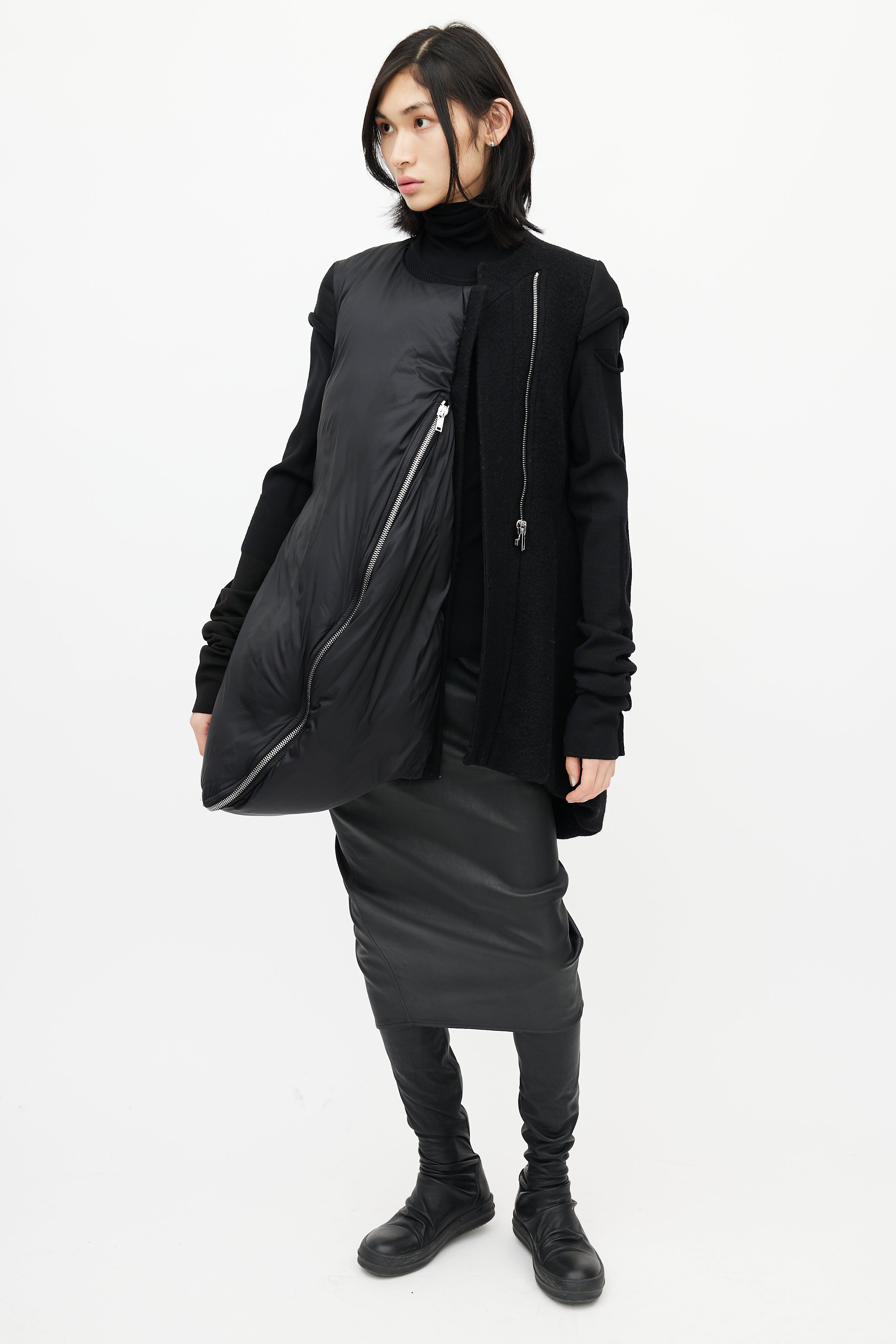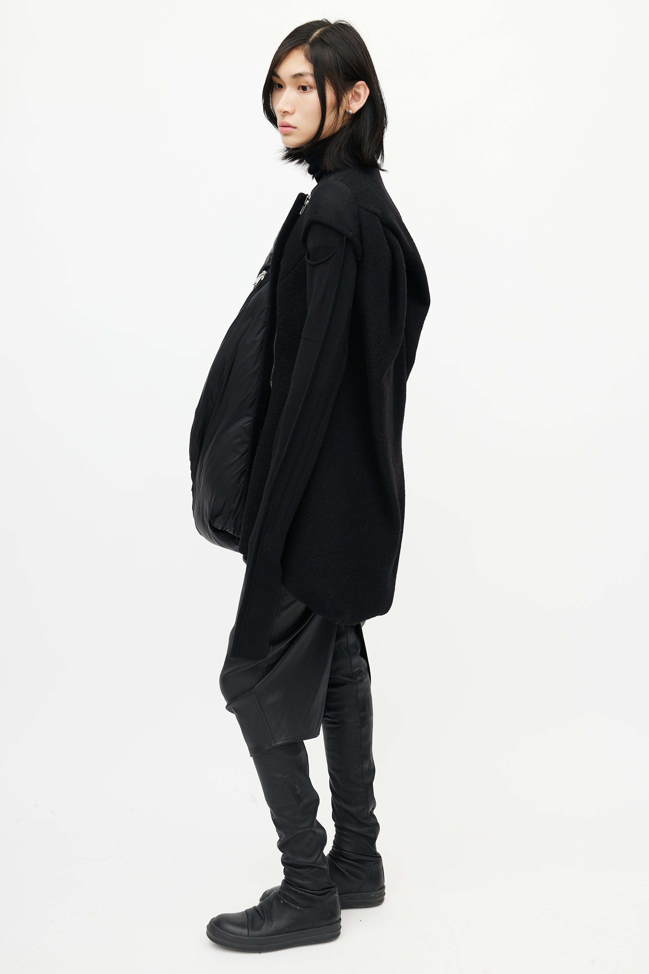 Pre-owned Rick Owens black wool jacket featuring an oversized down fill pocket at front, round neckline, gathered detail at back, and asymmetrical zip closure. Lined.