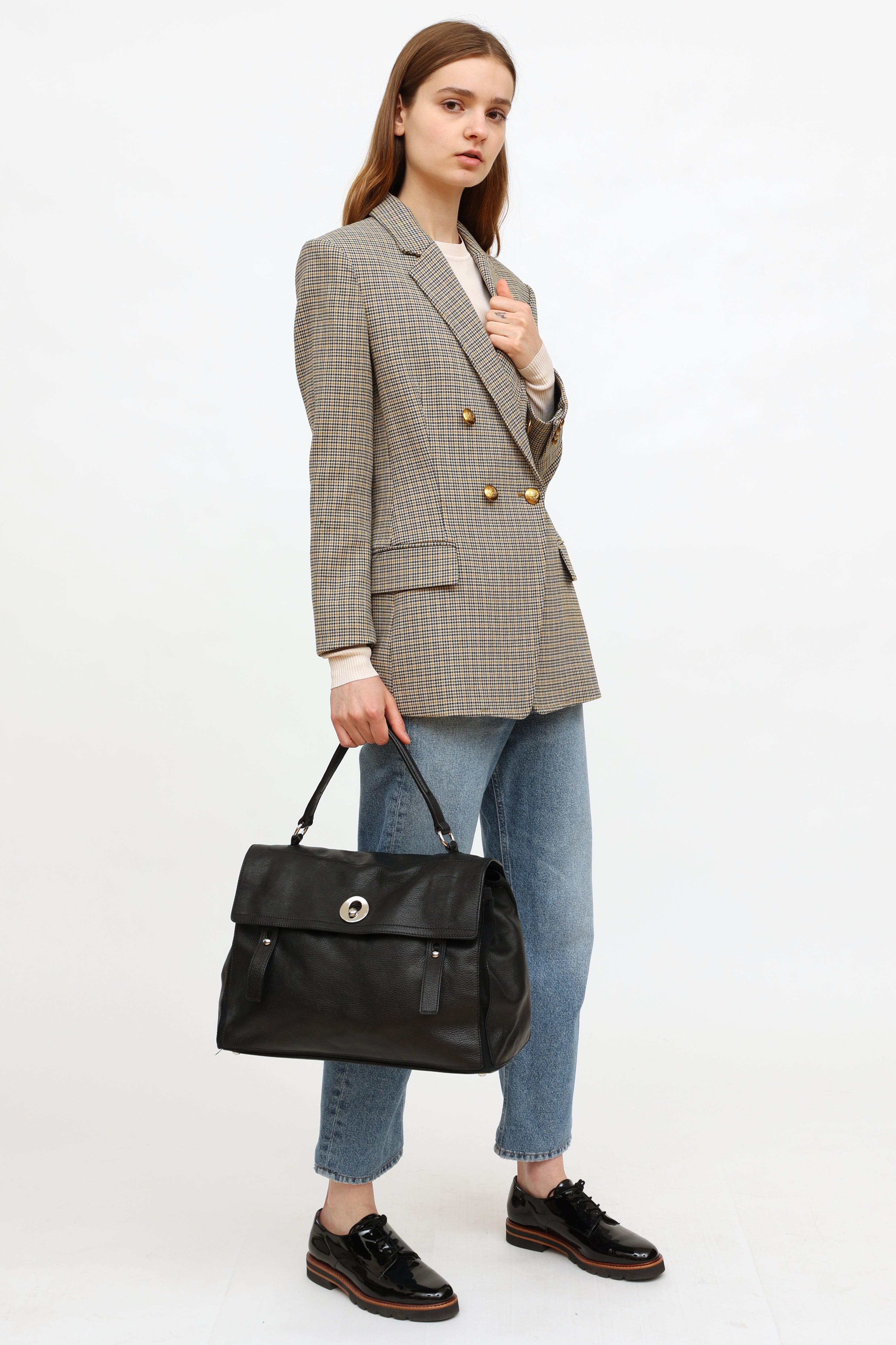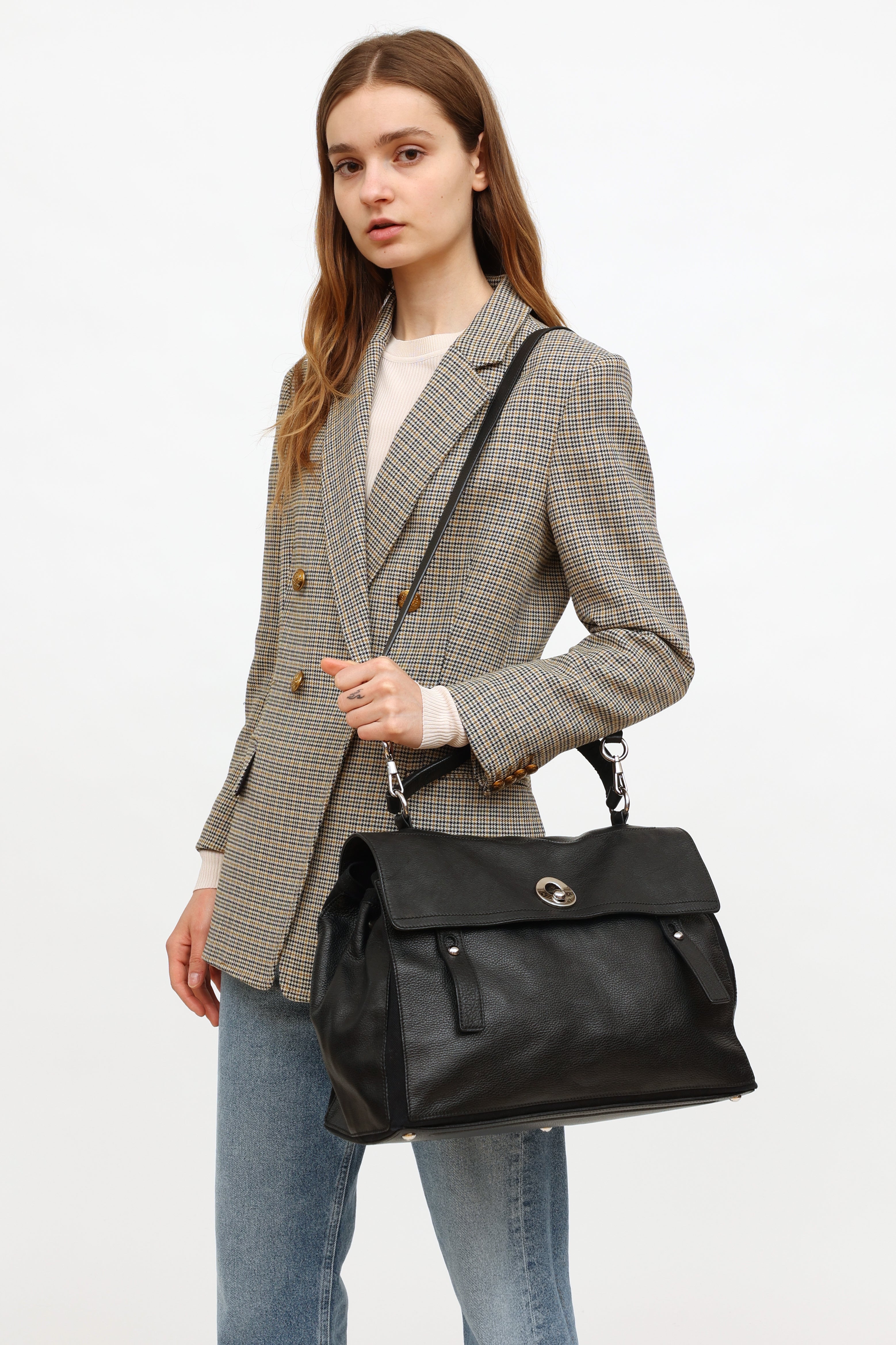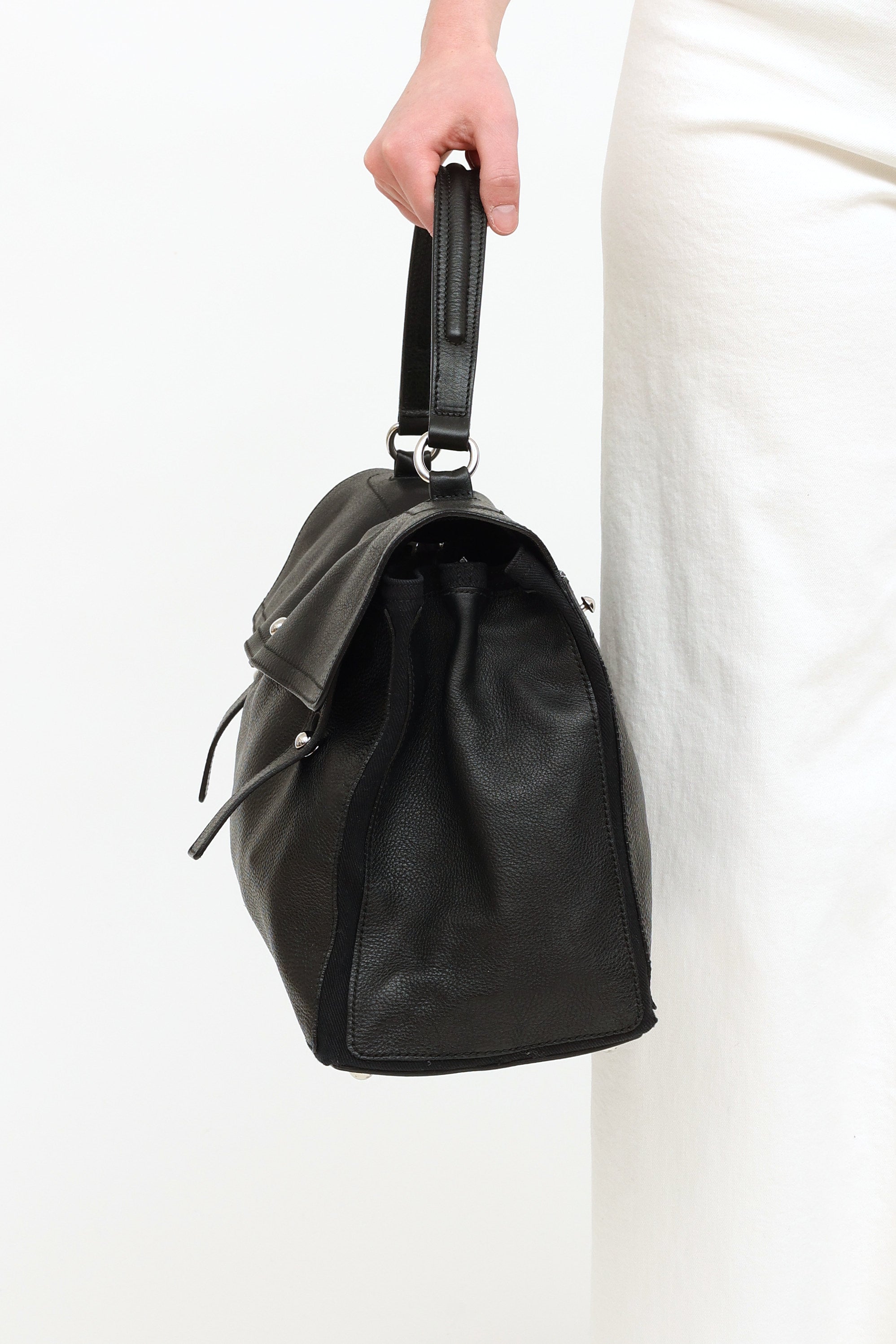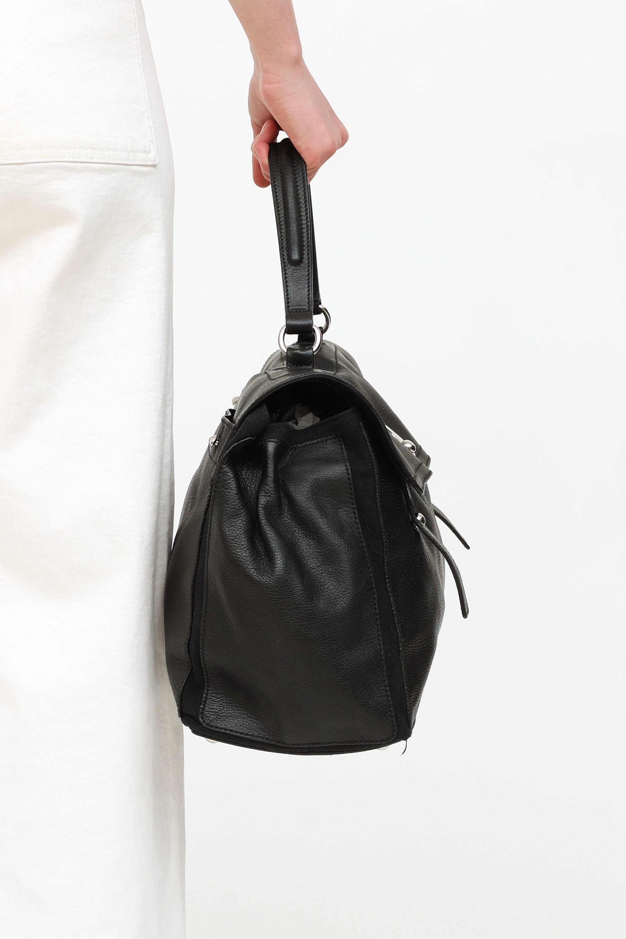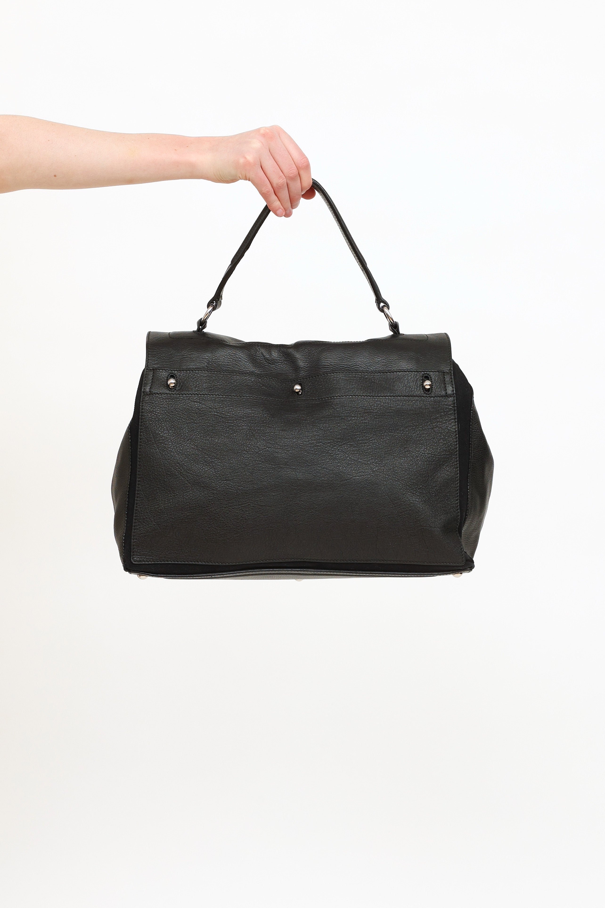Pre-owned Yves Saint Laurent black Muse Two handbag from the 2015 Collection by Heidi Slimane featuring leather & canvas material, silver tone hardware, single flat handle, back exterior pocket and push lock closure. Removable flat shoulder strap, single interior pocket with zip top closure and protective feet at base.