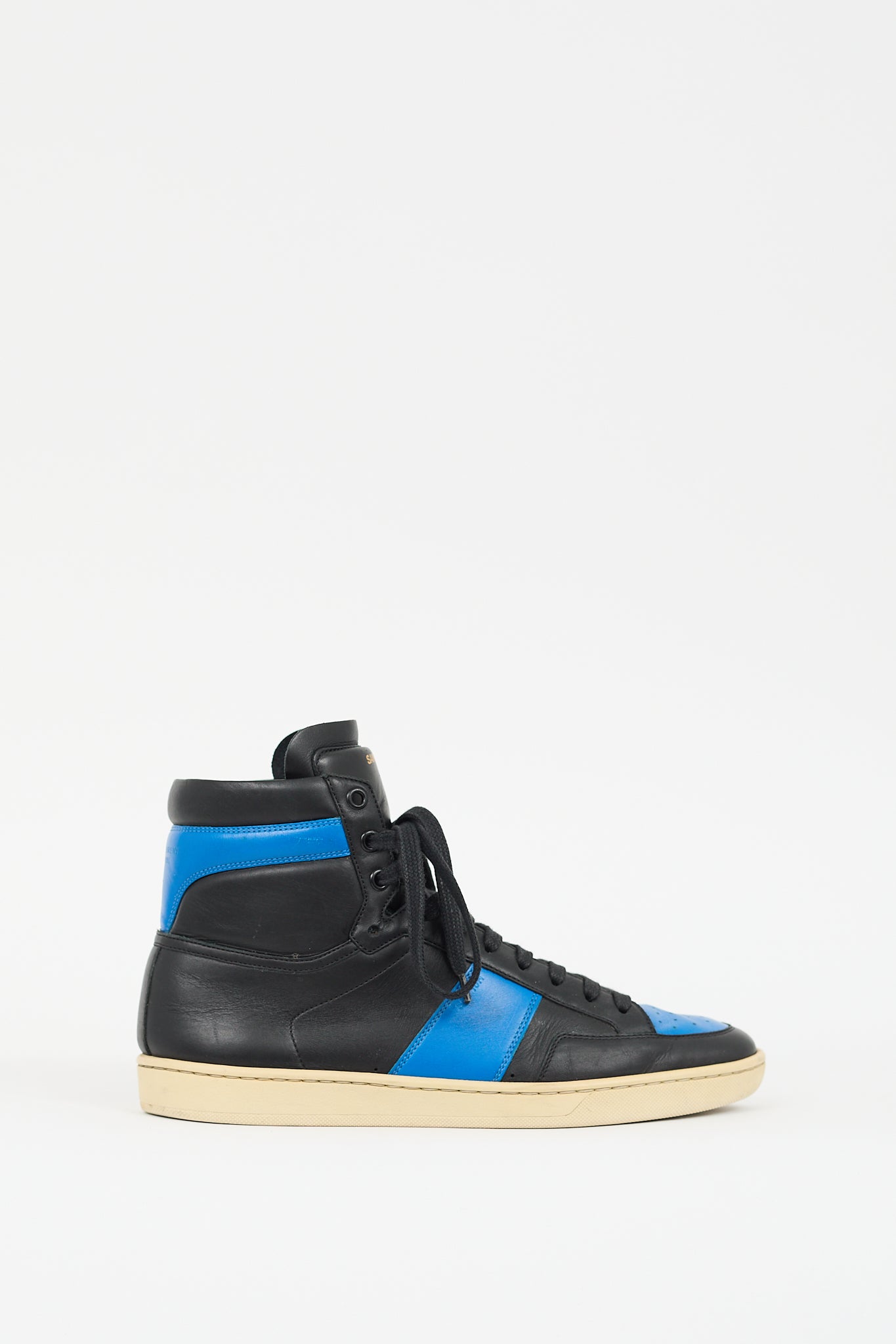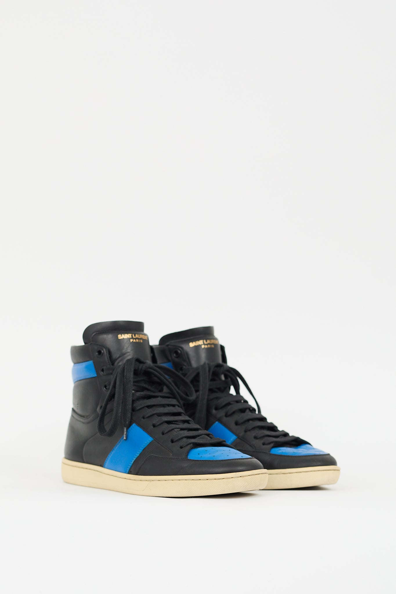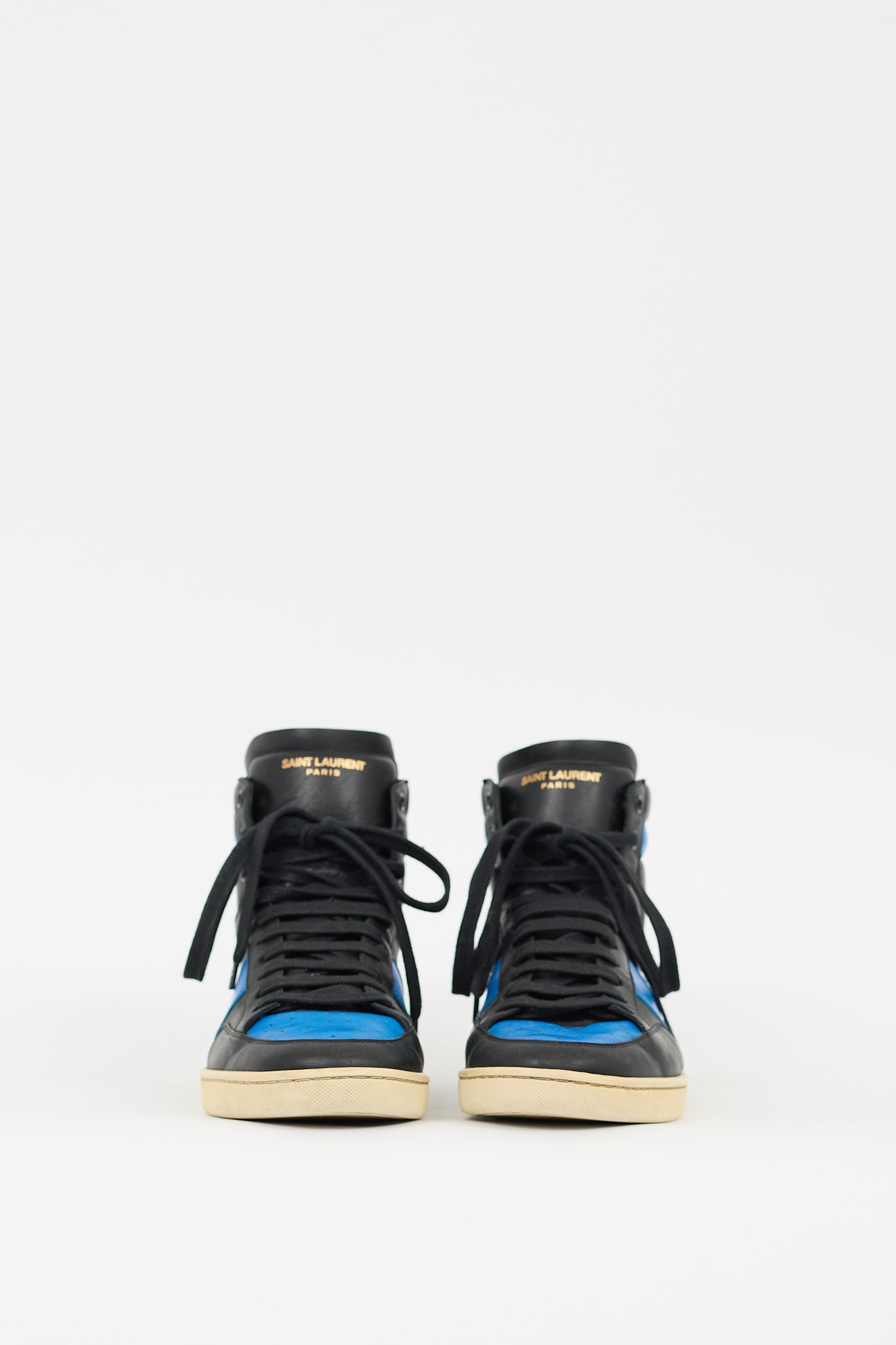 Pre-owned Saint Laurent black and blue leather SL10H sneakers featuring rounded toe, lace up front, gold stamped logo at tongue, and rubber outsole. Comes with extra set of laces.