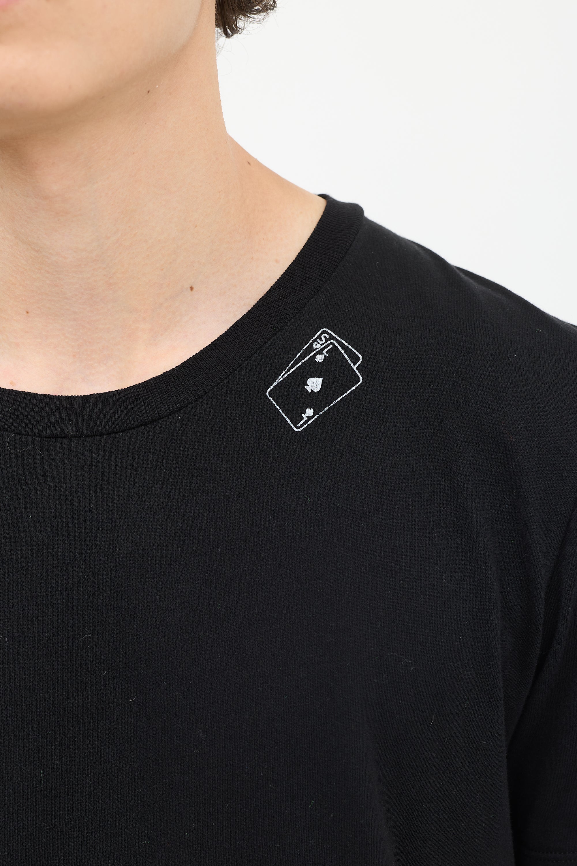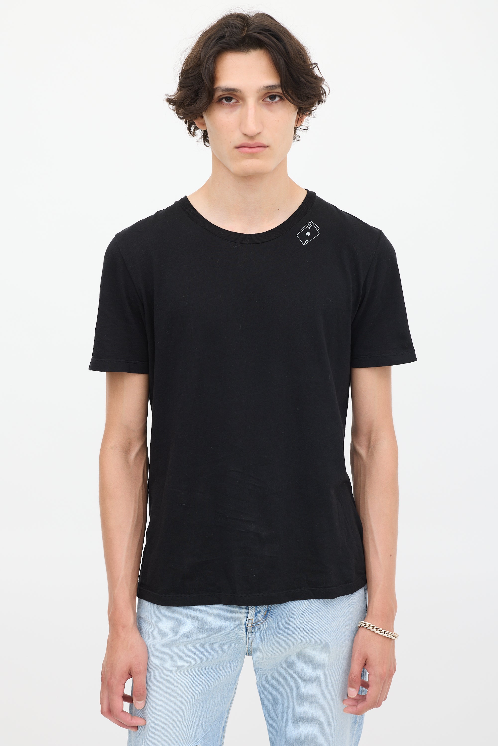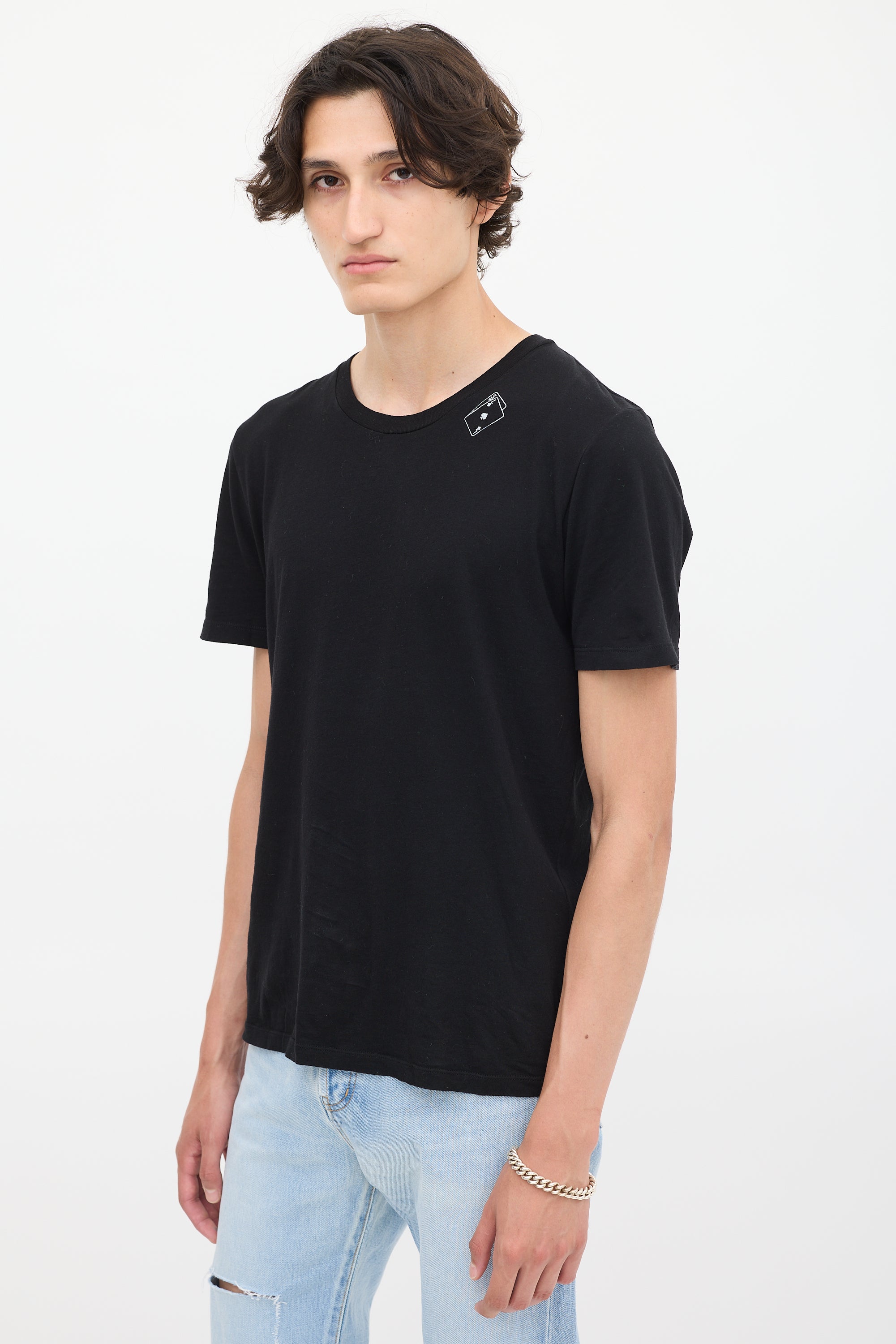 Pre-owned Saint Laurent black cotton T-shirt featuring a round neck, white playing card motif graphic at left neck, distressed hem detail, and short sleeves.