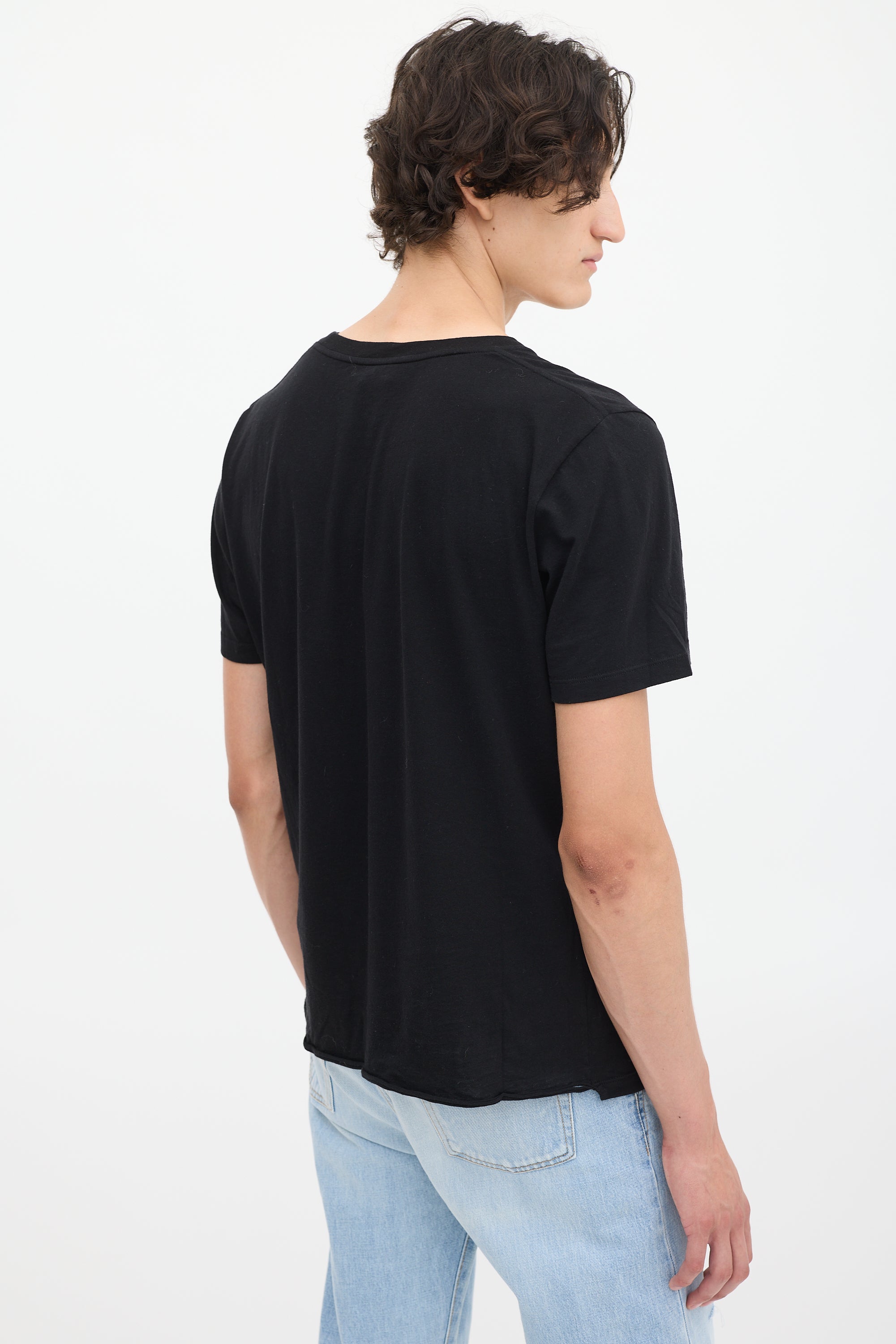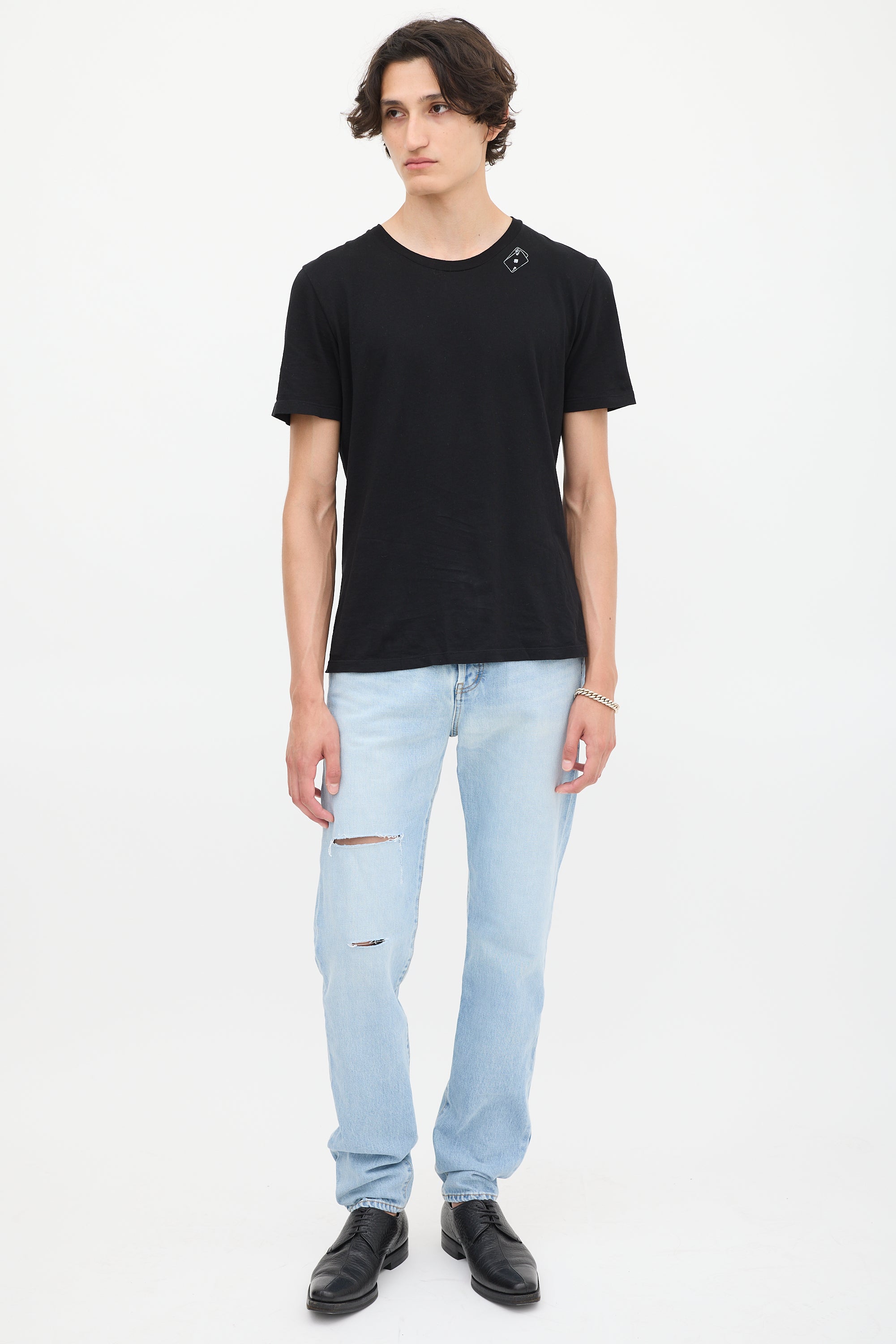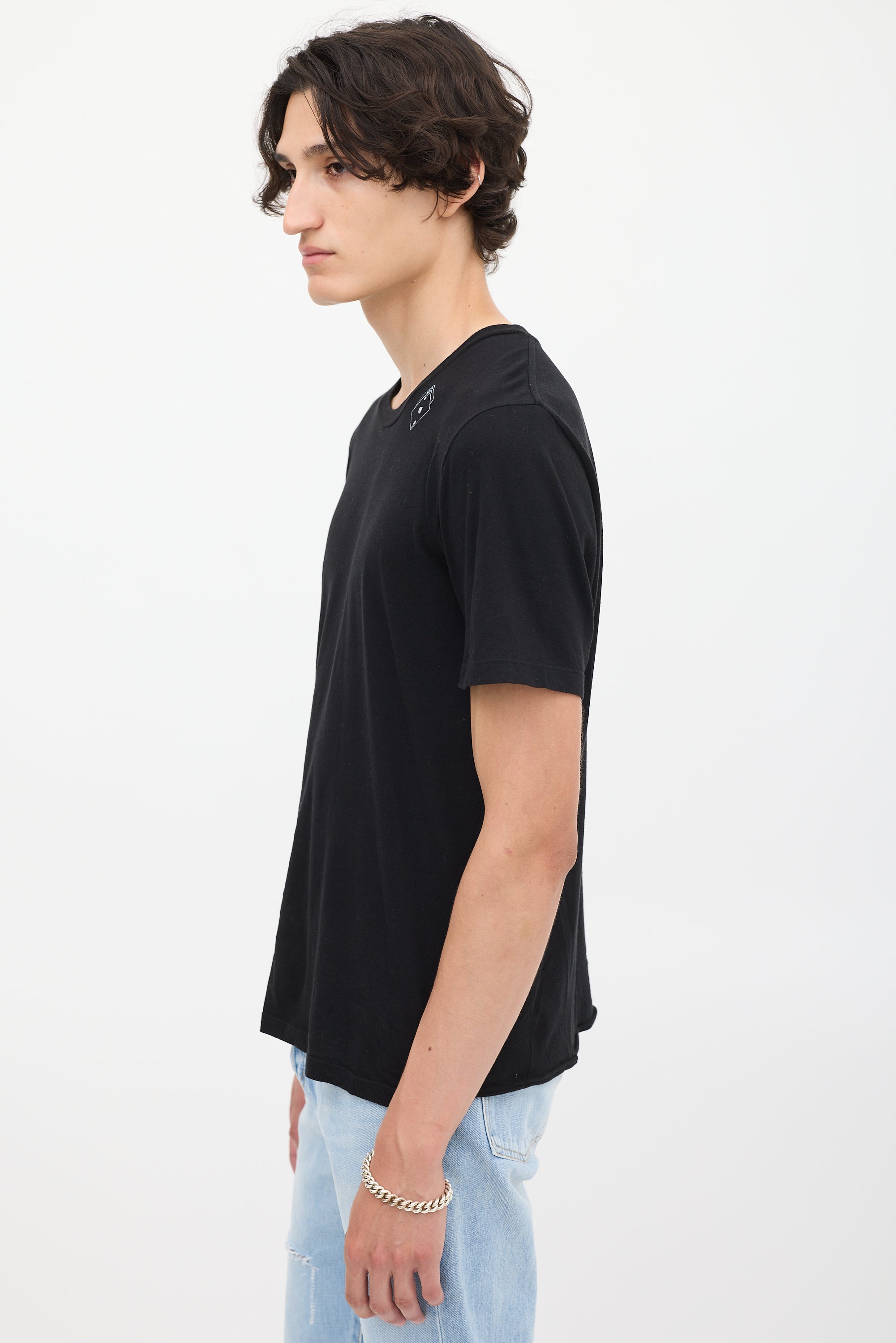 Pre-owned Saint Laurent black cotton T-shirt featuring a round neck, white playing card motif graphic at left neck, distressed hem detail, and short sleeves.