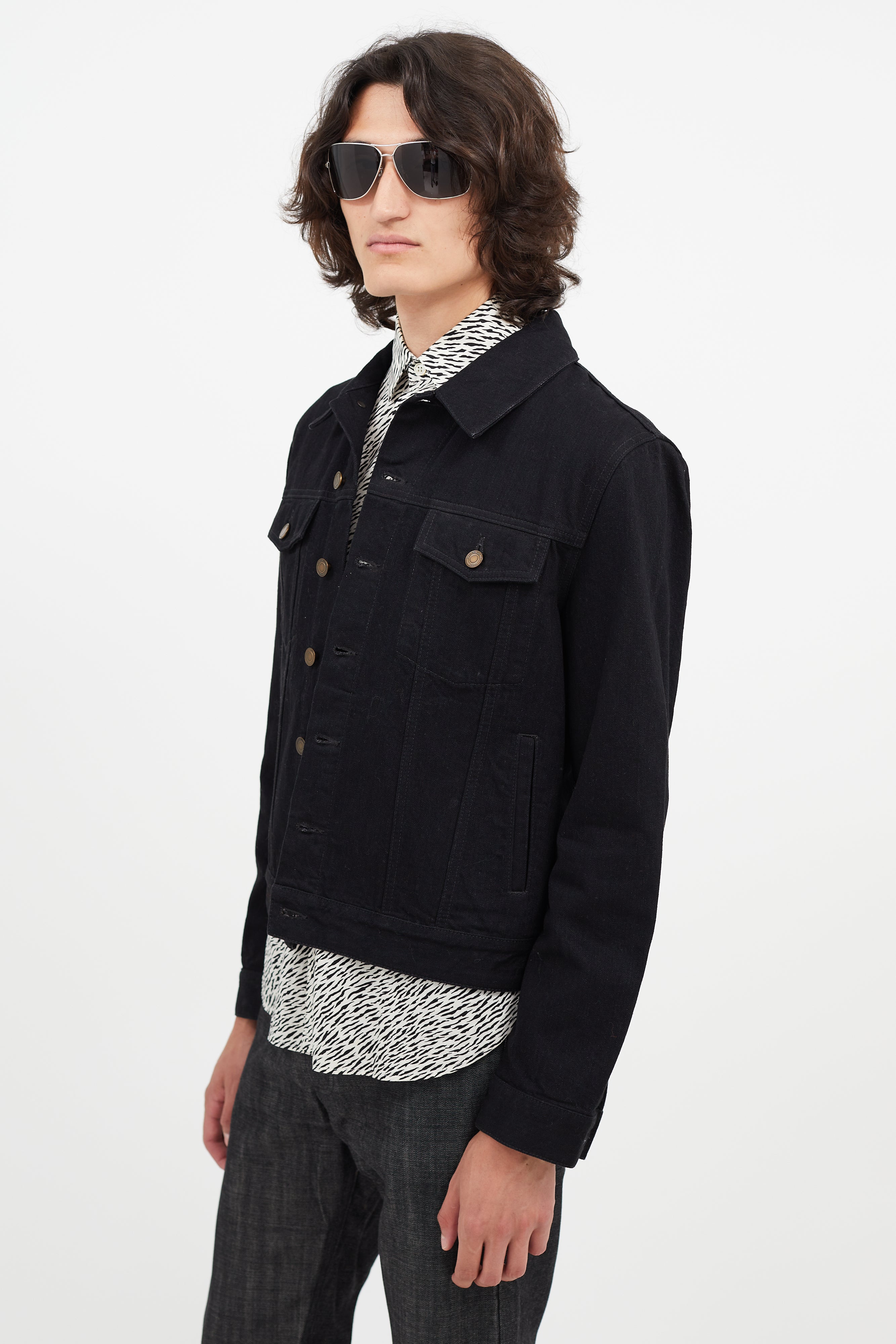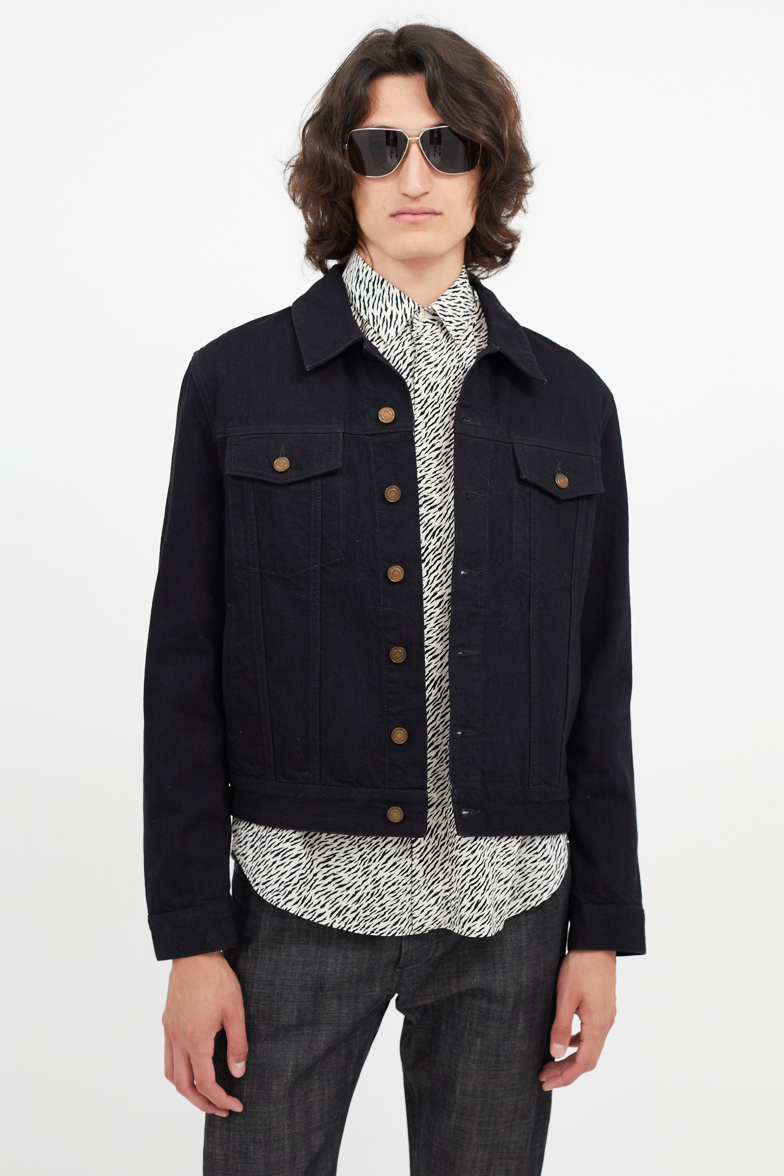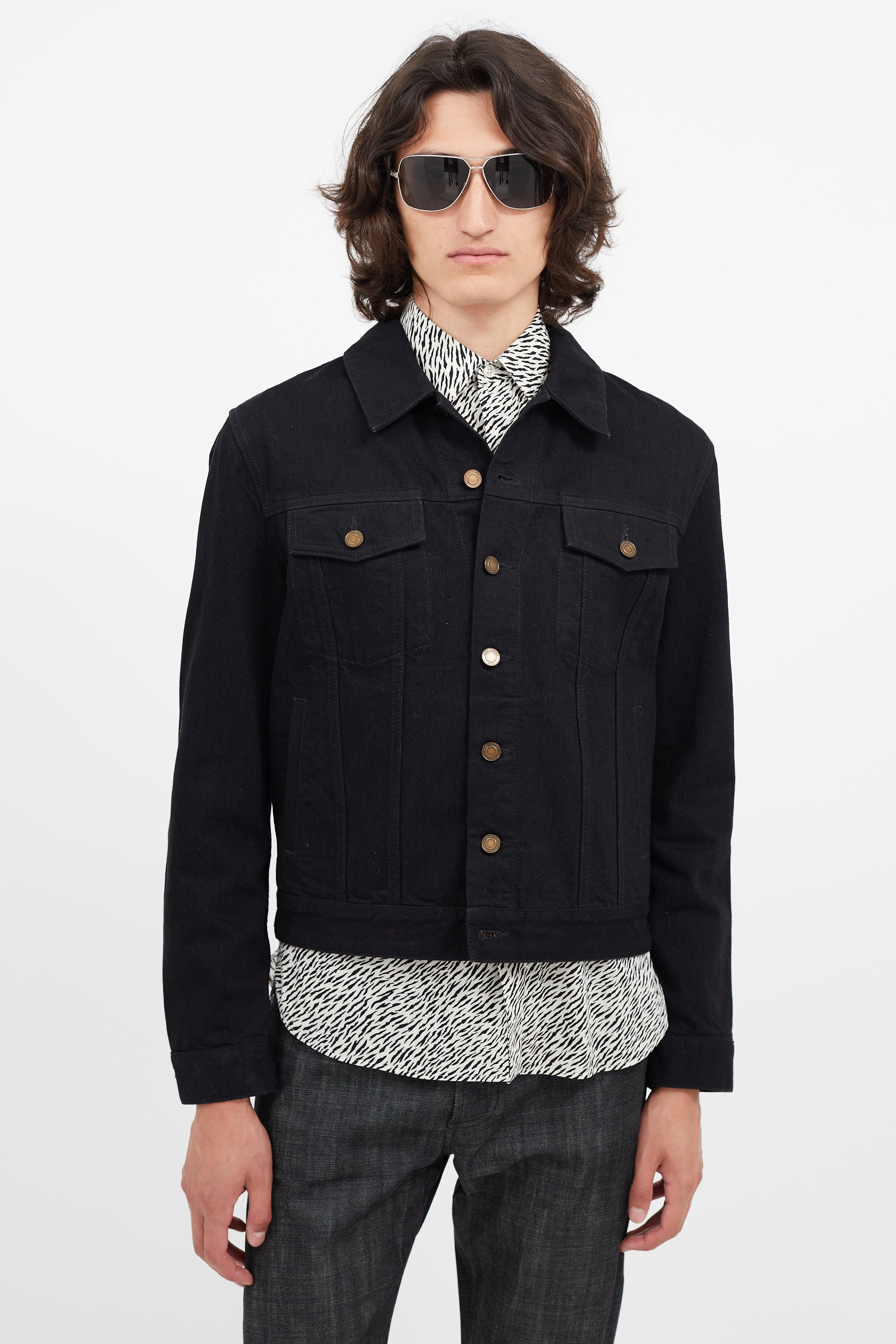 Pre-owned Saint Laurent black denim jacket featuring classic collar, aged gold tone hardware, button up front, two buttoned chest pockets, and two slash hip pockets.