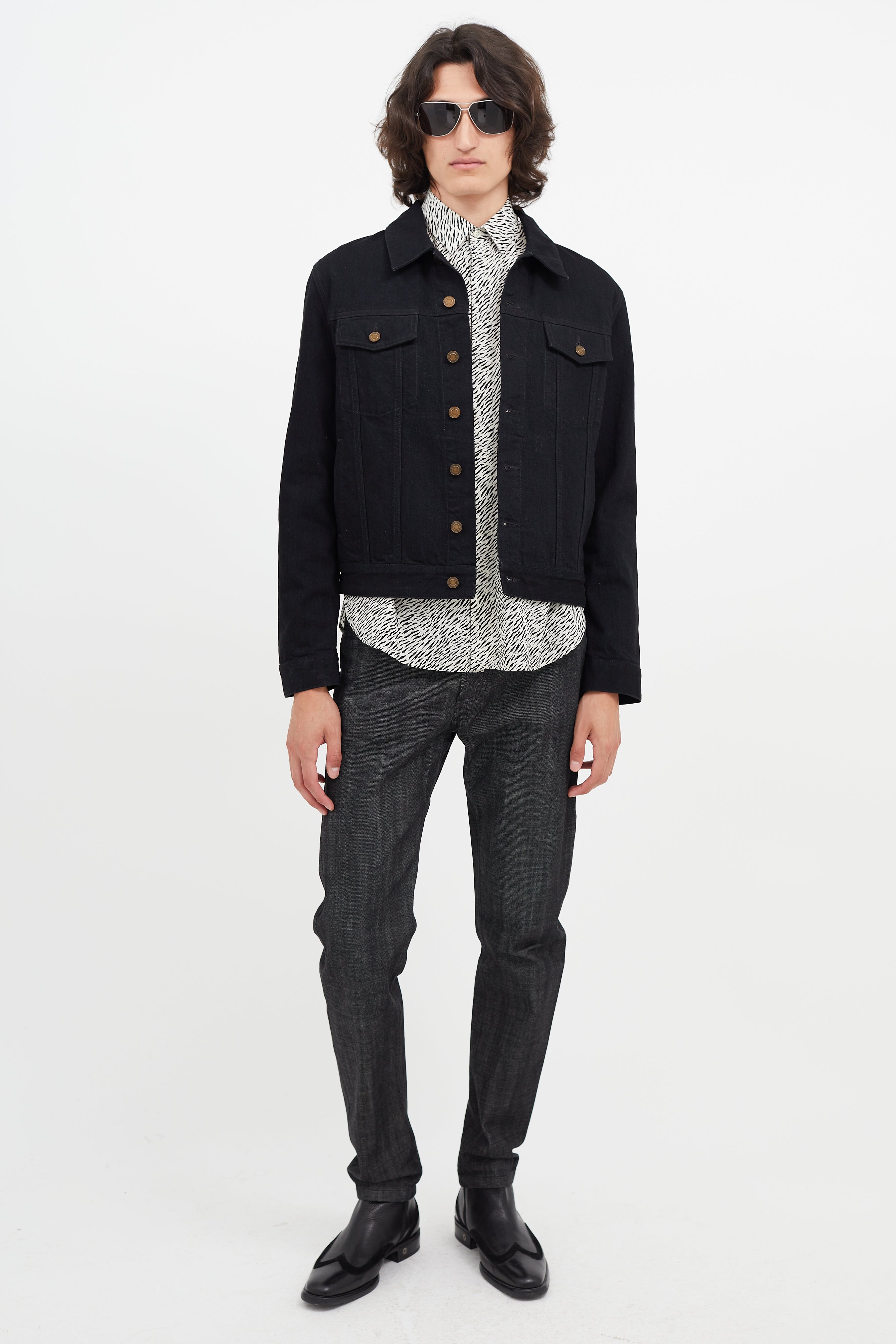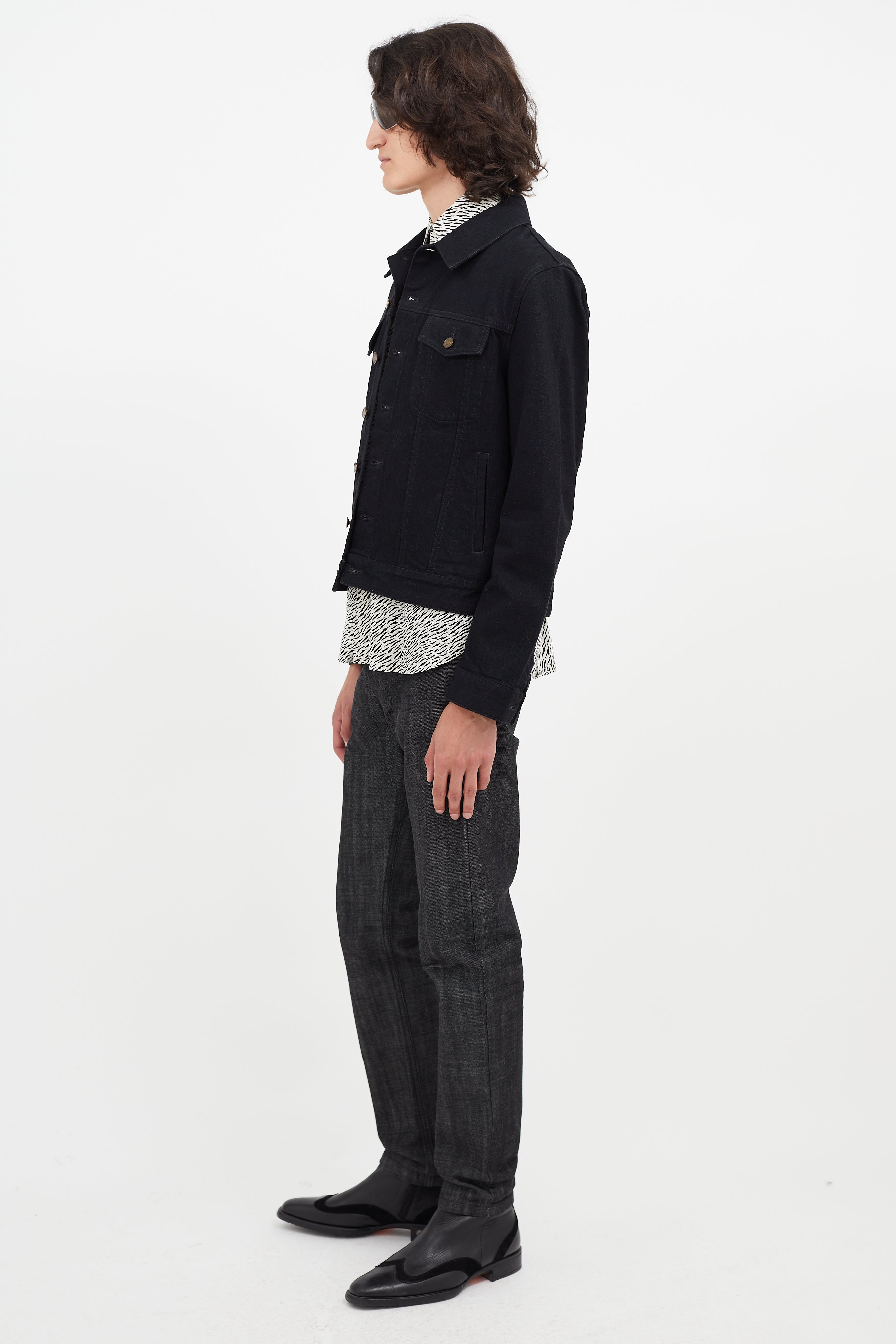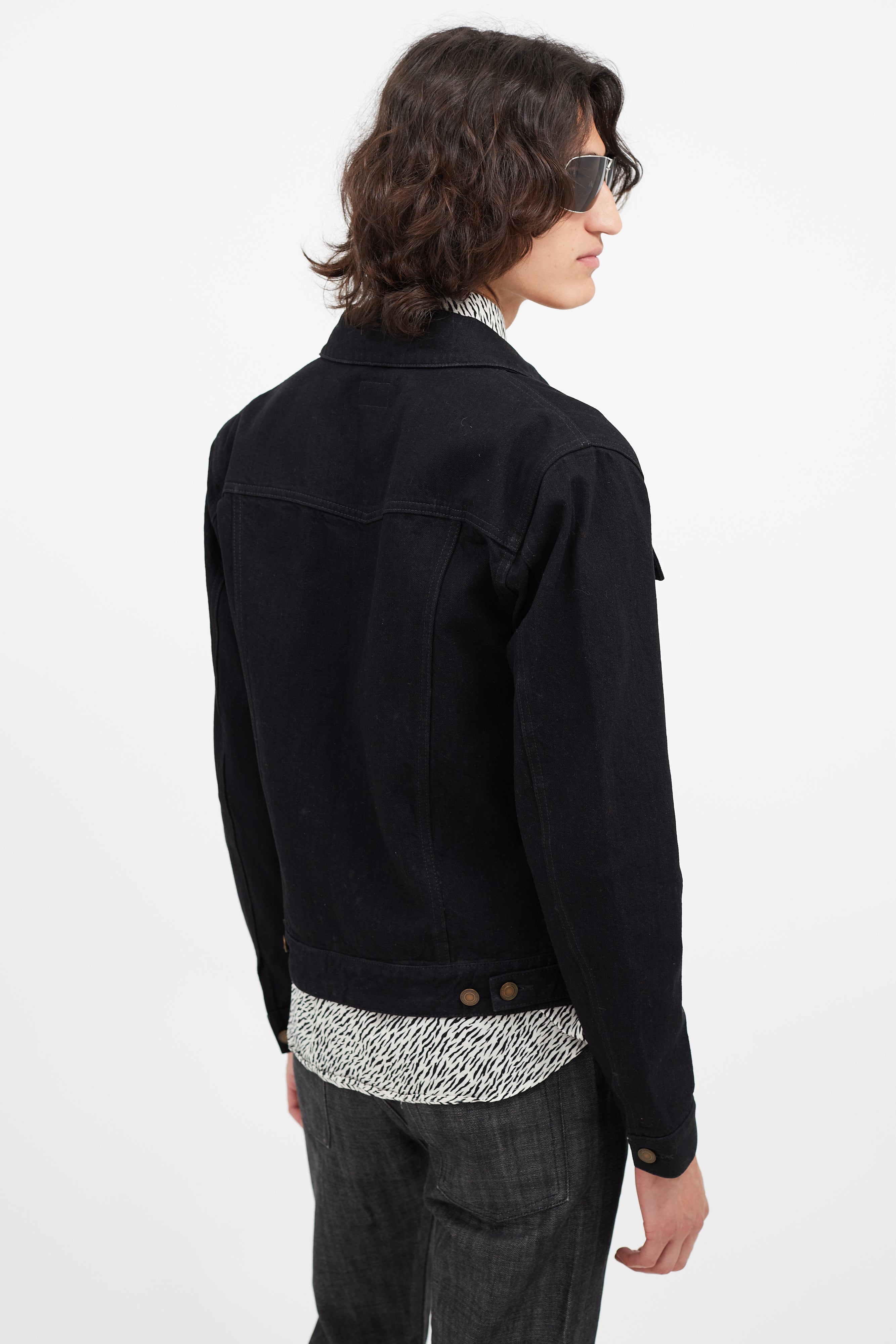 Pre-owned Saint Laurent black denim jacket featuring classic collar, aged gold tone hardware, button up front, two buttoned chest pockets, and two slash hip pockets.