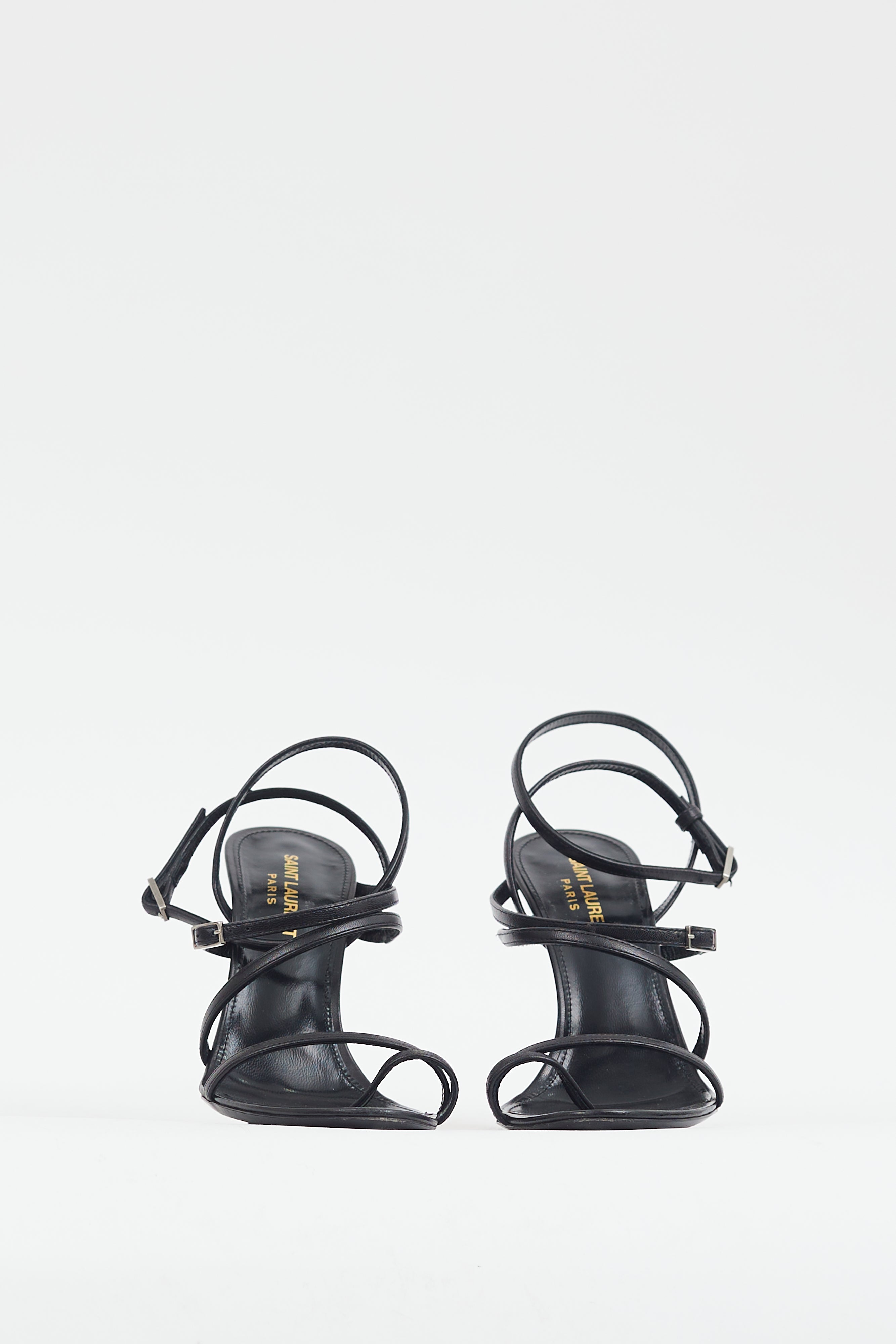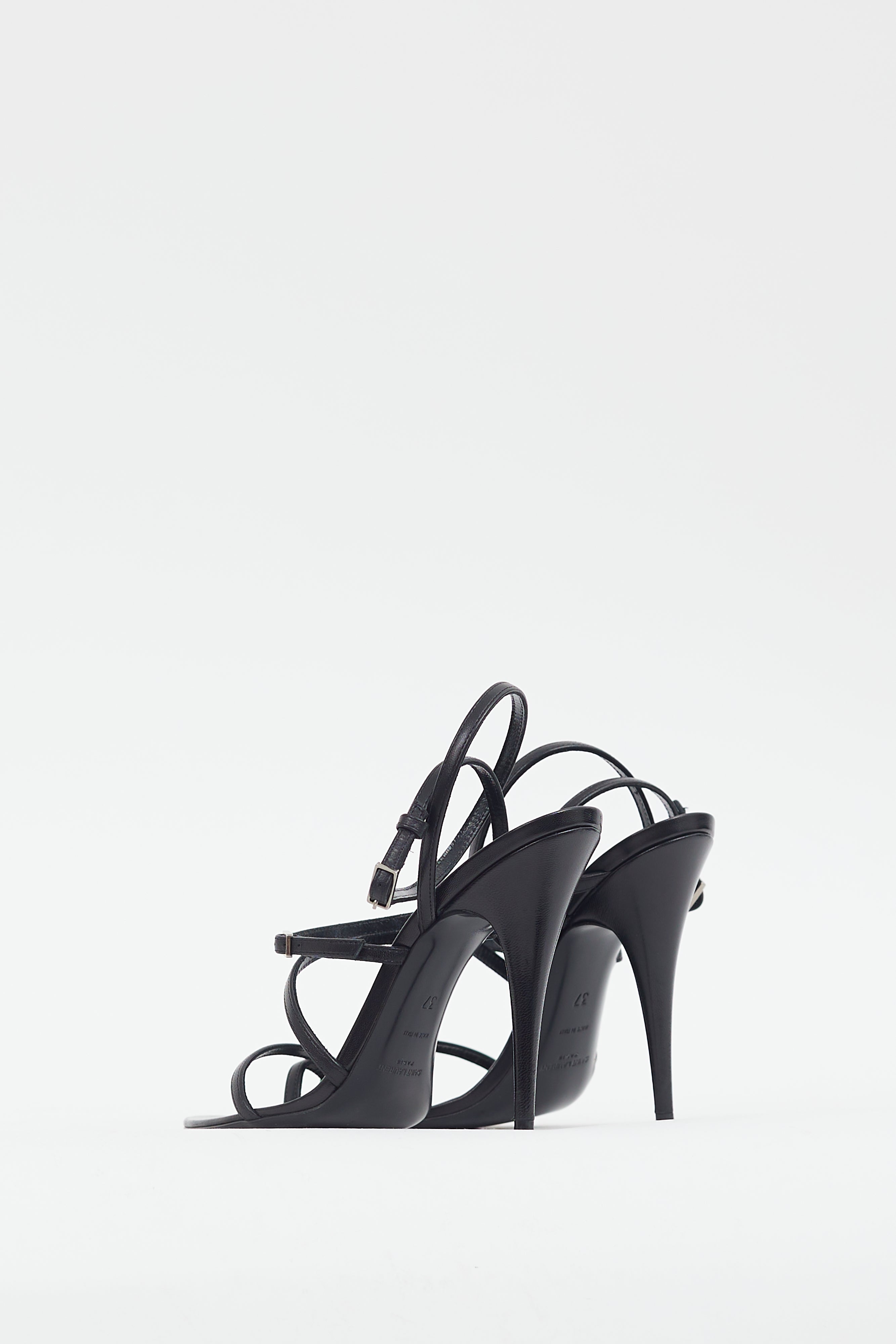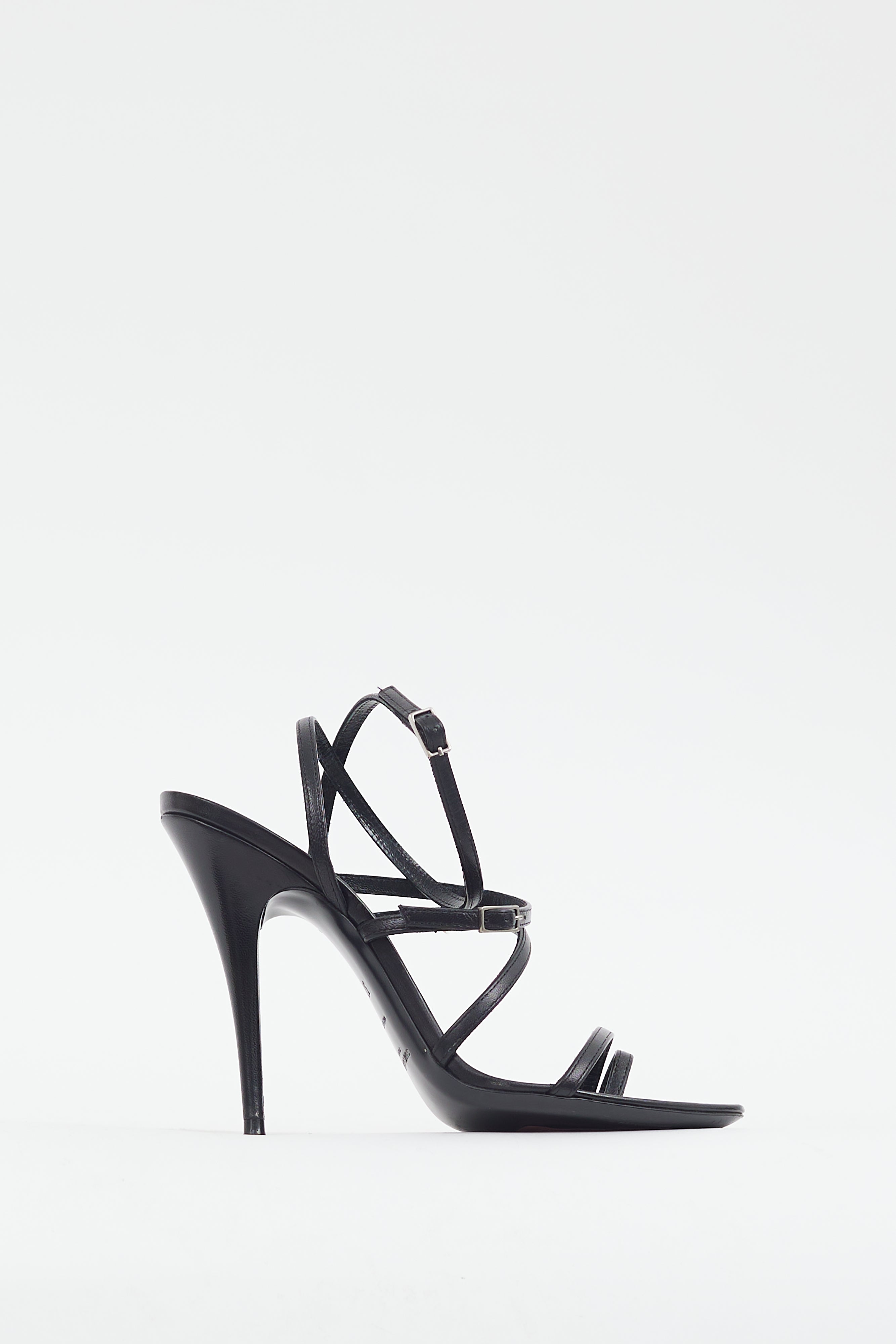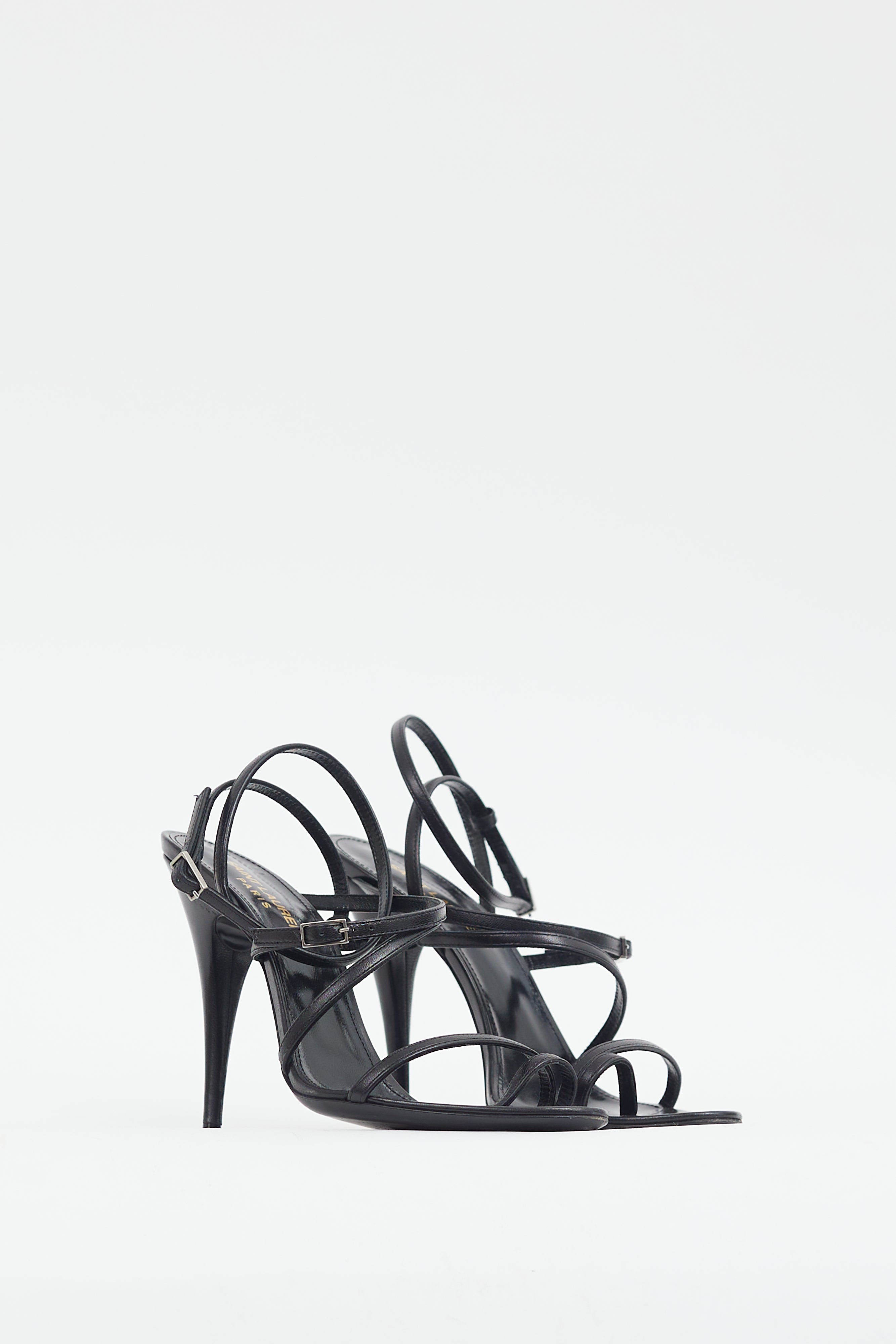 Pre-owned Saint Laurent black leather strappy heels featuring rounded toe, multi-strap upper, silver tone hardware, adjustable straps with buckles at ankle and vamp, wooden stiletto heel, and leather insoles.