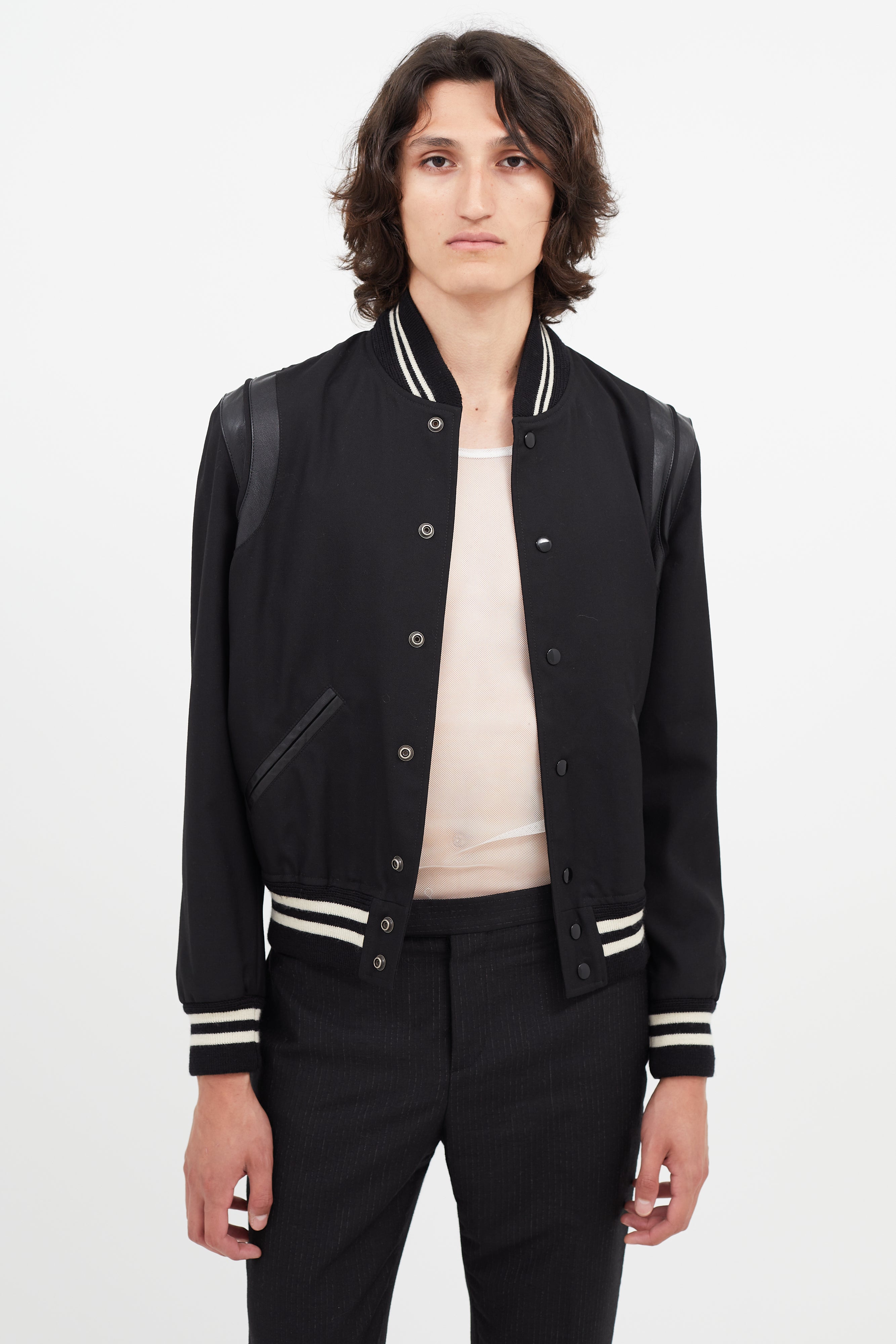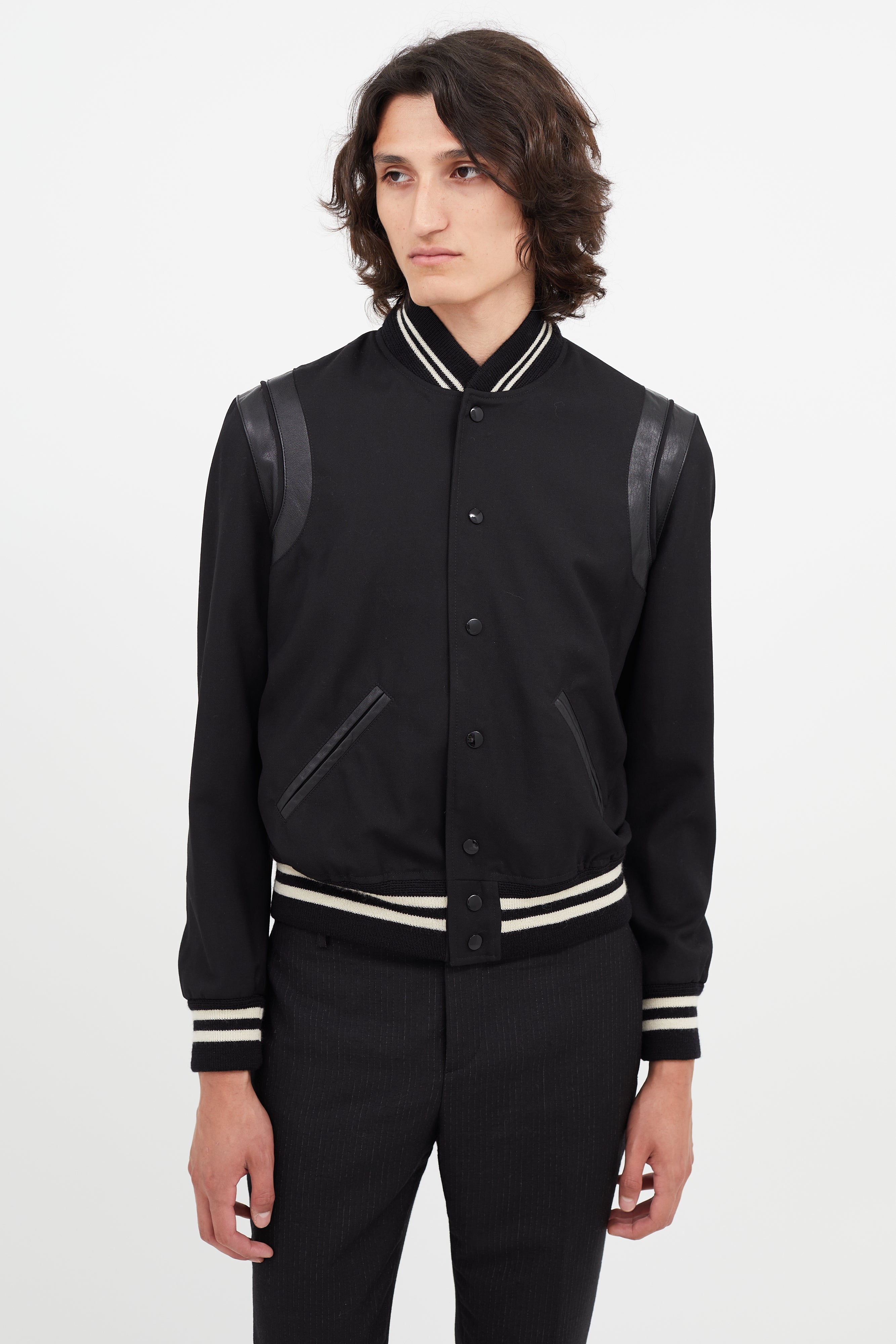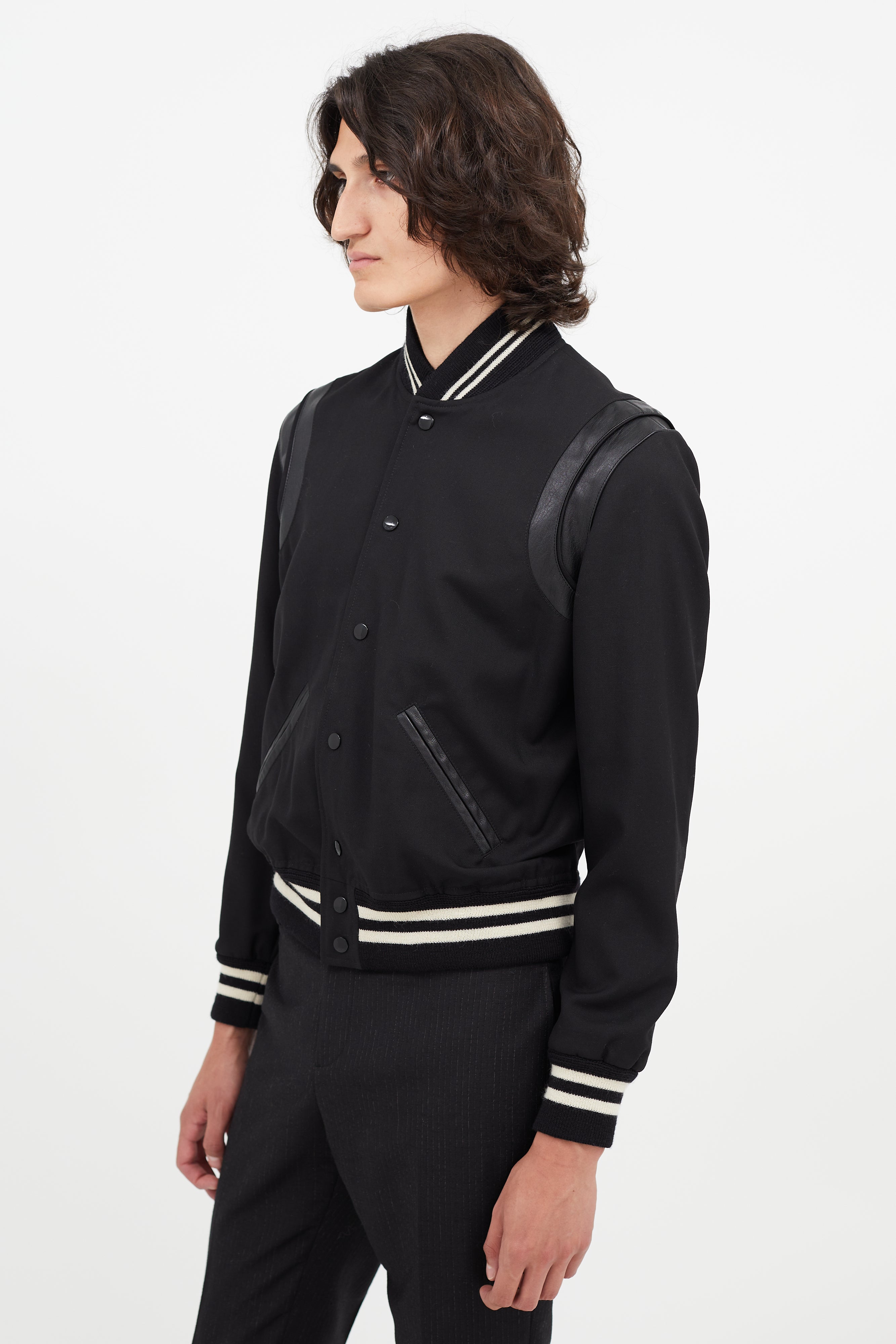 Pre-owned Saint Laurent black Teddy varsity jacket featuring ribbed stand collar, button up front, two slash pockets, black leather trim details at shoulders and pockets, and stripe rib knit hem. Lined.