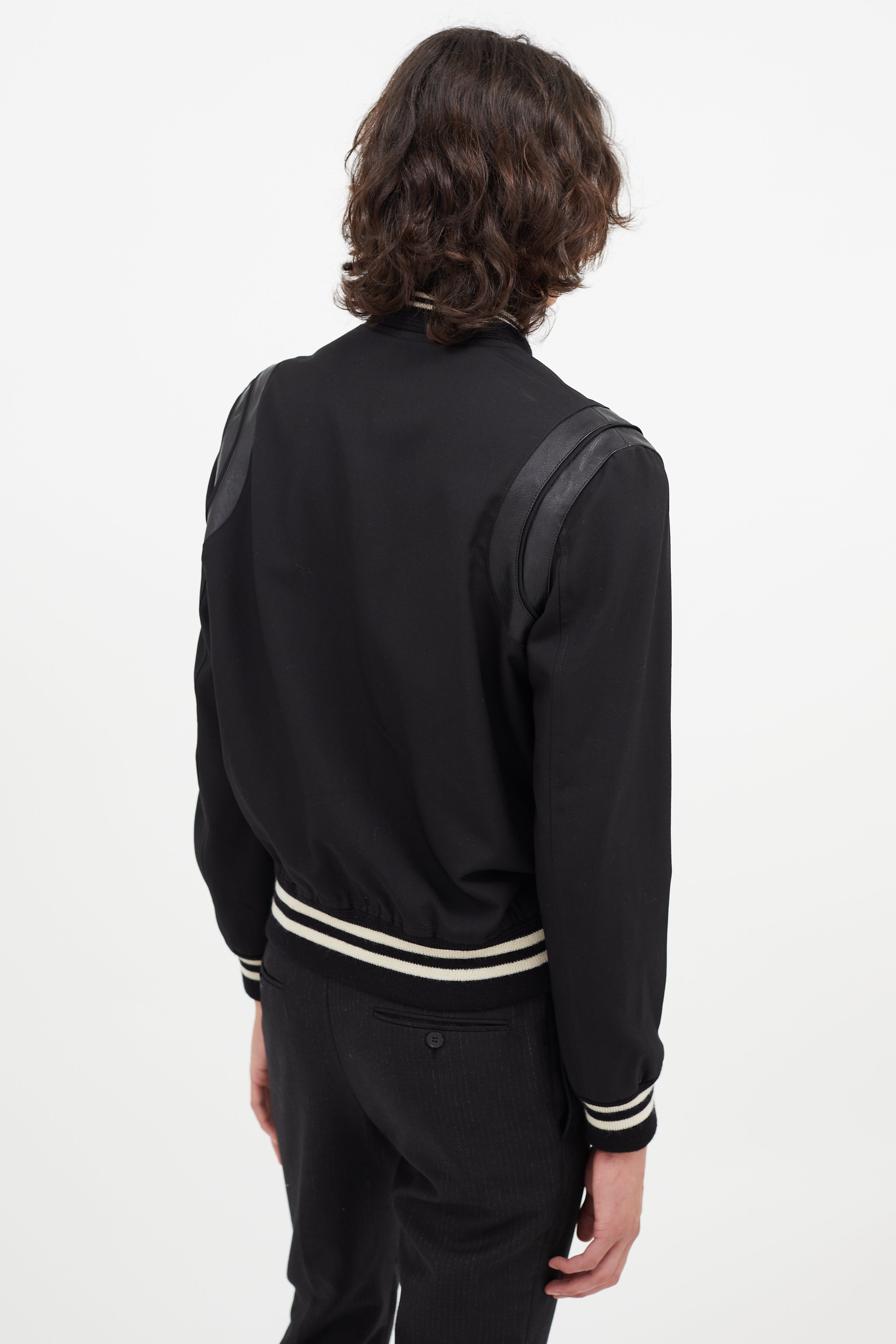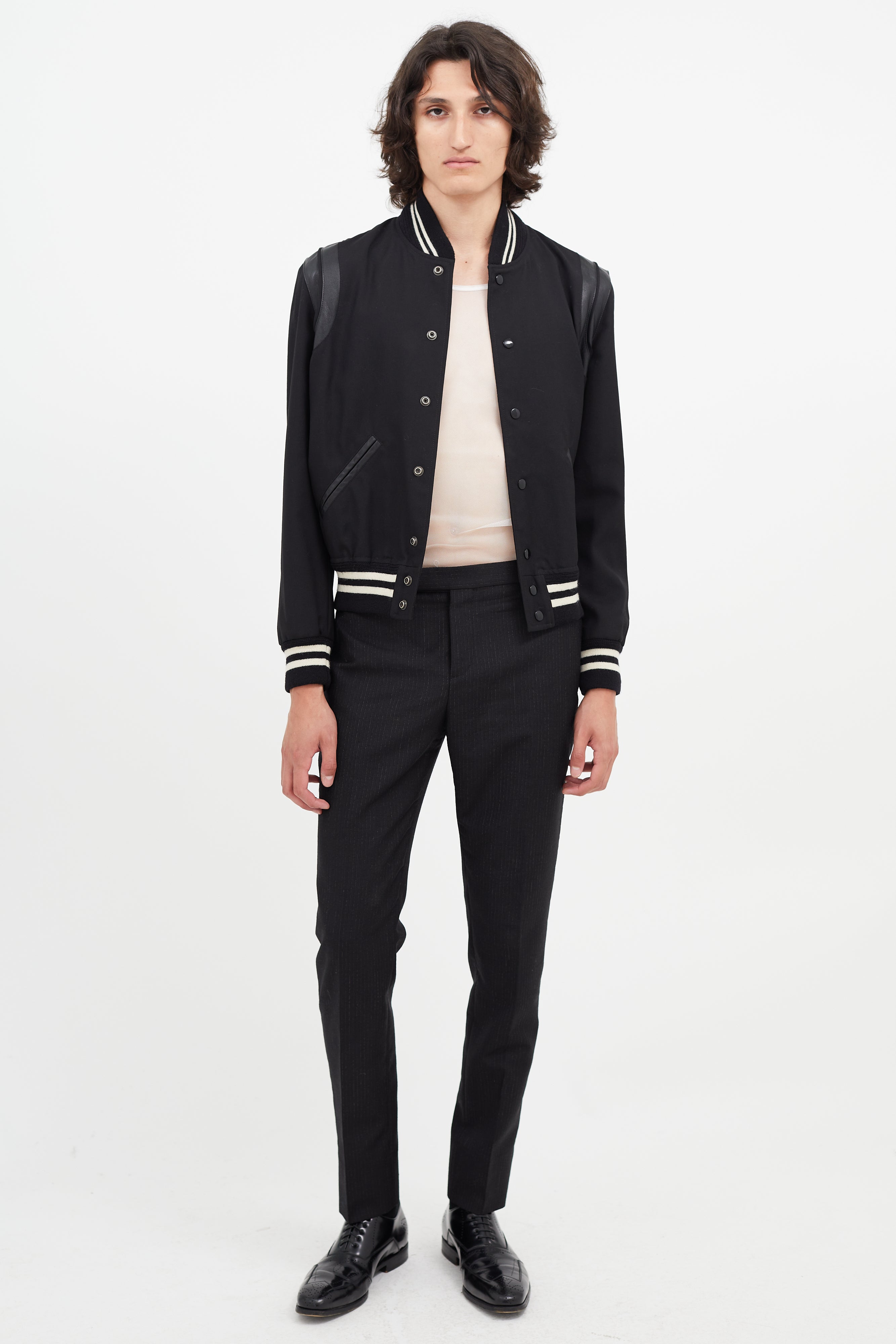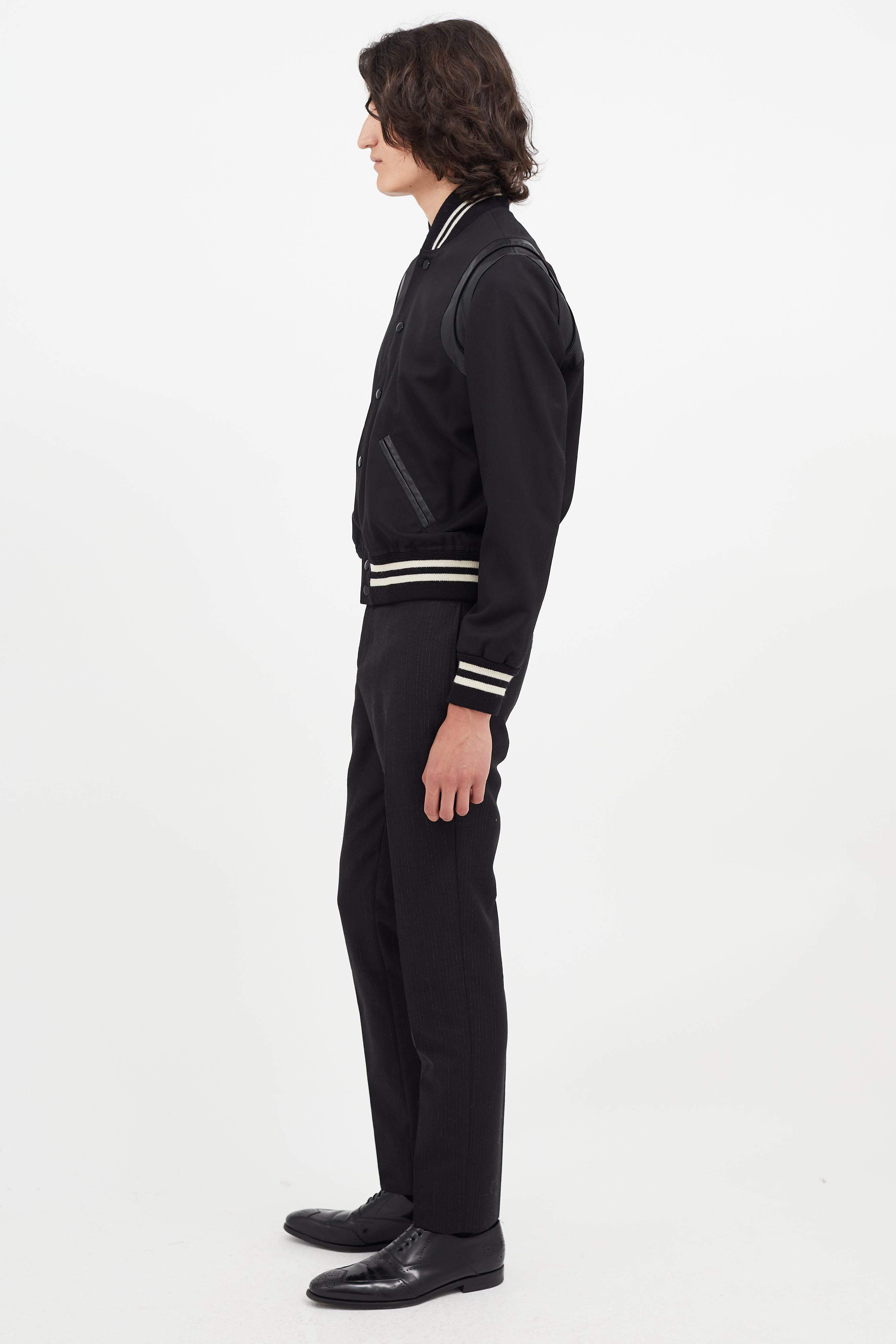 Pre-owned Saint Laurent black Teddy varsity jacket featuring ribbed stand collar, button up front, two slash pockets, black leather trim details at shoulders and pockets, and stripe rib knit hem. Lined.