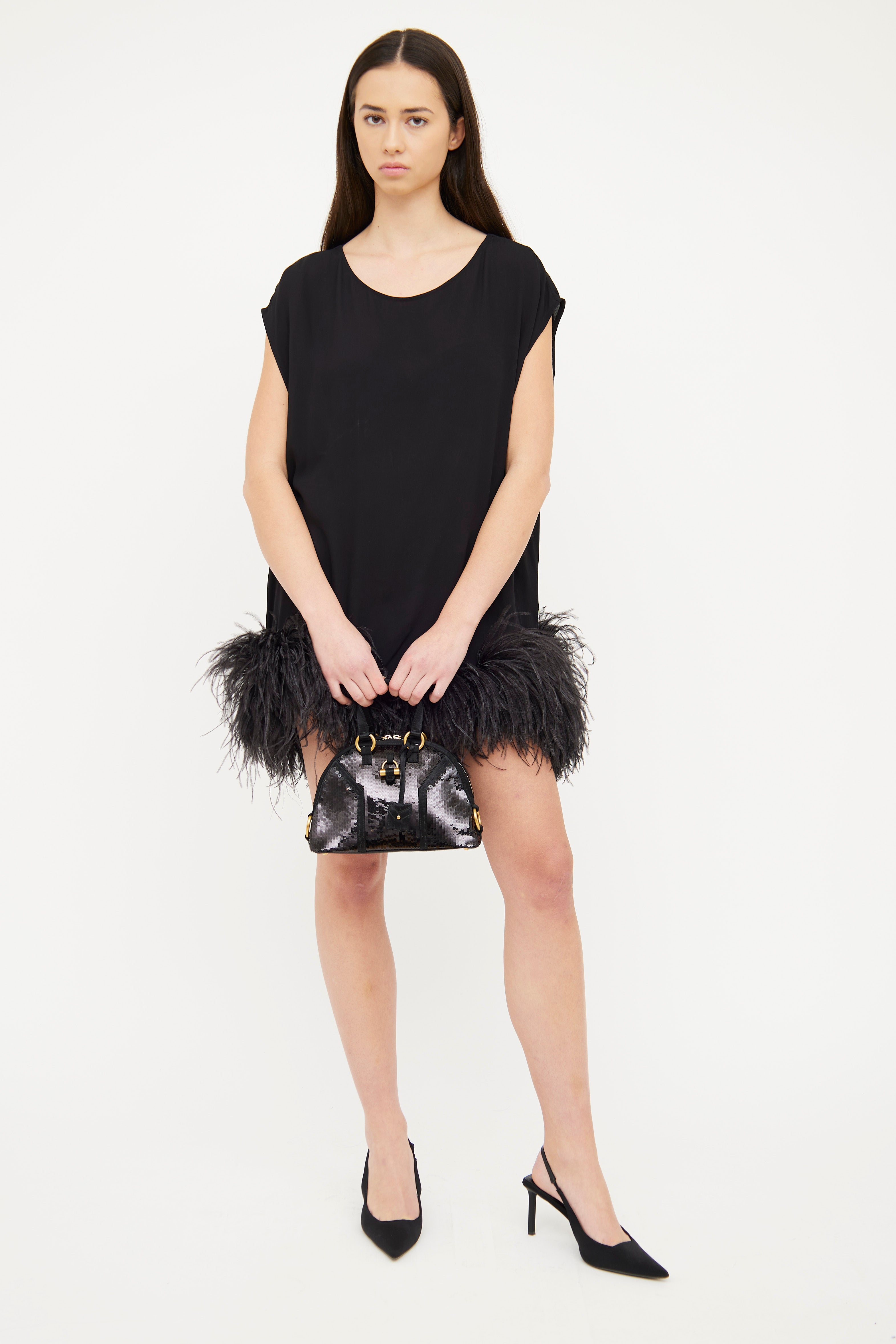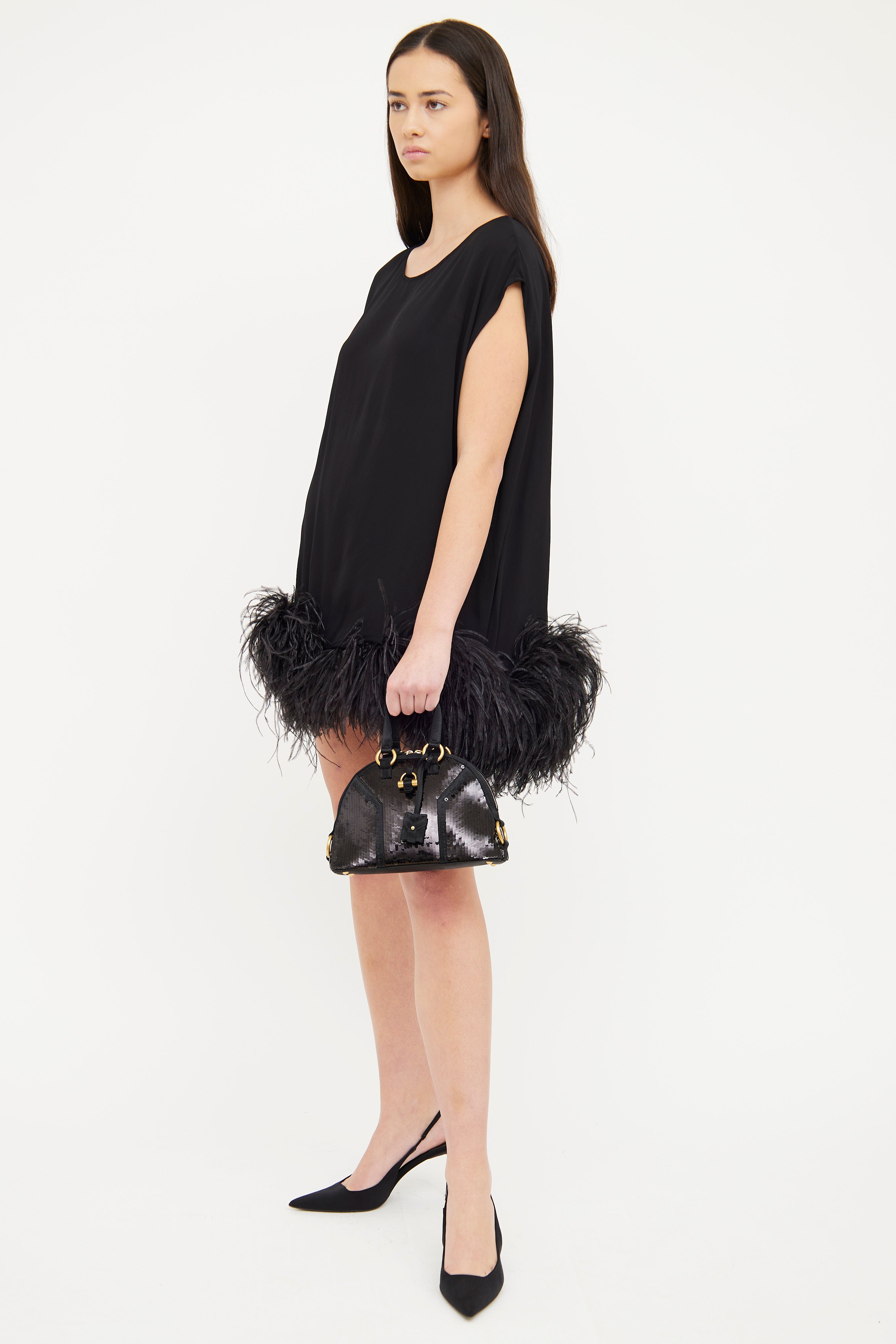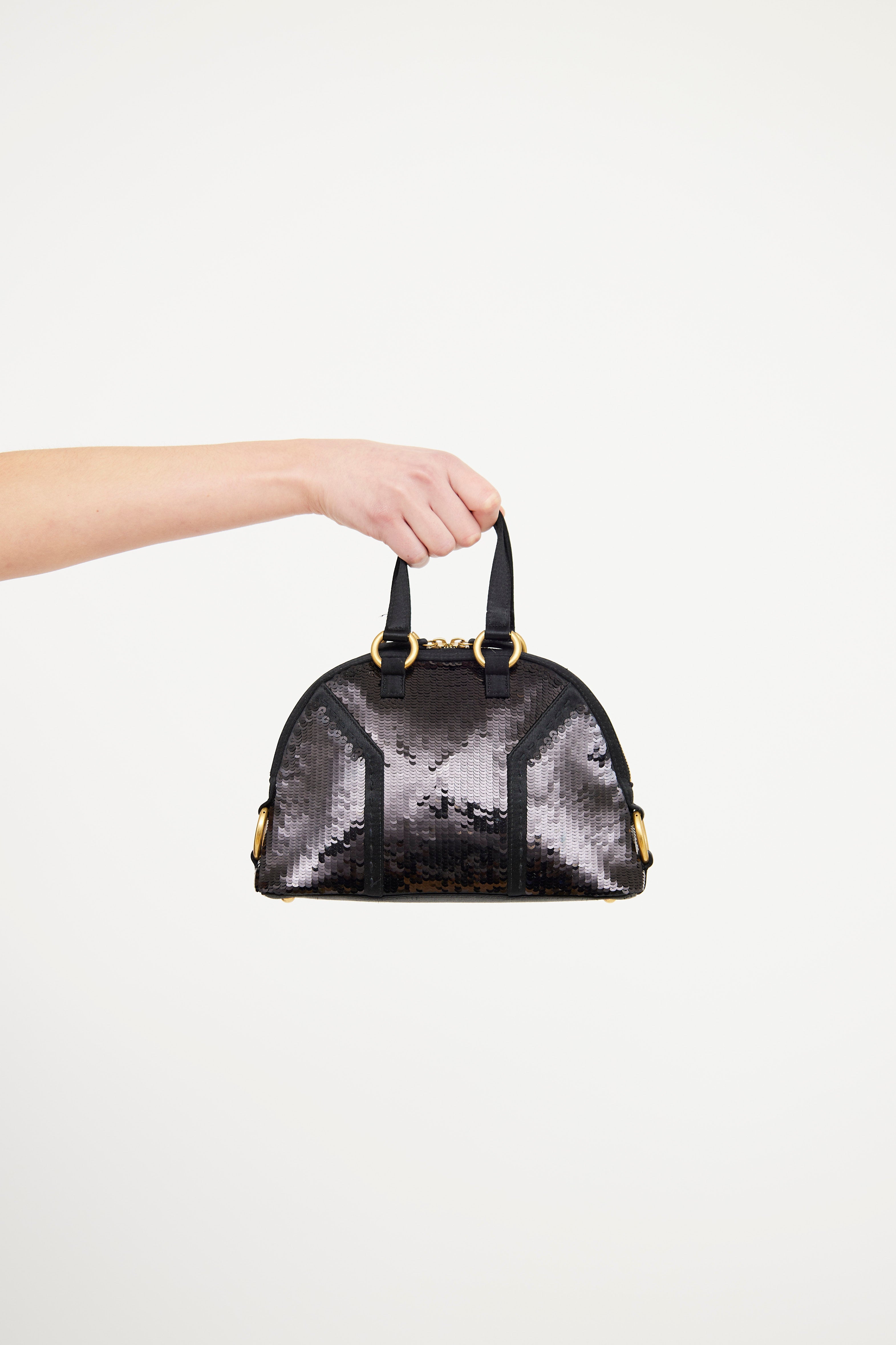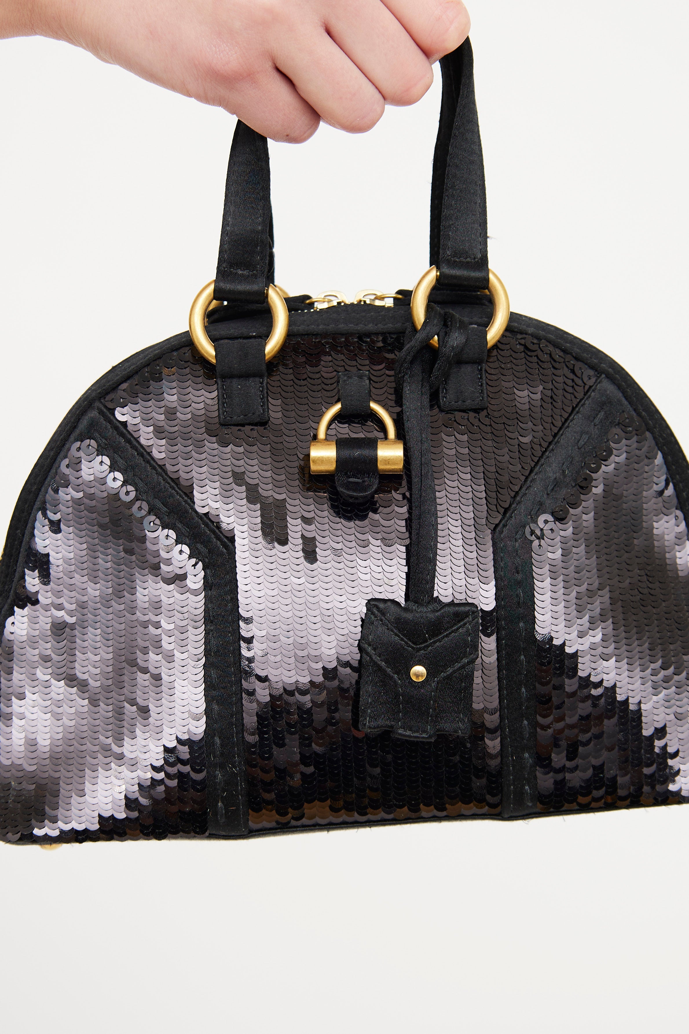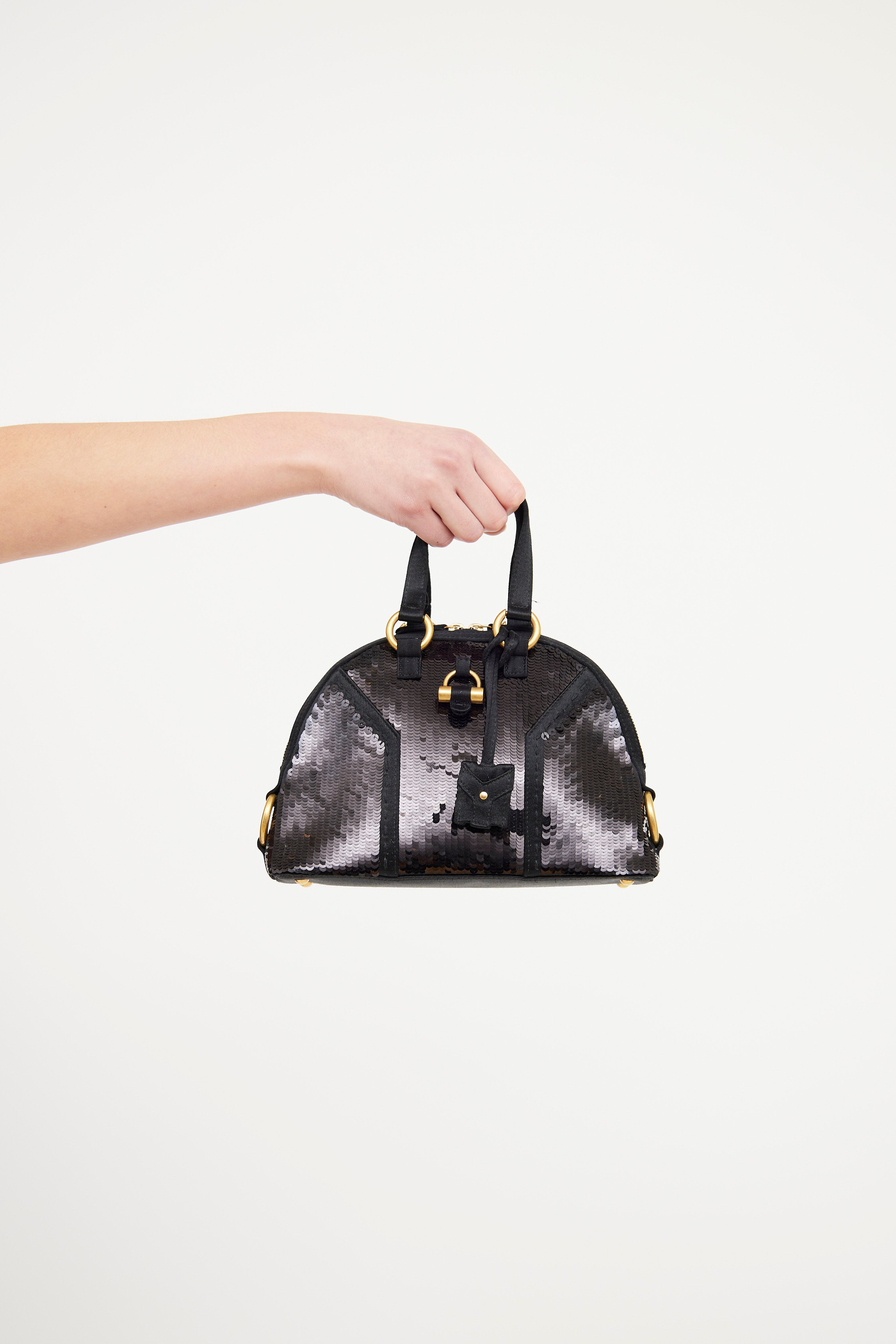 Pre-owned Saint Laurent black mini sequin Muse bag featuring dual flat top handles, removable key pochette, ring at front, zip closure at top, gold tone hardware, protective metal feet at bottom, one main satin line compartment and interior slip pocket.