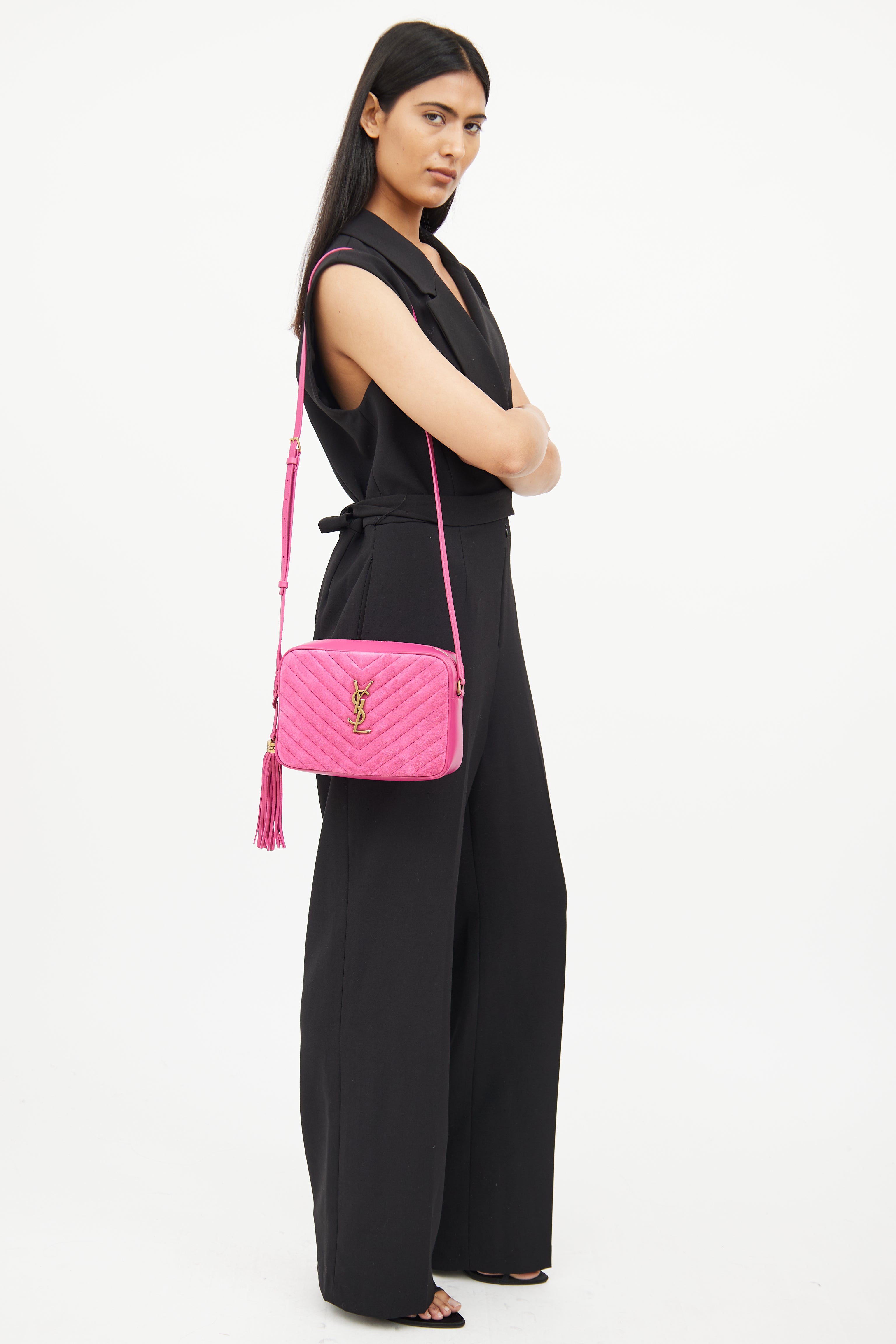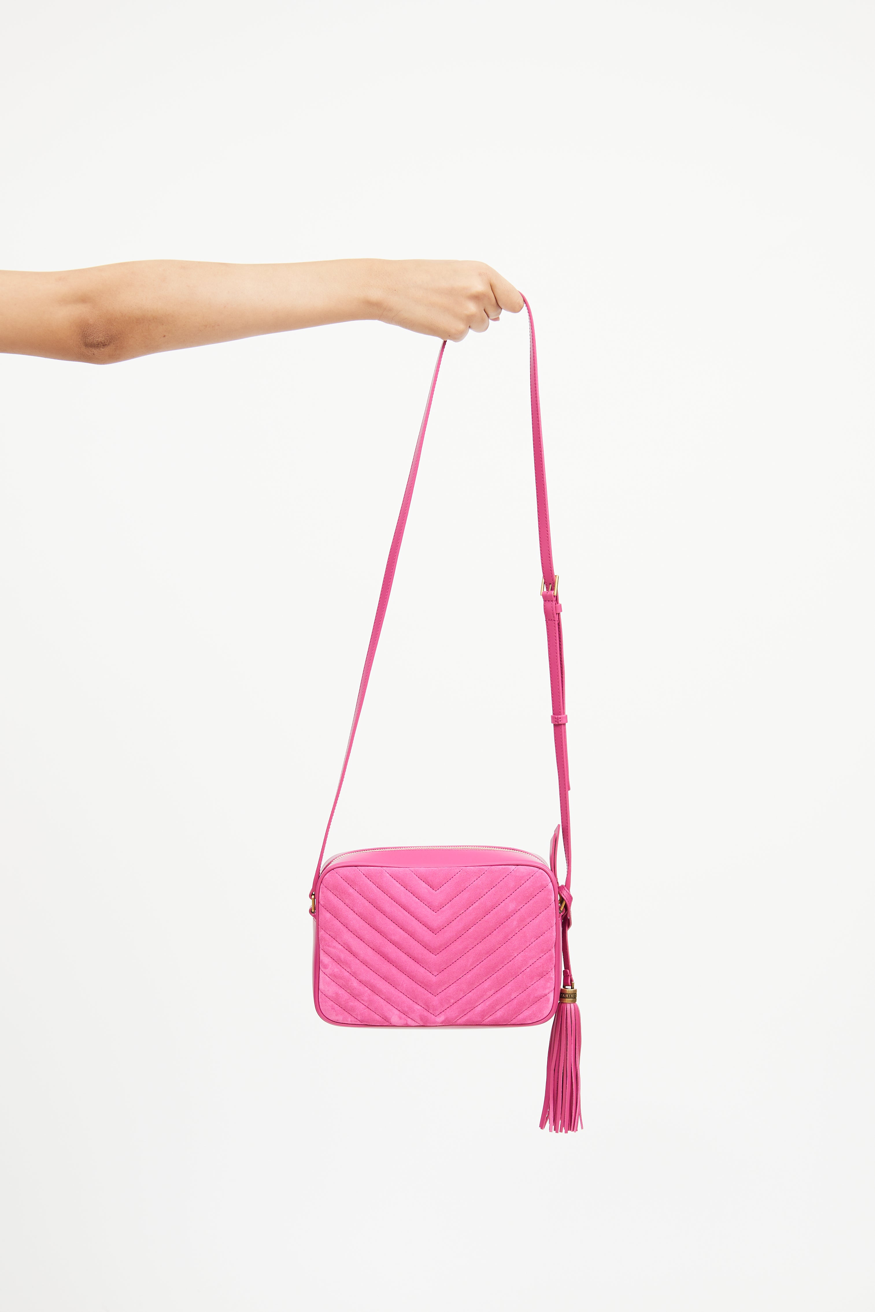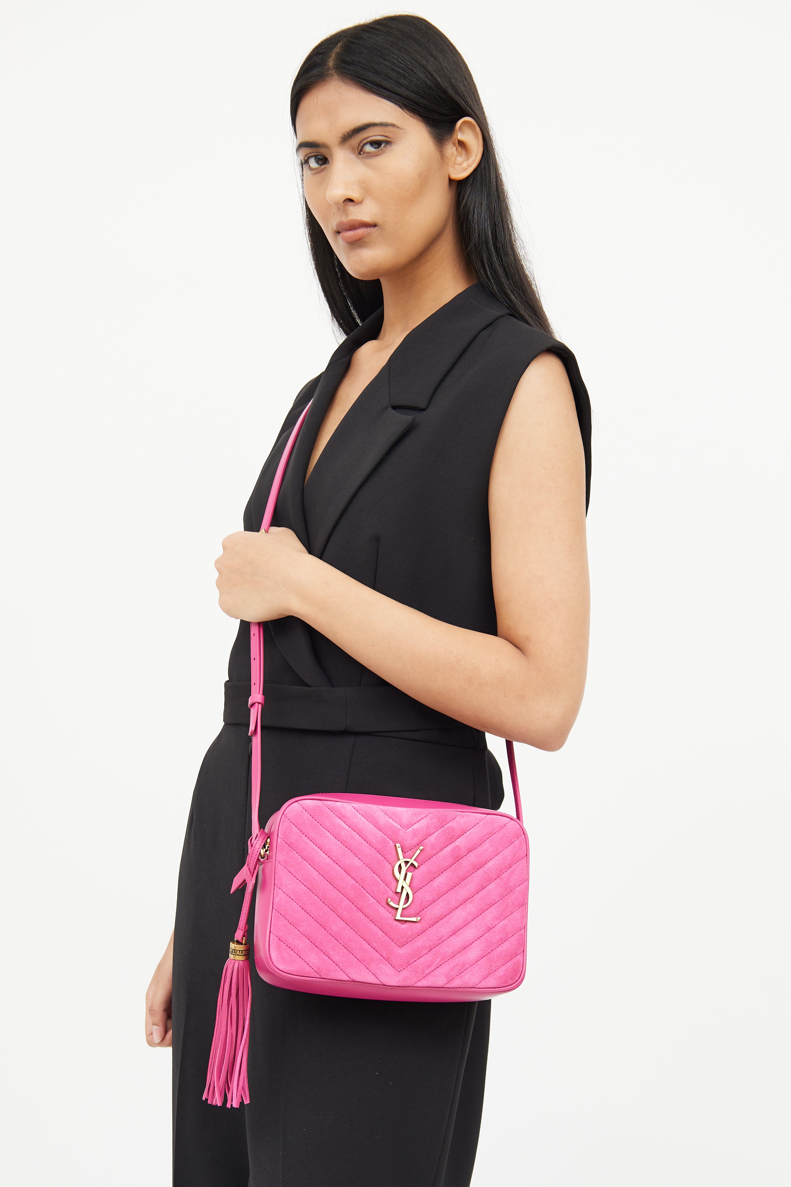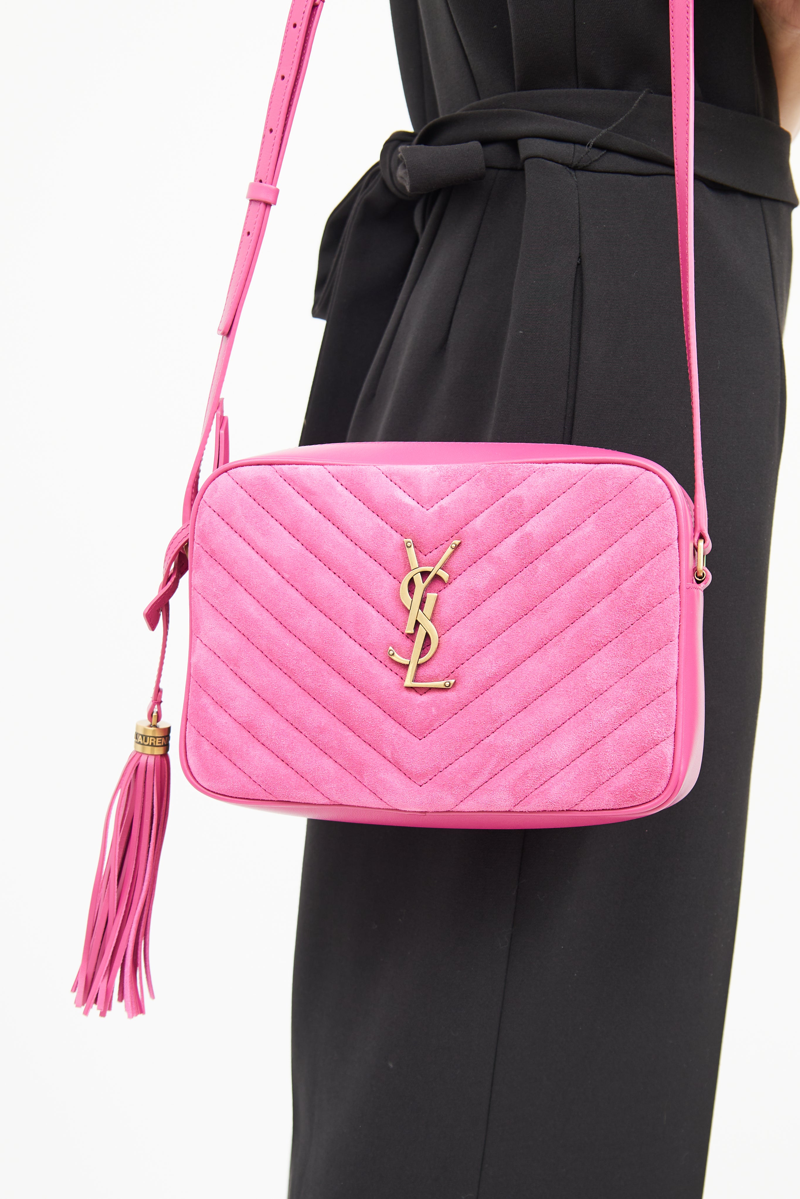 Pre-owned Saint Laurent Lou pink suede camera bag featuring an gold tone Cassandre logo at front, one main compartment with one slip pocket, adjustable shoulder strap with tassel logo pendant, and top zip closure.